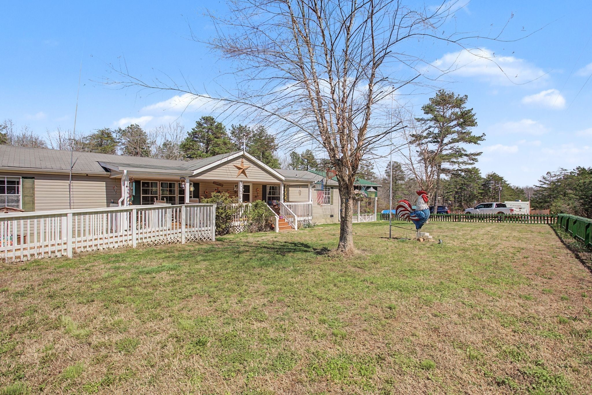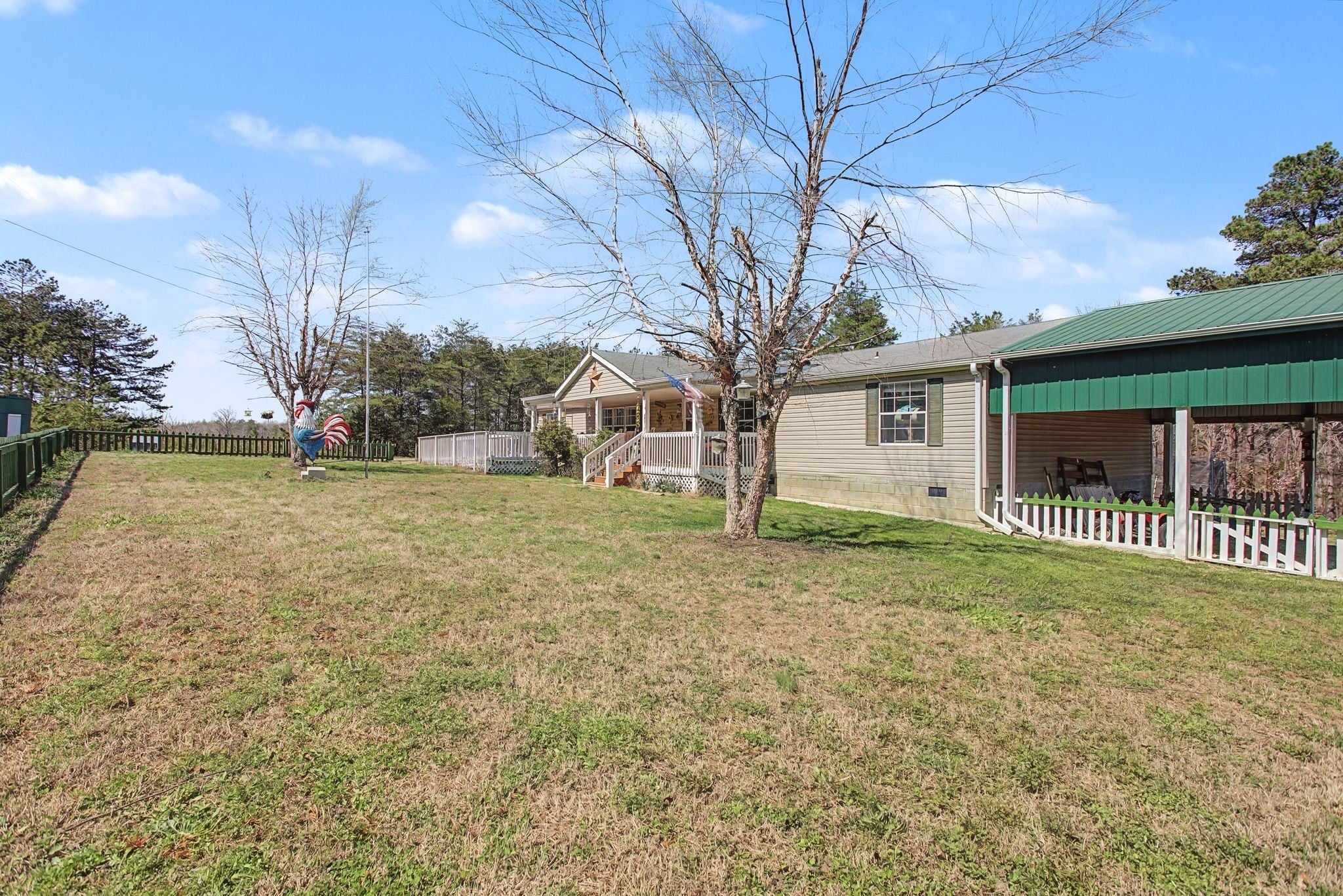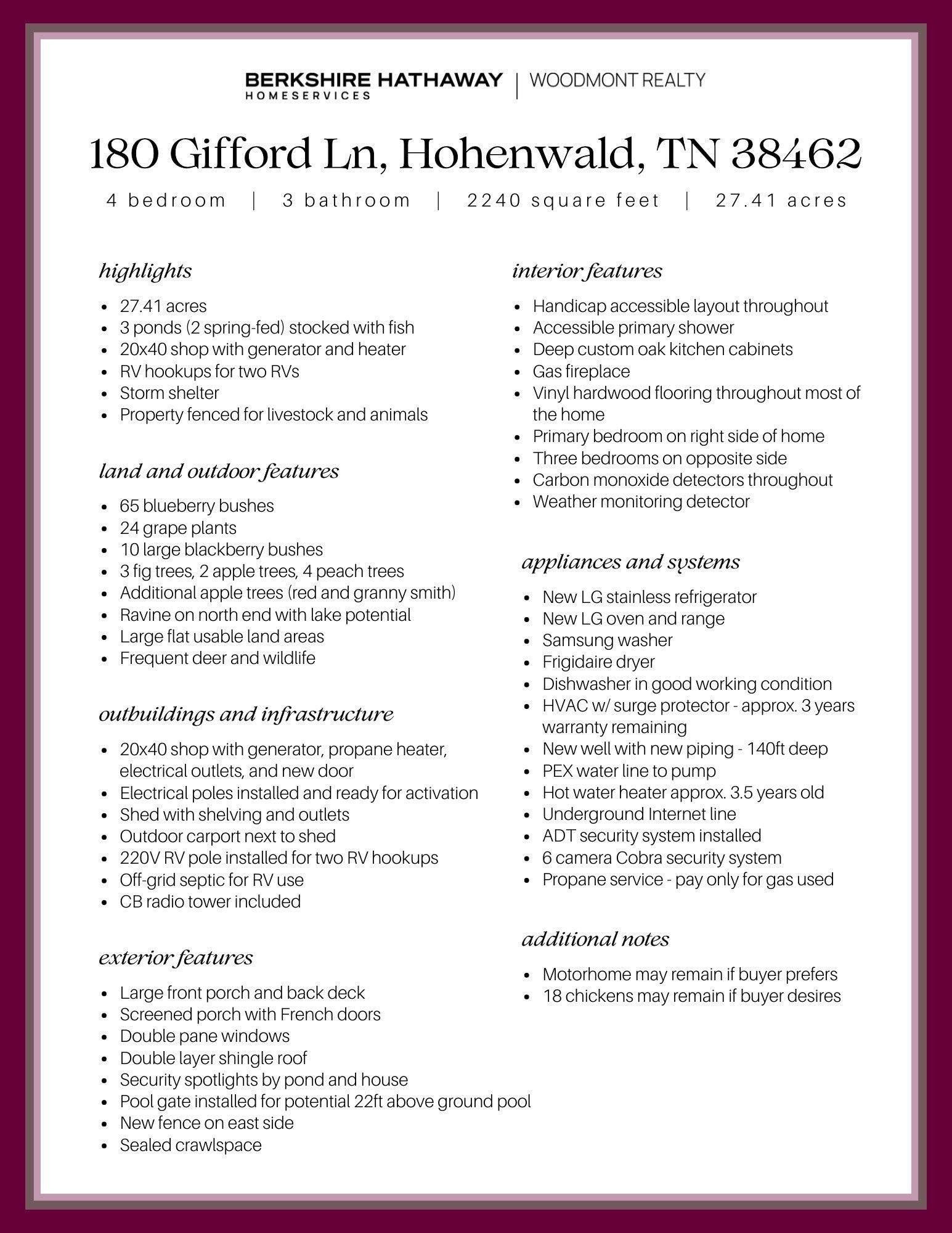 Rare opportunity to own this private 27.41-acre Greenbelt property just minutes from downtown Hohenwald, with Greenbelt status currently in place, offering significant tax savings, three ponds, and extensive infrastructure. This one-level 4 bedroom, 3 bath home features recent updates including a new 140-ft well with PEX piping and a newly installed HVAC system with surge protection and remaining warranty. The land offers exceptional privacy with three ponds, two spring-fed and stocked with fish, large usable areas, and fencing for livestock. Improvements include a concrete storm shelter, a 20×40 shop with generator, propane heater, and power, RV hookups for two RVs with a 220V pole and off-grid septic, a shed with power, and an outdoor carport. The property also includes a variety of fruit trees and berry bushes including blueberries, grapes, blackberries, figs, apples, and peaches. Additional highlights include a screened porch with French doors, gas fireplace, underground internet, and Cobra security system, creating a rare opportunity for a private homestead, recreational property, or country retreat.