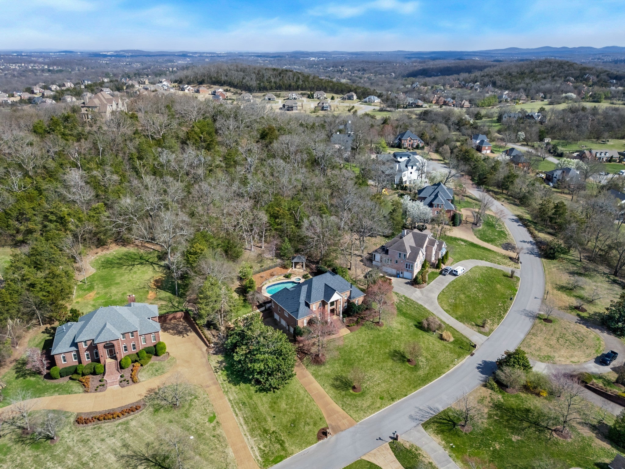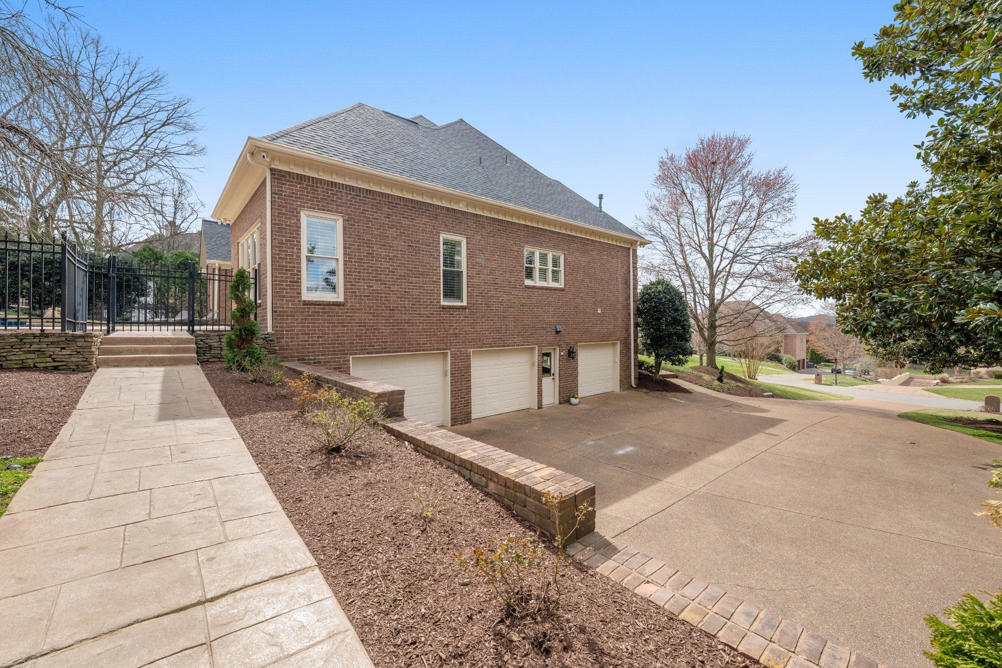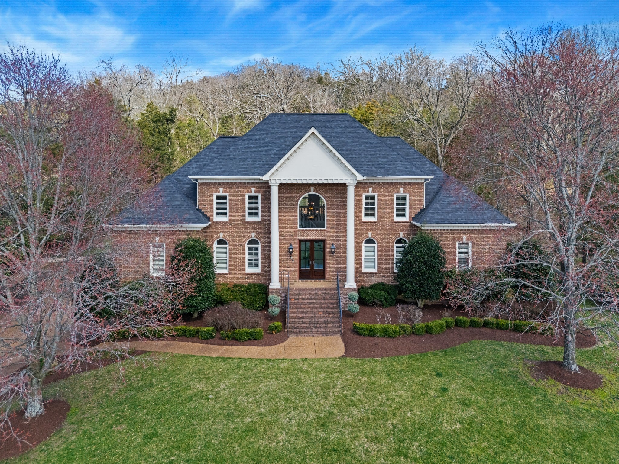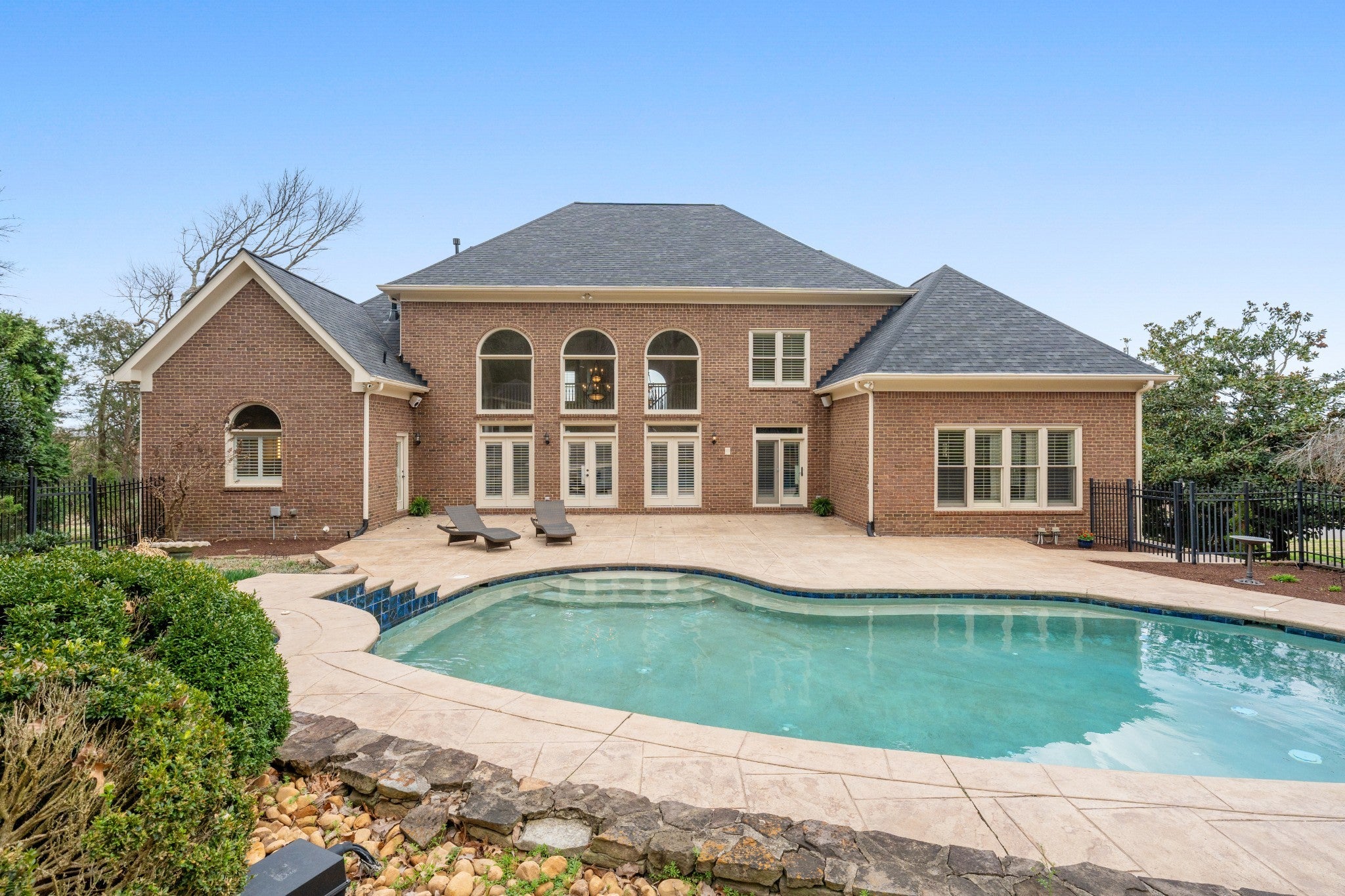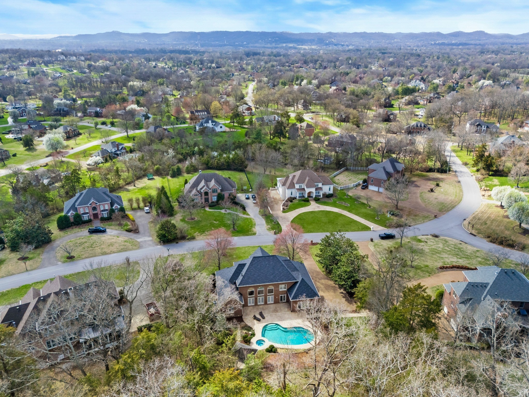 Set on one of only 16 estate lots in Brentwood's hilltop enclave of Chevoit Hills, this custom all-brick residence offers timeless elegance and exceptional indoor-outdoor living on 1 acre. The main level showcases a spacious primary retreat with a beautifully updated spa-inspired bath featuring quartz countertops, a soaking tub, and separate walk-in closets. Each additional bedroom offers its own private ensuite bath, providing comfort and privacy for family and guests alike. Designed for both everyday living and entertaining, the chef’s kitchen is appointed with a Sub-Zero refrigerator, Wolf 5-burner gas cooktop, new microwave, abundant white cabinetry, and granite countertops. The adjoining breakfast nook features custom built-in cabinetry and a wet bar for added convenience. Dual staircases offer both a grand front staircase and a secondary rear staircase for everyday functionality. Sophisticated architectural details including crown molding and plantation shutters are found throughout the home, while the expansive living room offers a warm gathering space centered around a gas fireplace.The fully finished basement provides additional living and recreation space, complete with a second gas fireplace and pool table area. The saltwater pool and hot tub create a private backyard retreat, enhanced by multiple recent upgrades to the pool’s mechanical systems. Additional highlights include a spacious three-car garage, central vacuum system, and a convenient dumbwaiter connecting the garage to the main floor laundry room. New roof (2023), new HVAC (2022) and tankless hot water heater. Most windows & exterior doors have been replaced. HOA is $150/year.