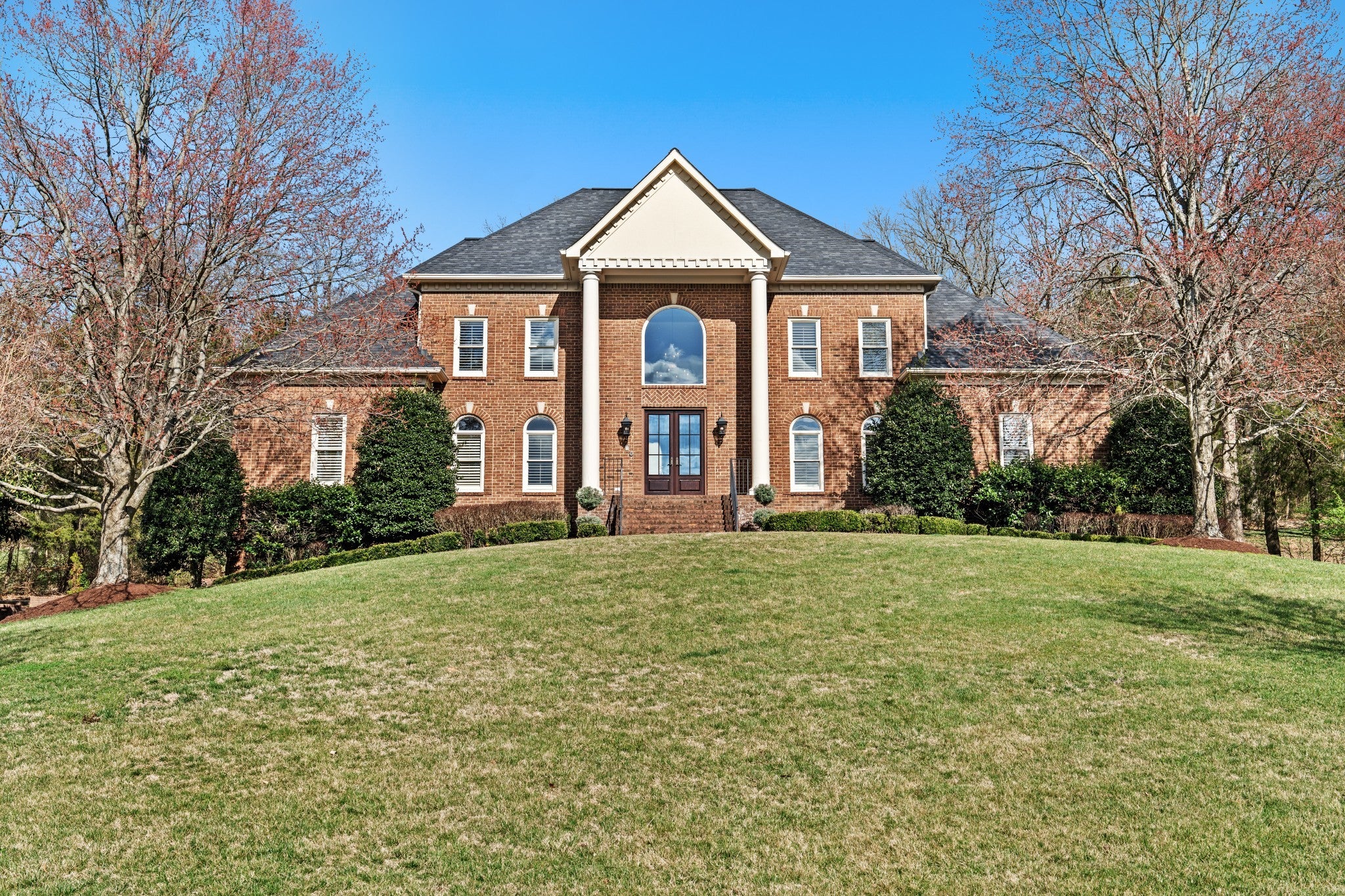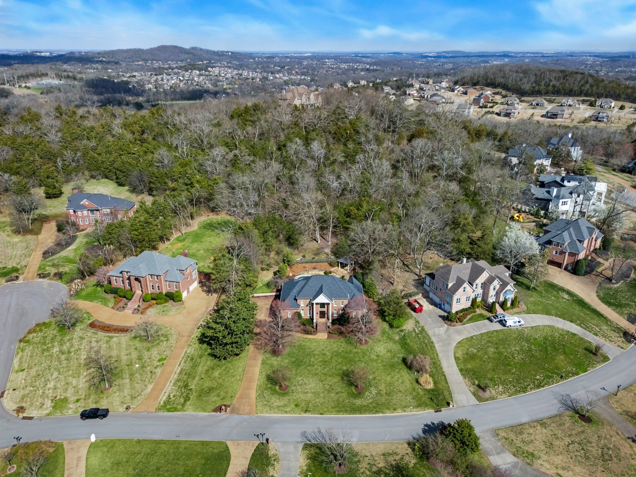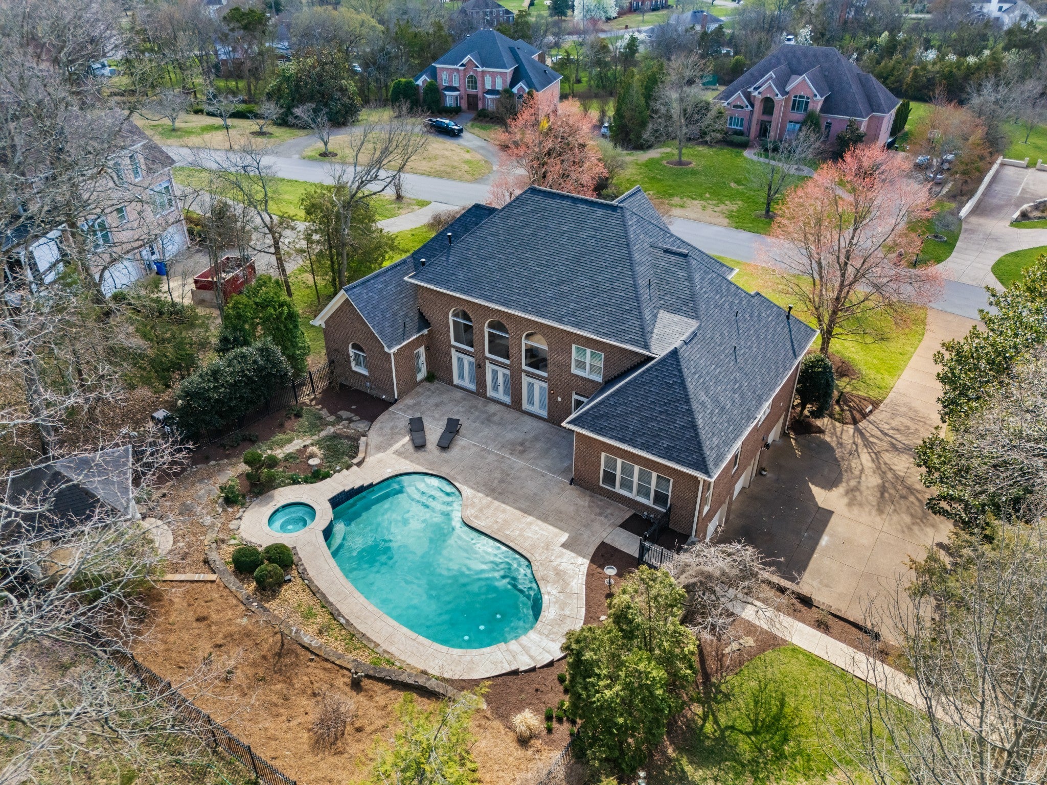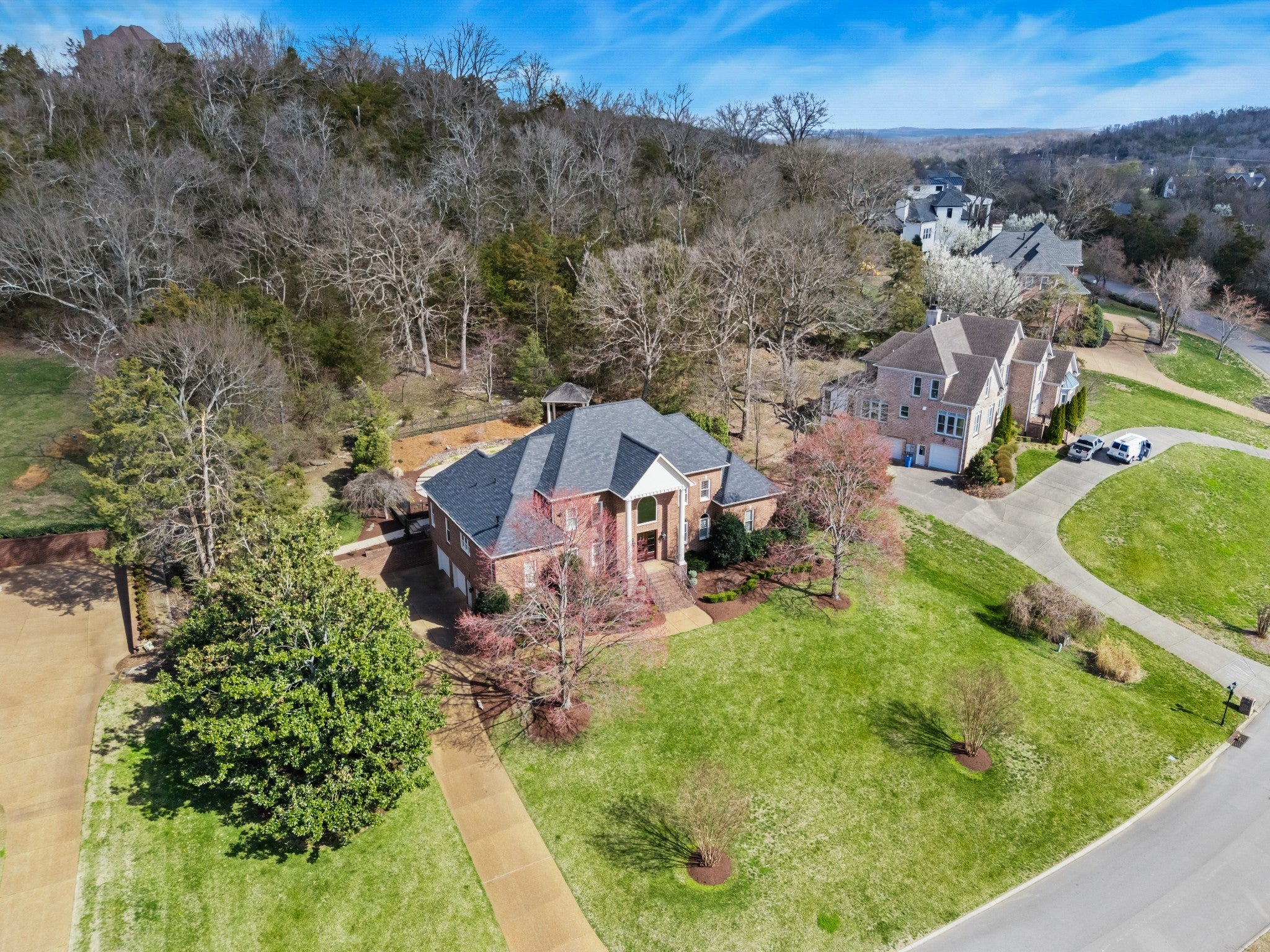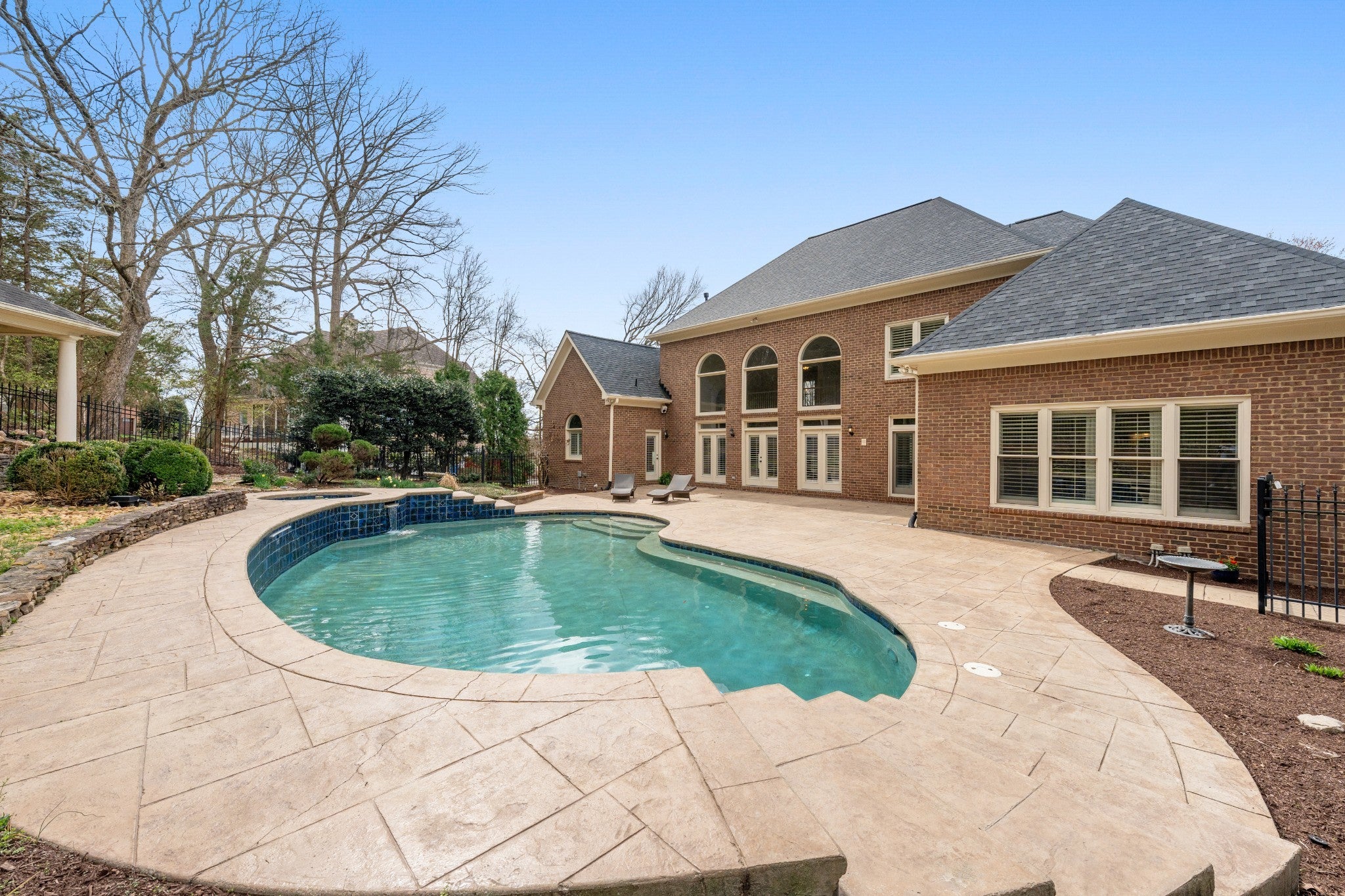 Set on one of only 16 estate lots in Brentwood's hilltop enclave of Chevoit Hills, this custom all-brick residence offers timeless elegance and exceptional indoor-outdoor living on 1 acre. The main level showcases a spacious primary retreat with a beautifully updated spa-inspired bath featuring quartz countertops, a soaking tub, and separate walk-in closets. Each additional bedroom offers its own private ensuite bath, providing comfort and privacy for family and guests alike. Designed for both everyday living and entertaining, the chef’s kitchen is appointed with a Sub-Zero refrigerator, Wolf 5-burner gas cooktop, new microwave, abundant white cabinetry, and granite countertops. The adjoining breakfast nook features custom built-in cabinetry and a wet bar for added convenience. Dual staircases offer both a grand front staircase and a secondary rear staircase for everyday functionality. Sophisticated architectural details including crown molding and plantation shutters are found throughout the home, while the expansive living room offers a warm gathering space centered around a gas fireplace.The fully finished basement provides additional living and recreation space, complete with a second gas fireplace and pool table area. The saltwater pool and hot tub create a private backyard retreat, enhanced by multiple recent upgrades to the pool’s mechanical systems. Additional highlights include a spacious three-car garage, central vacuum system, and a convenient dumbwaiter connecting the garage to the main floor laundry room. New roof (2023), new HVAC (2022) and tankless hot water heater. Most windows & exterior doors have been replaced. HOA is $150/year.