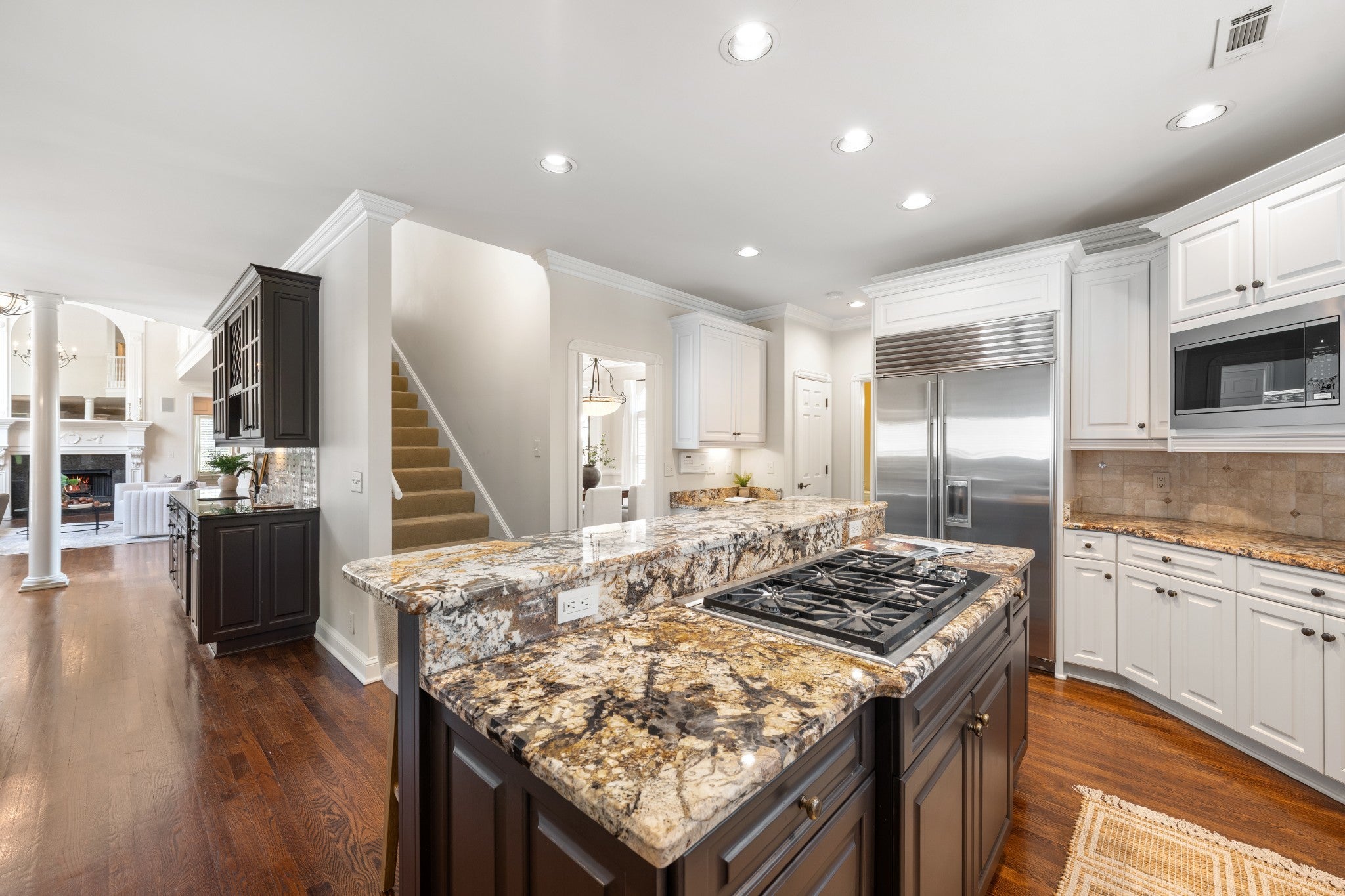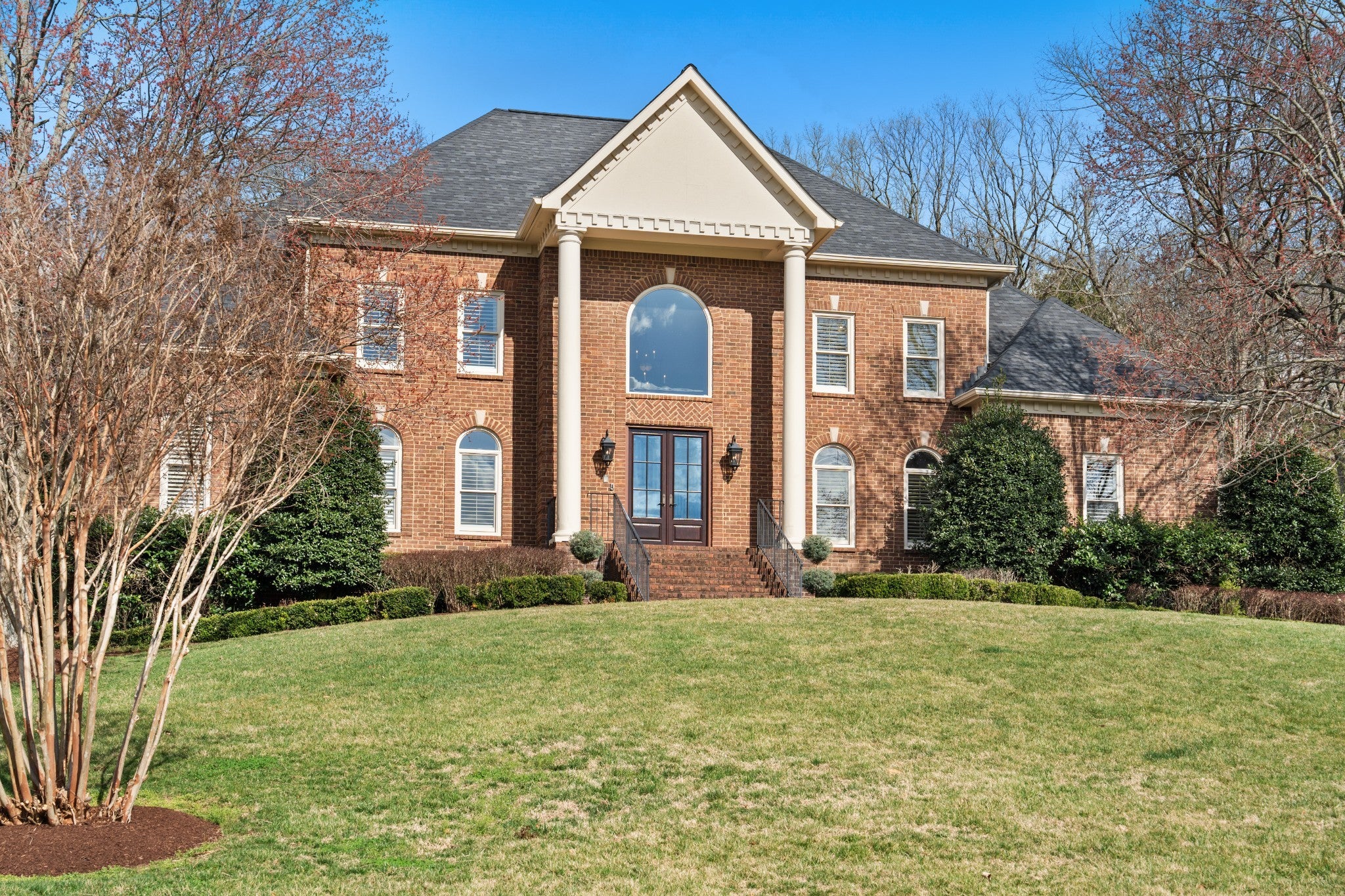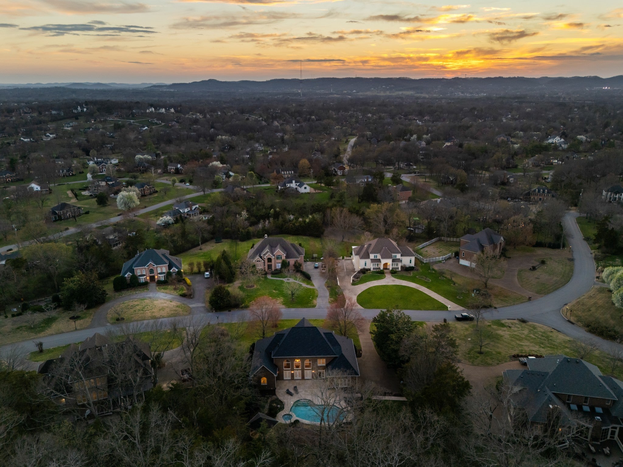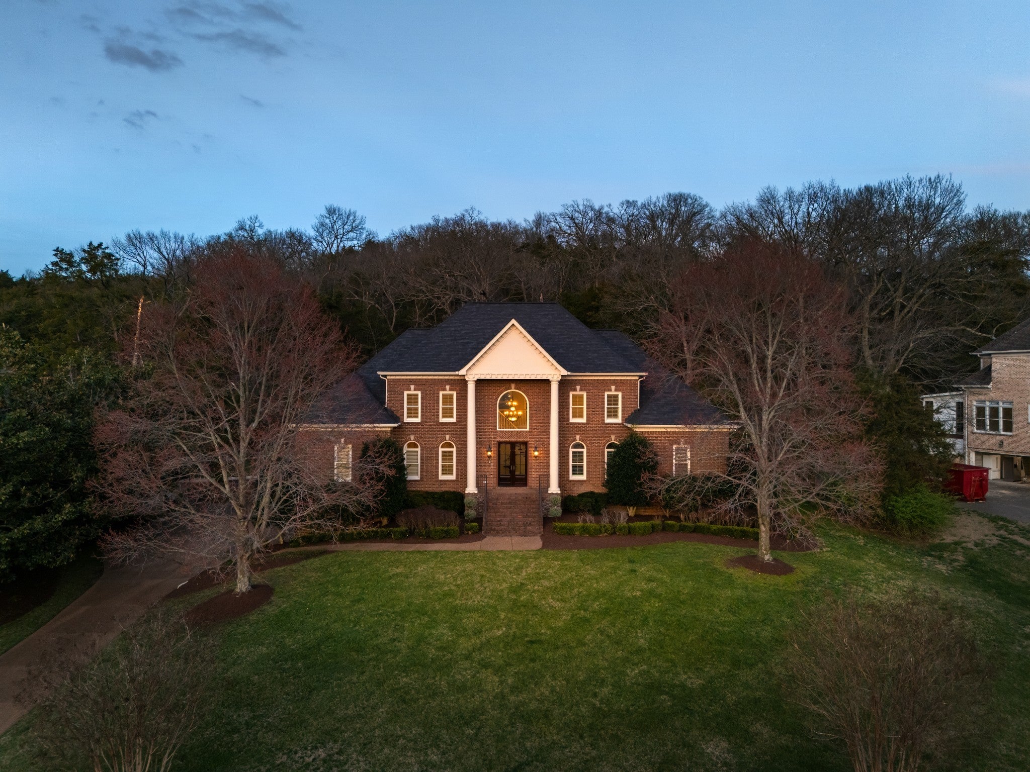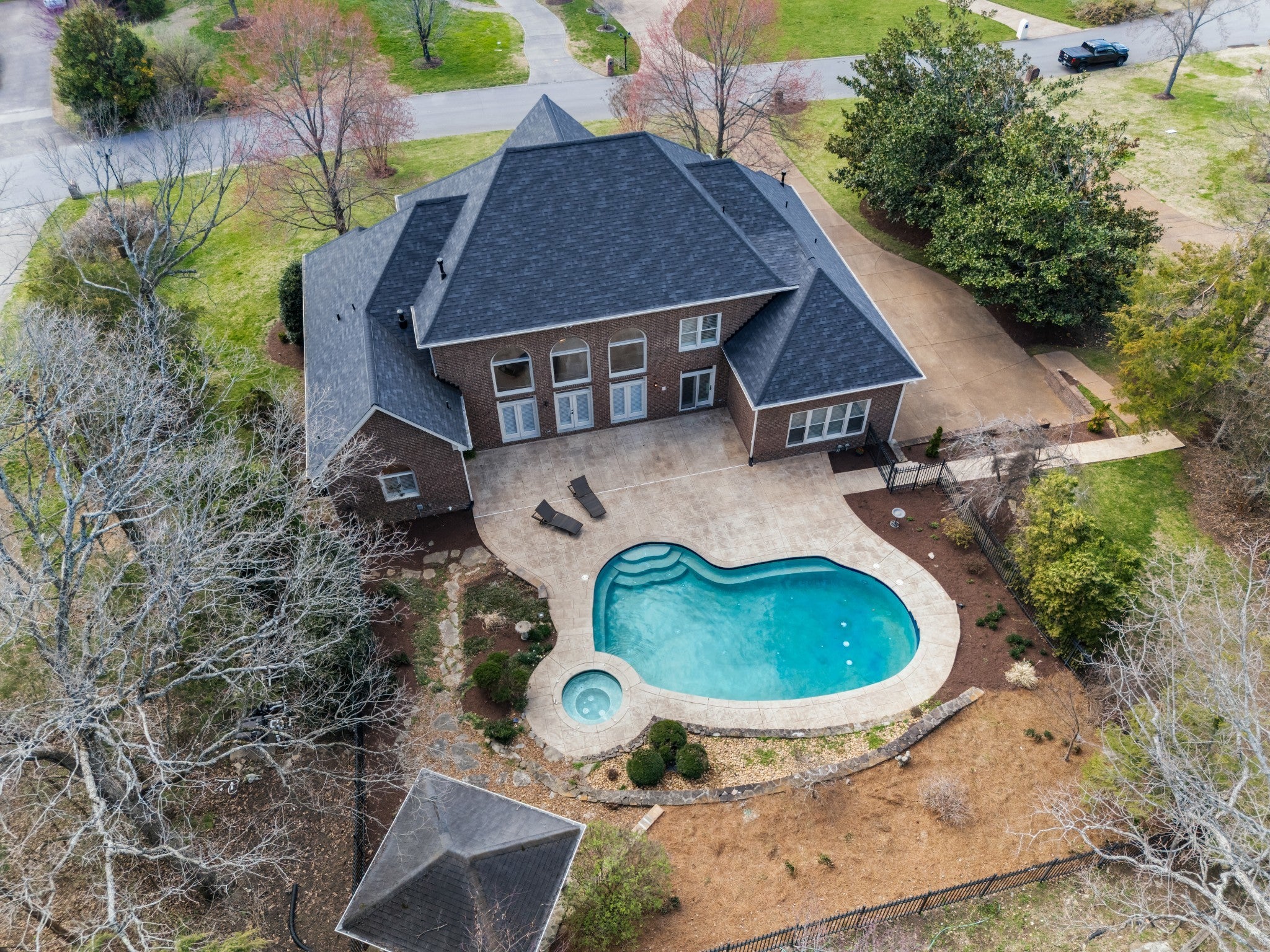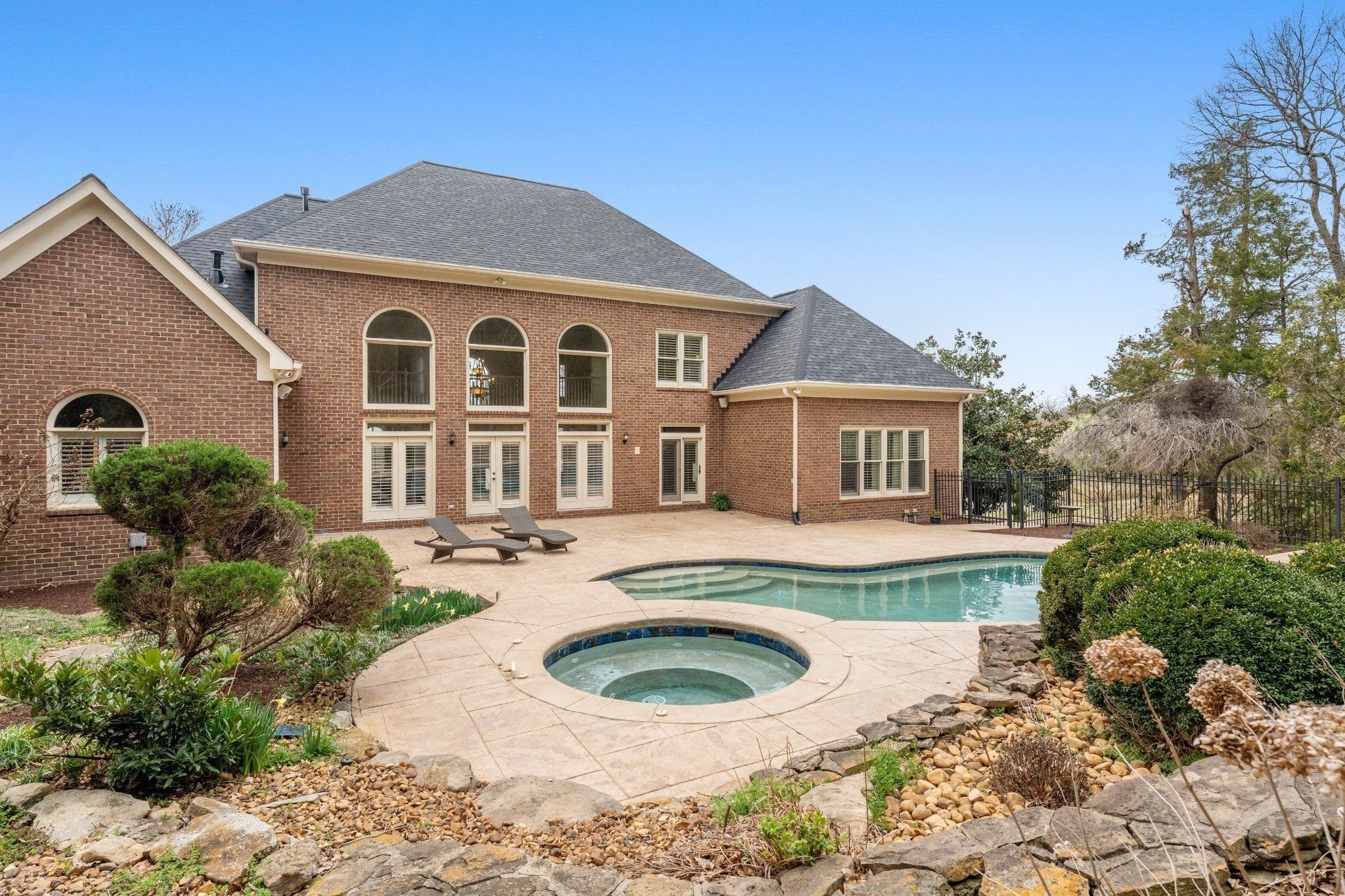 Set on one of only 16 estate lots in Brentwood's hilltop enclave of Chevoit Hills, this custom all-brick residence offers timeless elegance and exceptional indoor-outdoor living on 1 acre. The main level showcases a spacious primary retreat with a beautifully updated spa-inspired bath featuring quartz countertops, a soaking tub, and separate walk-in closets. Each additional bedroom offers its own private ensuite bath, providing comfort and privacy for family and guests alike. Designed for both everyday living and entertaining, the chef’s kitchen is appointed with a Sub-Zero refrigerator, Wolf 5-burner gas cooktop, new microwave, abundant white cabinetry, and granite countertops. The adjoining breakfast nook features custom built-in cabinetry and a wet bar for added convenience. Dual staircases offer both a grand front staircase and a secondary rear staircase for everyday functionality. Sophisticated architectural details including crown molding and plantation shutters are found throughout the home, while the expansive living room offers a warm gathering space centered around a gas fireplace.The fully finished basement provides additional living and recreation space, complete with a second gas fireplace and pool table area. The saltwater pool and hot tub create a private backyard retreat, enhanced by multiple recent upgrades to the pool’s mechanical systems. Additional highlights include a spacious three-car garage, central vacuum system, and a convenient dumbwaiter connecting the garage to the main floor laundry room. New roof (2023), new HVAC (2022) and tankless hot water heater. Most windows & exterior doors have been replaced. HOA is $150/year.