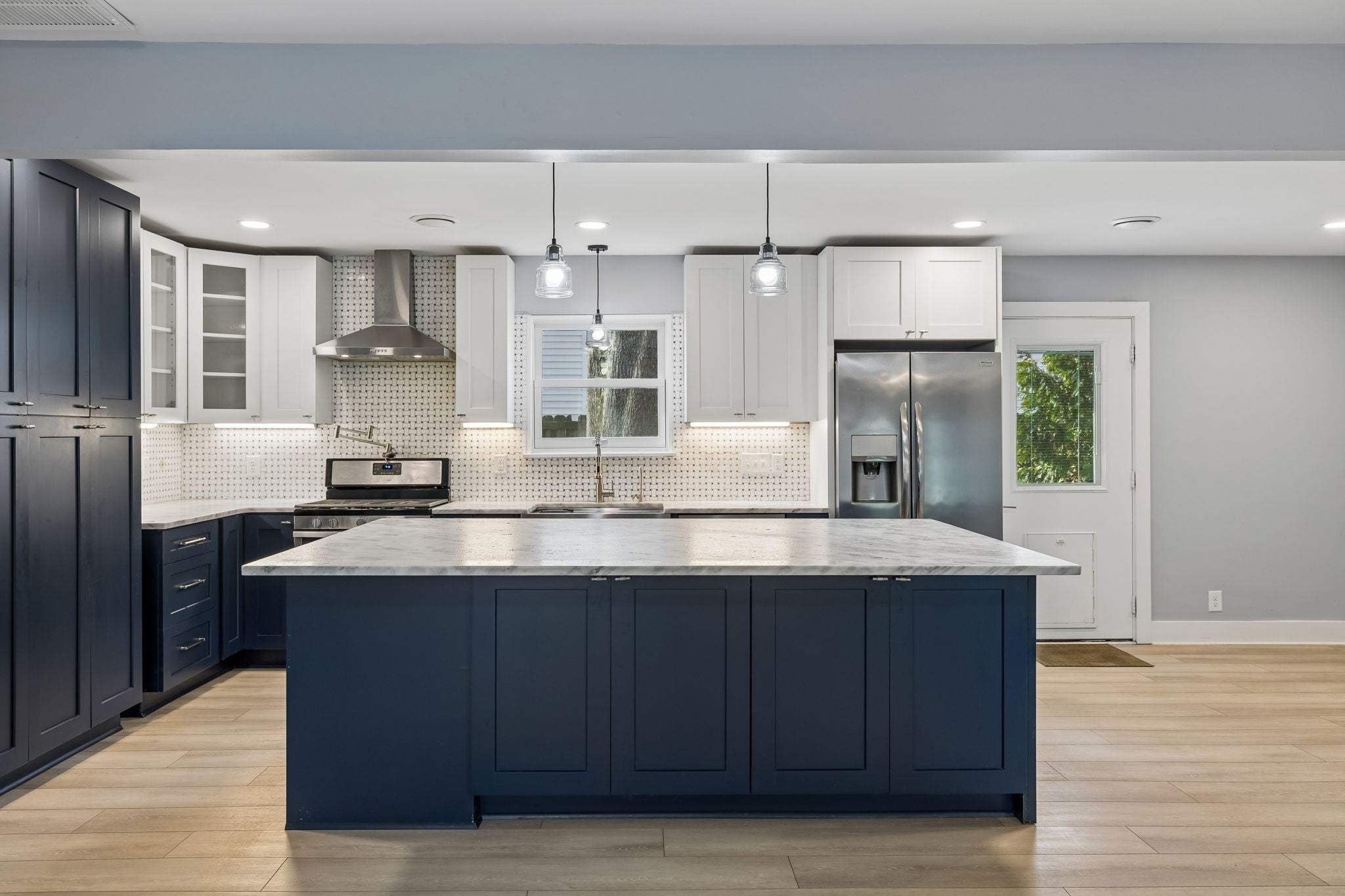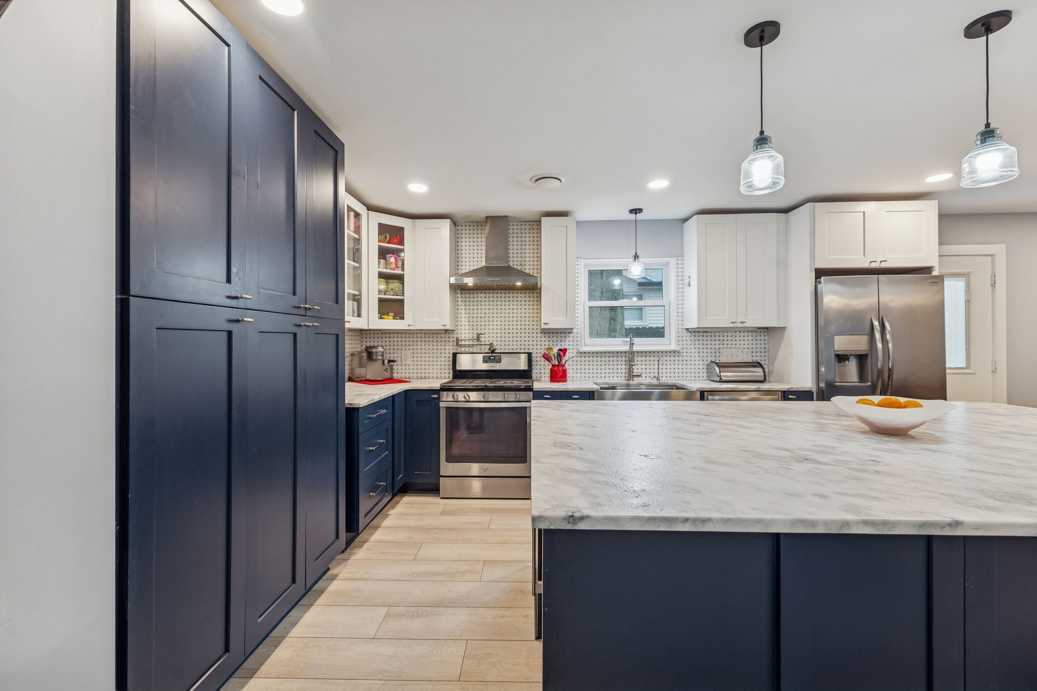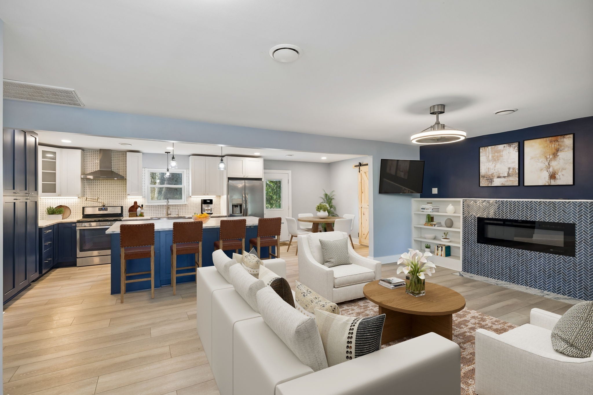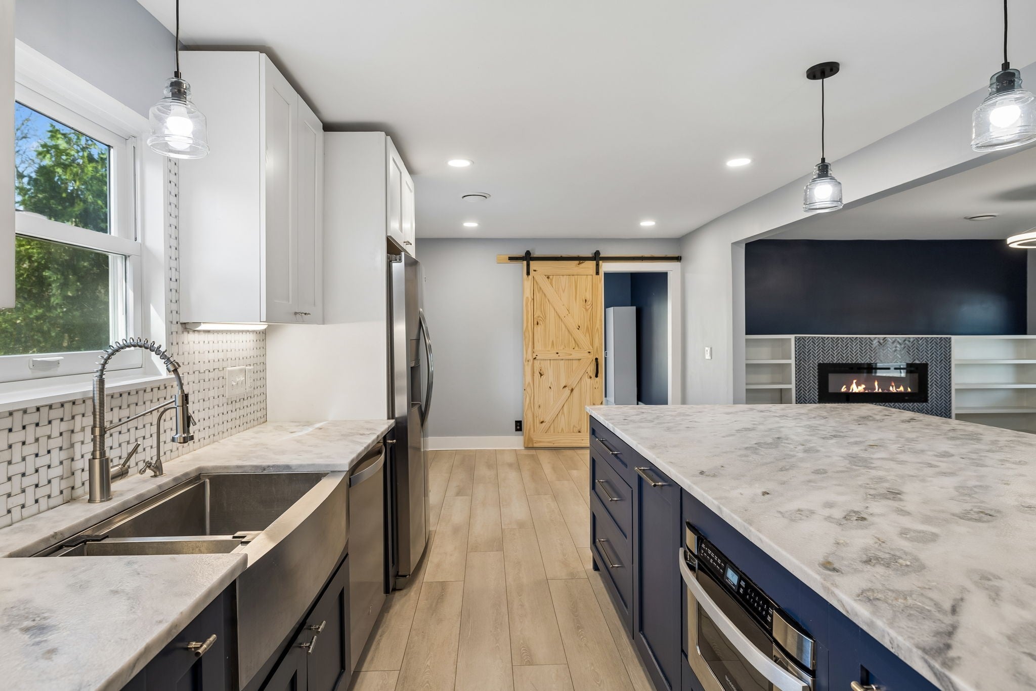 Motivated seller. Completely renovated one-level home just minutes from Downtown Franklin offering true step-free living, thoughtful design, and a rare combination of privacy and convenience. With no interior or exterior stairs, wide open living areas, and roll-in showers, the layout works seamlessly for a variety of lifestyles, including multigenerational living or anyone prioritizing ease and accessibility in a single-level home. Renovated top to bottom in April 2024, the home features LVP flooring throughout, fresh interior paint, new HVAC and ductwork, tankless water heater, and fully replaced plumbing including the line from the street. Windows were replaced approximately four years ago, and the roof has been pre-inspected for added confidence. The kitchen anchors the home with an oversized island, custom blue and white cabinetry, leathered quartz countertops, roll-out shelving, hidden trash drawer, built-in drawer microwave, stainless appliances, farmhouse sink, gas range, and generous storage. The flexible floor plan offers four bedrooms, with the fourth ideal for a home office or additional living space. Both bathrooms feature roll-in showers, marble countertops, and lighted mirrors. The primary suite includes dual vanities and a freestanding soaking tub. An electric fireplace with built-ins defines the main living space, while the large mudroom and laundry area with utility sink adds everyday functionality. Washer and dryer remain. The fenced backyard is surrounded by mature trees and offers a level of outdoor space that is increasingly hard to find this close to Franklin. Features include a screened porch, pool, raised garden beds, berry bushes, fruit trees, and a storage shed. A separate gated garden area with additional fruit trees is tucked deeper into the property and easy to miss. Two separate driveways provide ample parking and flexibility.