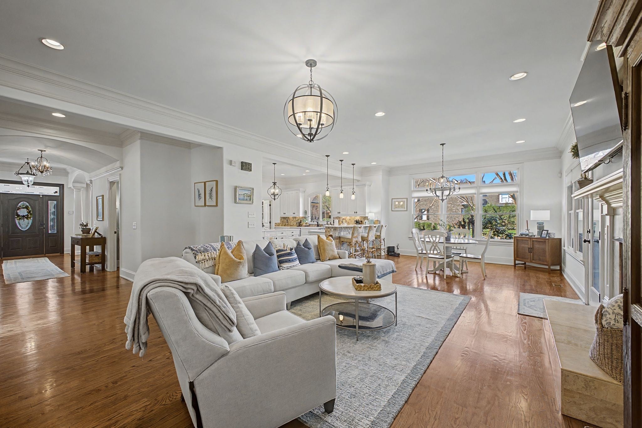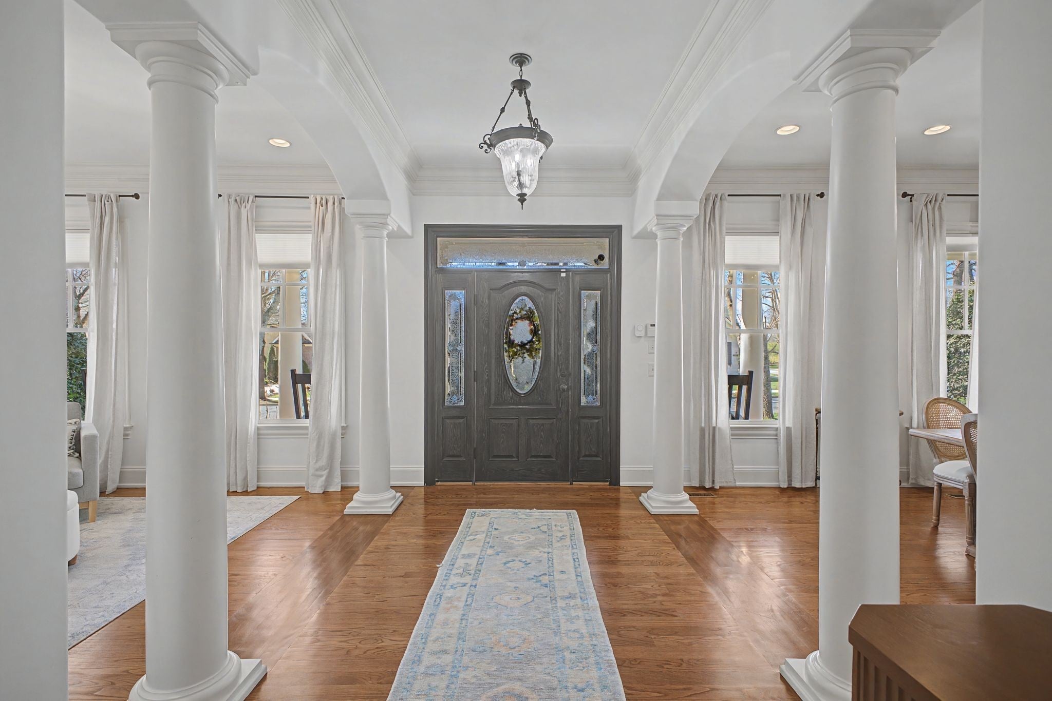 A timeless Southern masterpiece, this beautifully refreshed home blends classic architecture with modern comfort in one of the area’s most admired settings. Wrapped in a grand columned porch and surrounded by lush landscaping, it welcomes with undeniable curb appeal (oversized CORNER LOT). Inside, fresh interior paint throughout enhances the home’s light, bright, and elegant feel. The gourmet kitchen features custom cabinetry, double ovens, a large center island, stone backsplash, and seamless flow into the open living and dining spaces—perfect for everyday living and entertaining. Hardwood floors, arched doorways, detailed millwork, and designer lighting elevate every room. The serene primary suite offers a spacious retreat with a spa-inspired bath, dual vanities, a soaking tub, and abundant storage. Additional bedrooms are generously sized and thoughtfully arranged for comfort and privacy. Outdoor living shines with a charming screened porch, inviting patio, and wraparound porch—all surrounded by mature trees and vibrant hydrangeas. Whether hosting gatherings or enjoying quiet mornings, the outdoor spaces feel private and peaceful. Impeccably maintained and freshly updated, this home offers rare character, refined style, and everyday livability in a truly distinguished setting.