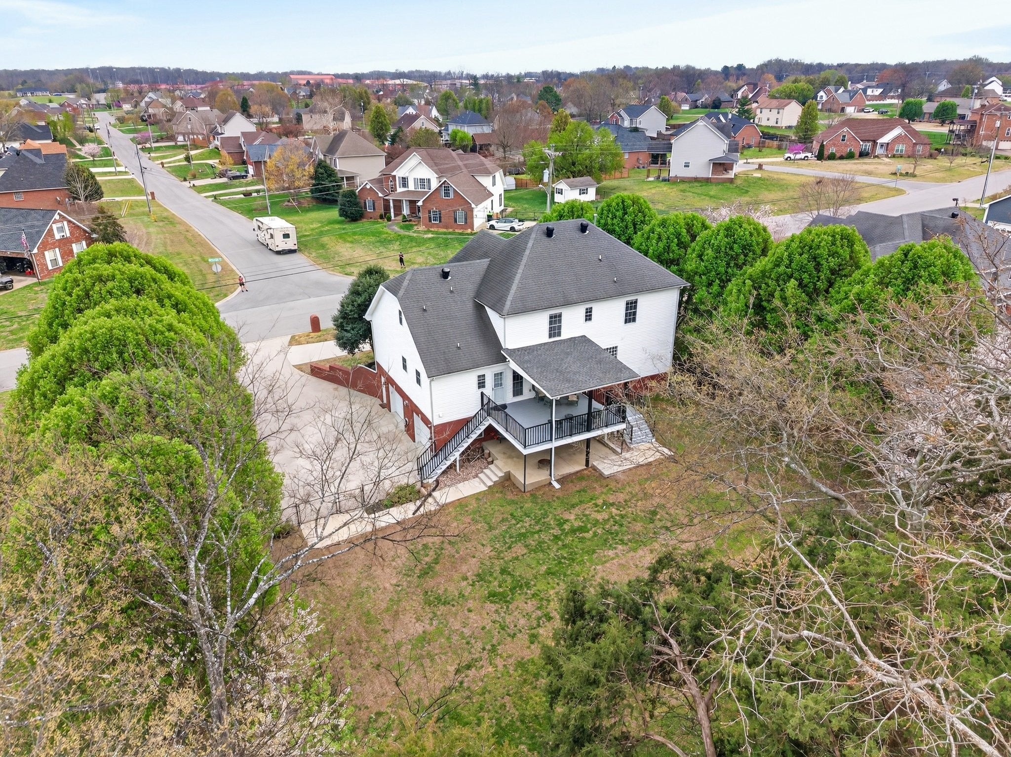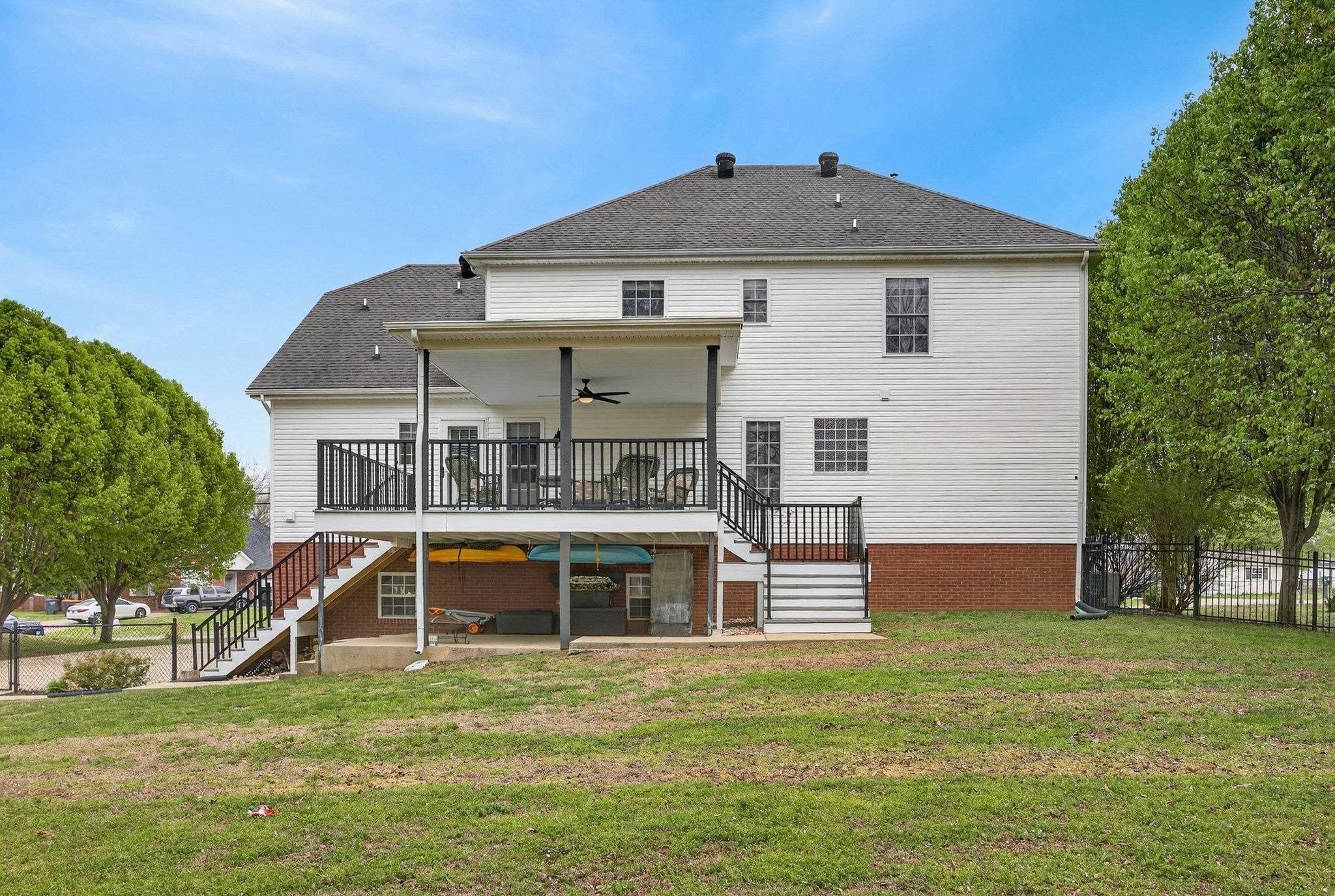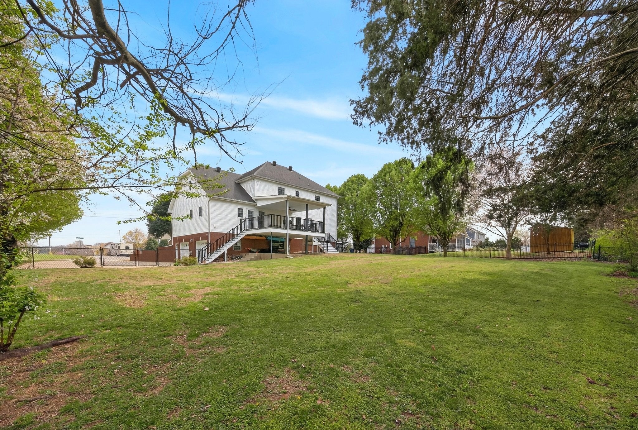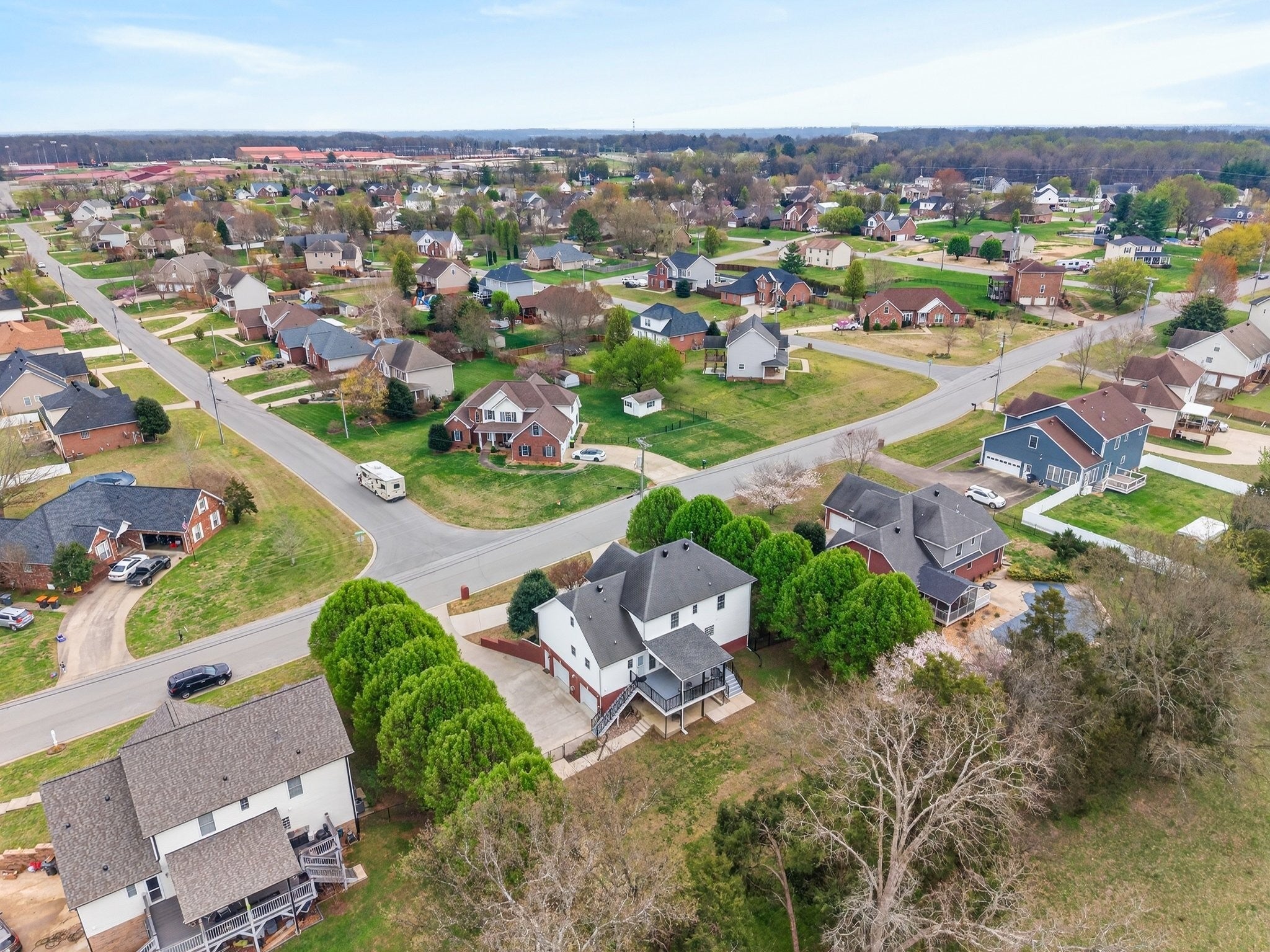 Extremely well maintained home in the desirable Page Estates community just off Rossview Rd. The open main living area features a two-sided fireplace connecting the living room to a flexible space perfect for a home office or formal dining room. The kitchen stands out with quartz countertops and a beautiful waterfall island, ideal for entertaining. The primary suite is conveniently located on the main level and features a private ensuite bath. An additional upstairs bedroom offers its own private bath and an oversized walk-in closet, while the spacious loft/bonus area provides flexible living space. The finished basement includes a half bath, a tornado/safe room, and additional flexible space. Enjoy the large fenced backyard with no homes directly behind, along with an updated deck and lower-level concrete patio perfect for relaxing and taking in the view. Additional highlights include a circular driveway, side-entry two-car garage, water softener system, kitchen sink filtration system, bike racks, and pride of ownership throughout. This home is fully equipped with a Reliance Pro/Tran transfer switch, generator inlet, and a 30-amp RV plug.