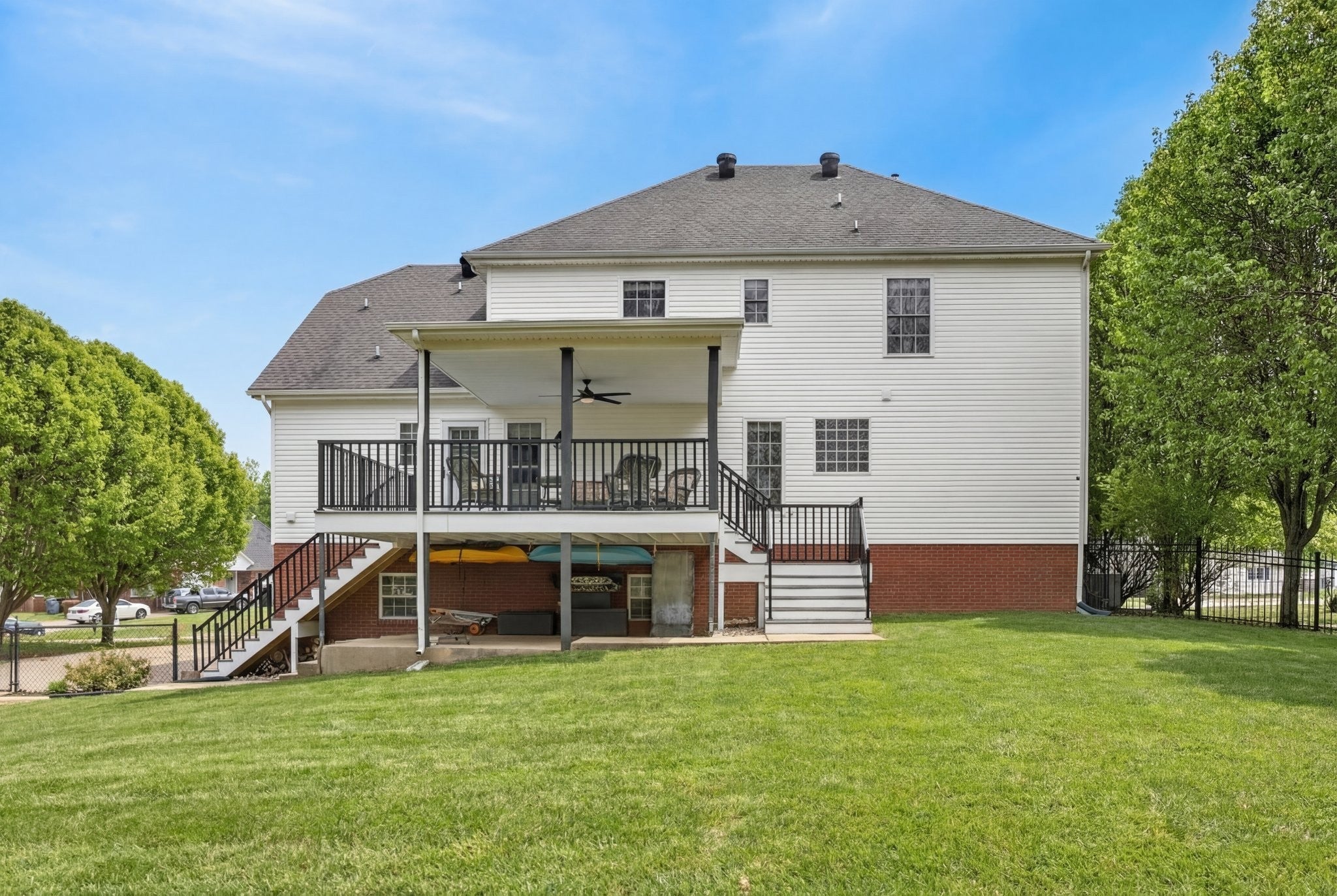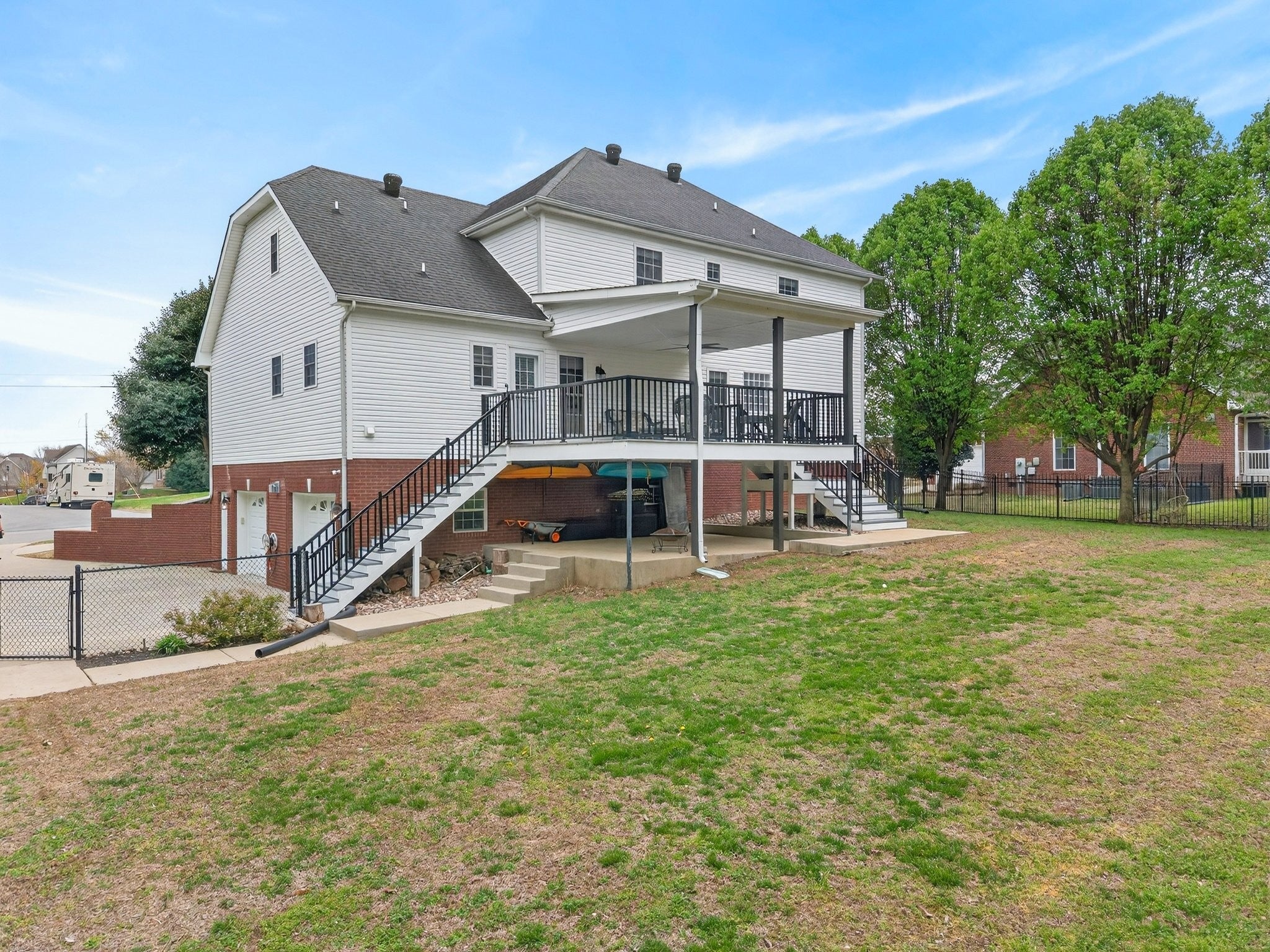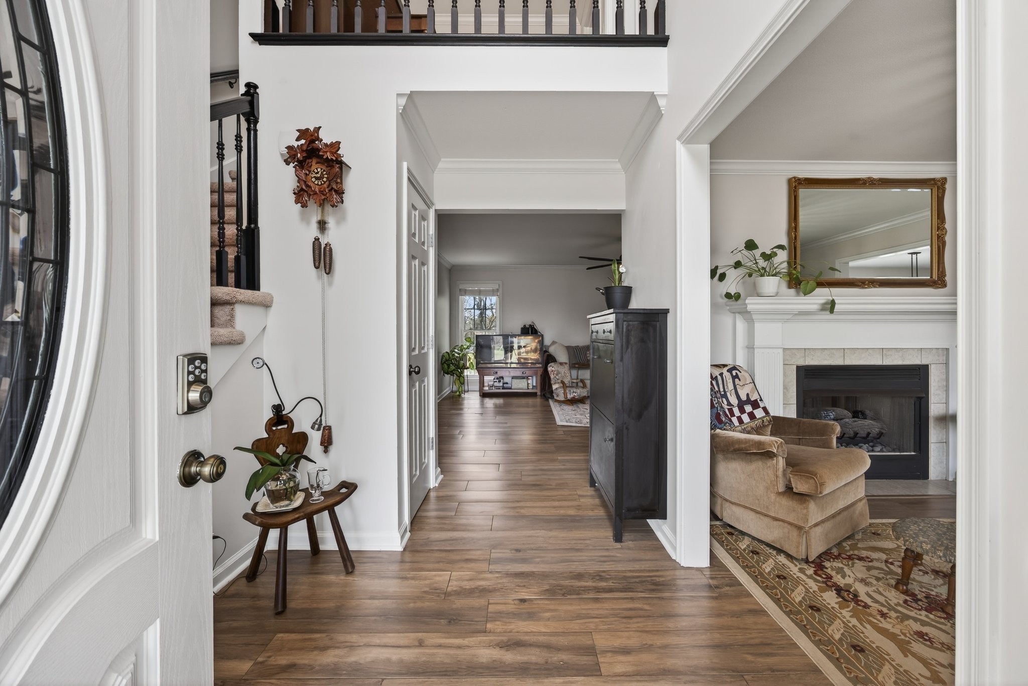 Extremely well maintained home in the desirable Page Estates community just off Rossview Rd. The open main living area features a two-sided fireplace connecting the living room to a flexible space perfect for a home office or formal dining room. The kitchen stands out with quartz countertops and a beautiful waterfall island, ideal for entertaining. The primary suite is conveniently located on the main level and features a private ensuite bath. An additional upstairs bedroom offers its own private bath and an oversized walk-in closet, while the spacious loft/bonus area provides flexible living space. The finished basement includes a half bath, a tornado/safe room, and additional flexible space. Enjoy the large fenced backyard with no homes directly behind, along with an updated deck and lower-level concrete patio perfect for relaxing and taking in the view. Additional highlights include a circular driveway, side-entry two-car garage, water softener system, kitchen sink filtration system, bike racks, and pride of ownership throughout. This home is fully equipped with a Reliance Pro/Tran transfer switch, generator inlet, and a 30-amp RV plug.
