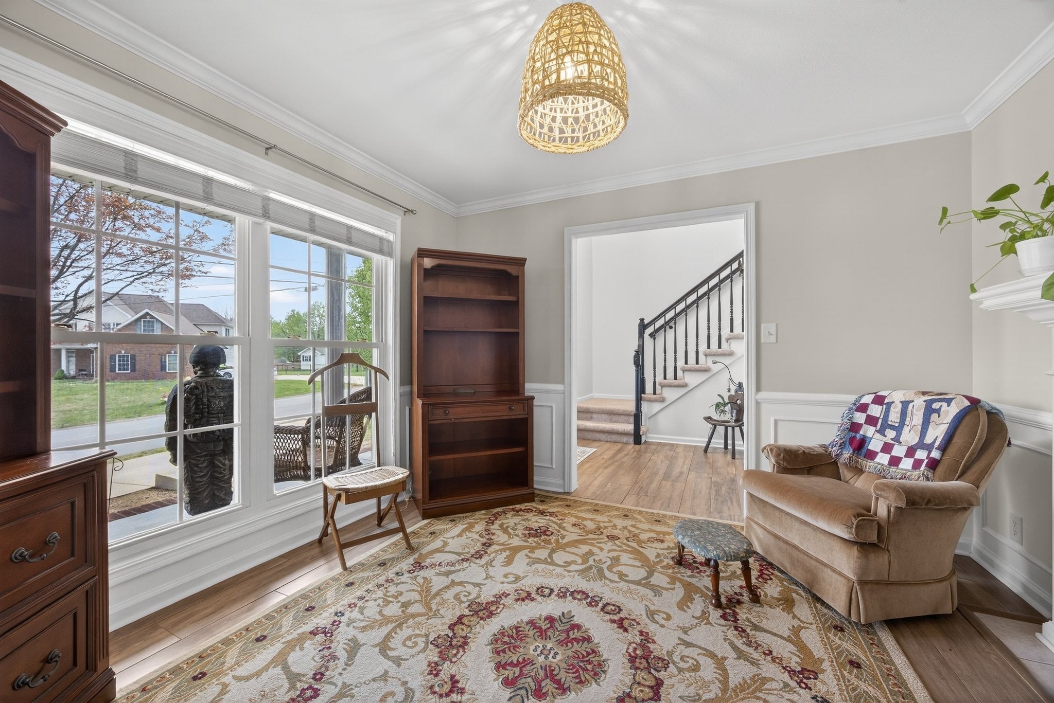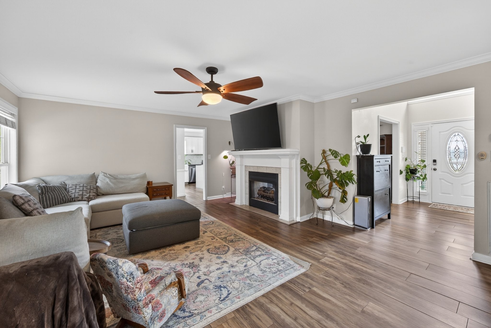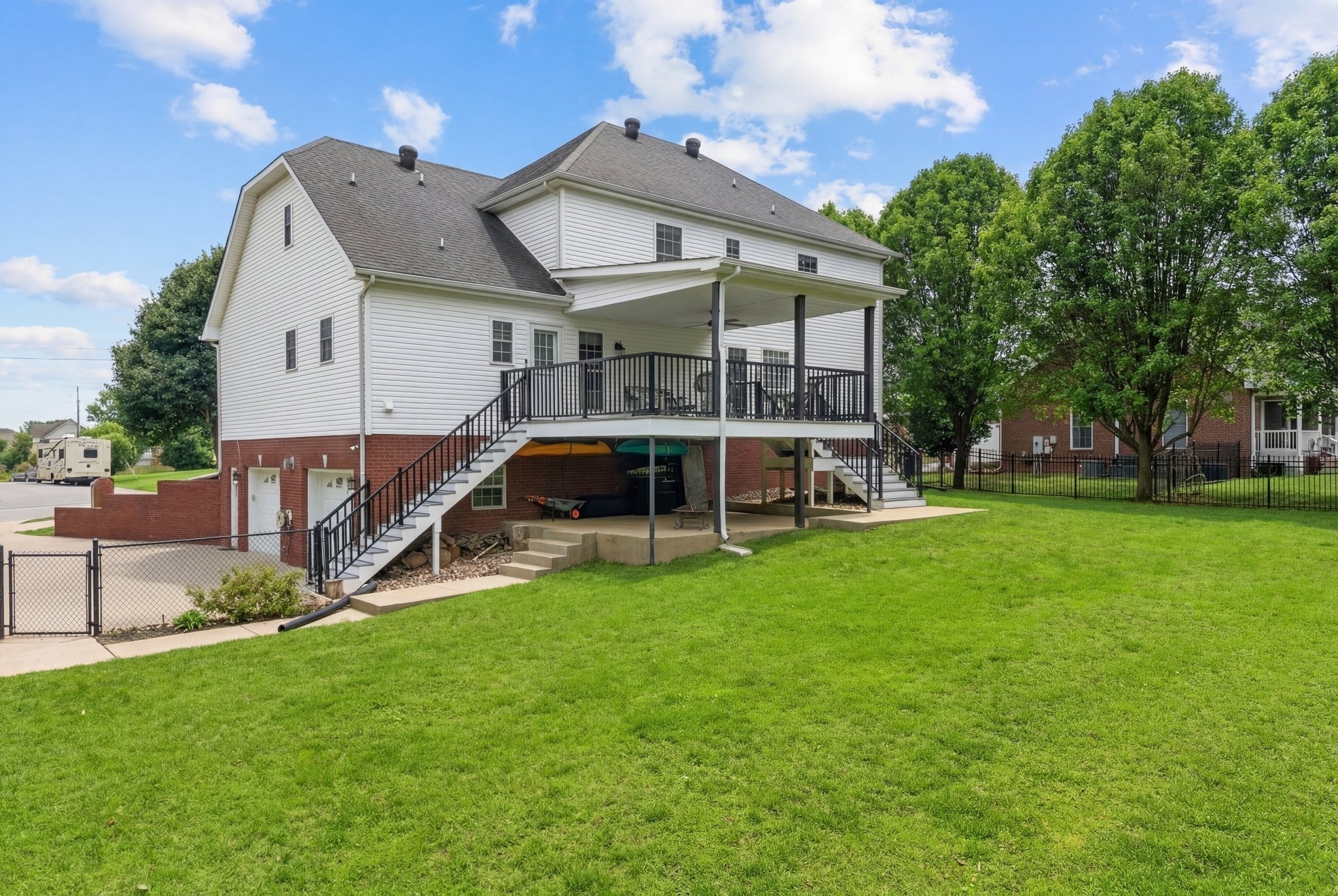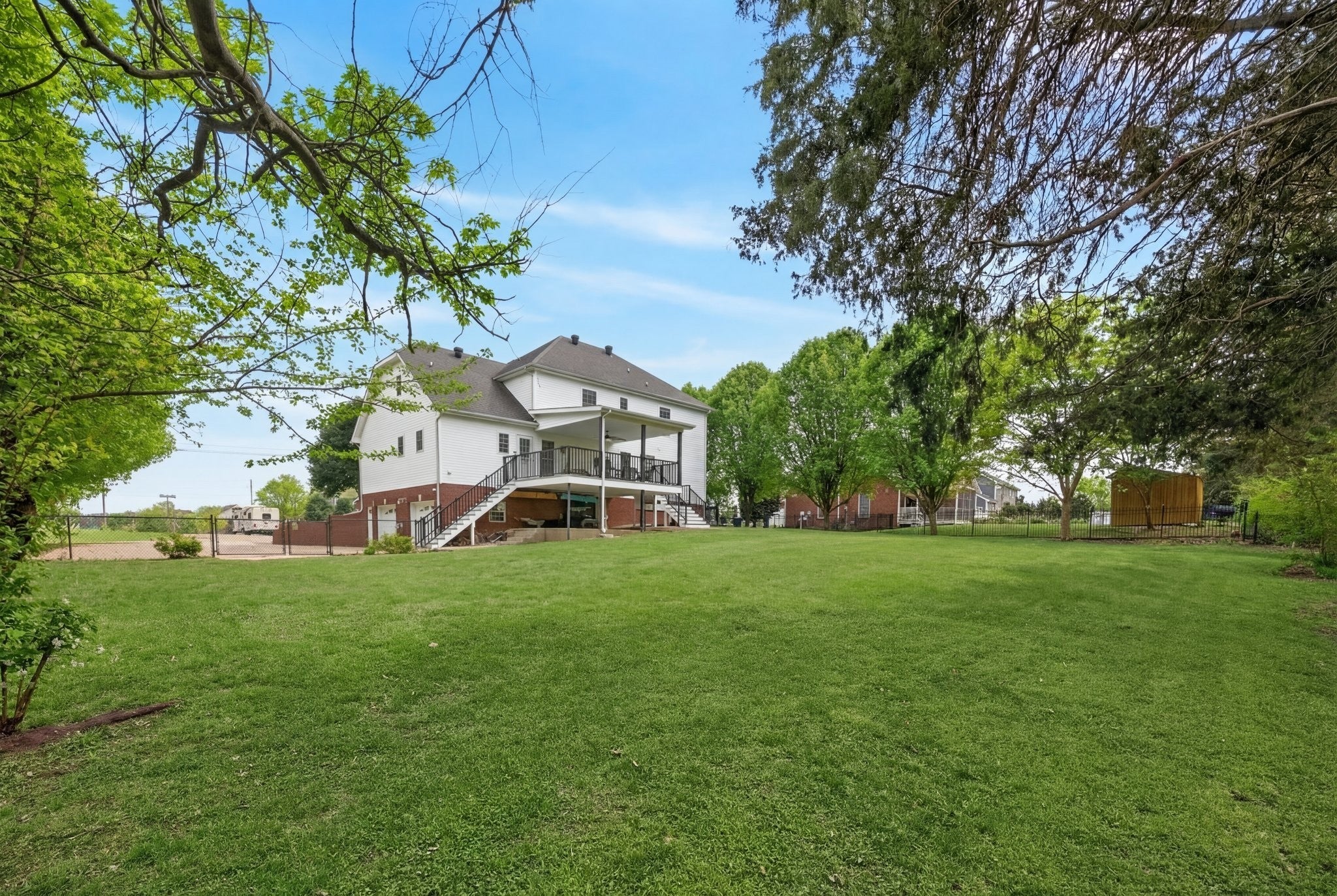 Extremely well maintained home in the desirable Page Estates community just off Rossview Rd. The open main living area features a two-sided fireplace connecting the living room to a flexible space perfect for a home office or formal dining room. The kitchen stands out with quartz countertops and a beautiful waterfall island, ideal for entertaining. The primary suite is conveniently located on the main level and features a private ensuite bath. An additional upstairs bedroom offers its own private bath and an oversized walk-in closet, while the spacious loft/bonus area provides flexible living space. The finished basement includes a half bath, a tornado/safe room, and additional flexible space. Enjoy the large fenced backyard with no homes directly behind, along with an updated deck and lower-level concrete patio perfect for relaxing and taking in the view. Additional highlights include a circular driveway, side-entry two-car garage, water softener system, kitchen sink filtration system, bike racks, and pride of ownership throughout. This home is fully equipped with a Reliance Pro/Tran transfer switch, generator inlet, and a 30-amp RV plug.