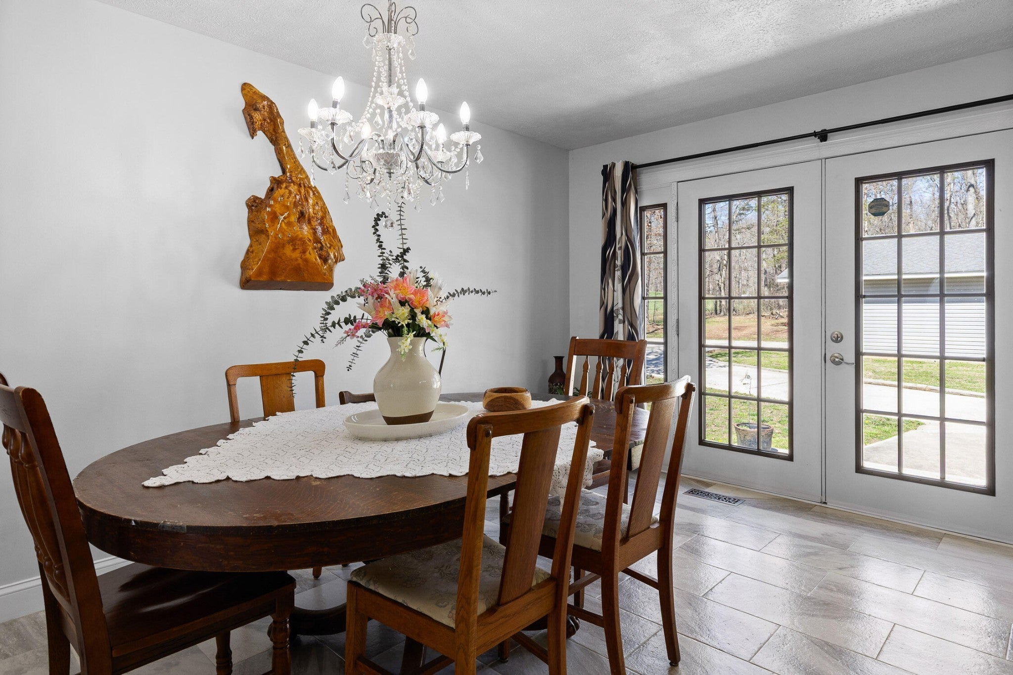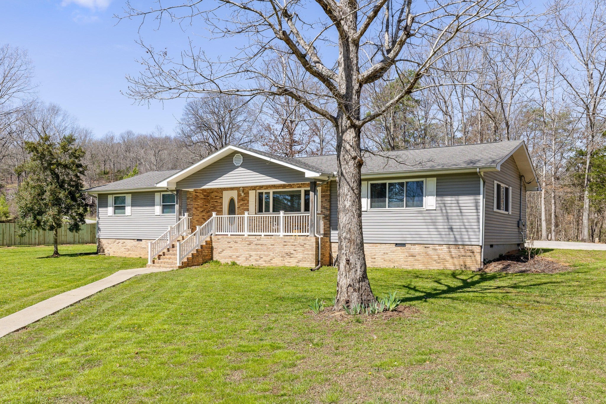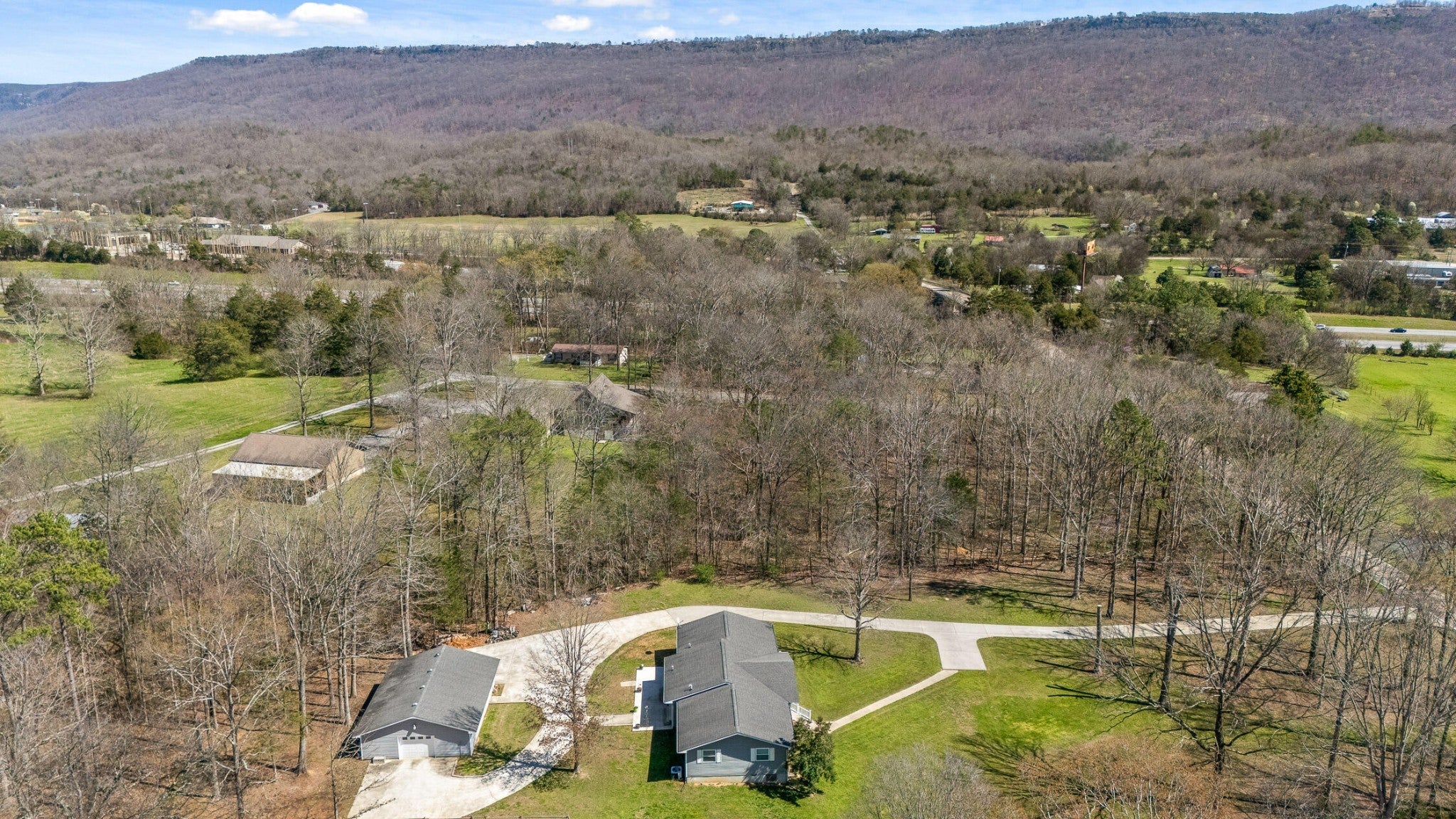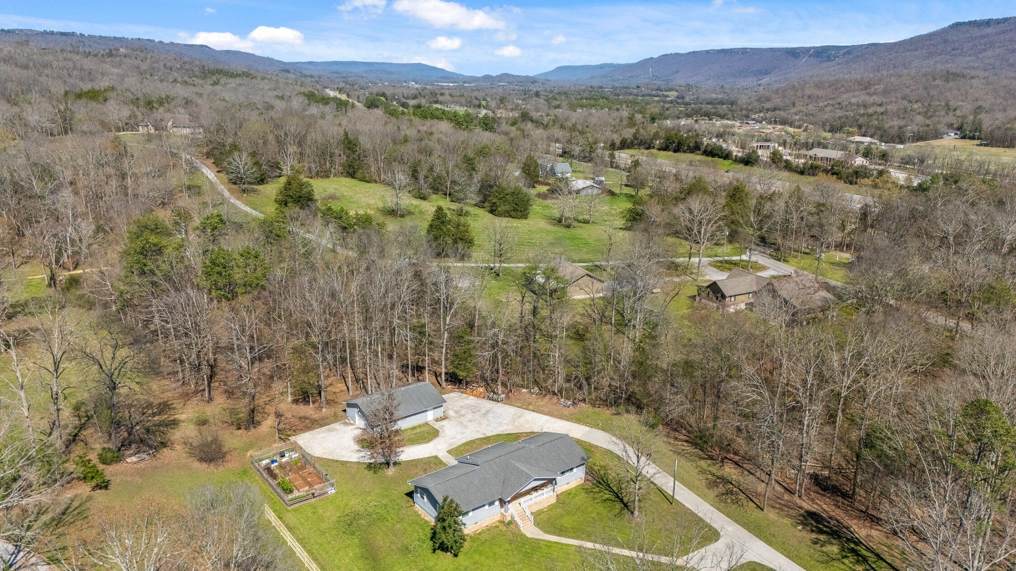 Tucked away on a peaceful 2 acre setting, this home welcomes you in the moment you turn down the long paved driveway. As you approach, you immediately notice the sense of space and privacy, along with plenty of parking for family and guests. The covered front porch invites you to slow down for a moment. It is the kind of porch made for rocking chairs, morning coffee, and taking in the beautiful mountain and wooded views stretching out in front of you. Step inside and you are greeted by a warm, light filled living room where beautiful hardwood floors and large windows frame the scenery outside and fill the home with natural light. From here, the home naturally opens in multiple directions. To the left is the private bedroom wing with two comfortable guest bedrooms and the primary suite, which features its own attached bath that also offers convenient hall access for guests. This hallway also includes nice organizational/storage spaces in the coat closet immediately inside the front door, as well as a hallway linen closet. Straight ahead from the living room, you enter the dining room and kitchen, creating a light infused natural gathering space in the heart of the home. French doors open from this area to the back patio, making it easy to step outside and extend meals and time with family into the outdoor space. From the kitchen, the layout continues to the right where you will find a full bathroom, a large den or family room perfect for relaxing or hosting, and the laundry area. The living areas feel open and spacious with an abundance of natural light filling each room. All appliances are within 3-4 years old. Outside, the property continues to shine. The patio and driveway area provide plenty of space for cookouts, celebrations, and enjoying the peaceful surroundings. The oversized detached garage offers 1200 sq.ft of insulated space for parking, storage & workspace, and even includes RV electrical hookups!
