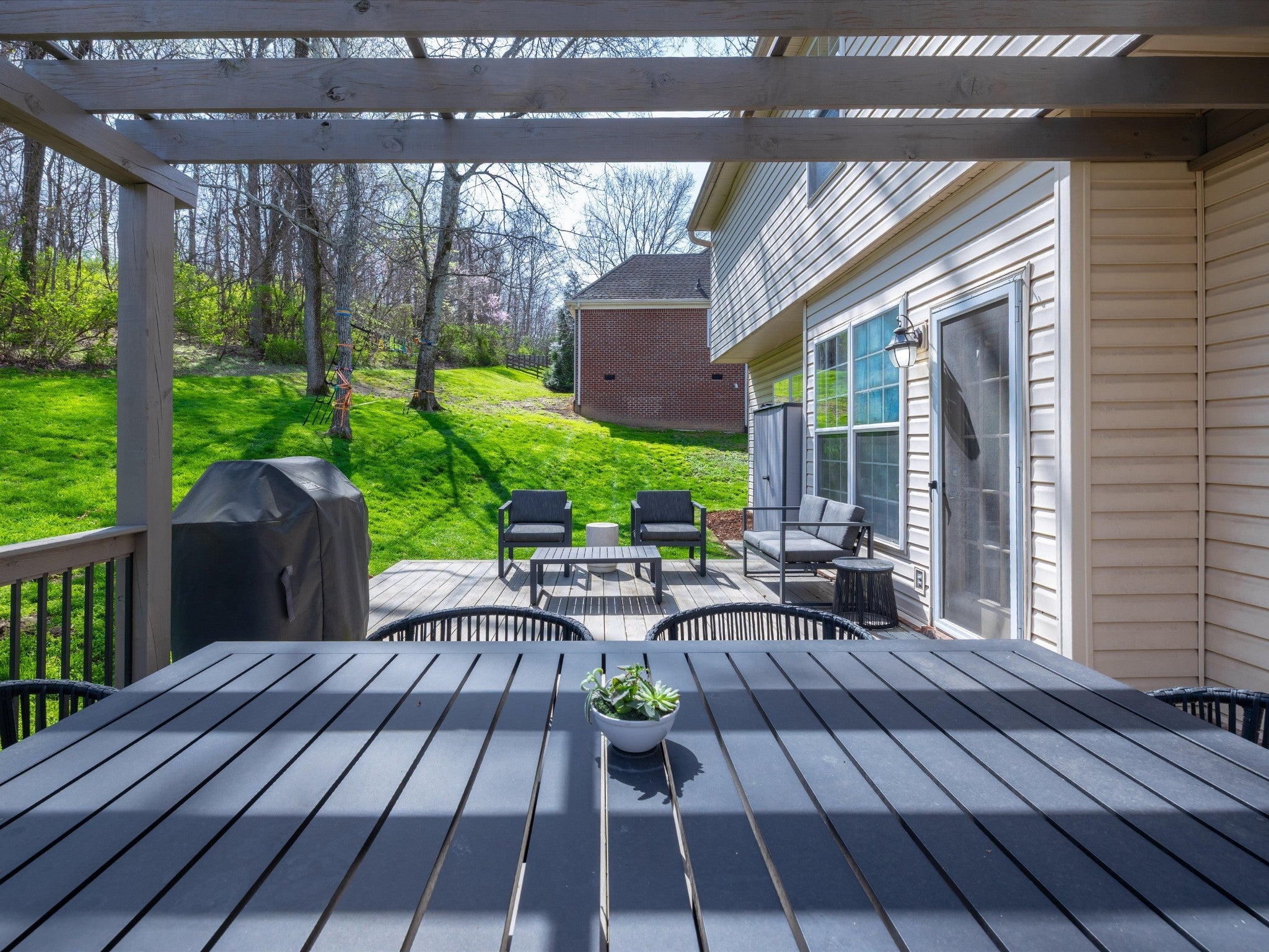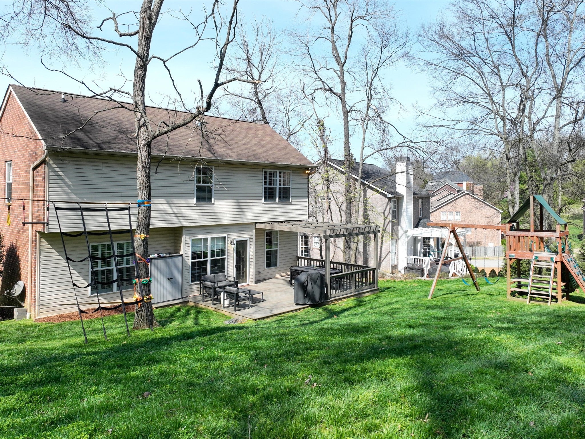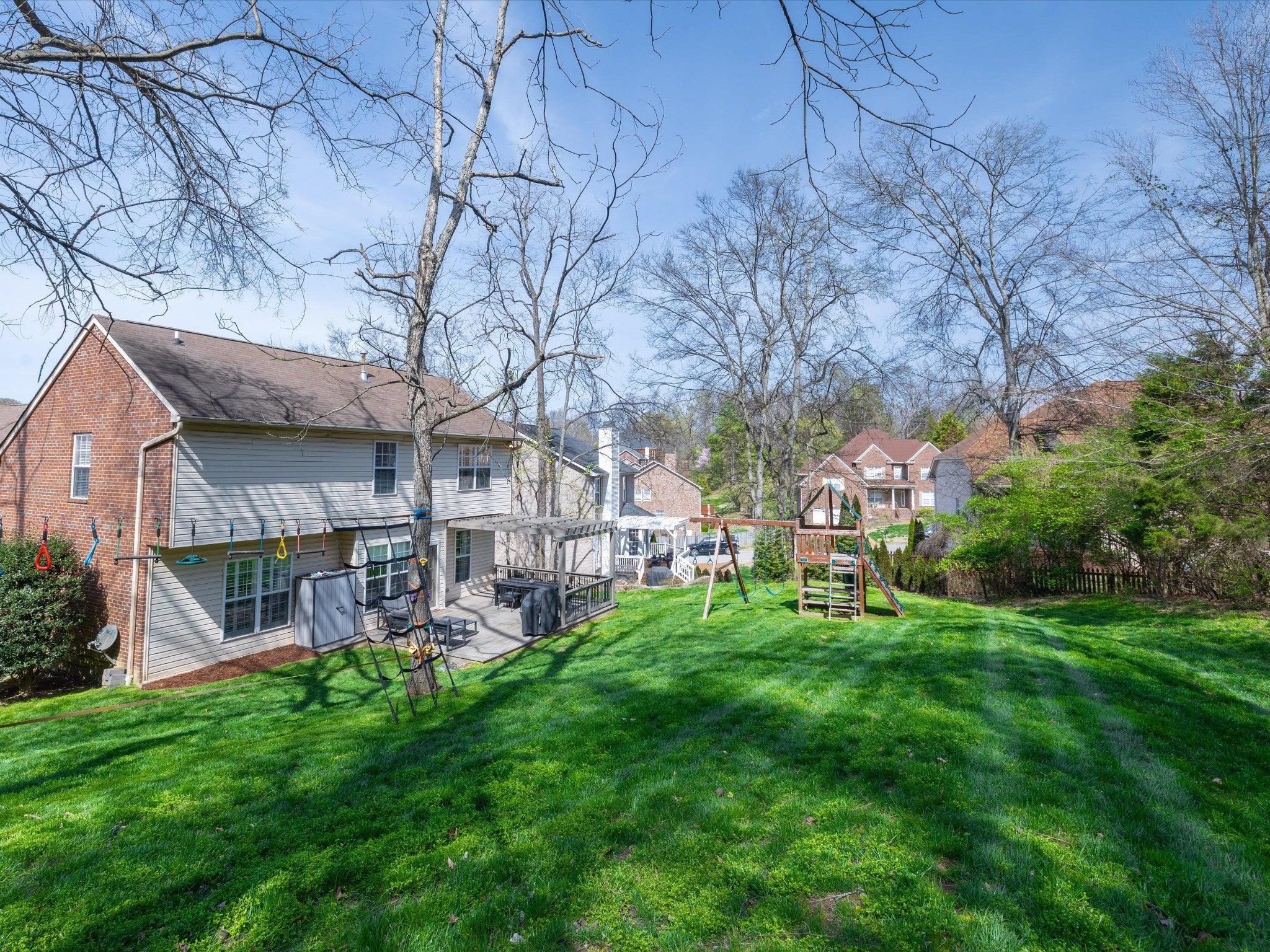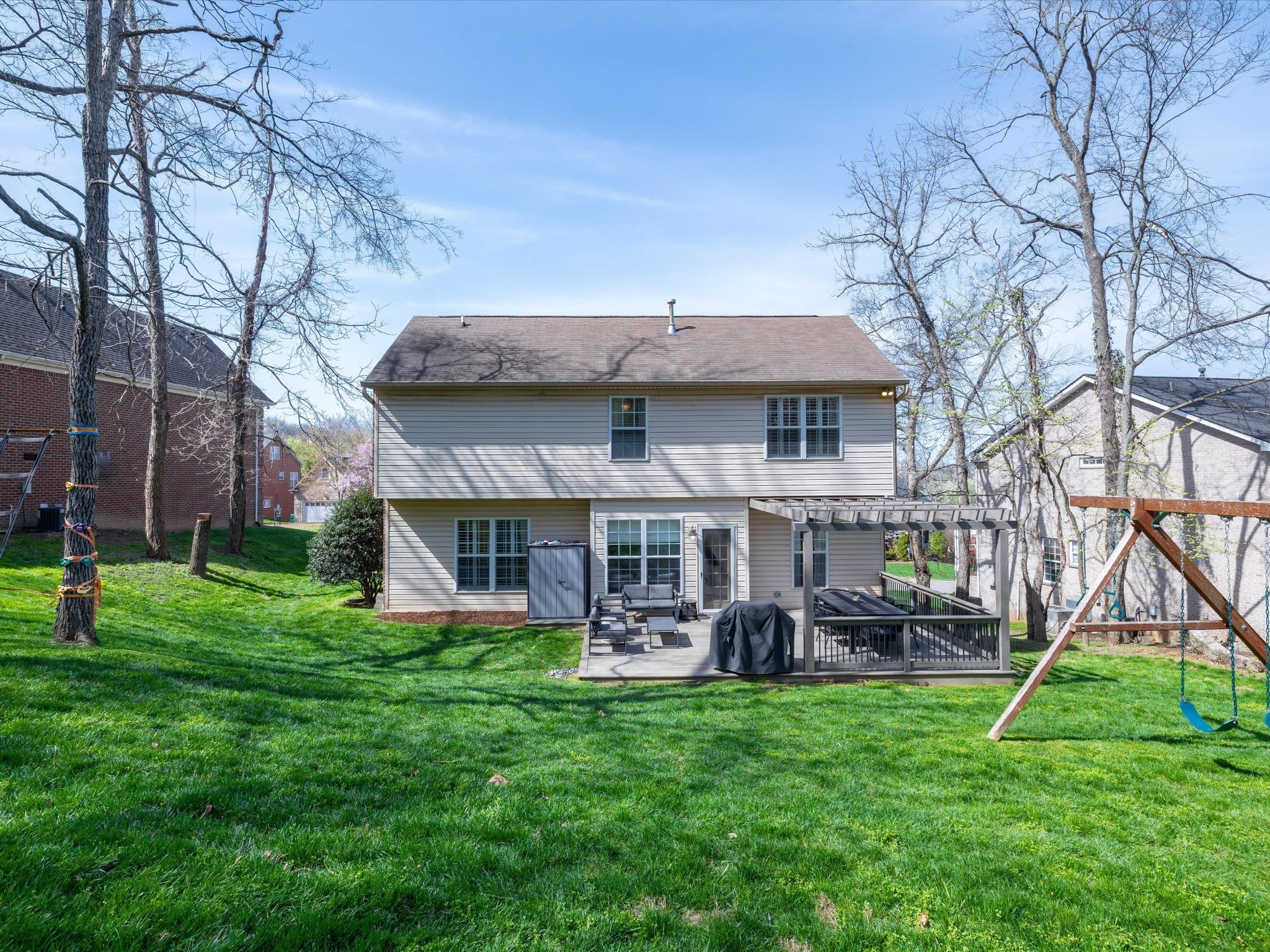 Welcome to your Brentwood dream home in Courtside at Southern Woods! This charming residence blends classic style with modern accents in all the right places. The open living room showcases a soaring ceiling and a board-and-batten fireplace surround complemented by custom built-in cabinetry. The main level also features a formal dining room, a kitchen with breakfast nook, and a spacious primary bedroom. Upstairs, you'll find a versatile loft with endless possibilities, along with two bedrooms connected by a Jack-and-Jill bath. The oversized bonus room is a must-see, featuring a shiplap ceiling, walk-in closet, and plenty of space for relaxing or gathering. Step outside to the spacious back deck with pergola overlooking the backyard—an ideal setting for outdoor entertaining or peaceful evenings at home. For swimming, playing and tennis be sure to check out your community amenities at 1610 South Timber Drive!