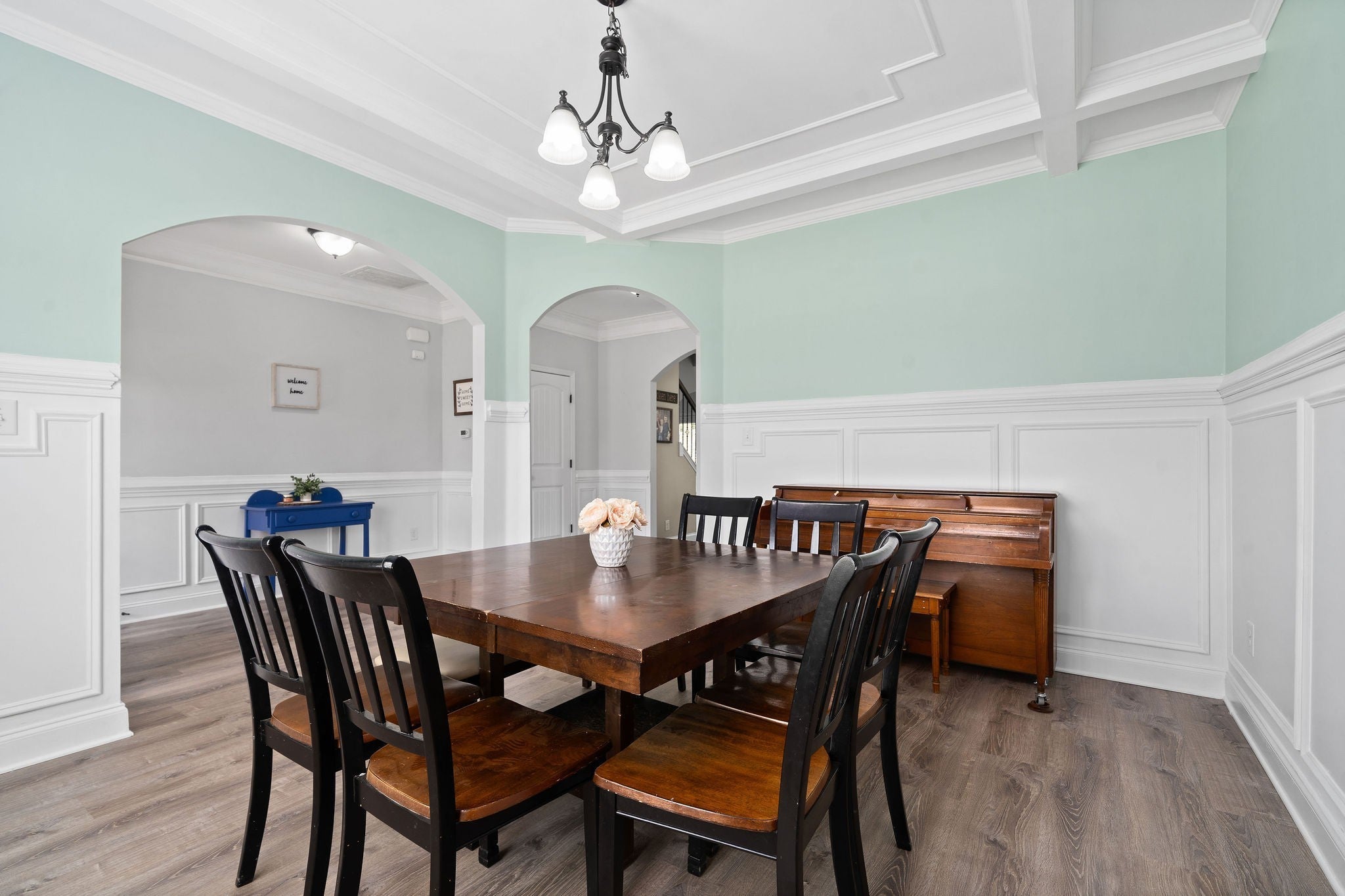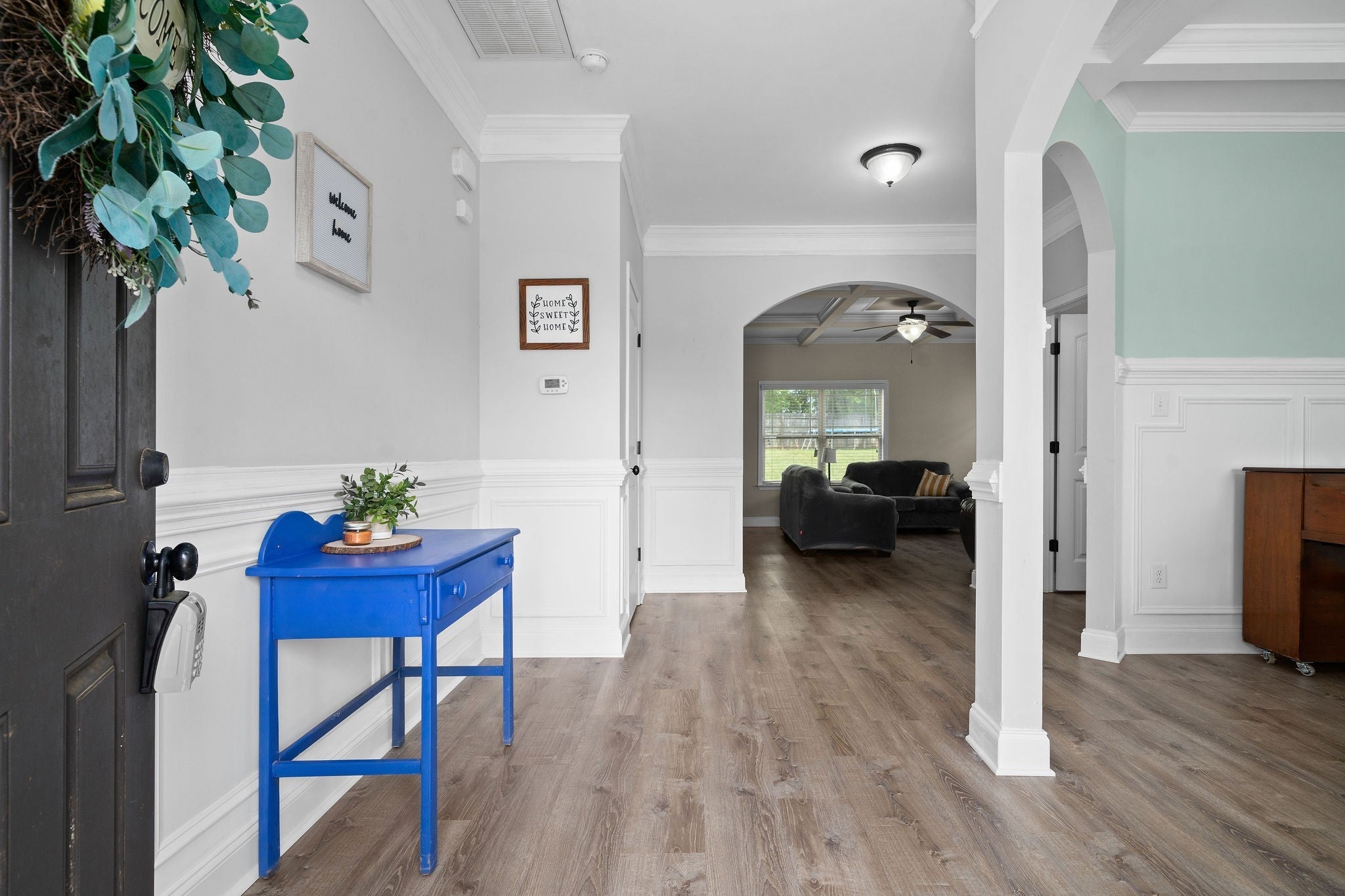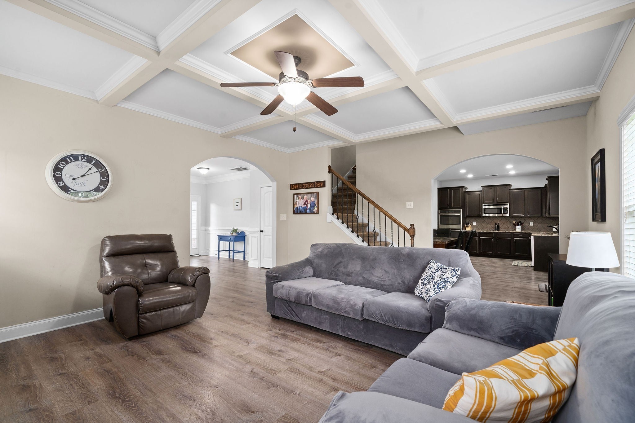 Exquisite Tupelo floor plan is gorgeous, offering a Gourmet Kitchen with double convection ovens, granite, tile backsplash, pantry and stainless-steel appliances. Formal dining room,,,,,. Beautiful, coffered ceilings in the Living Rm with wood burning fireplace, and wood laminate flooring throughout the first floor. The primary bedroom suite is spacious with vaulted ceilings, double sinks, tile shower, garden tub, and walk in closet. Laundry rm is located upstairs. This home is centrally located in Clarksville, near shopping and restaurants, with a quick commute to Ft. Campbell, and Nashville just off of I-24.