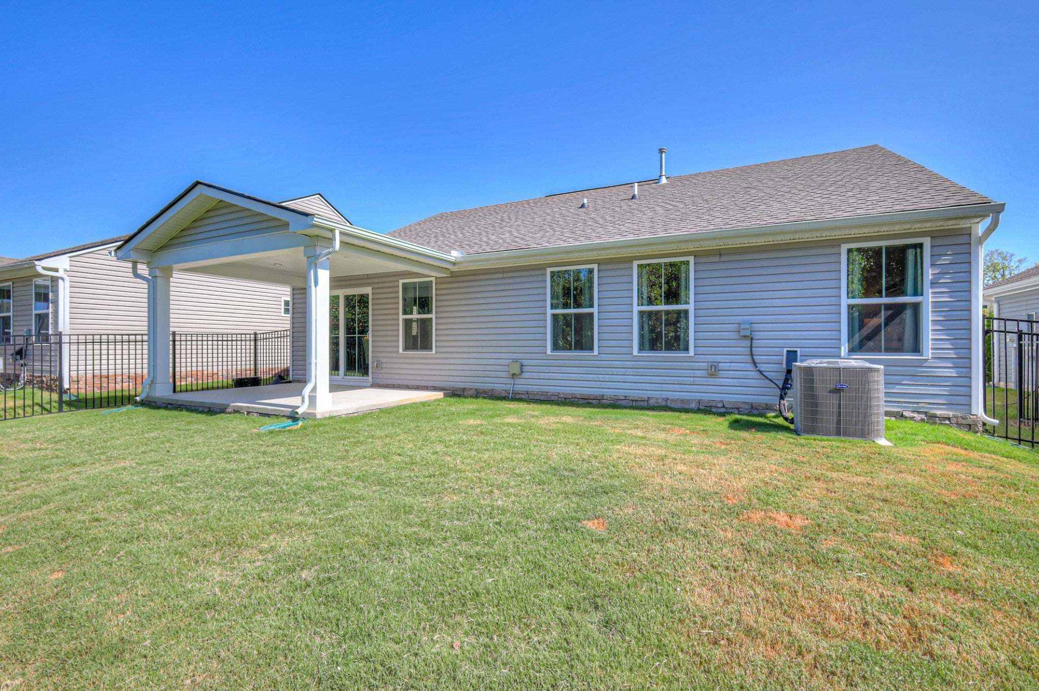 Welcome to easy one-level living on a beautiful tree-lined homesite! This thoughtfully designed home features 3 spacious bedrooms, 2 full bathrooms, and a 2-car garage. Enjoy the outdoors year-round with a covered patio and fully fenced backyard — with lawn maintenance included through the HOA for low-maintenance living. Inside, you'll find a bright and airy open-concept floor plan with luxury vinyl tile (LVT) throughout—no carpet anywhere! The chef’s kitchen is a dream, complete with a large island, quartz countertops, stainless steel appliances. The owner’s suite offers a peaceful retreat, featuring a tiled walk-in shower with bench, double vanities, and a generously sized walk-in closet. Craftsman-style trim and modern finishes complete this stylish, move-in ready home