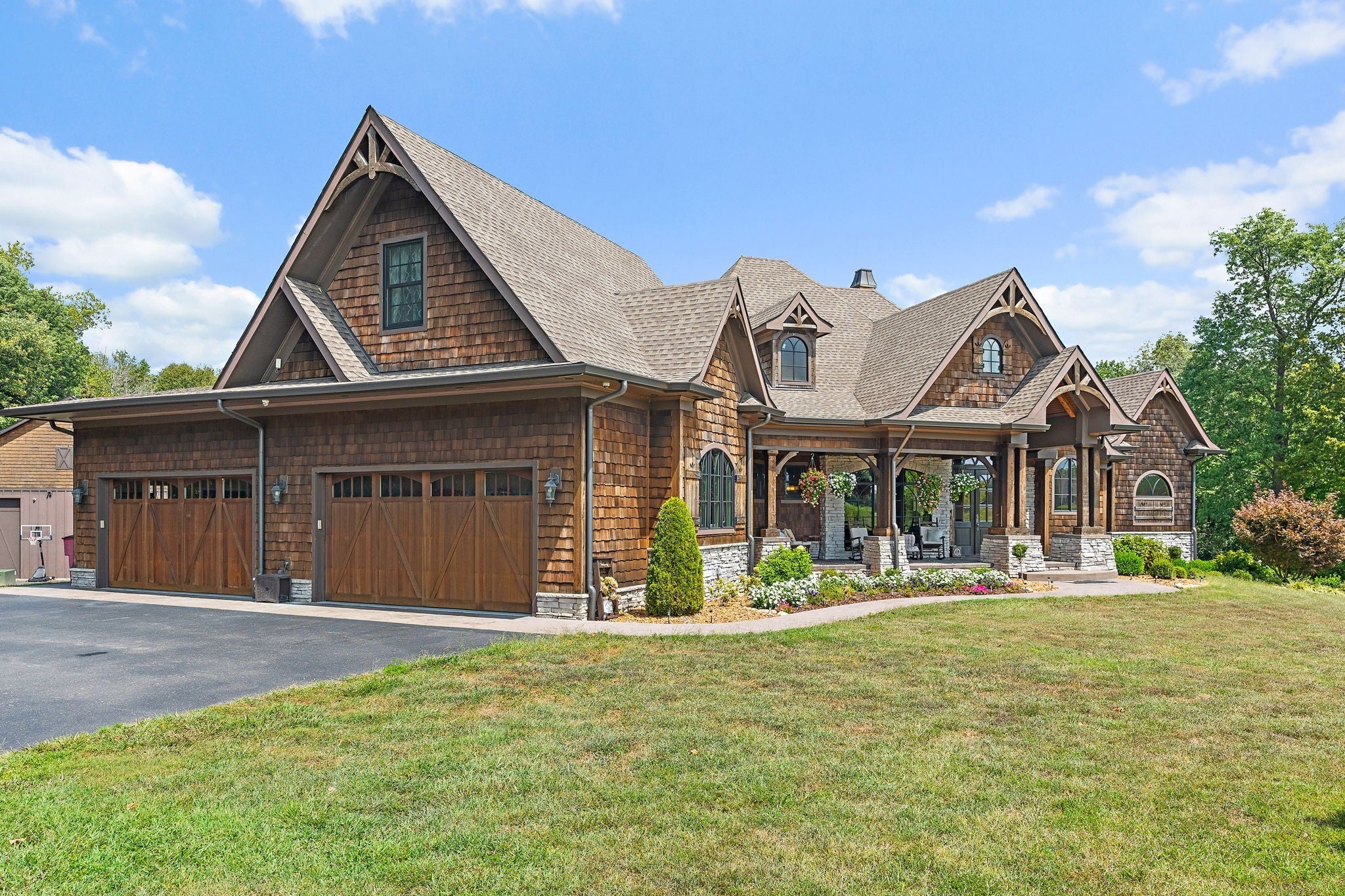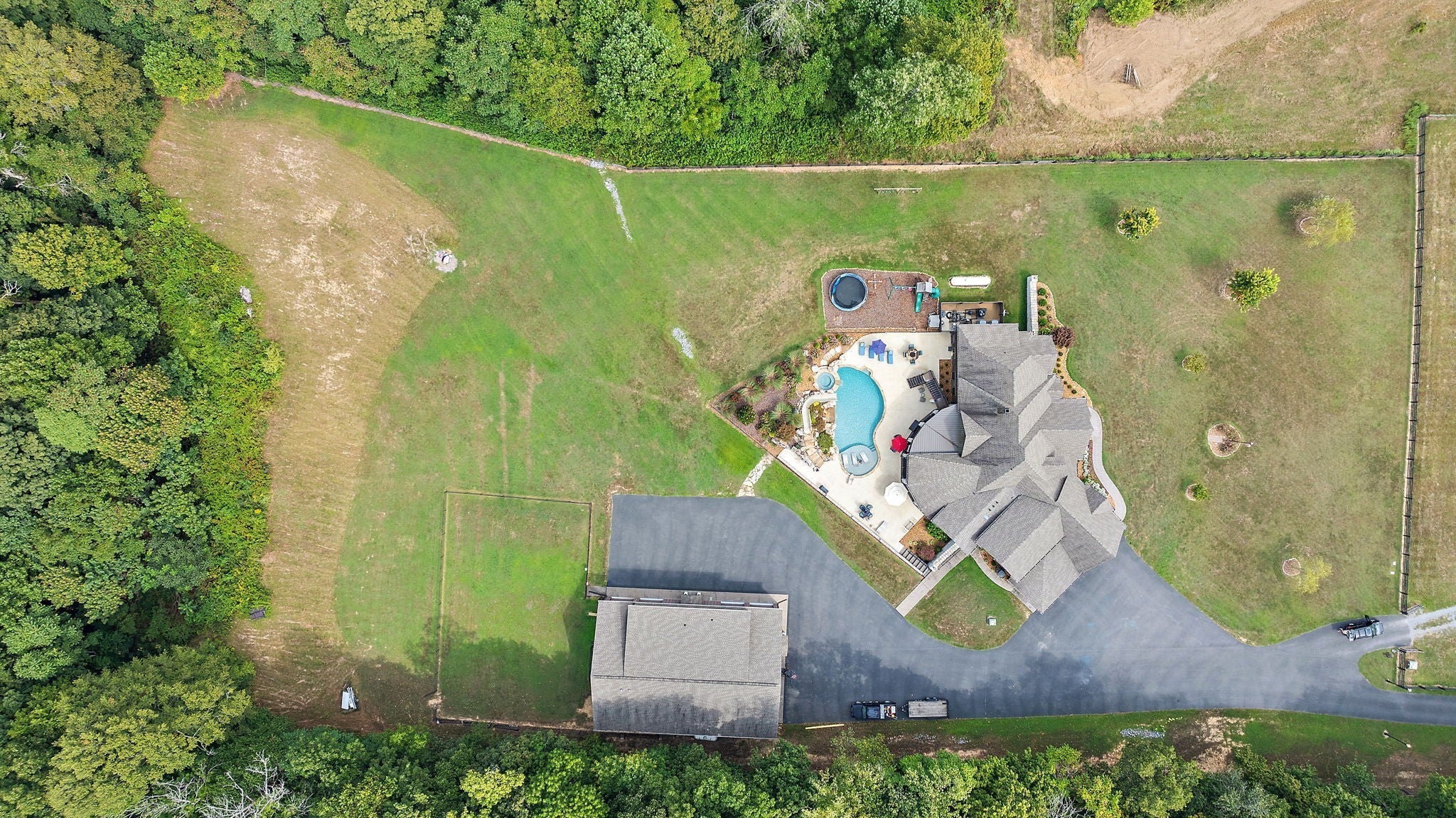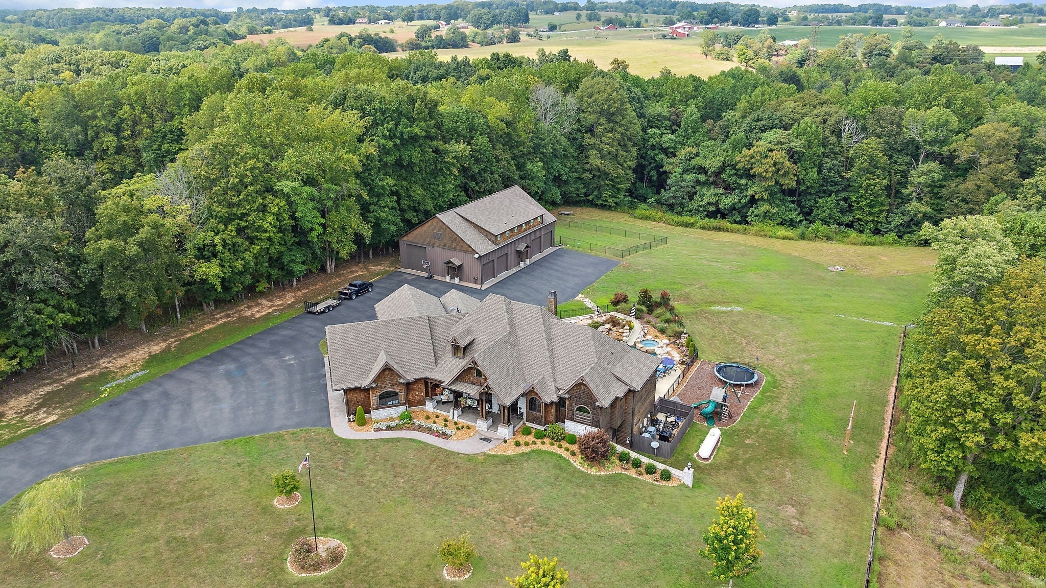 Absolutely stunning, custom-designed estate with top-of-the-line finishes throughout. This home is truly a must-see to fully appreciate every exquisite detail. From the moment you step through the front door, you’re greeted by an abundance of natural light, soaring ceilings, and a thoughtfully designed layout featuring a primary suite worthy of Architectural Digest. Enjoy the covered back deck overlooking a resort-style pool complete with a hot tub and waterslide, perfect for entertaining or unwinding in your private oasis. The chef’s kitchen boasts luxury appliances, a massive walk-in pantry, and a design that blends elegance with functionality. The main-level primary suite offers a spa-like retreat, featuring a soaking tub, steam shower, heated floors, and dual oversized walk-in closets. An open staircase leads to the lower level, where you’ll find two additional bedroom suites, a spacious bonus/rec room, and a private movie theater for the ultimate entertainment experience. The property also includes a detached four-car garage with an RV bay, a dedicated “car wash” garage, and a fully equipped apartment on the second level — perfect for guests or income potential. All of this sits on 10 pristine acres with a tranquil pond, offering unmatched privacy and beauty. This exceptional home truly has too many features to list — a rare gem that combines luxury, comfort, and functionality.