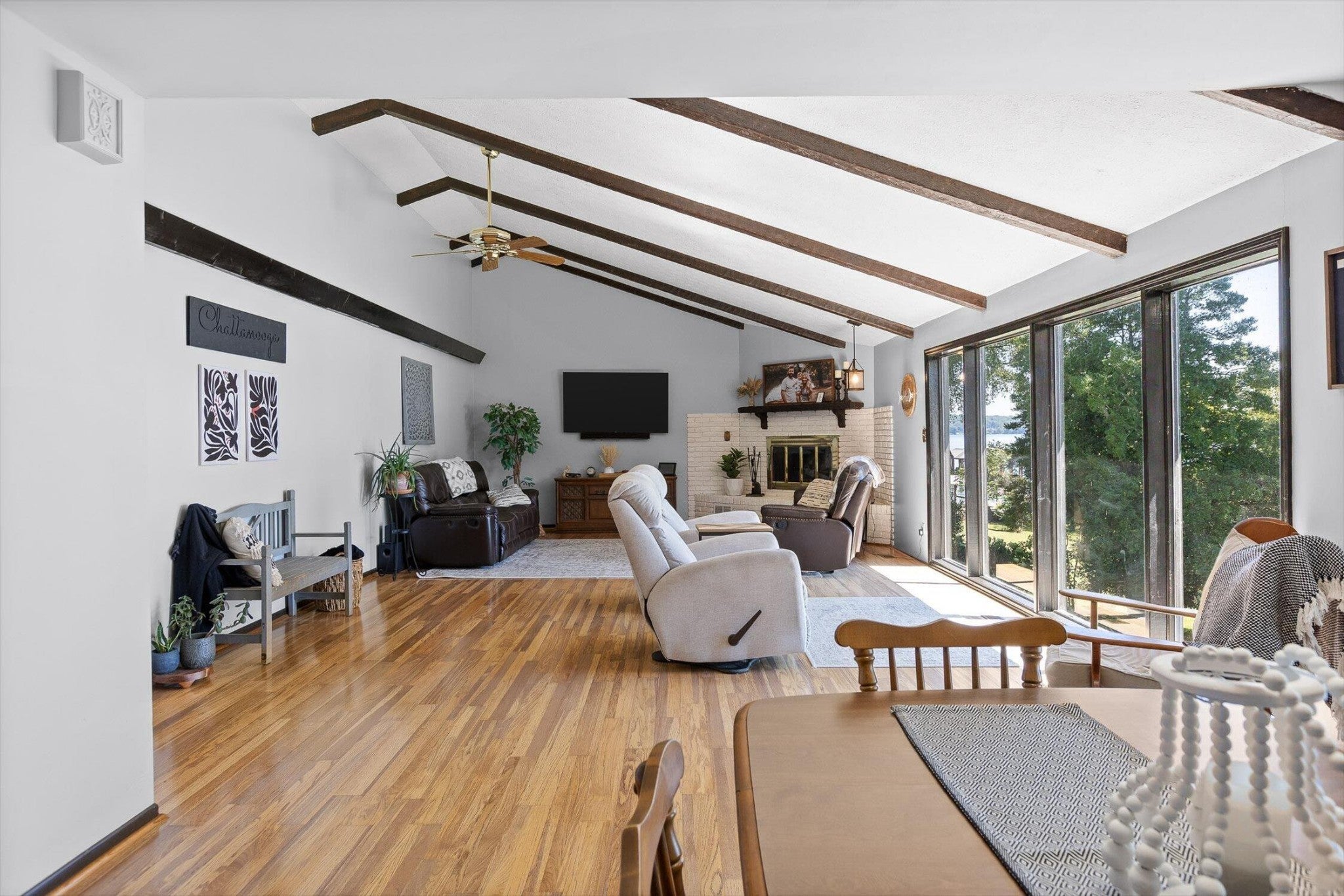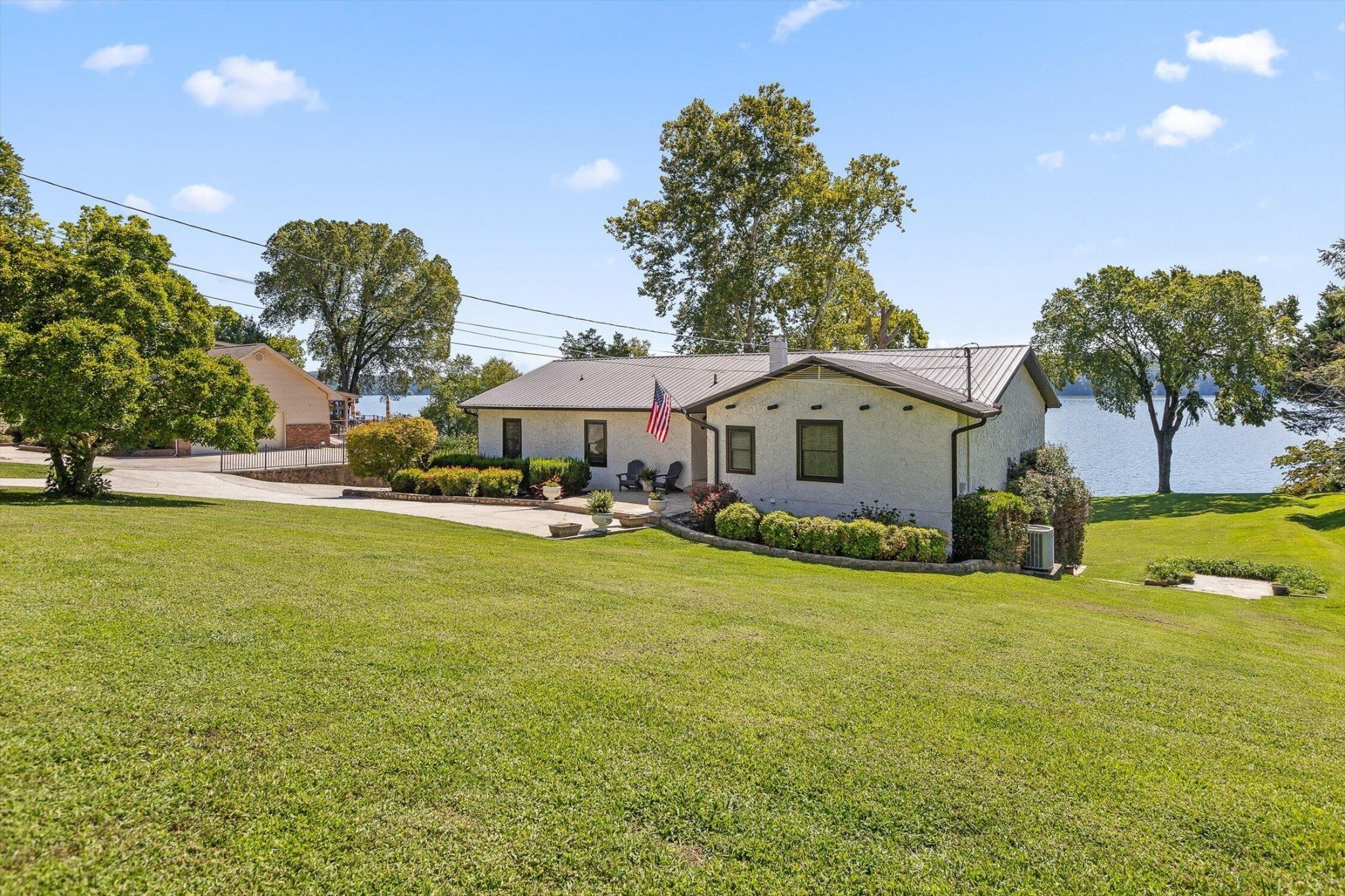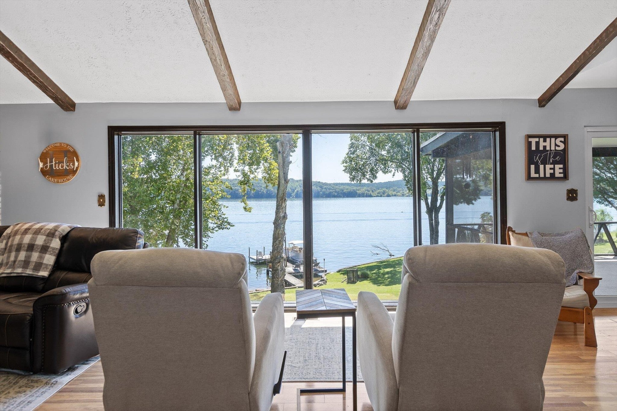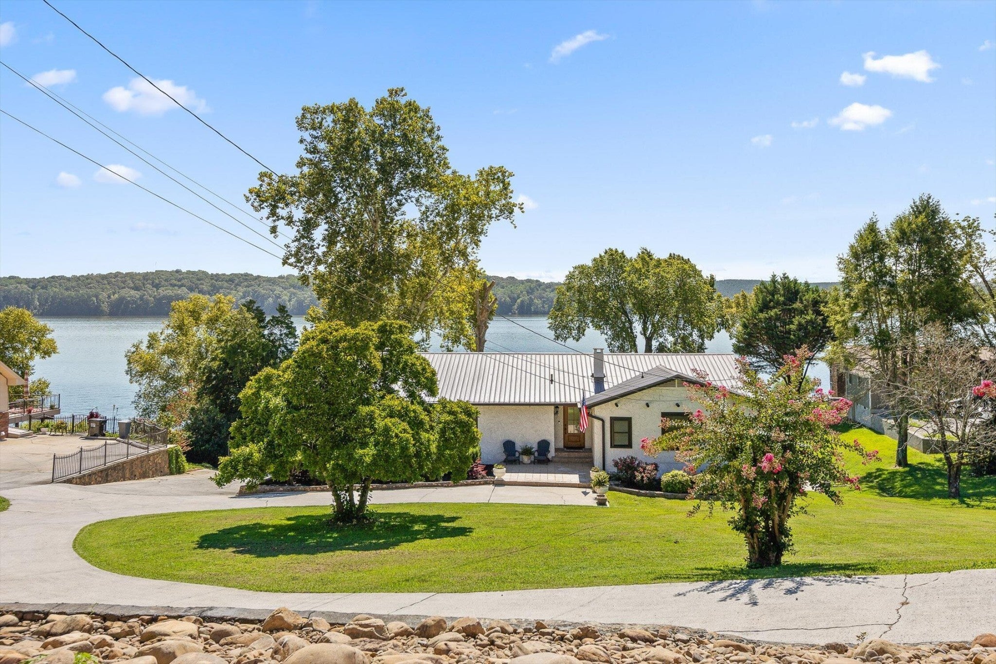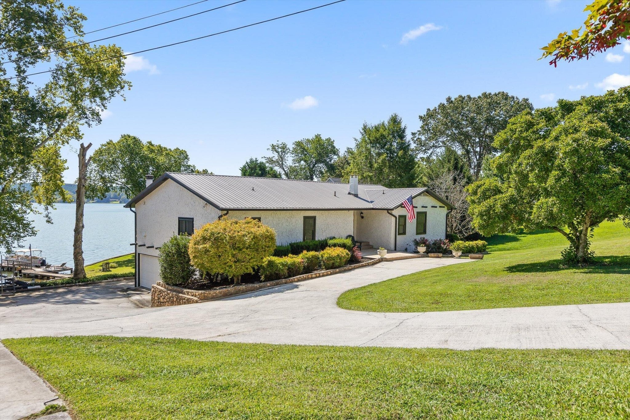 Main channel Chickamauga lakefront paradise on the TN River in this stunning four-bedroom, three-bathroom, 3 car garage home offering 2,960 square feet of open concept living. This exceptional property sits on a generous double lot with direct waterfront access, making it perfect for those who dream of sunrises every morning. View across the River/Lake is TVA land, so it will likely never change. Exterior of home was redone in '21 including: 60yr metal roof, all vinyl windows & 3 sliders, paint, and gutters w/guards, front door. The spacious interior flows seamlessly throughout, with the primary bedroom serving as a true retreat. New carpet in two additional bedrooms providing flexibility for family, guests, or that home office you've been planning. Easy to clean with the Central Vac system. The finished basement adds valuable living space and storage, because let's face it - who doesn't need a place to hide seasonal decorations and exercise equipment? Tons of storage in the unfinished basement area, too. Step outside to experience the true magic of lakefront living on your main level rear screened porch, or rear covered porch. The expansive outdoor space includes your own private dock, perfect for morning coffee with the fish or evening gatherings under the stars. Full yard irrigation system with lake pump. Whether you're launching a kayak, swimming on the beach with the kids or dogs, hosting a barbecue, or simply enjoying the peaceful water sounds, this outdoor oasis delivers year-round enjoyment. The Soddy-Daisy neighborhood offers the perfect blend of tranquil lakeside living and a community dock & boat ramp. You'll find yourself just minutes from more recreational opportunities, and 30 minutes to Chattanooga, Dunlap, or Dayton. This rare combination of main channel waterfront, spacious interiors, and prime location creates an opportunity that doesn't come often. The dock is ready, with breathtaking views, and your lakefront lifestyle awaits.