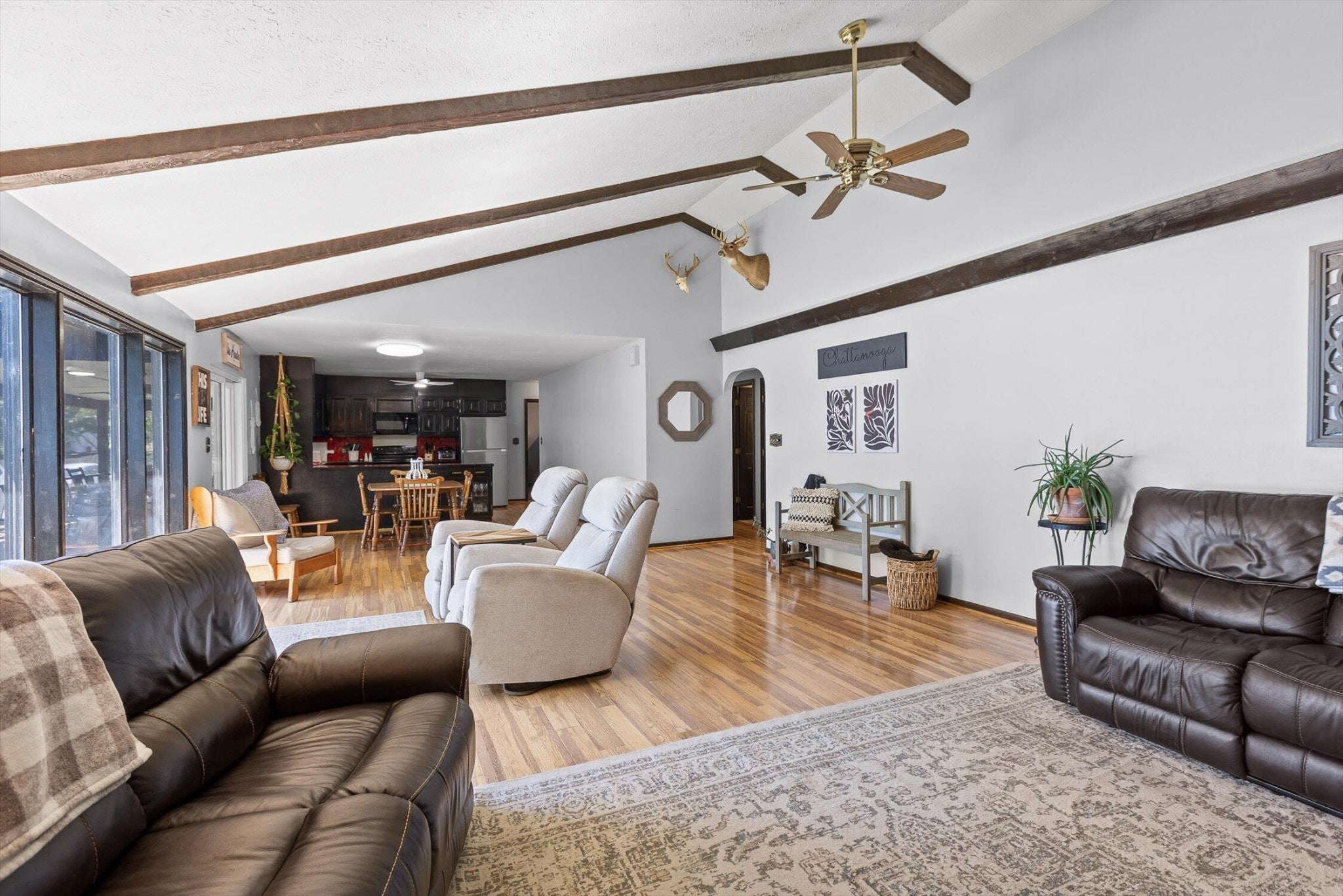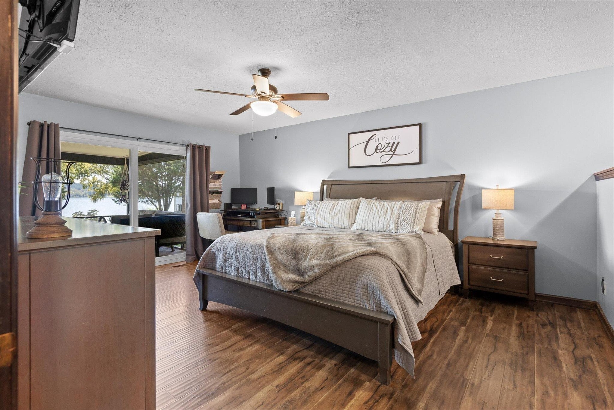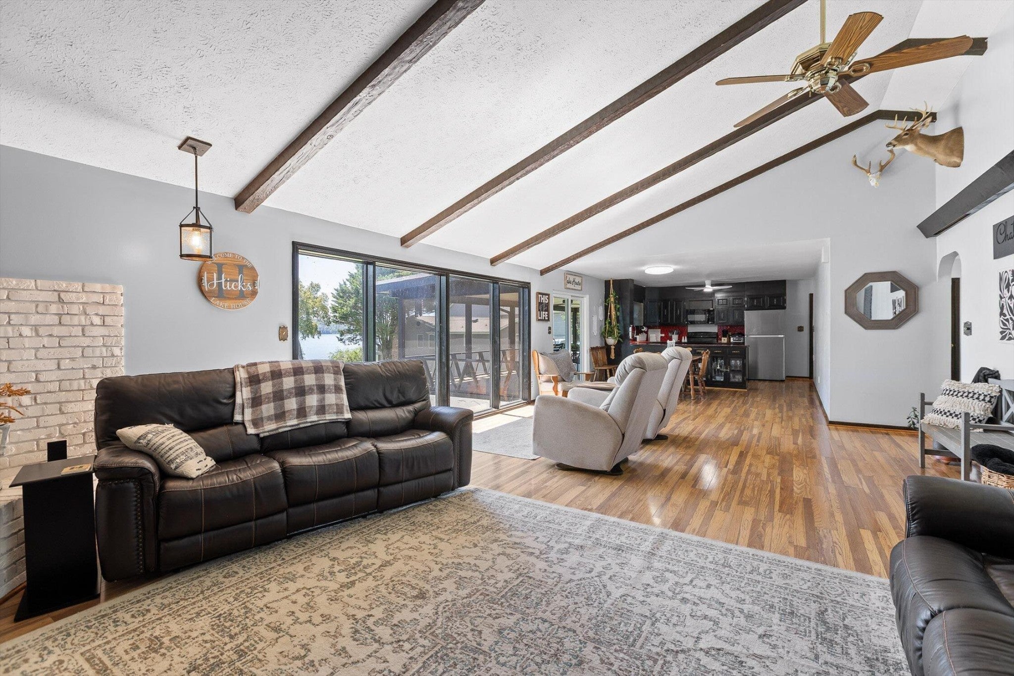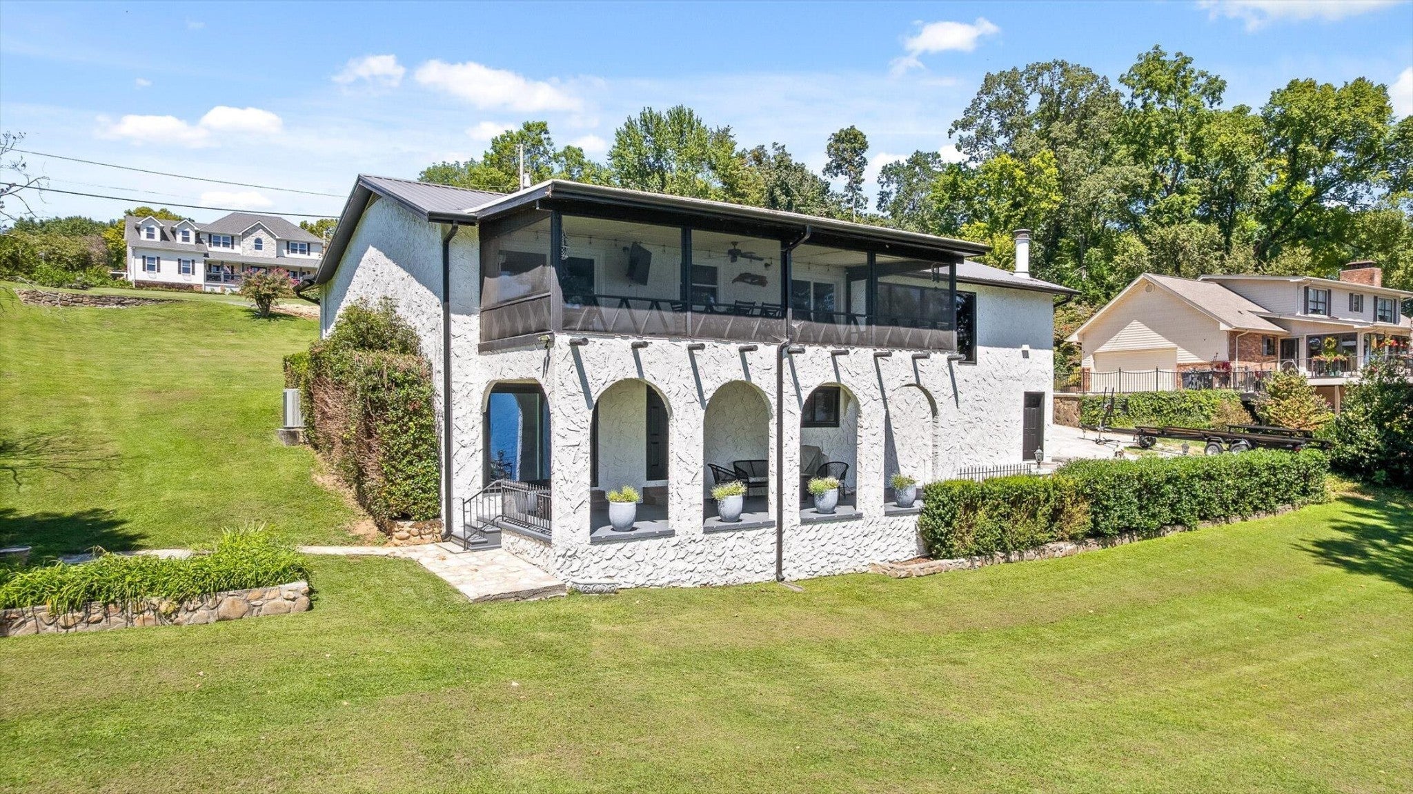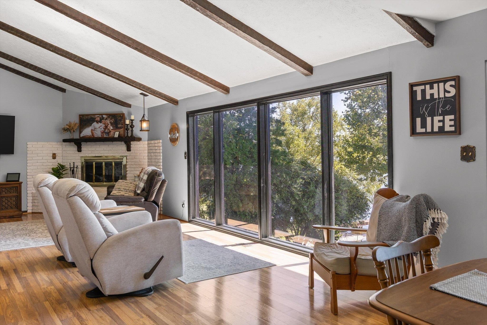 Main channel Chickamauga lakefront paradise on the TN River in this stunning four-bedroom, three-bathroom, 3 car garage home offering 2,960 square feet of open concept living. This exceptional property sits on a generous double lot with direct waterfront access, making it perfect for those who dream of sunrises every morning. View across the River/Lake is TVA land, so it will likely never change. Exterior of home was redone in '21 including: 60yr metal roof, all vinyl windows & 3 sliders, paint, and gutters w/guards, front door. The spacious interior flows seamlessly throughout, with the primary bedroom serving as a true retreat. New carpet in two additional bedrooms providing flexibility for family, guests, or that home office you've been planning. Easy to clean with the Central Vac system. The finished basement adds valuable living space and storage, because let's face it - who doesn't need a place to hide seasonal decorations and exercise equipment? Tons of storage in the unfinished basement area, too. Step outside to experience the true magic of lakefront living on your main level rear screened porch, or rear covered porch. The expansive outdoor space includes your own private dock, perfect for morning coffee with the fish or evening gatherings under the stars. Full yard irrigation system with lake pump. Whether you're launching a kayak, swimming on the beach with the kids or dogs, hosting a barbecue, or simply enjoying the peaceful water sounds, this outdoor oasis delivers year-round enjoyment. The Soddy-Daisy neighborhood offers the perfect blend of tranquil lakeside living and a community dock & boat ramp. You'll find yourself just minutes from more recreational opportunities, and 30 minutes to Chattanooga, Dunlap, or Dayton. This rare combination of main channel waterfront, spacious interiors, and prime location creates an opportunity that doesn't come often. The dock is ready, with breathtaking views, and your lakefront lifestyle awaits.