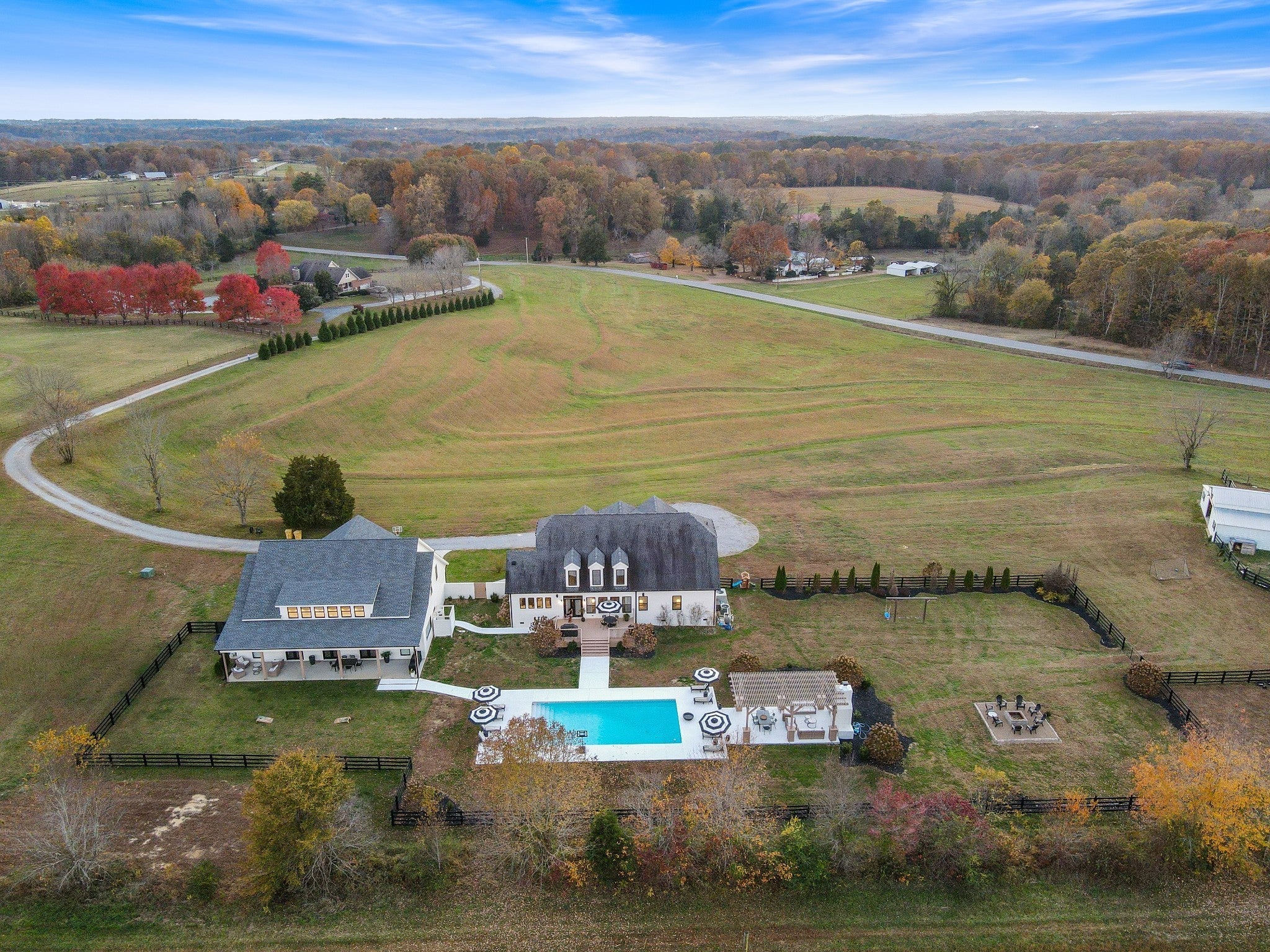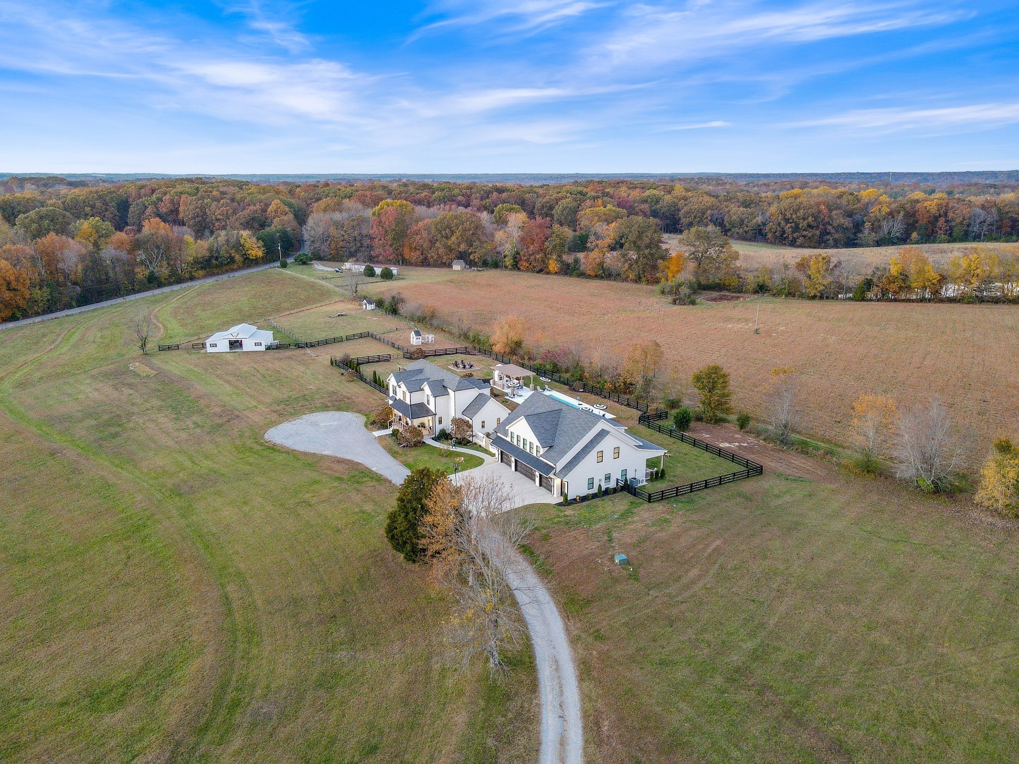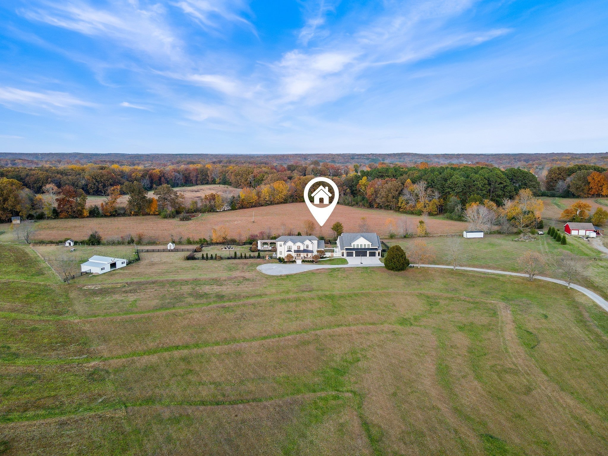 Discover a sophisticated retreat in the heart of Williamson County. This custom estate rests on over 8 acres of rolling landscape. Positioned perfectly for privacy and convenience, the property sits moments from I-40 and I-840 corridors, less than 10 mins from the local Williamson County Schools. Guests are greeted by a grand entrance featuring double doors and a soaring foyer with 20 ft ceilings. Expansive Anderson windows invite an abundance of natural light. The main living room centers around a marble-tile fireplace and transitions into a kitchen built for culinary enthusiasts. This gourmet space is equipped with oversized island, prep sink, 6 burner gas range with griddle, double ovens, and heat lamps. Modern conveniences include pot filler, built-in refrigerator, dual-tap kegerator, and walk-in pantry featuring ELFA organization. A dedicated coffee bar with beverage fridge and custom cabinetry ensure every detail is accounted for. The main floor also hosts a functional mudroom, home office with wall-to-wall shelving, and full bathroom. In the primary suite, a private fireplace and custom built-ins create a peaceful sanctuary, complemented by a spa-like bathroom with double vanities, makeup station, and massive walk-in shower. Upstairs, a versatile loft provides built-in desk space alongside 3 additional bedrooms. The designer bathroom stands out with triple-faucet Kohler cast-iron sink and automated lighting. A separate entertainment building offers a 4 car garage and upper-level recreation room with theater surround sound. The lower level of this structure features SkyTrak golf simulator and dry bar opening to a covered patio. County variance allows breezeway connection to main house and allowing bathrooms on existing septic. Outside boasts a 20x40 in-ground pool, pergola, outdoor fireplace, barn with RV hookups, and fenced pasture. Evening sunset views are stunning from the west-facing front porch. Don’t miss your chance at this extraordinary TN sanctuary!
