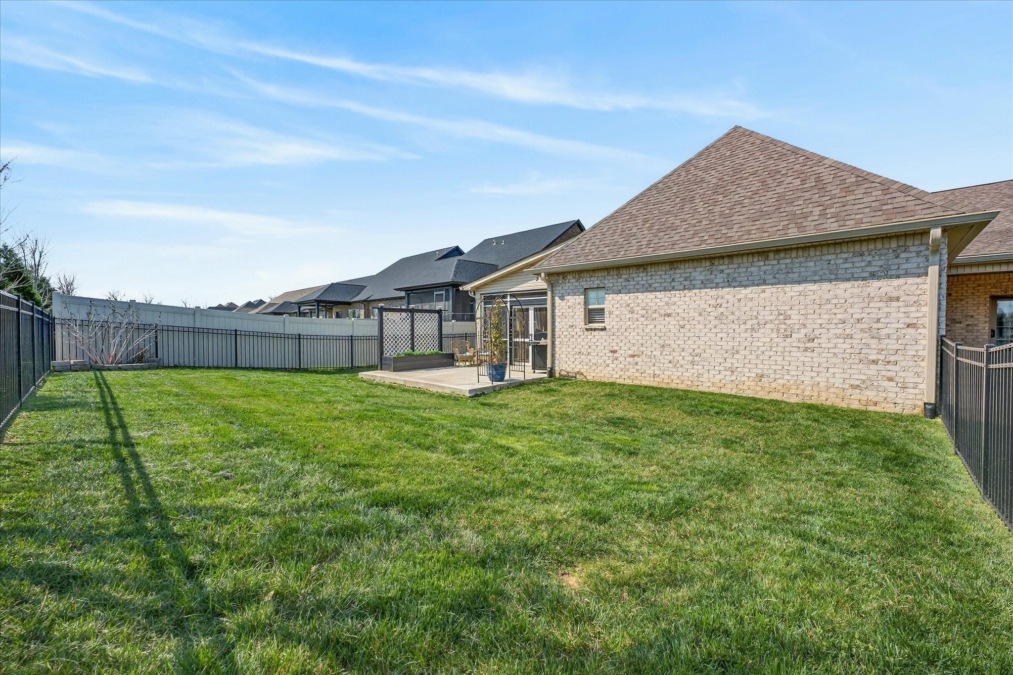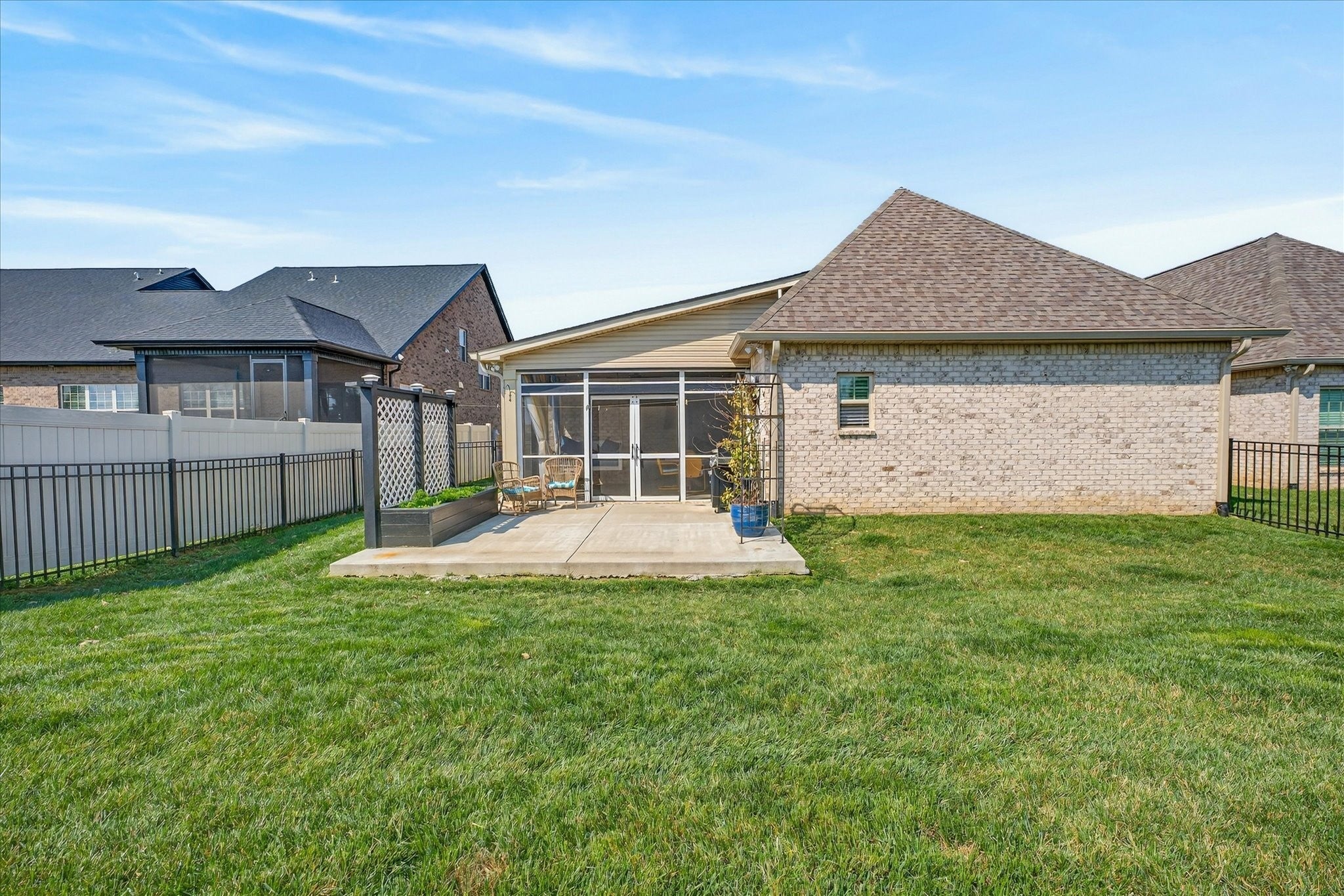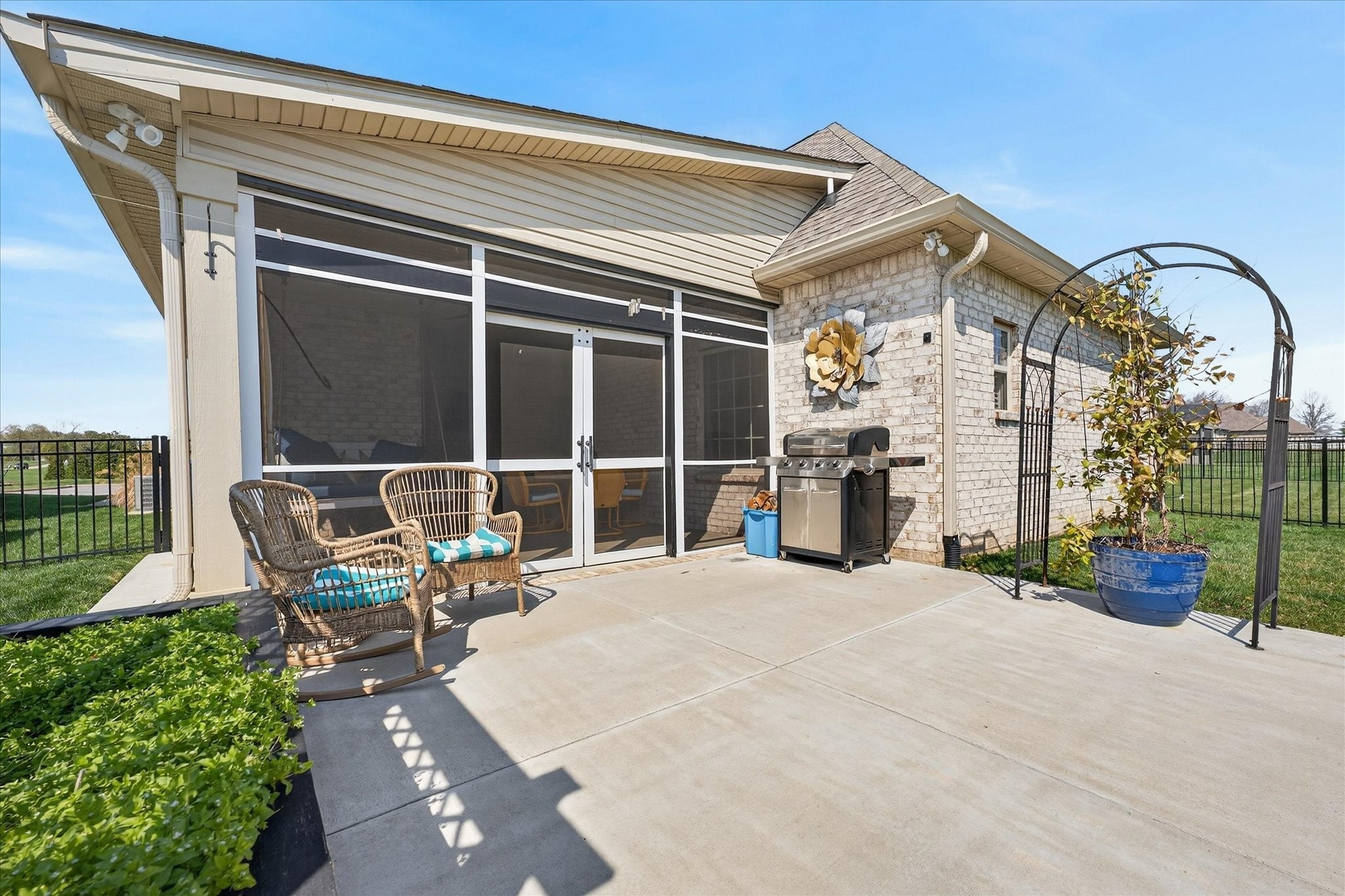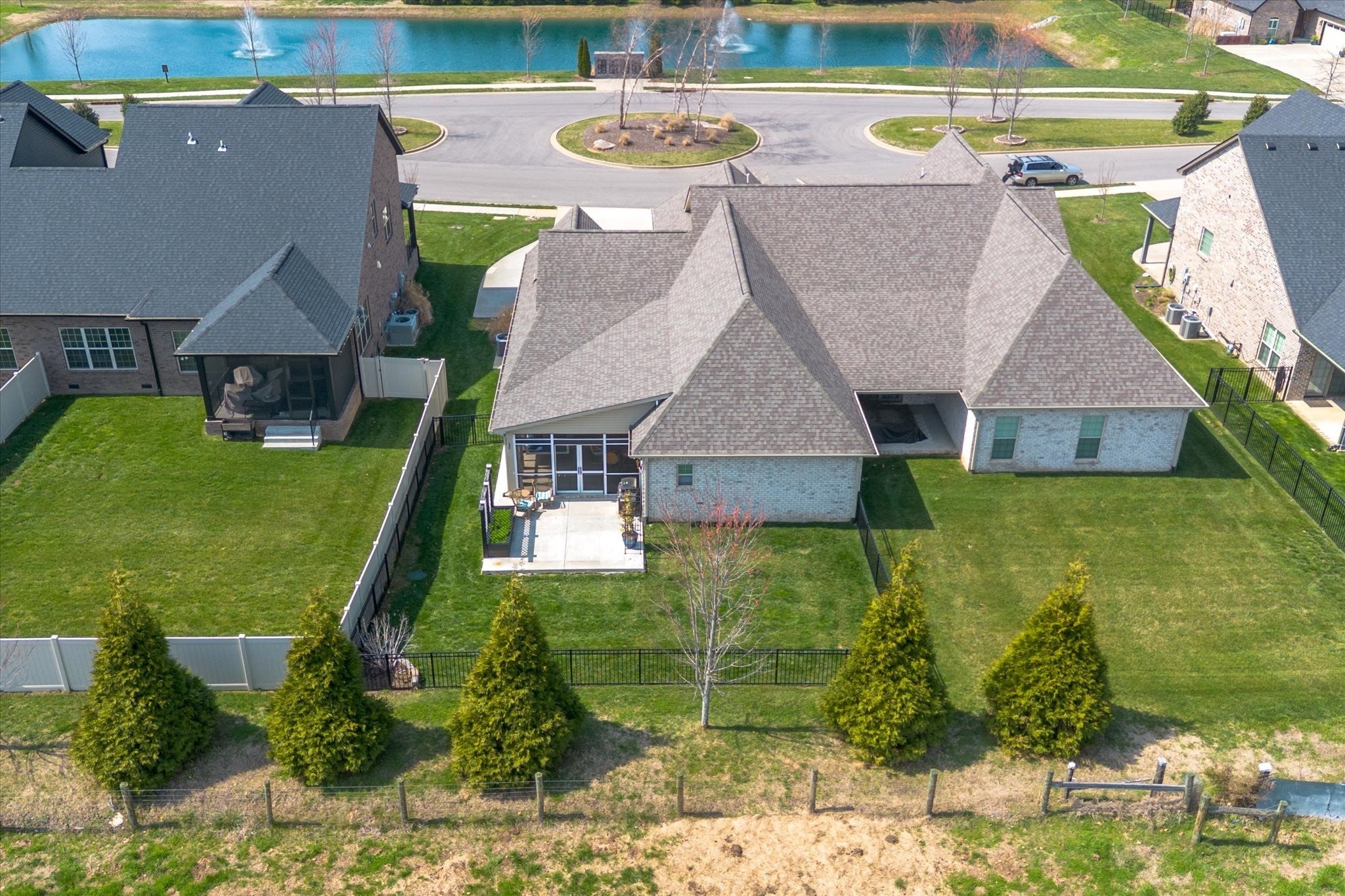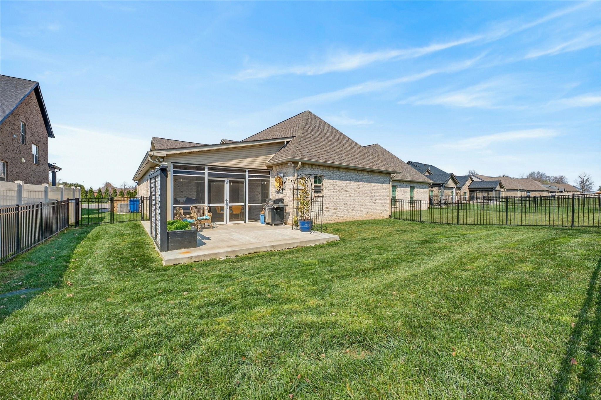 Pure luxury one-level living in one of Sango’s finest gated communities! Nestled in the heart of Sango, this stunning all-brick home with stone accents offers the perfect blend of elegance, comfort, and low-maintenance living. Enjoy peaceful mornings and relaxing evenings strolling along scenic ponds and fountains, or unwind on your screened-in porch or open patio overlooking farmland views. Step inside to an inviting foyer that opens to a thoughtfully designed open-concept floor plan, complete with extensive moldings, a cozy fireplace with custom built-ins, and no carpet throughout. Ideal for entertaining, the spacious living area flows seamlessly into a true cook’s dream kitchen featuring quartz countertops, bar seating, a separate island, stainless steel appliances, a beautiful tile backsplash, and a generous walk-in pantry. The split-bedroom layout provides privacy and flexibility, with the luxurious primary suite tucked away at the rear of the home. Highlights include a coffered ceiling and a spa-like ensuite boasting a double vanity, oversized tiled shower, soaking tub, private toilet room, and a custom walk-in closet with built-ins. Two additional bedrooms and a full bath are situated in their own wing—perfect for guests or a home office. Outside, the fully fenced backyard with beautiful black aluminum fencing offers both security and unobstructed views of the surrounding farmland—creating a serene retreat right at home. This exceptional property truly has it all—style, comfort, and an unbeatable location. Don’t miss your opportunity to make it yours! (Chandelier in Primary Bedroom does NOT convey with home. Seller will give Buyer a $300 allowance for new fixture)