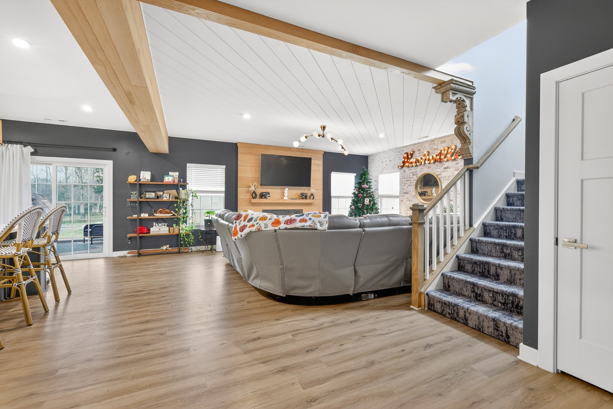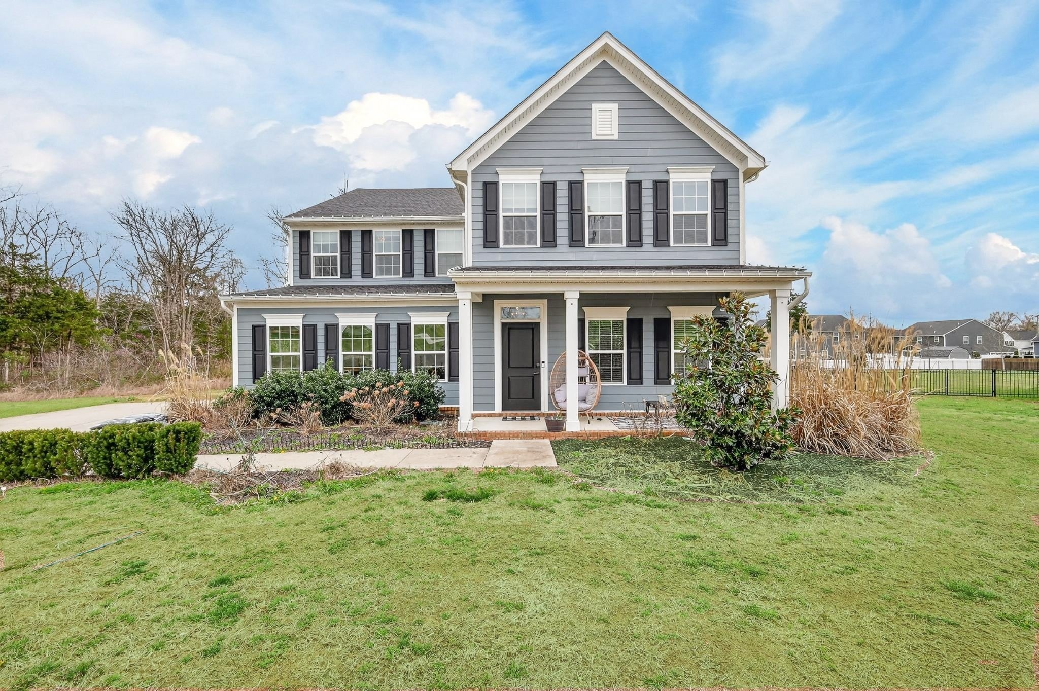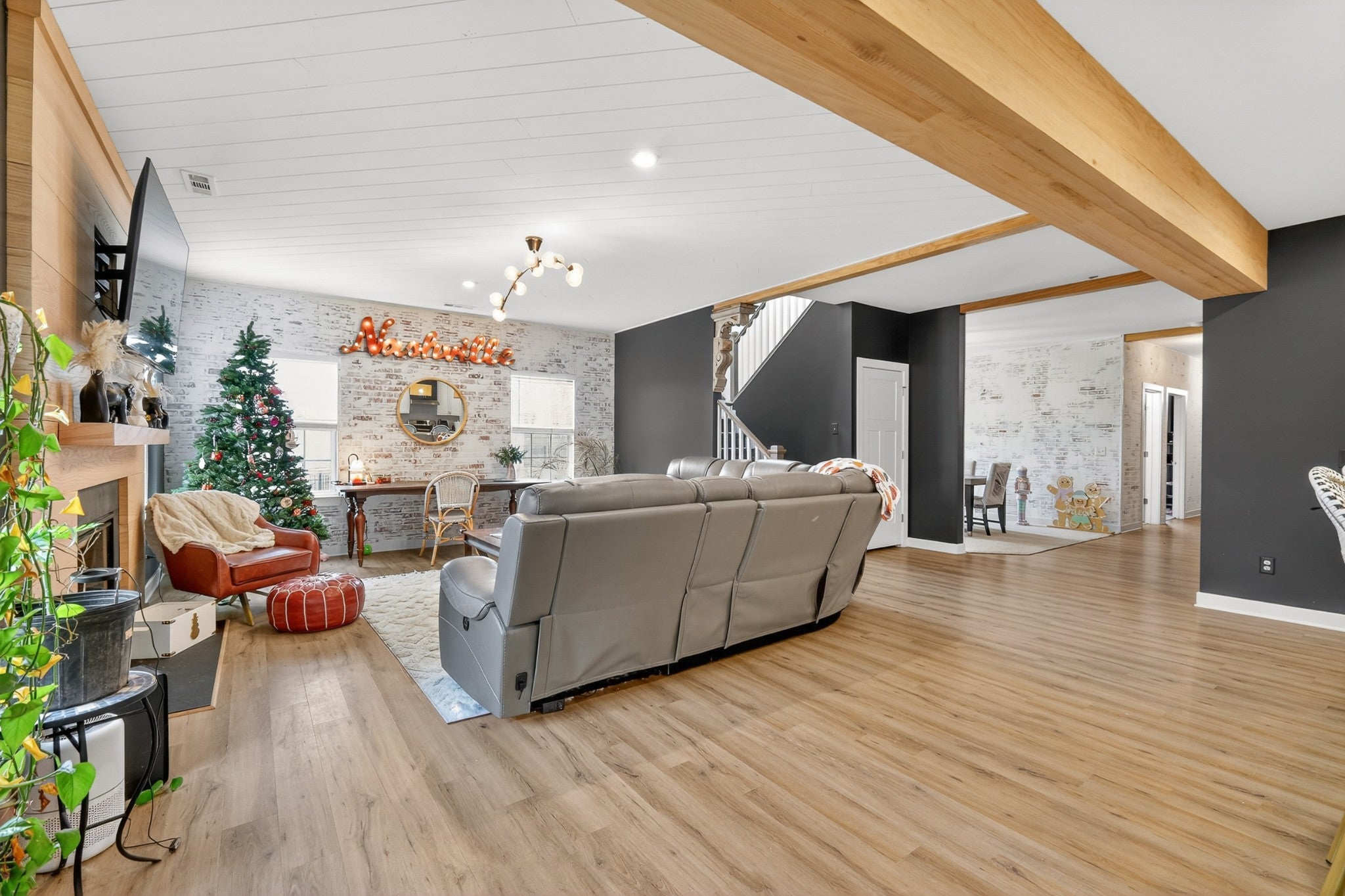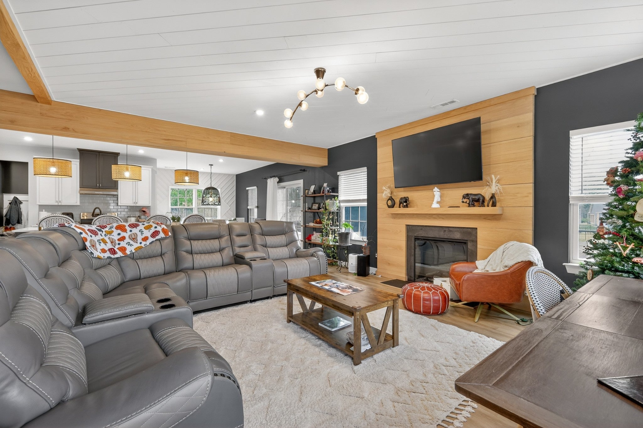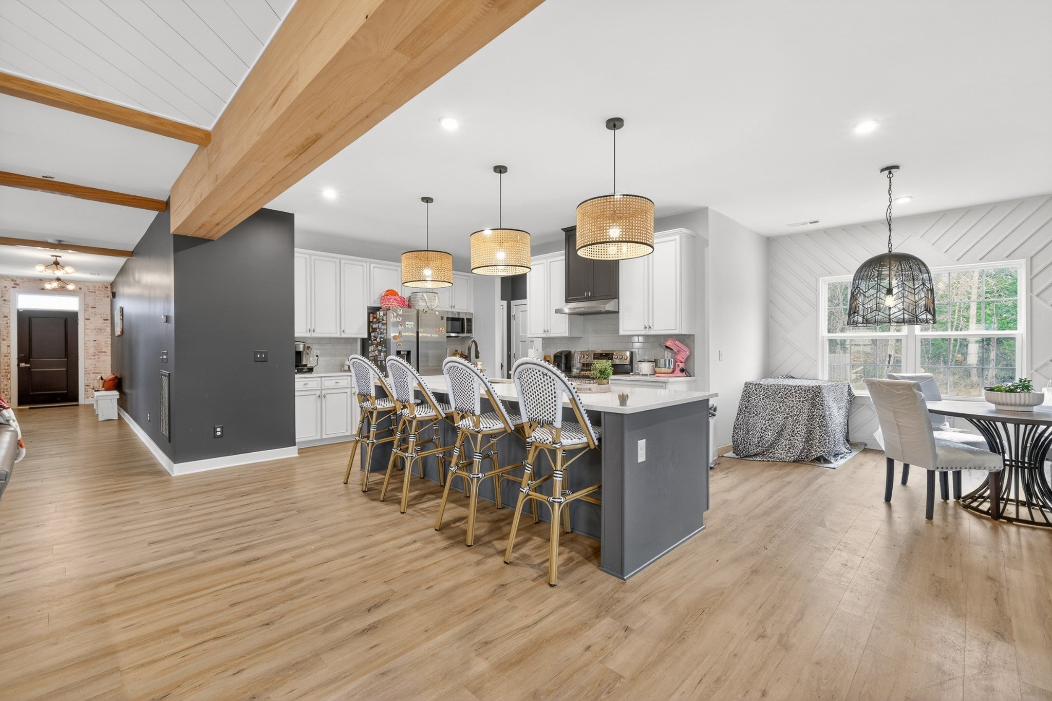 Welcome to an exceptional executive residence, perfectly positioned at the end of a private cul de sac on a nearly one acre homesite. This 3,300 square foot home offers a refined blend of sophistication, comfort, and intentional design. From the moment you enter, you are greeted with elevated finishes and curated details, including statement lighting, custom accent walls, rich wood beams, and a stunning fireplace that anchors the main living space. Every element has been thoughtfully designed to create a warm yet upscale atmosphere. The gourmet kitchen serves as the centerpiece of the home, featuring an expansive island, quartz countertops, and a seamless open concept layout ideal for both intimate gatherings and large scale entertaining. Natural light pours through the home, highlighting the professionally designed interiors and creating an effortless flow throughout. Retreat to the outdoor living spaces where you can enjoy quiet mornings on the front porch or unwind on the screened in back porch offering a true sense of privacy and escape. Combining timeless design, premium upgrades, and a highly desirable setting, this executive home delivers a rare opportunity for elevated living.