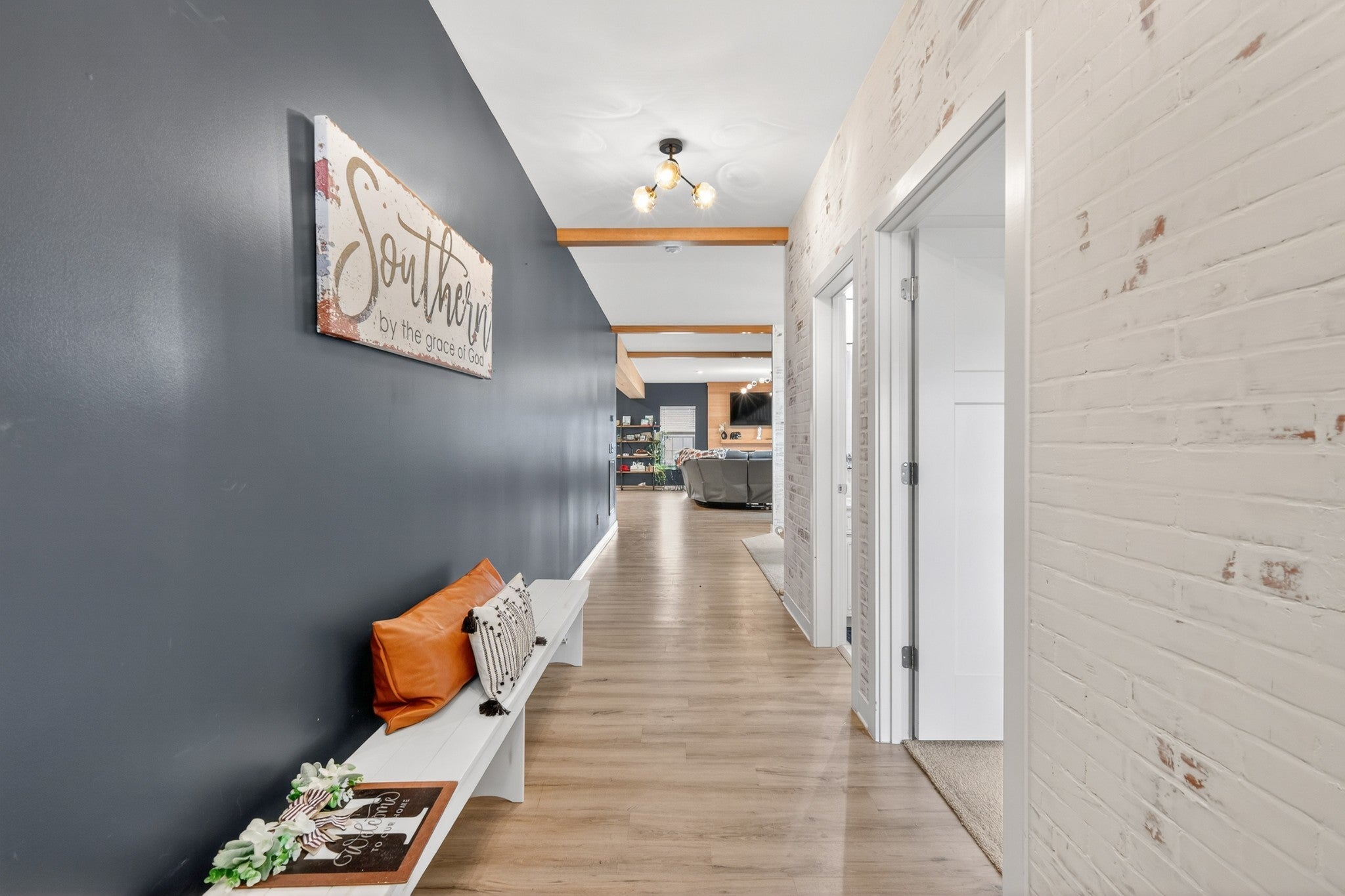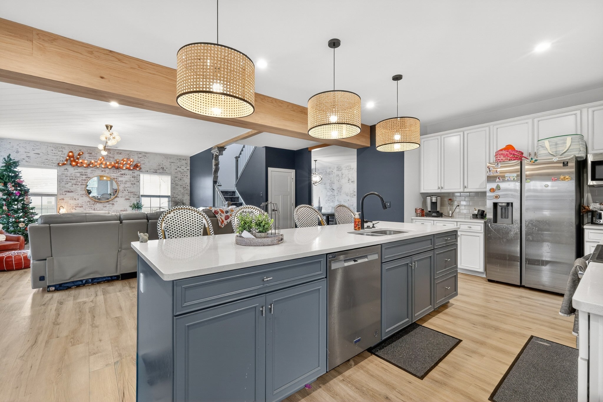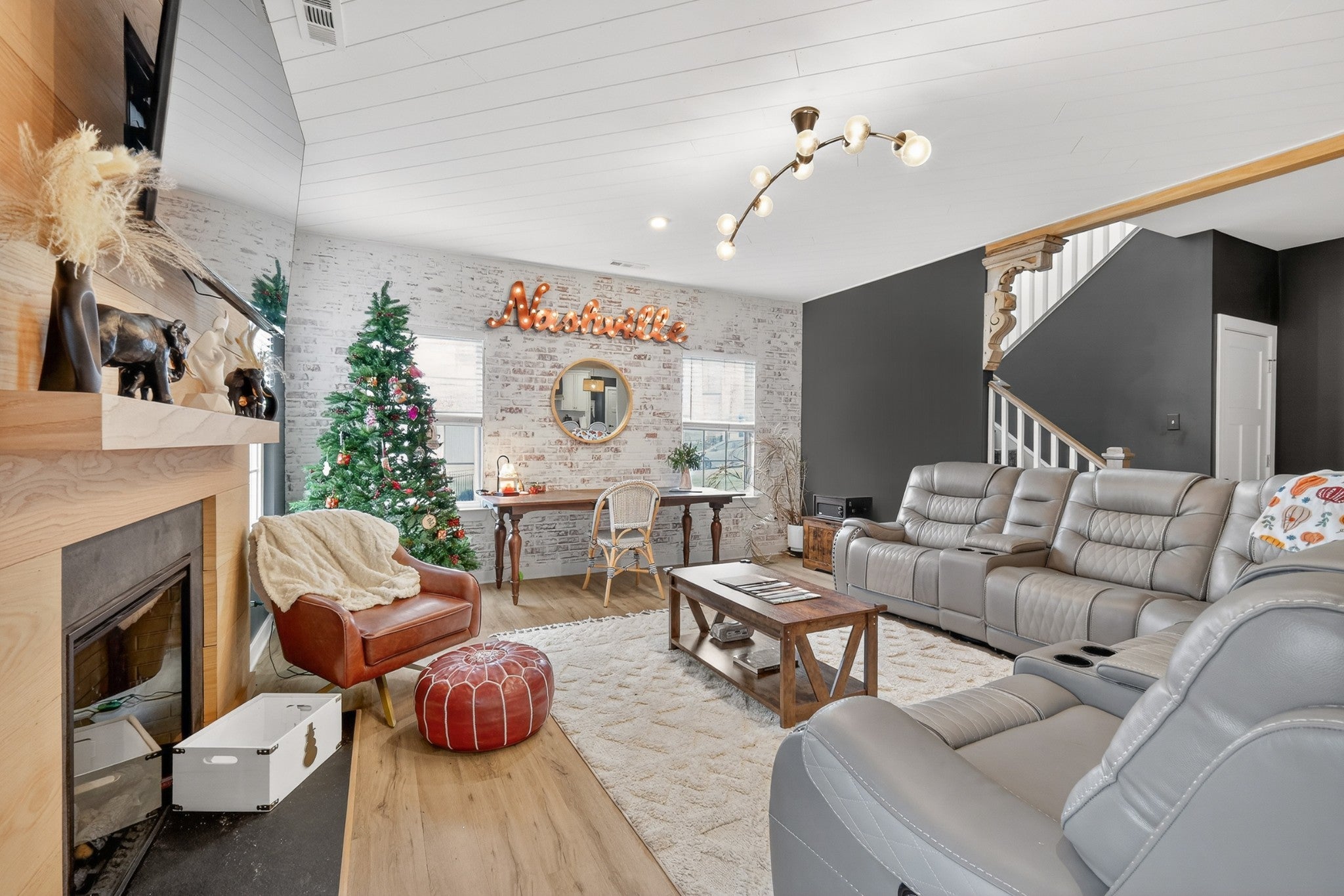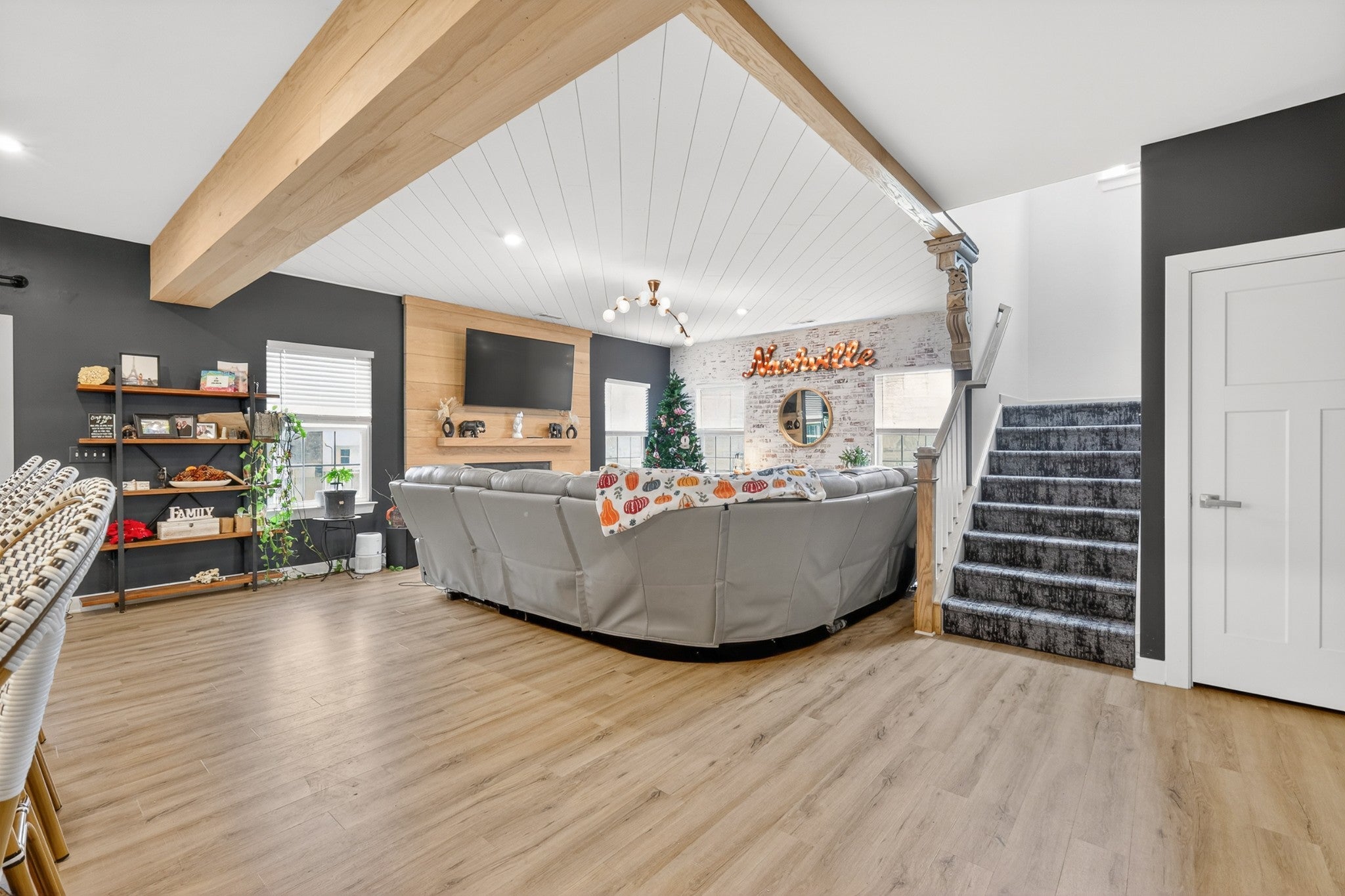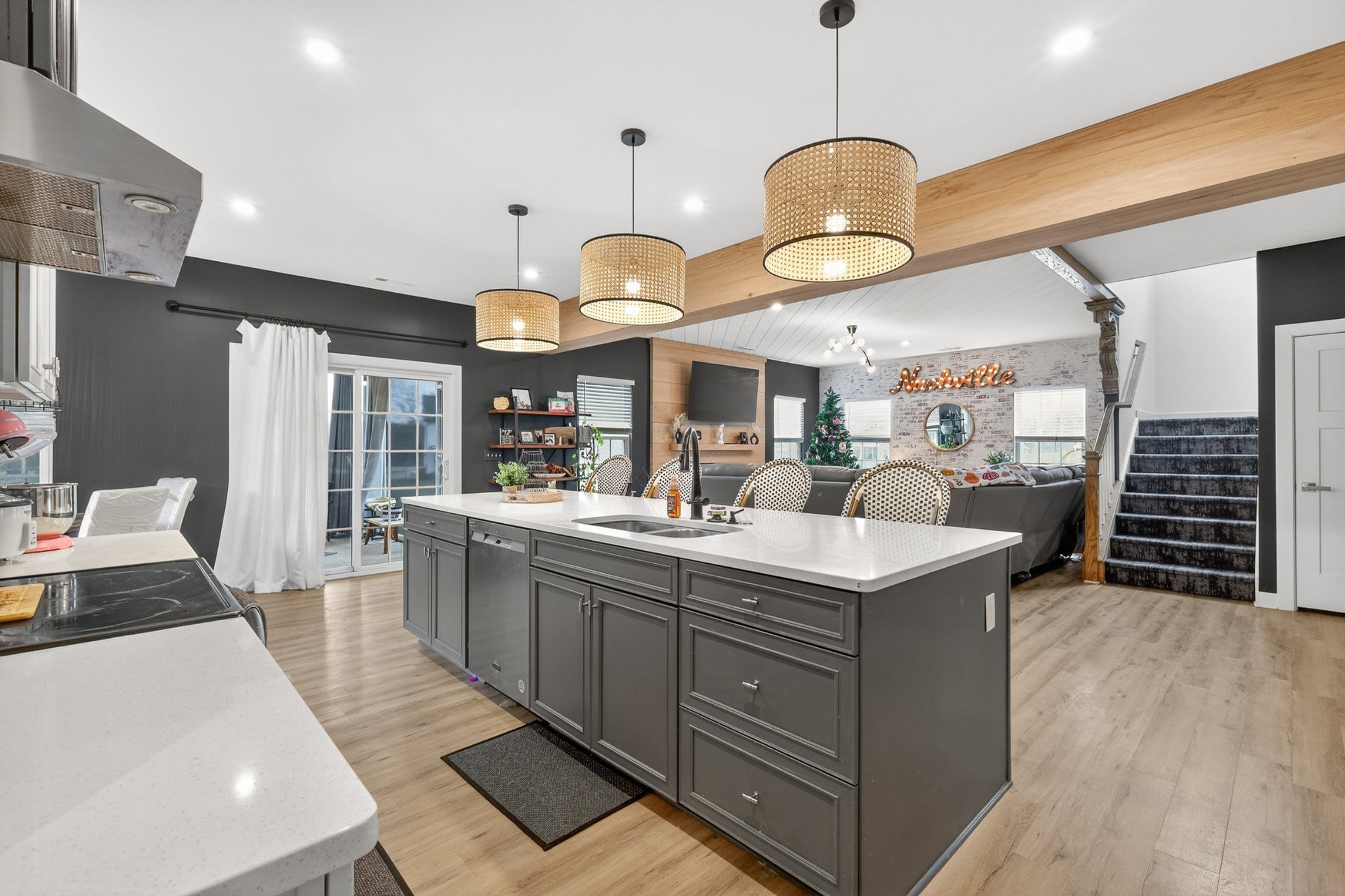 Welcome to an exceptional executive residence, perfectly positioned at the end of a private cul de sac on a nearly one acre homesite. This 3,300 square foot home offers a refined blend of sophistication, comfort, and intentional design. From the moment you enter, you are greeted with elevated finishes and curated details, including statement lighting, custom accent walls, rich wood beams, and a stunning fireplace that anchors the main living space. Every element has been thoughtfully designed to create a warm yet upscale atmosphere. The gourmet kitchen serves as the centerpiece of the home, featuring an expansive island, quartz countertops, and a seamless open concept layout ideal for both intimate gatherings and large scale entertaining. Natural light pours through the home, highlighting the professionally designed interiors and creating an effortless flow throughout. Retreat to the outdoor living spaces where you can enjoy quiet mornings on the front porch or unwind on the screened in back porch offering a true sense of privacy and escape. Combining timeless design, premium upgrades, and a highly desirable setting, this executive home delivers a rare opportunity for elevated living.