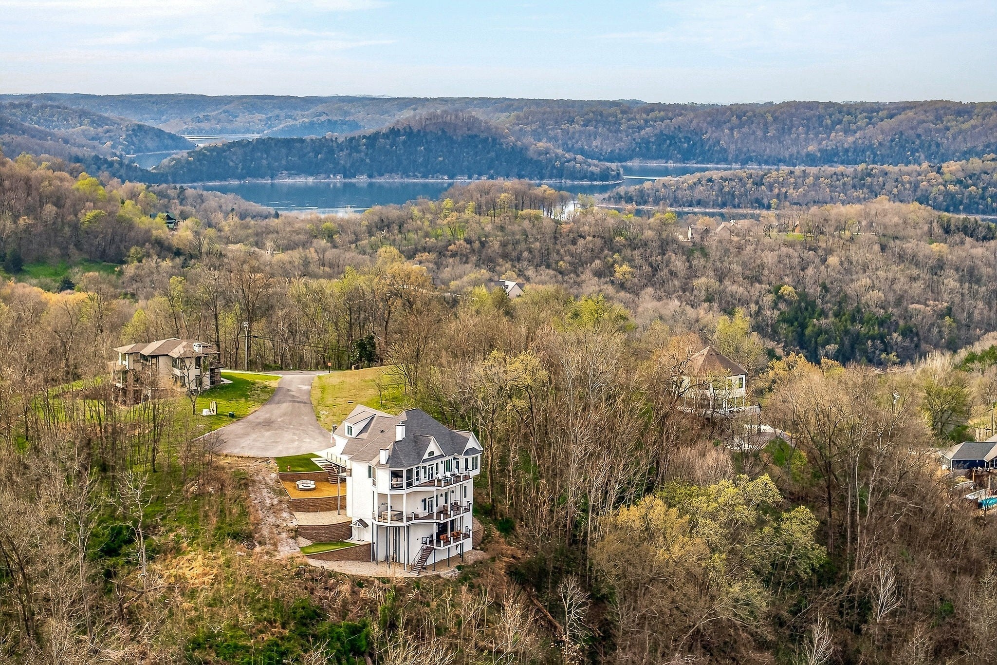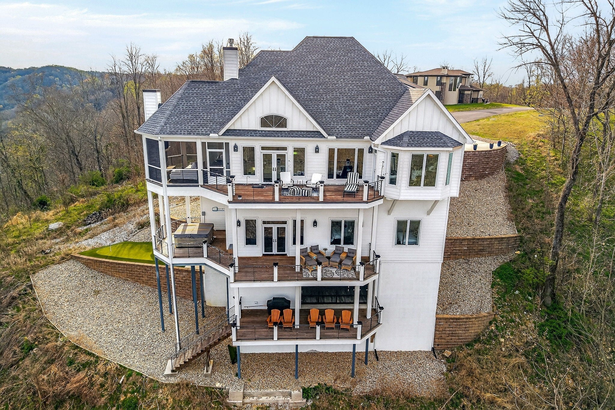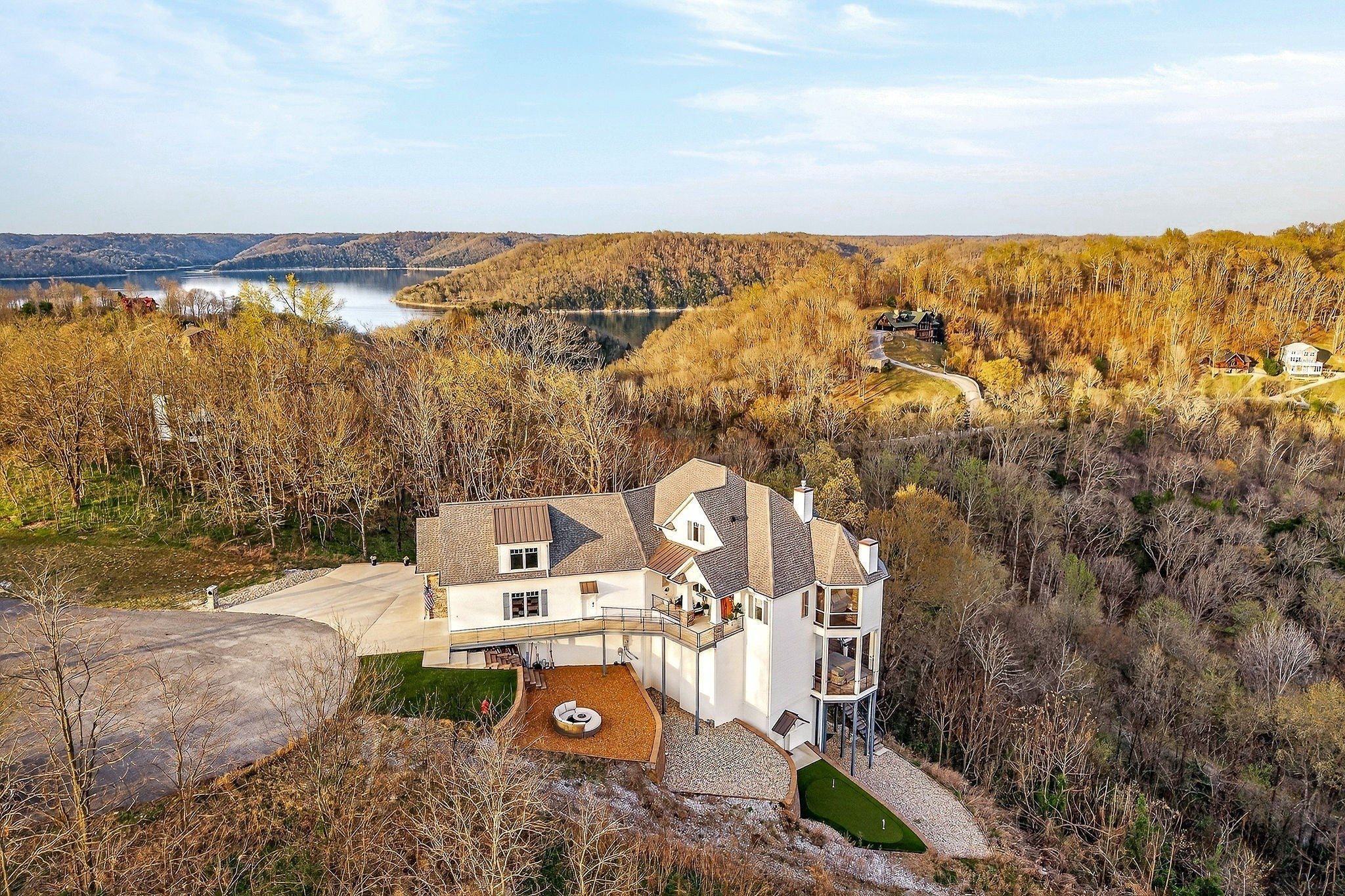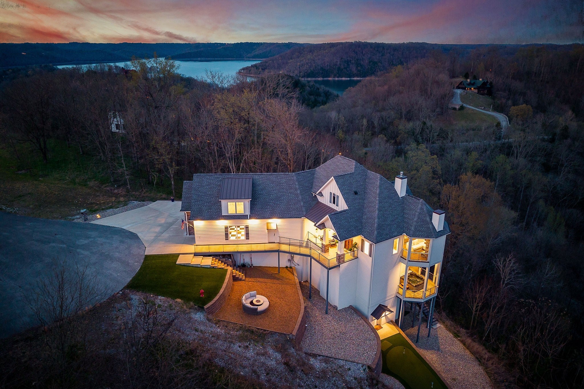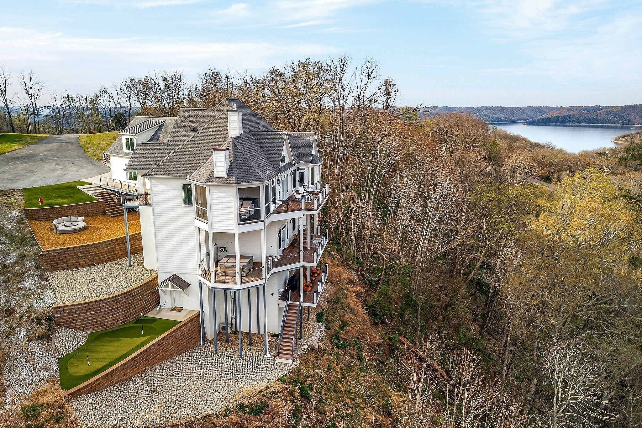 Welcome to a one-of-a-kind lake retreat with breathtaking views of Center Hill Lake from every room. This majestic four-story 5445 sq ft home features an open floor plan designed to maximize natural light and panoramic scenery. Enjoy a maintenance-free yard with artificial turf and a putting green, three expansive decks, and soaring high ceilings throughout. The designer kitchen showcases custom cabinetry and high-end appliances, flowing into a dramatic main living area with 22-foot ceilings, tinted windows, and a stunning stone gas fireplace. The main-level primary suite offers dual closets, a spa-like bath with separate tub and shower, double vanities, and heated floors. Outdoor living is unmatched, with a screened-in main-level deck featuring a gas fireplace, full outdoor kitchen & TV, perfect for entertaining year-round. The lower level includes a spacious game room, wet bar with mini fridge, three bedrooms, and two full baths, along with access to a relaxing top of the line hot tub. The bottom level is designed for ultimate recreation, featuring a large rec room, half bath, and an impressive 16-foot-wide automatic glass door that opens to the outdoors. Constructed with durability and efficiency in mind, the home features a fully engineered stem wall foundation, Zip System sheathing on all walls and roof, all three levels of decking are built with steel framing and finished in Ipe wood, with a dry deck system on the top level to protect the spaces below. Inside, the home is fully encapsulated with spray foam insulation and enhanced with soundproofing between bedrooms, bathrooms, and floors—ensuring both comfort and privacy. Smart living is seamless with a Sonos sound system, hardwired security and camera system, remote deadbolt locks, water monitoring system, and Wi-Fi coverage on every level with remote management capability. Enjoy endless high pressure hot water with an on-demand system tankless water heater featuring a circulator