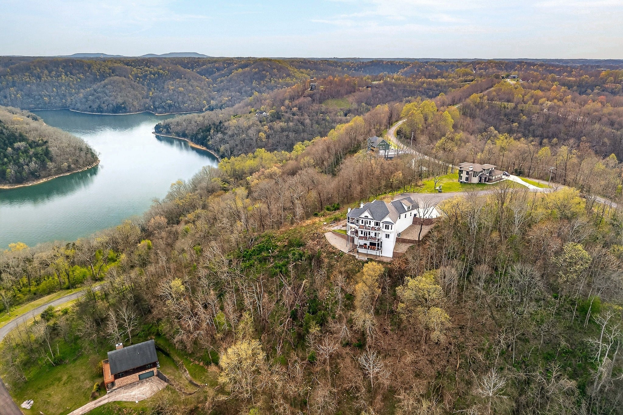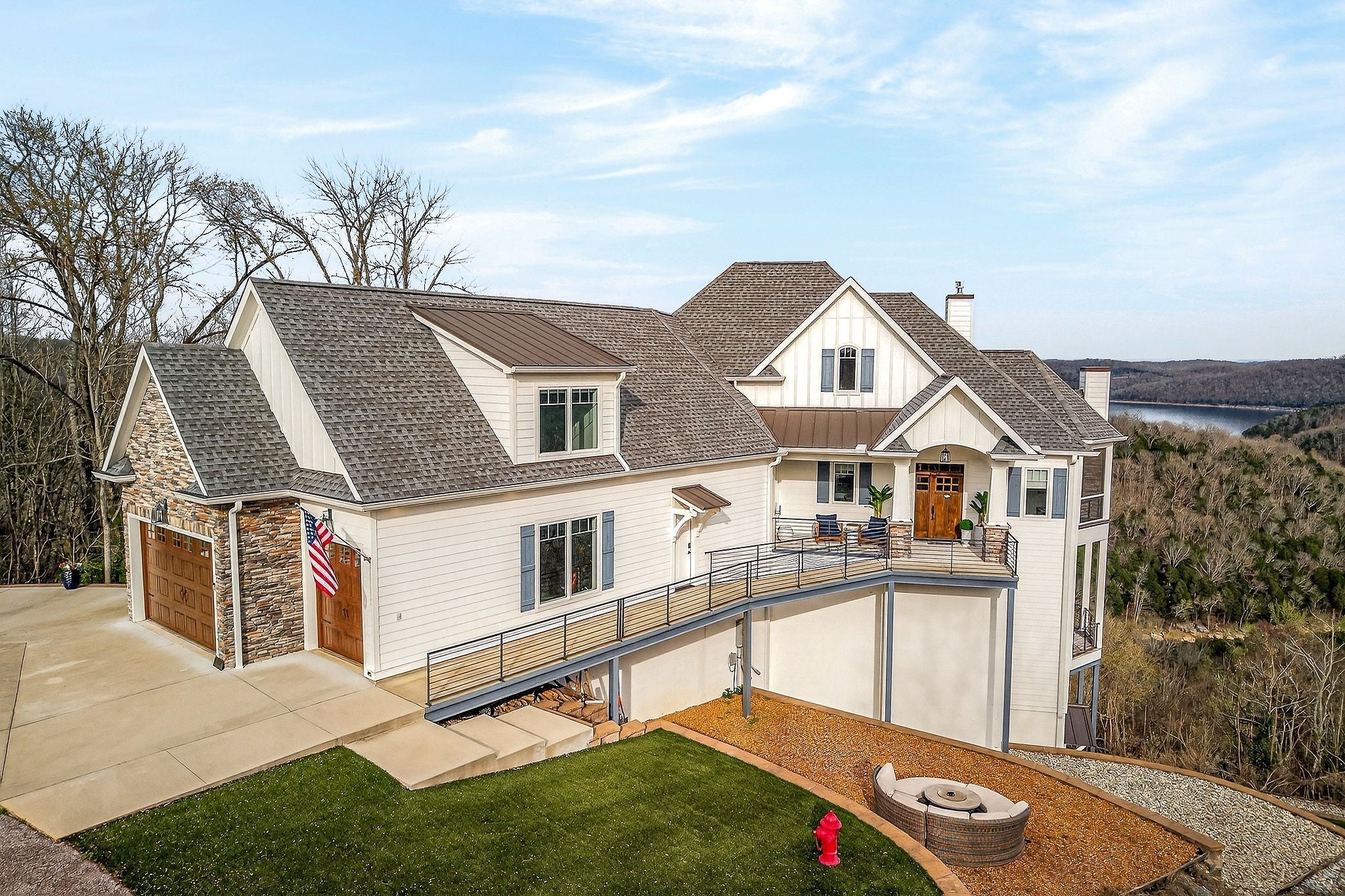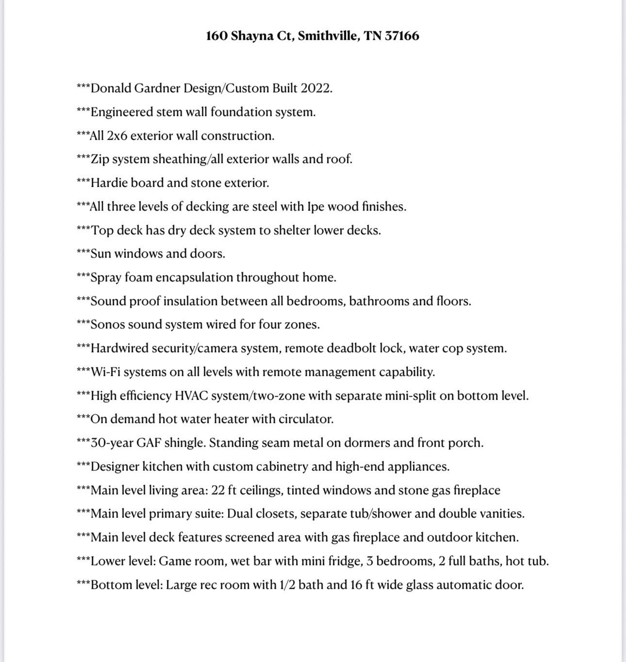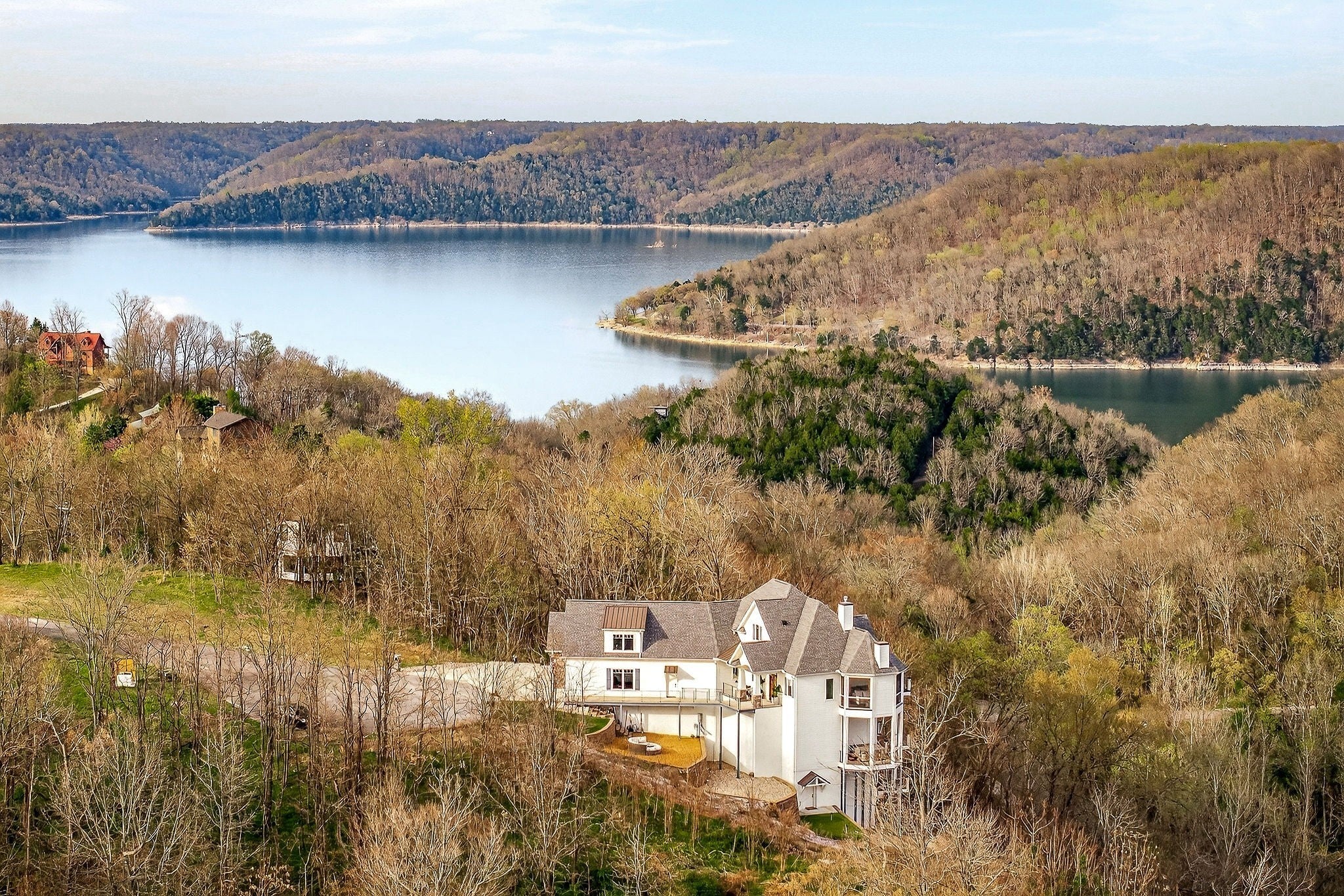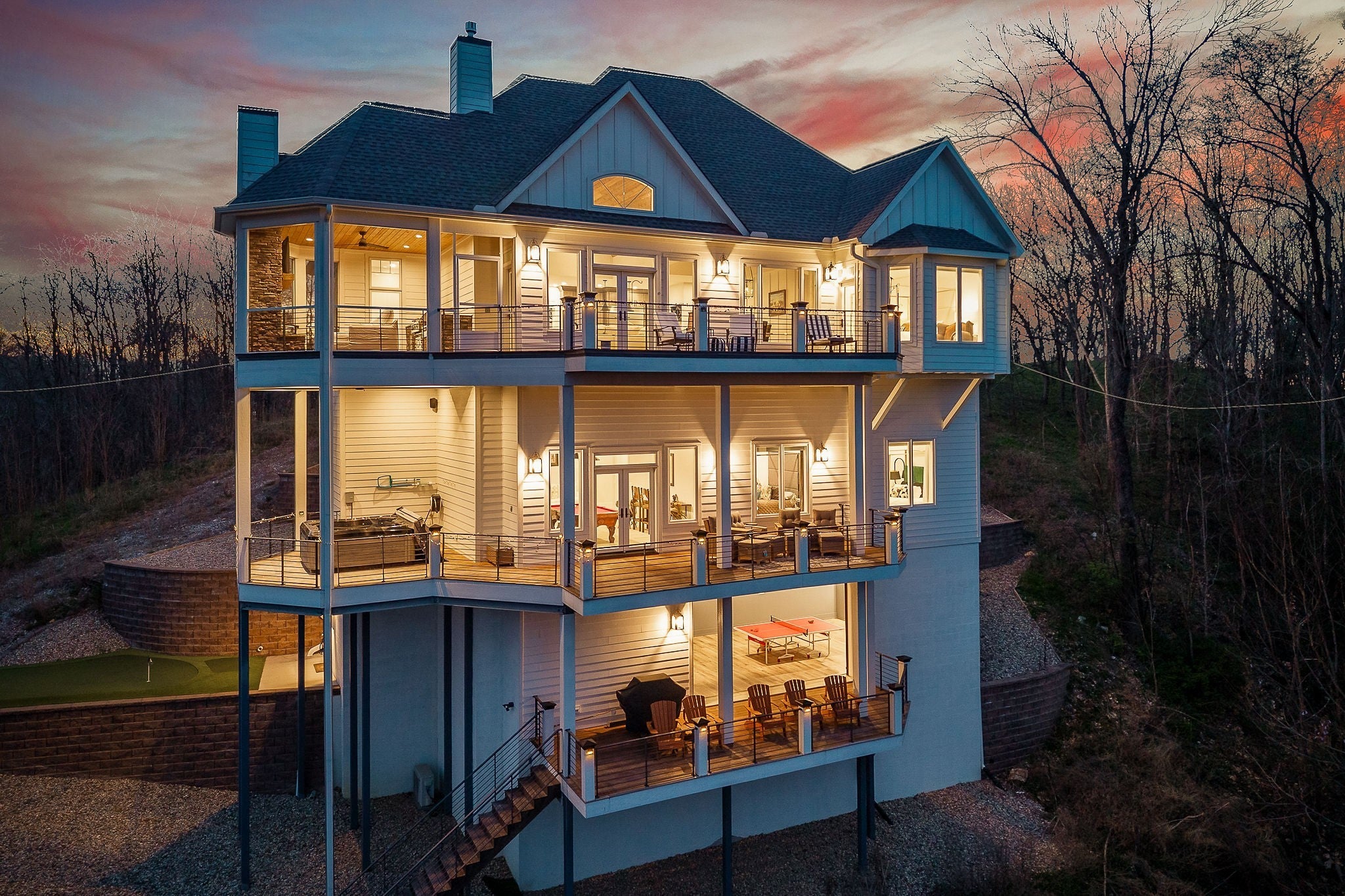 Welcome to a one-of-a-kind lake retreat with breathtaking views of Center Hill Lake from every room. This majestic four-story 5445 sq ft home features an open floor plan designed to maximize natural light and panoramic scenery. Enjoy a maintenance-free yard with artificial turf and a putting green, three expansive decks, and soaring high ceilings throughout. The designer kitchen showcases custom cabinetry and high-end appliances, flowing into a dramatic main living area with 22-foot ceilings, tinted windows, and a stunning stone gas fireplace. The main-level primary suite offers dual closets, a spa-like bath with separate tub and shower, double vanities, and heated floors. Outdoor living is unmatched, with a screened-in main-level deck featuring a gas fireplace, full outdoor kitchen & TV, perfect for entertaining year-round. The lower level includes a spacious game room, wet bar with mini fridge, three bedrooms, and two full baths, along with access to a relaxing top of the line hot tub. The bottom level is designed for ultimate recreation, featuring a large rec room, half bath, and an impressive 16-foot-wide automatic glass door that opens to the outdoors. Constructed with durability and efficiency in mind, the home features a fully engineered stem wall foundation, Zip System sheathing on all walls and roof, all three levels of decking are built with steel framing and finished in Ipe wood, with a dry deck system on the top level to protect the spaces below. Inside, the home is fully encapsulated with spray foam insulation and enhanced with soundproofing between bedrooms, bathrooms, and floors—ensuring both comfort and privacy. Smart living is seamless with a Sonos sound system, hardwired security and camera system, remote deadbolt locks, water monitoring system, and Wi-Fi coverage on every level with remote management capability. Enjoy endless high pressure hot water with an on-demand system tankless water heater featuring a circulator