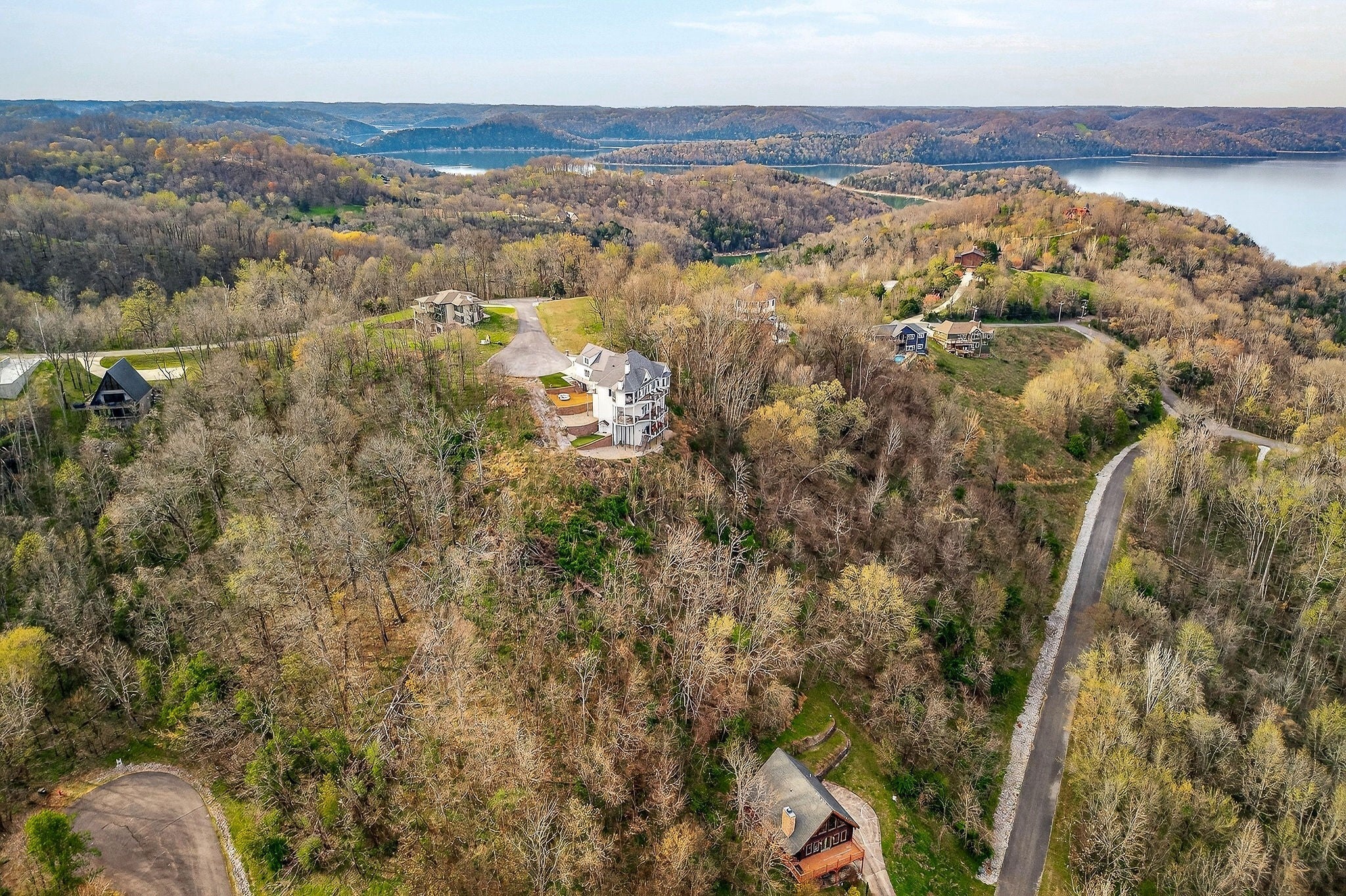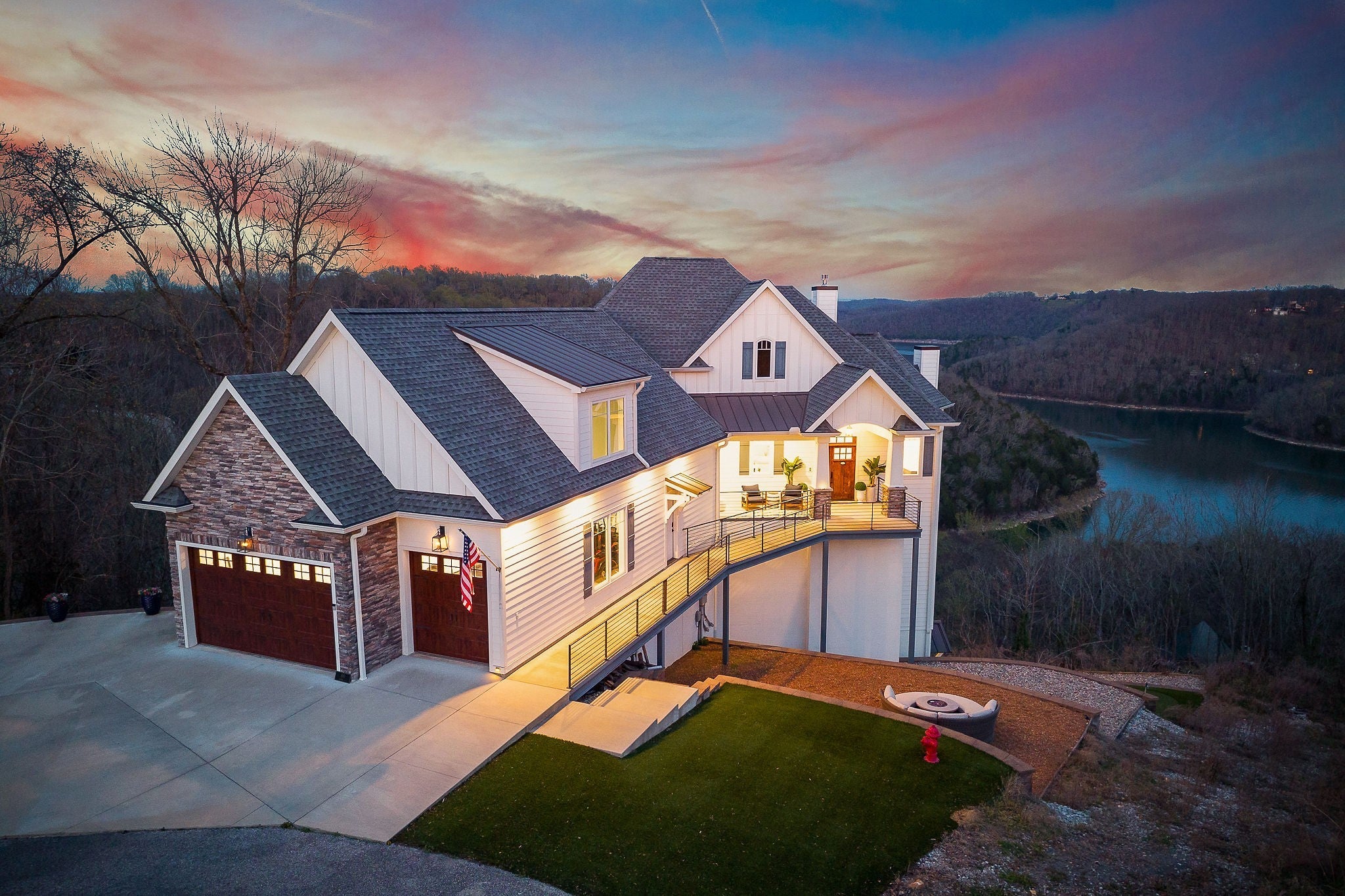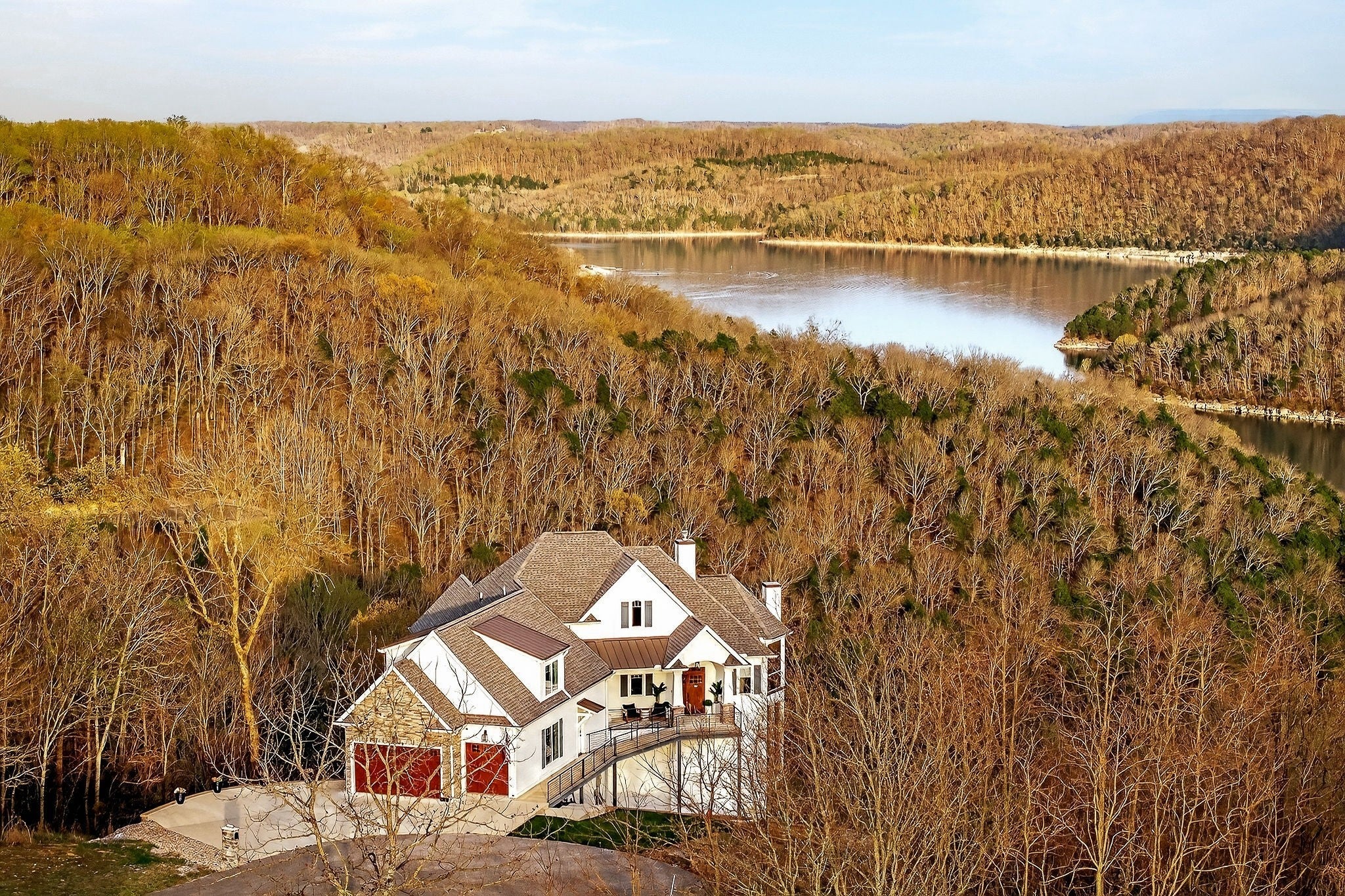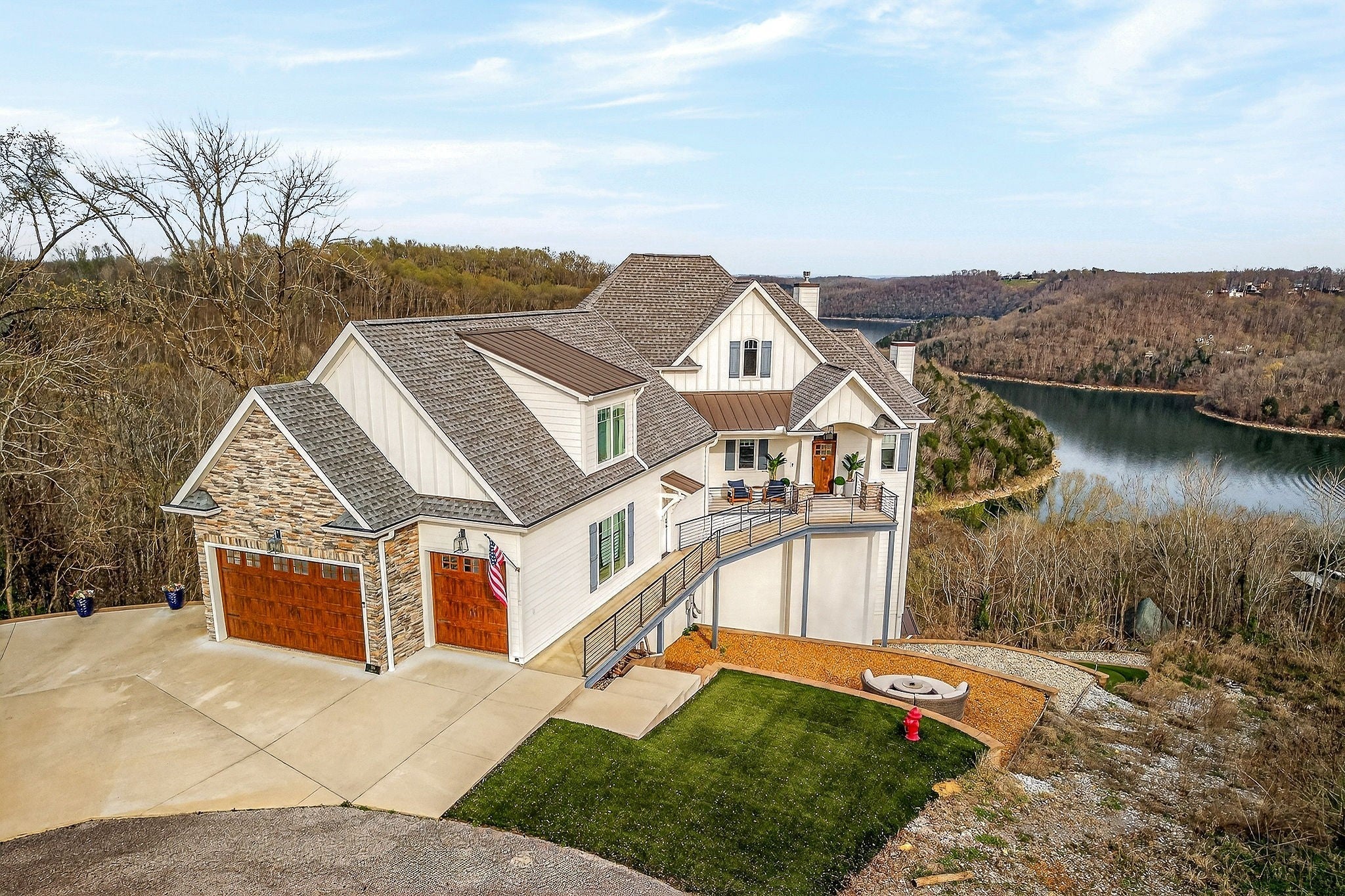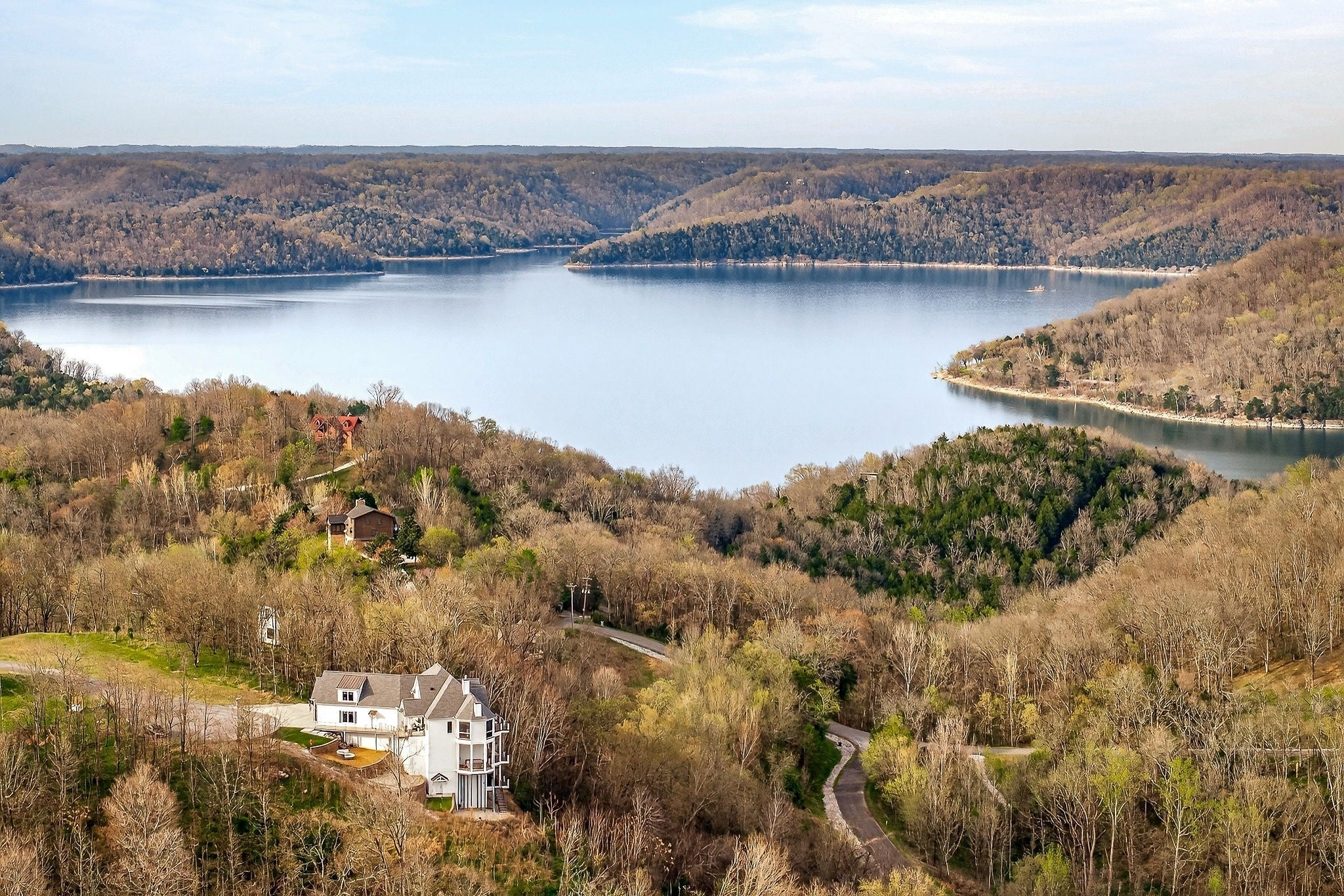 Welcome to a one-of-a-kind lake retreat with breathtaking views of Center Hill Lake from every room. This majestic four-story 5445 sq ft home features an open floor plan designed to maximize natural light and panoramic scenery. Enjoy a maintenance-free yard with artificial turf and a putting green, three expansive decks, and soaring high ceilings throughout. The designer kitchen showcases custom cabinetry and high-end appliances, flowing into a dramatic main living area with 22-foot ceilings, tinted windows, and a stunning stone gas fireplace. The main-level primary suite offers dual closets, a spa-like bath with separate tub and shower, double vanities, and heated floors. Outdoor living is unmatched, with a screened-in main-level deck featuring a gas fireplace, full outdoor kitchen & TV, perfect for entertaining year-round. The lower level includes a spacious game room, wet bar with mini fridge, three bedrooms, and two full baths, along with access to a relaxing top of the line hot tub. The bottom level is designed for ultimate recreation, featuring a large rec room, half bath, and an impressive 16-foot-wide automatic glass door that opens to the outdoors. Constructed with durability and efficiency in mind, the home features a fully engineered stem wall foundation, Zip System sheathing on all walls and roof, all three levels of decking are built with steel framing and finished in Ipe wood, with a dry deck system on the top level to protect the spaces below. Inside, the home is fully encapsulated with spray foam insulation and enhanced with soundproofing between bedrooms, bathrooms, and floors—ensuring both comfort and privacy. Smart living is seamless with a Sonos sound system, hardwired security and camera system, remote deadbolt locks, water monitoring system, and Wi-Fi coverage on every level with remote management capability. Enjoy endless high pressure hot water with an on-demand system tankless water heater featuring a circulator