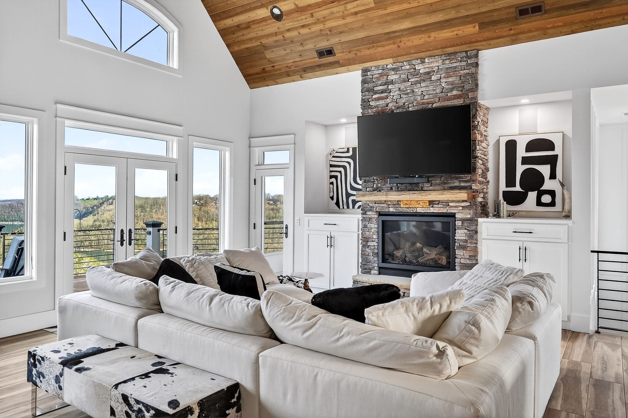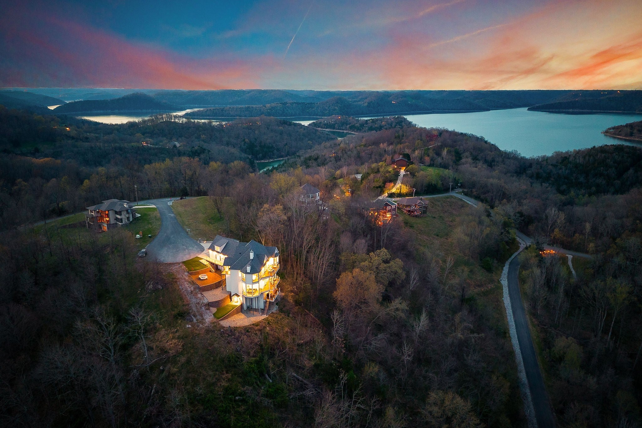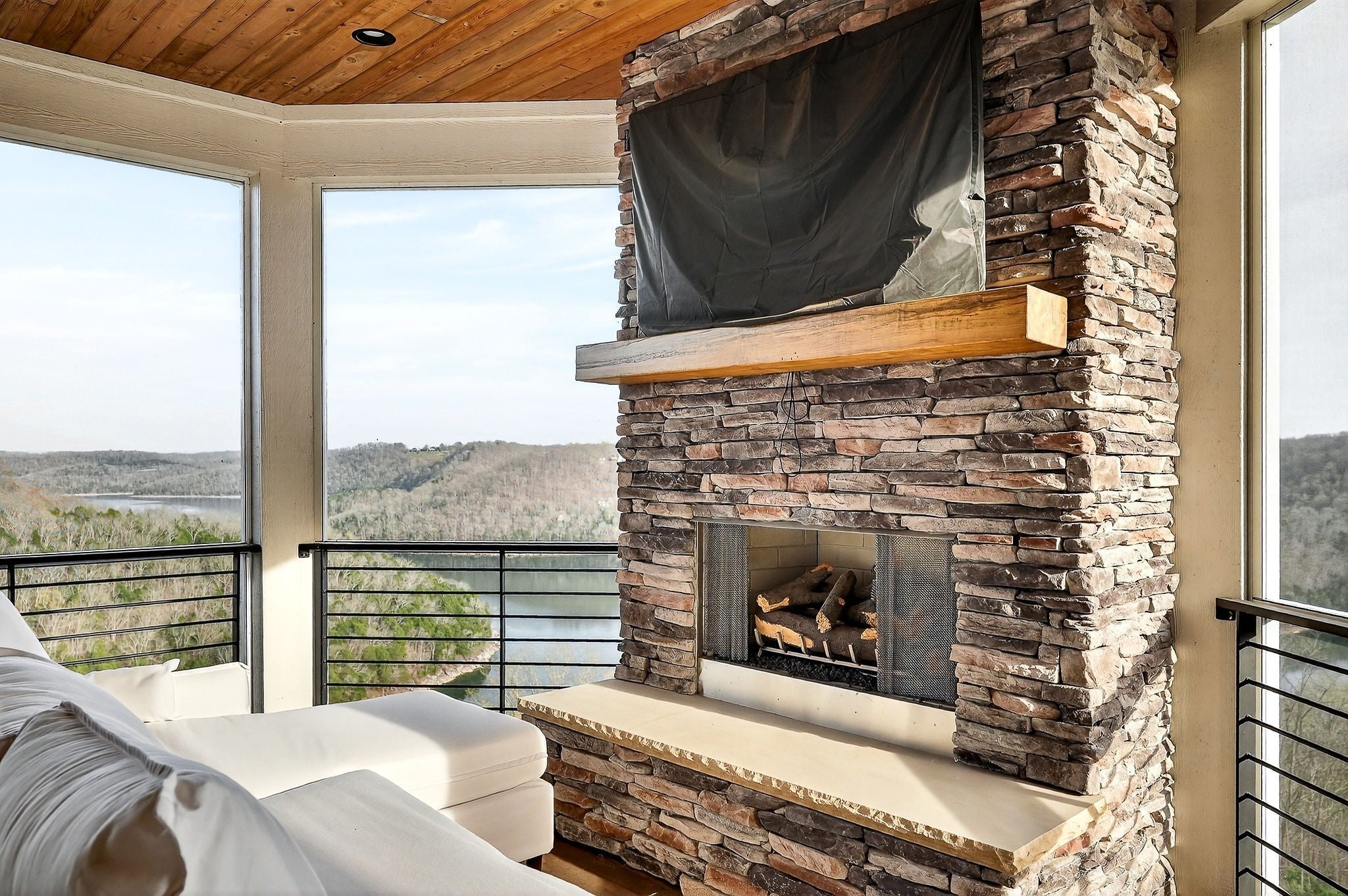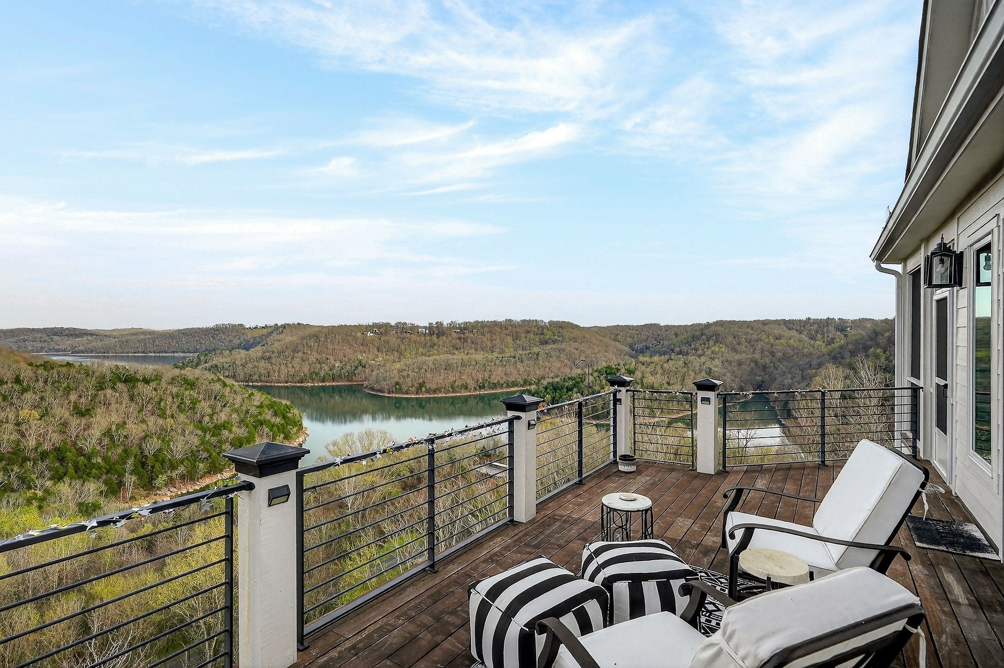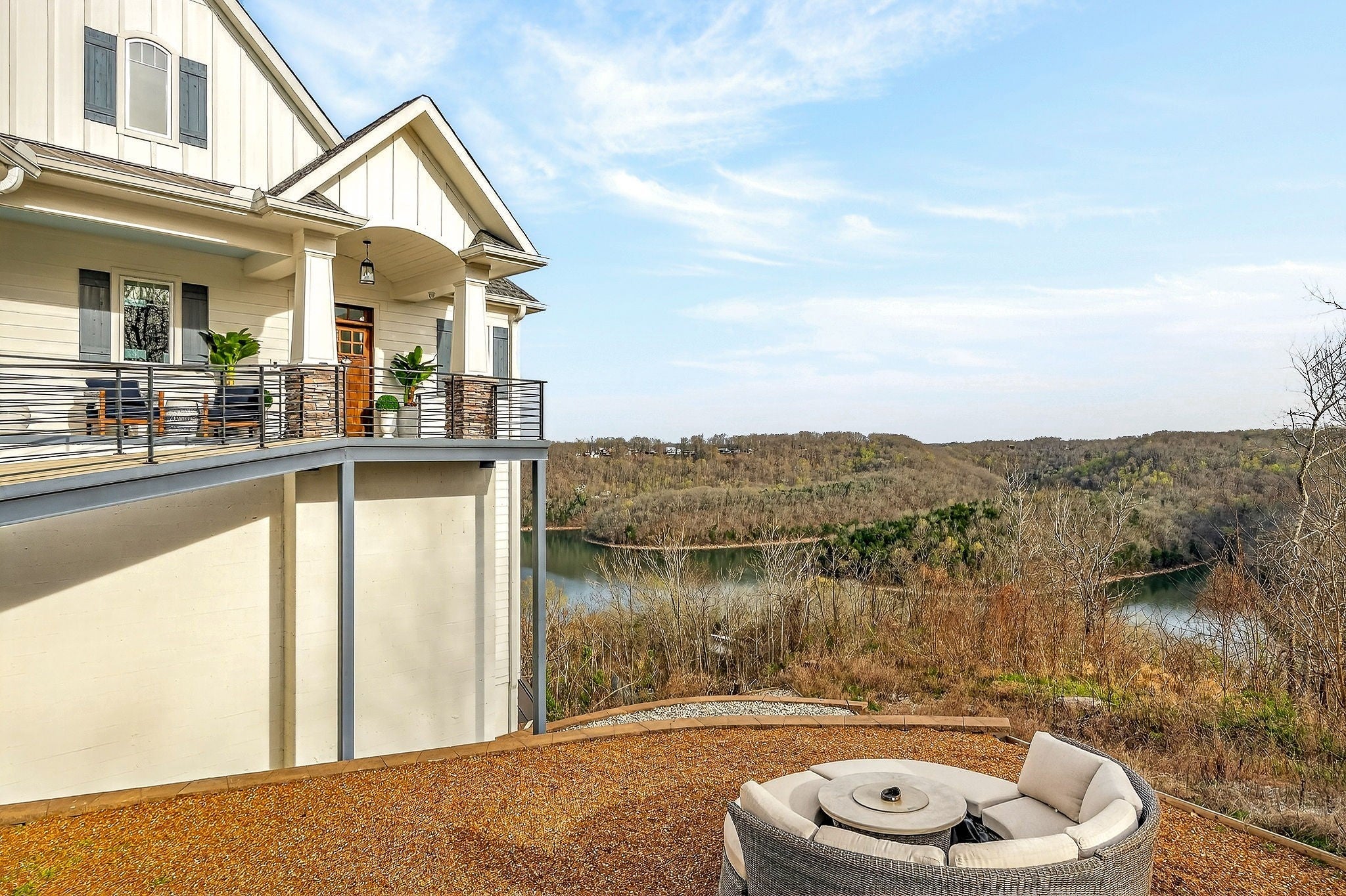 Welcome to a one-of-a-kind lake retreat with breathtaking views of Center Hill Lake from every room. This majestic four-story 5445 sq ft home features an open floor plan designed to maximize natural light and panoramic scenery. Enjoy a maintenance-free yard with artificial turf and a putting green, three expansive decks, and soaring high ceilings throughout. The designer kitchen showcases custom cabinetry and high-end appliances, flowing into a dramatic main living area with 22-foot ceilings, tinted windows, and a stunning stone gas fireplace. The main-level primary suite offers dual closets, a spa-like bath with separate tub and shower, double vanities, and heated floors. Outdoor living is unmatched, with a screened-in main-level deck featuring a gas fireplace, full outdoor kitchen & TV, perfect for entertaining year-round. The lower level includes a spacious game room, wet bar with mini fridge, three bedrooms, and two full baths, along with access to a relaxing top of the line hot tub. The bottom level is designed for ultimate recreation, featuring a large rec room, half bath, and an impressive 16-foot-wide automatic glass door that opens to the outdoors. Constructed with durability and efficiency in mind, the home features a fully engineered stem wall foundation, Zip System sheathing on all walls and roof, all three levels of decking are built with steel framing and finished in Ipe wood, with a dry deck system on the top level to protect the spaces below. Inside, the home is fully encapsulated with spray foam insulation and enhanced with soundproofing between bedrooms, bathrooms, and floors—ensuring both comfort and privacy. Smart living is seamless with a Sonos sound system, hardwired security and camera system, remote deadbolt locks, water monitoring system, and Wi-Fi coverage on every level with remote management capability. Enjoy endless high pressure hot water with an on-demand system tankless water heater featuring a circulator