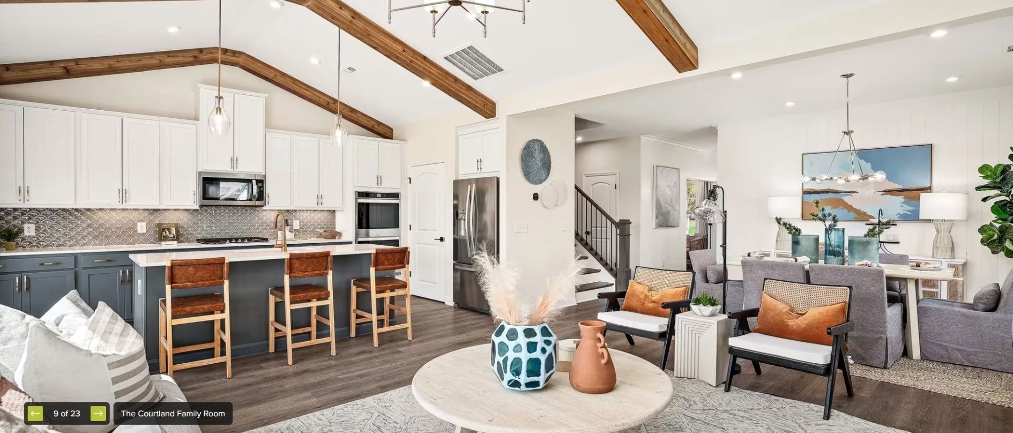 The highly desired Courtland plan on a corner lot features open concept living with vaulted ceilings and cedar beams in the living room and primary suite plus convenient built-in's too! The primary bedroom, a guest room as well as laundry all located on main level of home. Inviting kitchen offers quartz countertops with tile backsplash, farm sink, under cabinet lighting, soft close doors and drawers and wood shelving in the pantry. Primary suite offers a fantastic SUPER SHOWER and wood closet shelving for an elevated touch. Mohawk Revwood flooring through out first floor of home, hardwood stairs with iron spindles lead you to the spacious game room, tile in all baths and laundry, study features coffered ceilings and French doors for privacy. The back has an oversized covered back patio for all your entertaining needs. This home is under construction - visit our decorated models in the community to learn more!