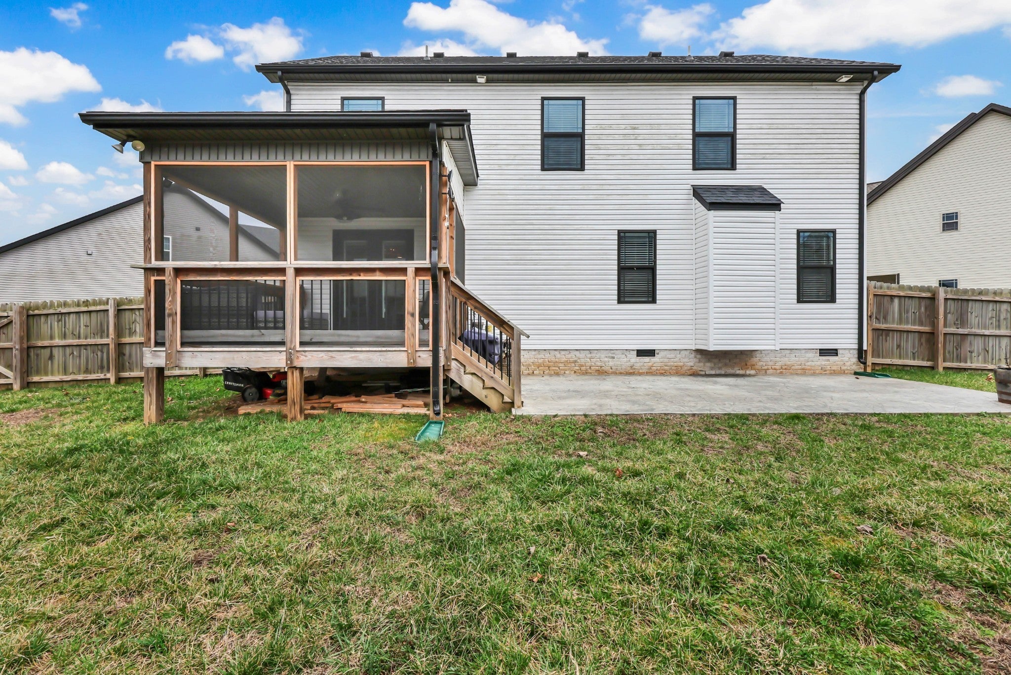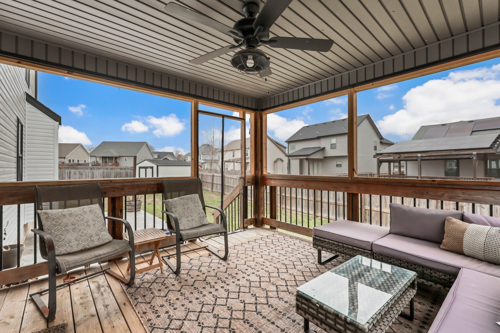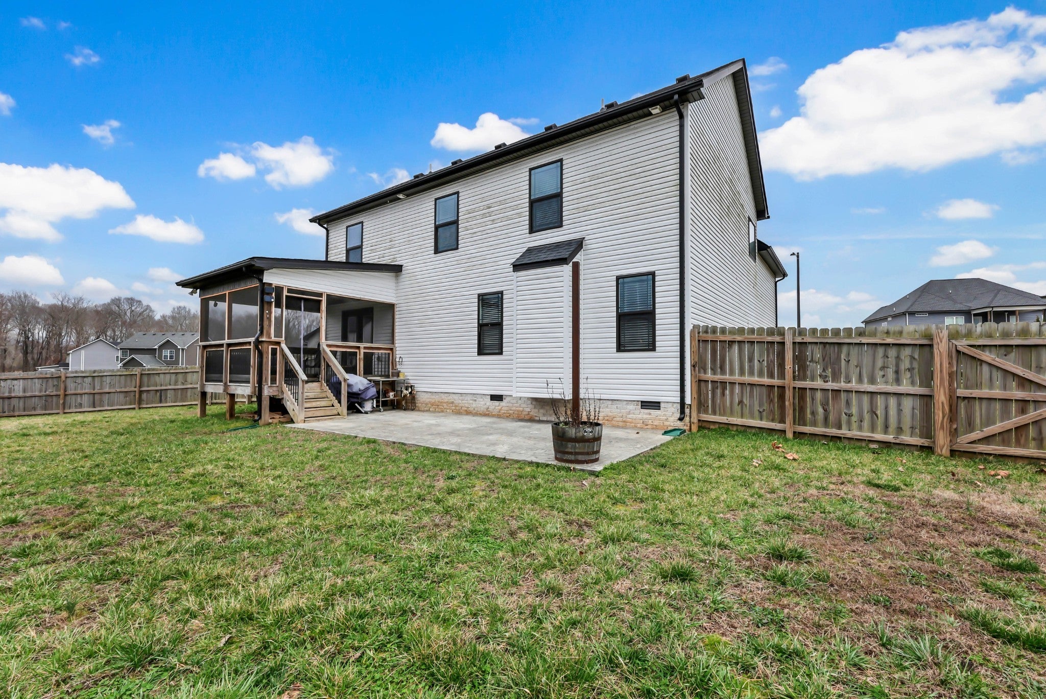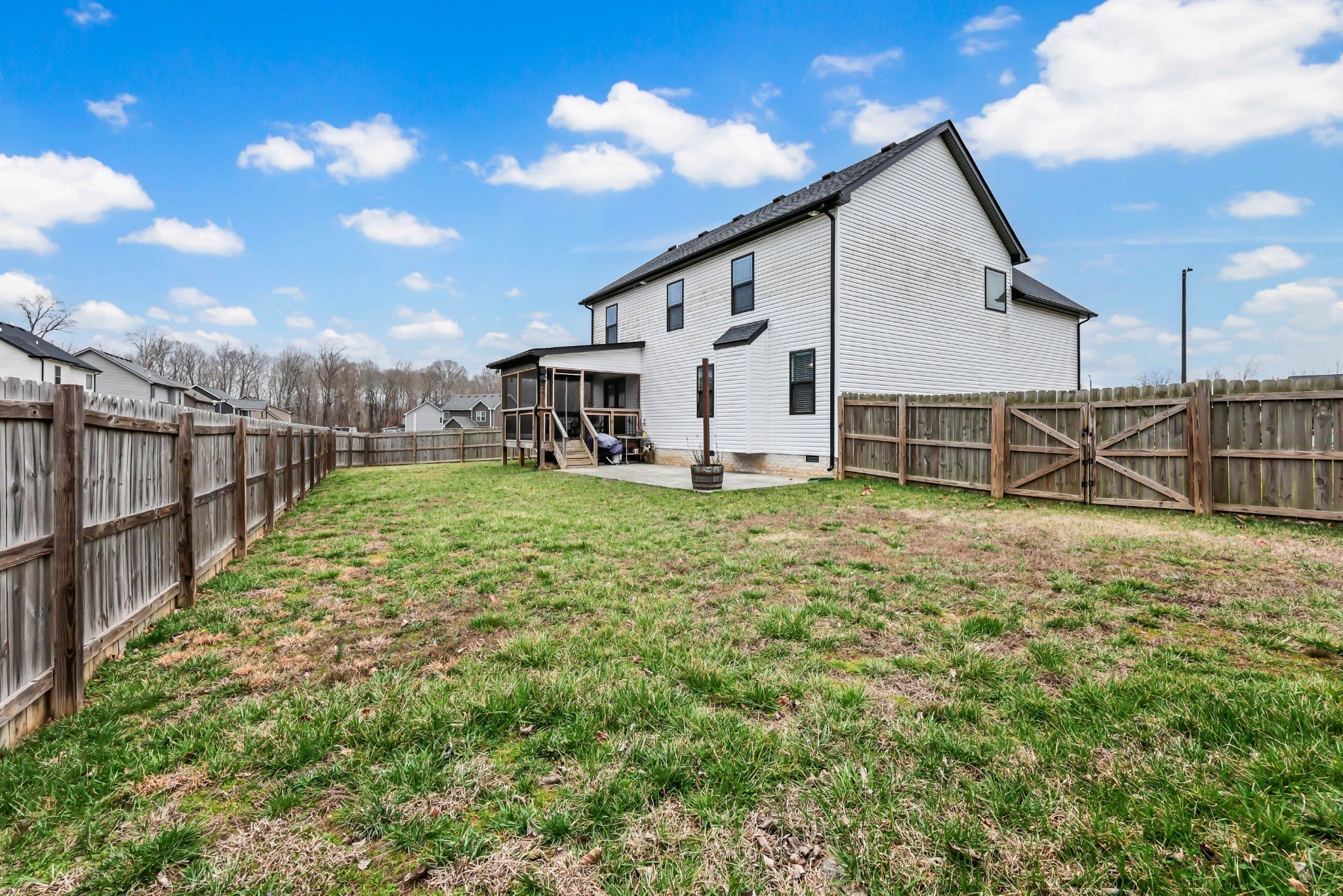 Welcome to this beautifully maintained home, built in 2020 and perfectly situated on a flat lot in a quiet cul-de-sac—offering both privacy and a true neighborhood feel. Thoughtfully designed with modern living in mind, this home features a seamless open-concept layout that is both functional and inviting. The main level showcases a galley-style kitchen with ample cabinetry and counter space, flowing effortlessly into the dining area and spacious living room. Anchored by a cozy gas fireplace, the living space is ideal for both everyday living and entertaining. A convenient half bath completes the main floor for guests. Upstairs, you’ll find a generously sized primary suite designed for comfort and relaxation. The en suite bathroom features a soaking tub, tile shower, double vanities, and a large walk-in closet. Two additional bedrooms, each with oversized closets, provide plenty of space for family, guests, or a home office, along with a well-appointed hall bath. Step outside to enjoy the home’s charming covered front porch—perfect for morning coffee—and mature landscaping that enhances curb appeal. Out back, a covered deck overlooks a large, fully fenced yard, offering the ideal setting for entertaining, pets, or play. This move-in ready home combines modern finishes, a desirable layout, and a prime cul-de-sac location—making it one you won’t want to miss!
