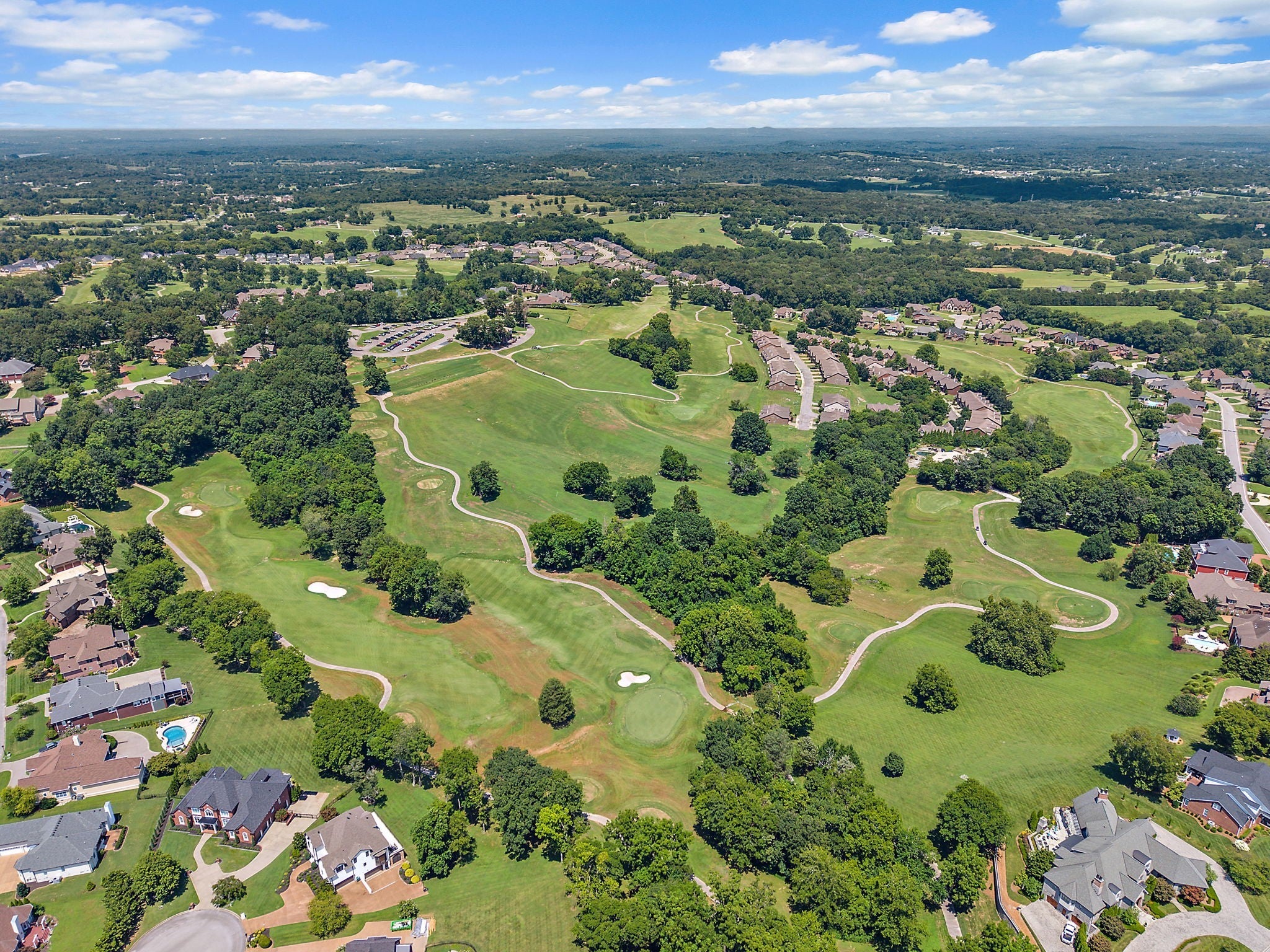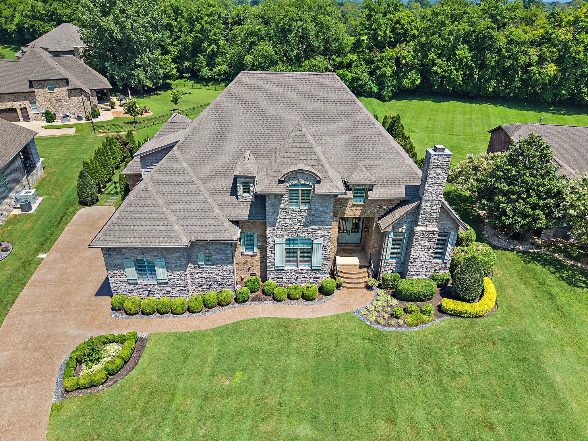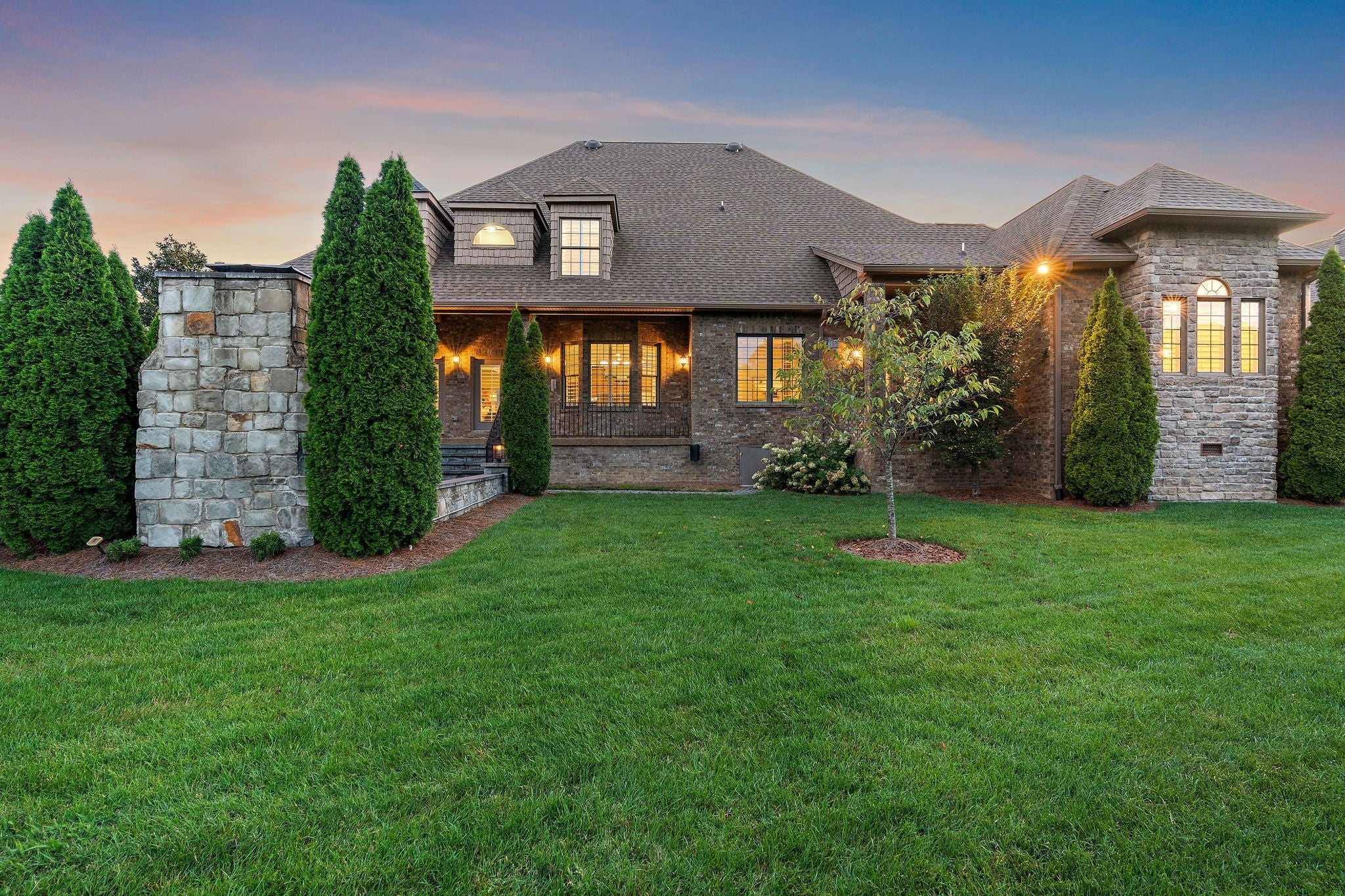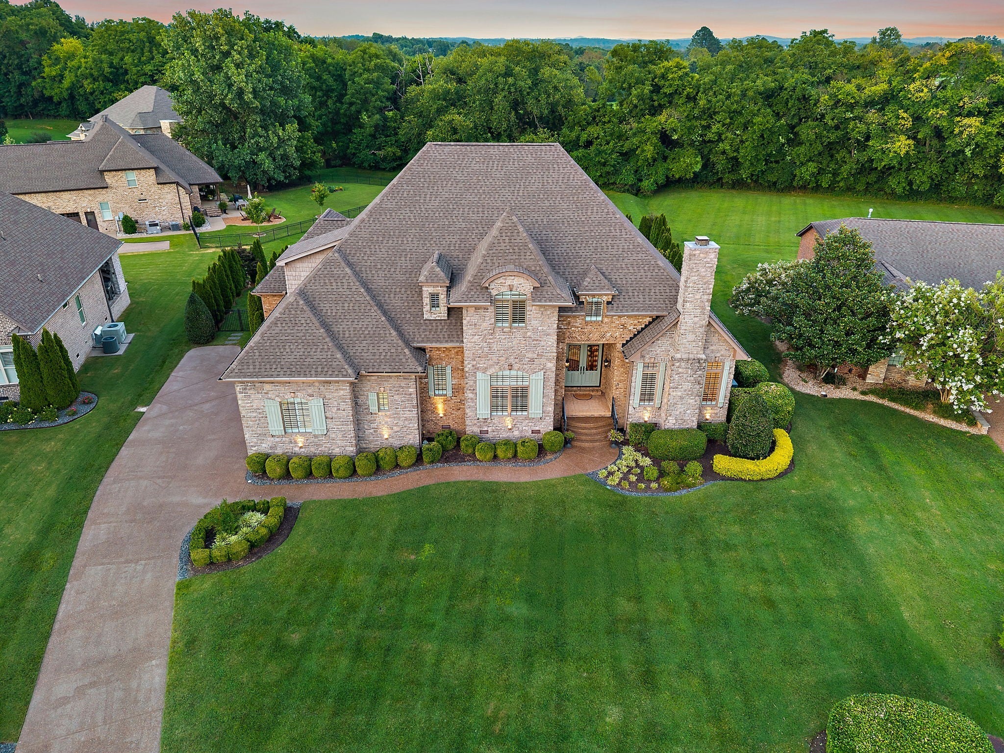 Experience French Country Elegance in Lebanon's sought after Five Oaks Golf Community! This stunning estate offers modern luxury and timeless charm nestled among rolling hills with scenic views of the 17th fairway. Recently painted throughout as well as new updated lighting, the home features an updated kitchen with redesigned layout, granite counters, and new KitchenAid appliances (dishwasher, refrigerator, vent hood & microwave). 3 fireplaces inside the home for added warmth and ambiance. The main-level primary suite is a true retreat—complete with a fireplace, sitting area, spa-like bath, and expansive walk-in closet. Upstairs, you'll find three spacious bedrooms, each with ensuite baths, a loft study space, sitting area, large bonus room, and a fully equipped theatre room with upgraded technology and theatre seating. The backyard is an entertainer’s dream with stone pavers, a fireplace, built-in grill, and professionally designed landscaping for enhanced privacy. Soaring ceilings, hardwood floors, 3 car garage with epoxy floor, new tankless hot water heater & hot water re-circulating system, abundant storage, and refined finishes throughout make this home truly one-of-a-kind. Located in Lebanon's premier golf community just minutes to I-40, shopping, dining, and the Music City Star commuter train.