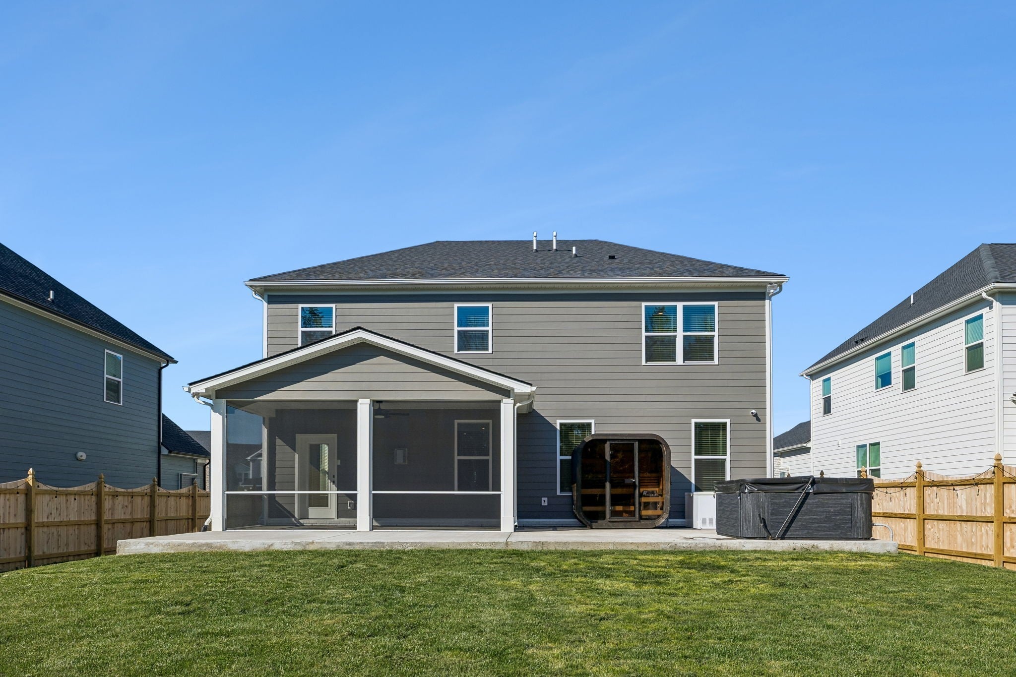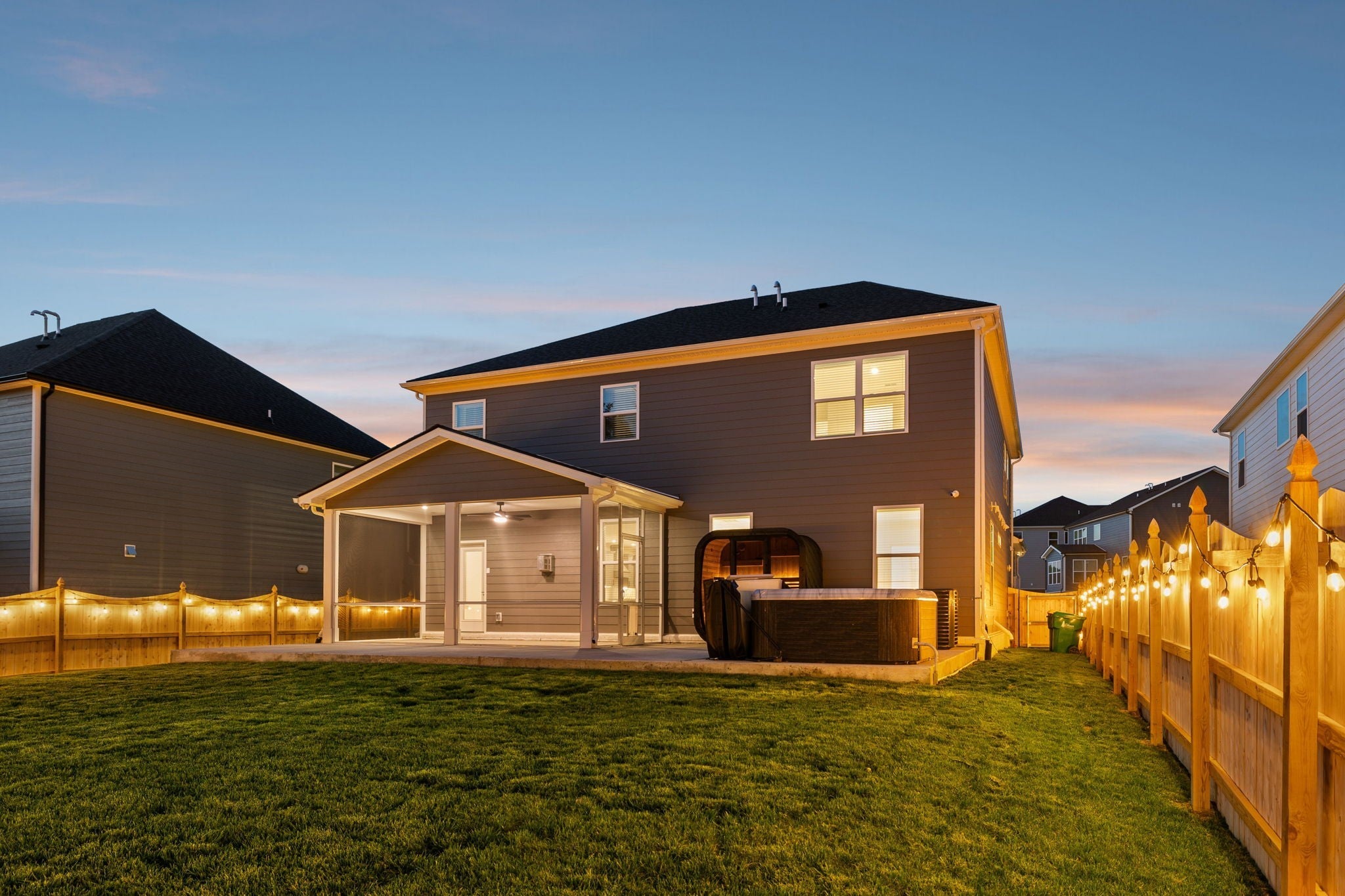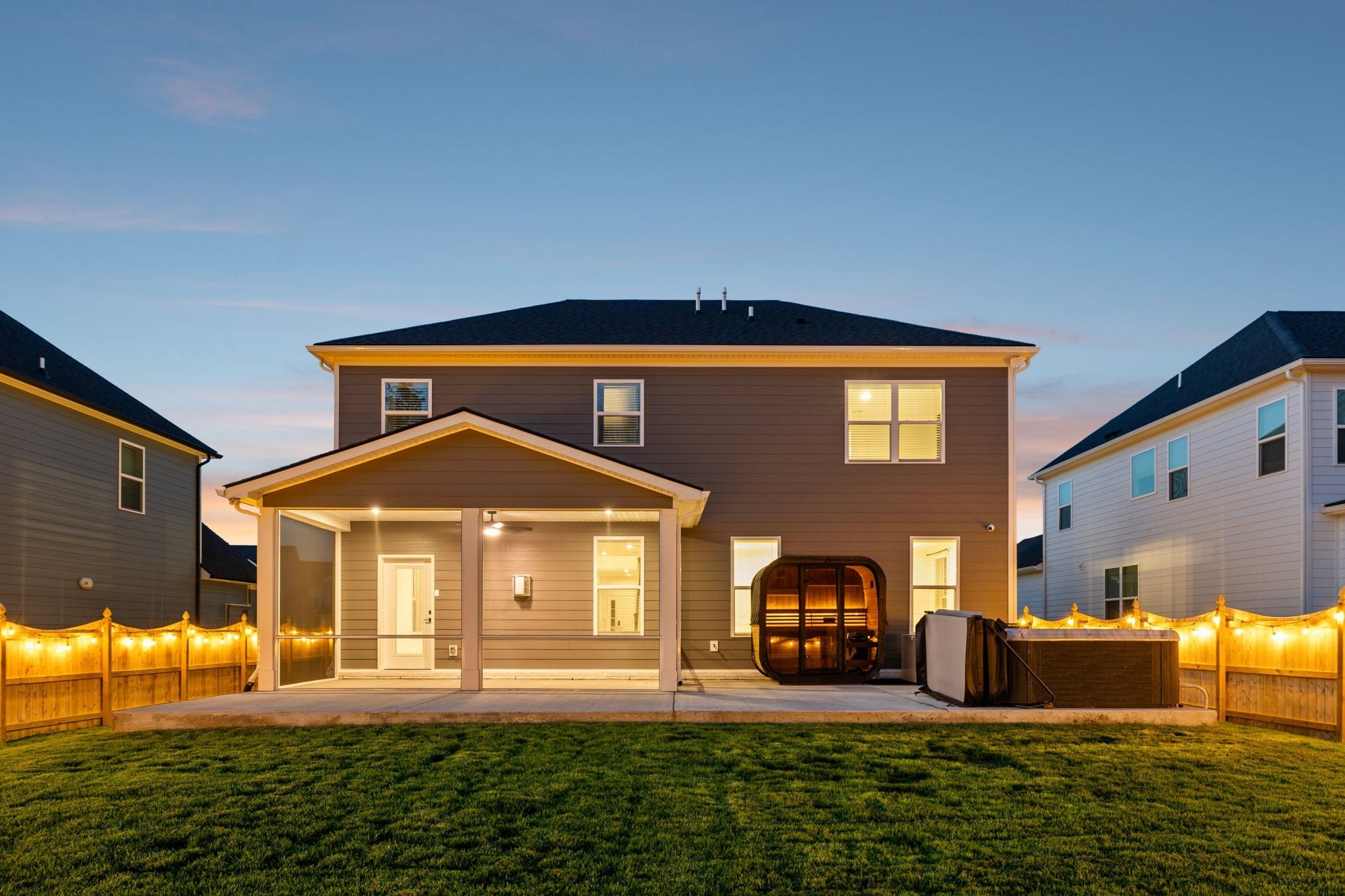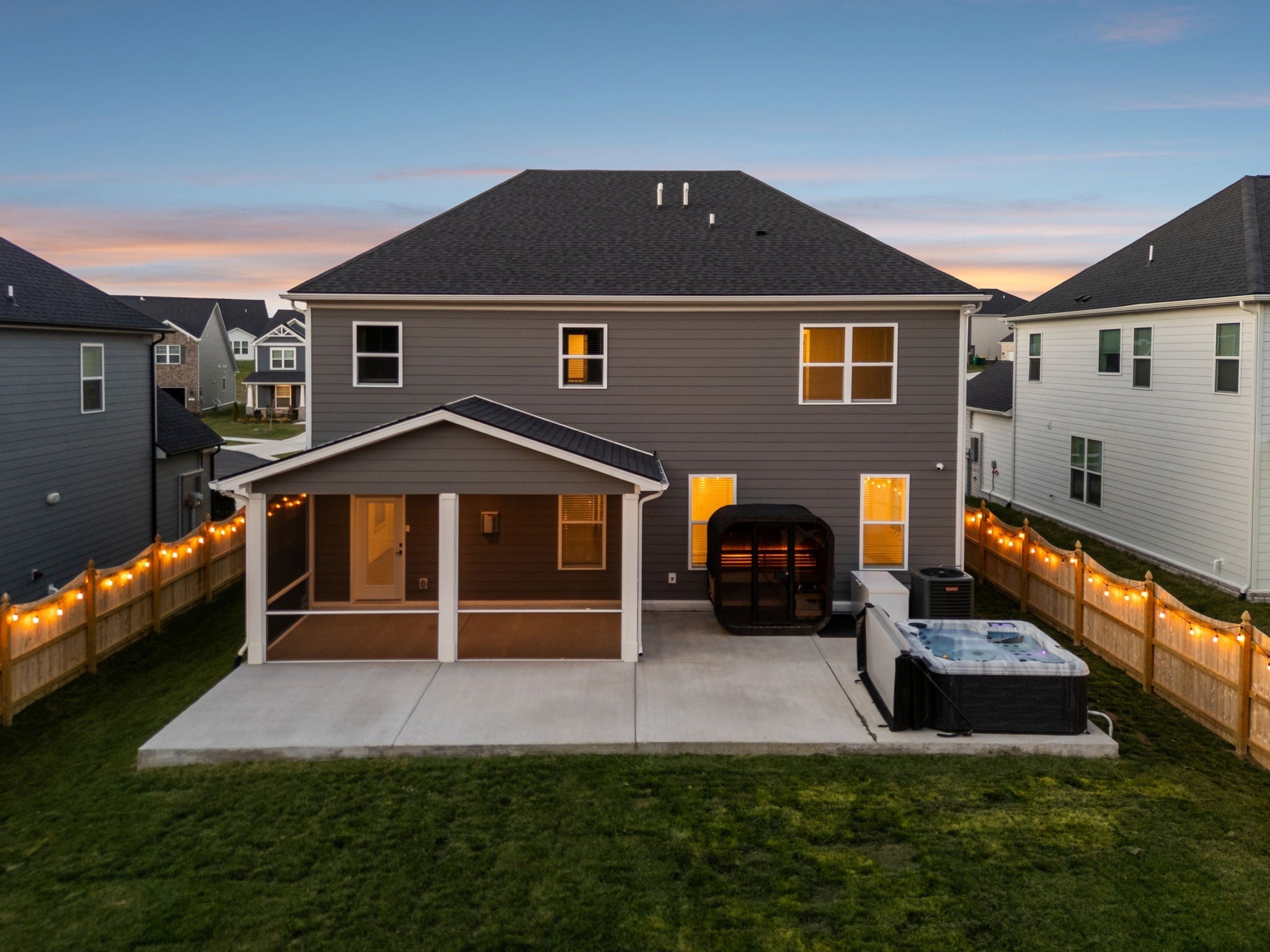 This meticulously upgraded 5-bedroom, 3.5-bath home offers 3,741 square feet of refined luxury on a private, serene lot. Enjoy a tree-lined backdrop beyond the 6-foot privacy fence, creating a peaceful and secluded setting. Outdoor living has been thoughtfully expanded into a true wellness retreat, featuring a heated stone sauna, hot tub, and cold plunge. A covered and screened-in outdoor space provides year-round comfort and versatility for entertaining or relaxing. Inside, the open-concept layout is complemented by a dedicated theater room, premium Whirlpool appliances, and whole-home water filtration. The property is further enhanced by high-end owner upgrades, including a permanent Jellyfish lighting system and a comprehensive smart security network with front and rear cameras. This home seamlessly blends comfort, technology, and lifestyle—schedule your private showing today. RATES AS LOW AS 4.25%! CONTACT LISTING AGENT OR PREFERRED LENDER FOR DETAILS!