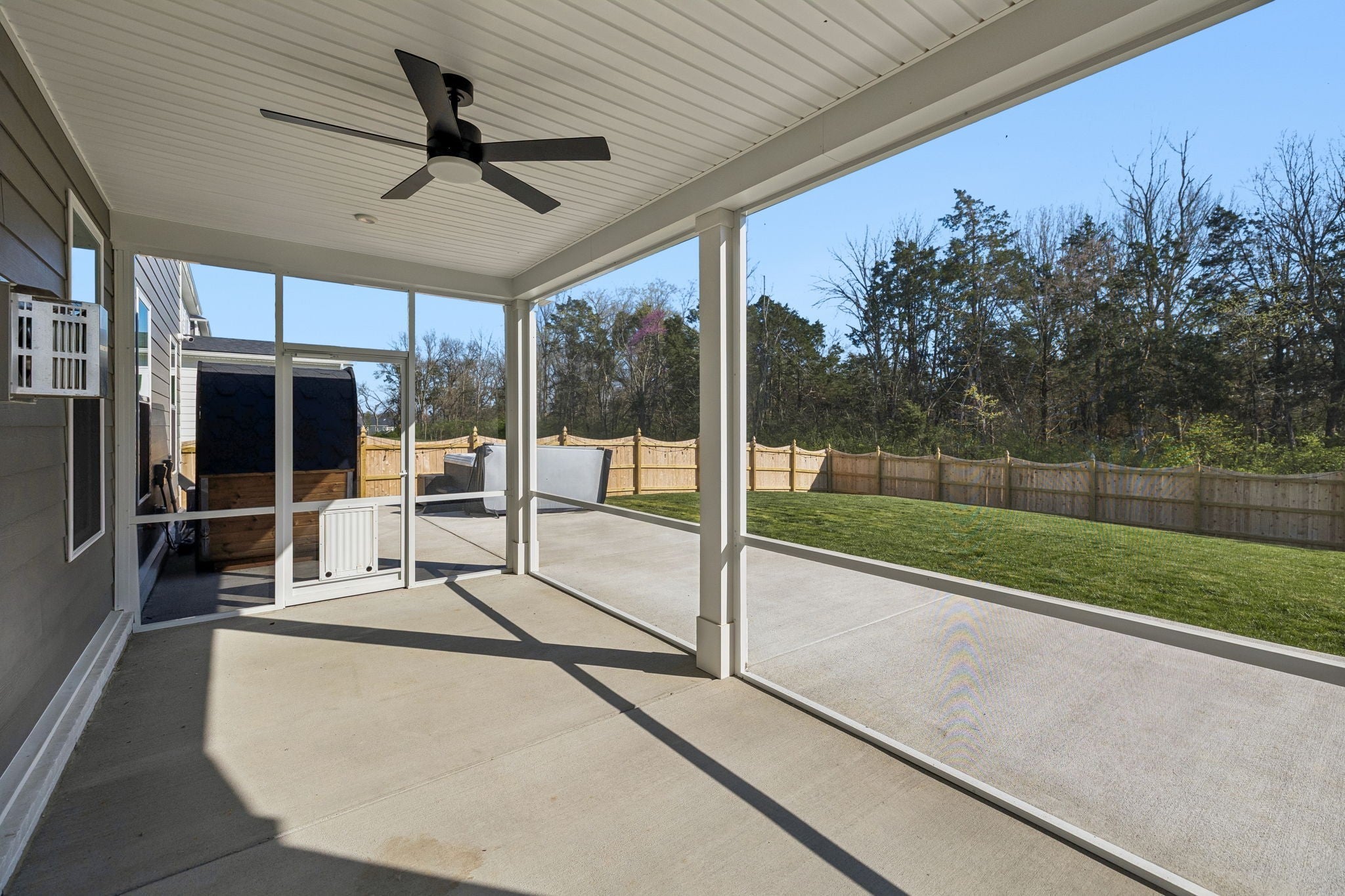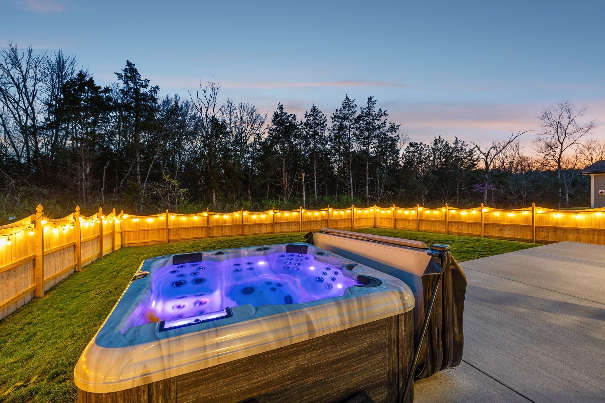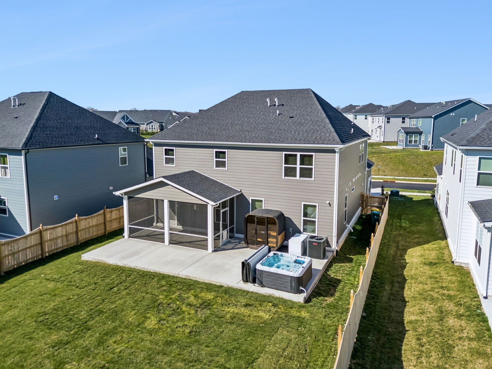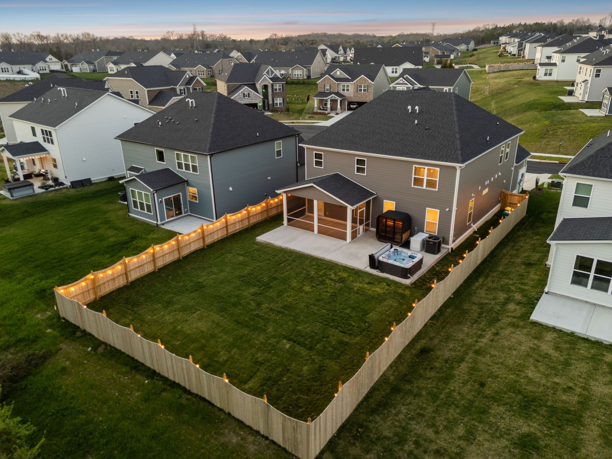 This meticulously upgraded 5-bedroom, 3.5-bath home offers 3,741 square feet of refined luxury on a private, serene lot. Enjoy a tree-lined backdrop beyond the 6-foot privacy fence, creating a peaceful and secluded setting. Outdoor living has been thoughtfully expanded into a true wellness retreat, featuring a heated stone sauna, hot tub, and cold plunge. A covered and screened-in outdoor space provides year-round comfort and versatility for entertaining or relaxing. Inside, the open-concept layout is complemented by a dedicated theater room, premium Whirlpool appliances, and whole-home water filtration. The property is further enhanced by high-end owner upgrades, including a permanent Jellyfish lighting system and a comprehensive smart security network with front and rear cameras. This home seamlessly blends comfort, technology, and lifestyle—schedule your private showing today. RATES AS LOW AS 4.25%! CONTACT LISTING AGENT OR PREFERRED LENDER FOR DETAILS!