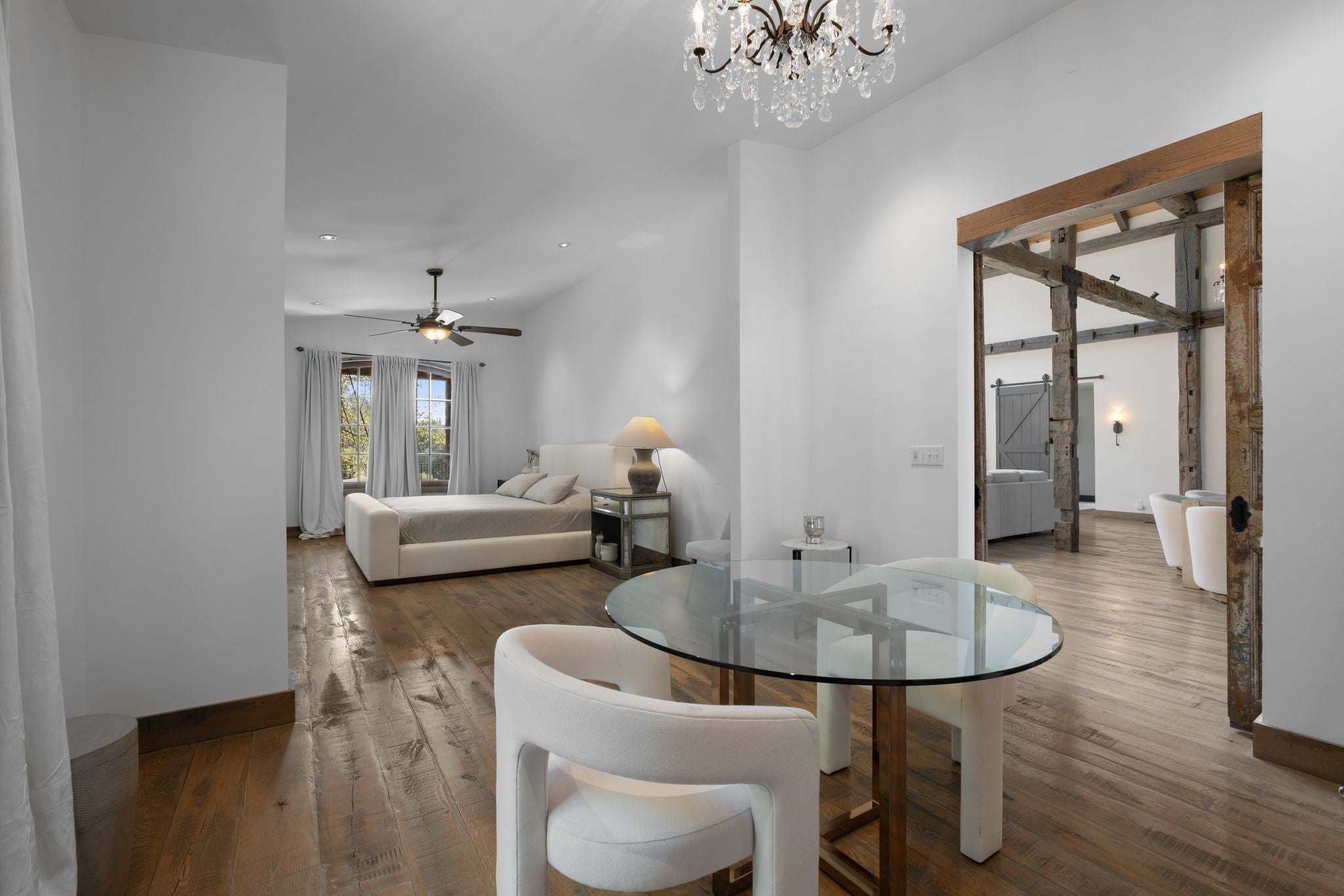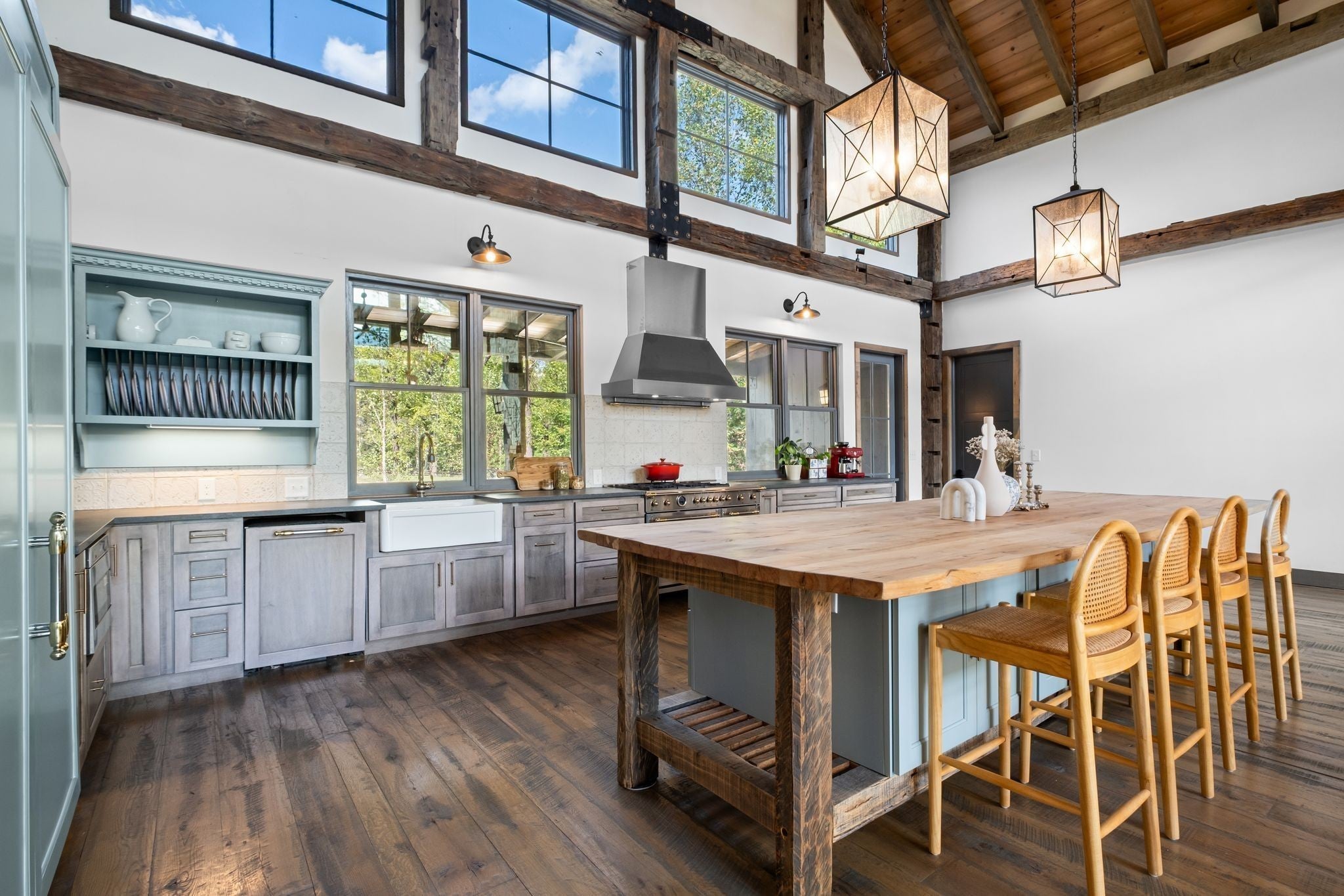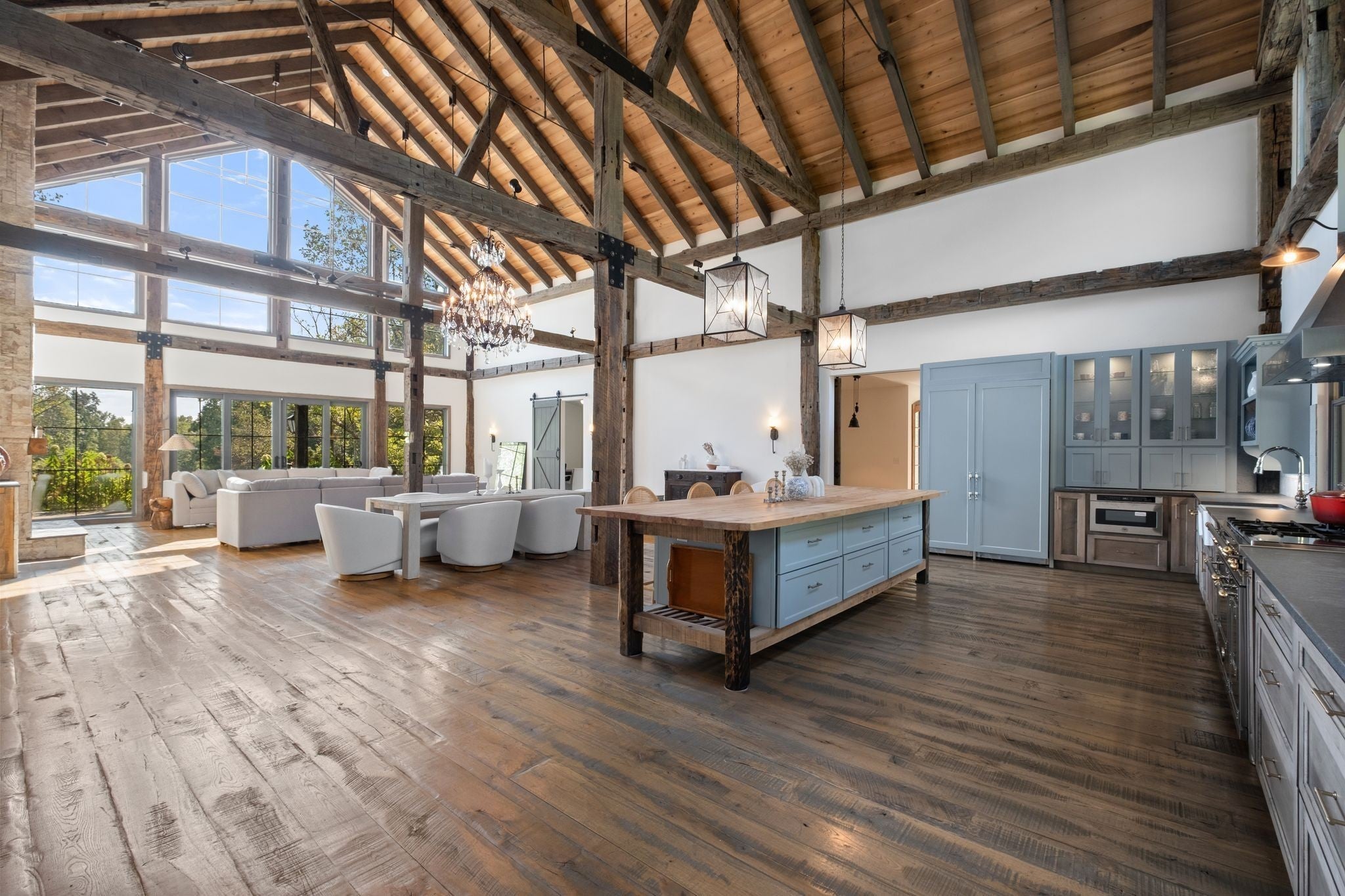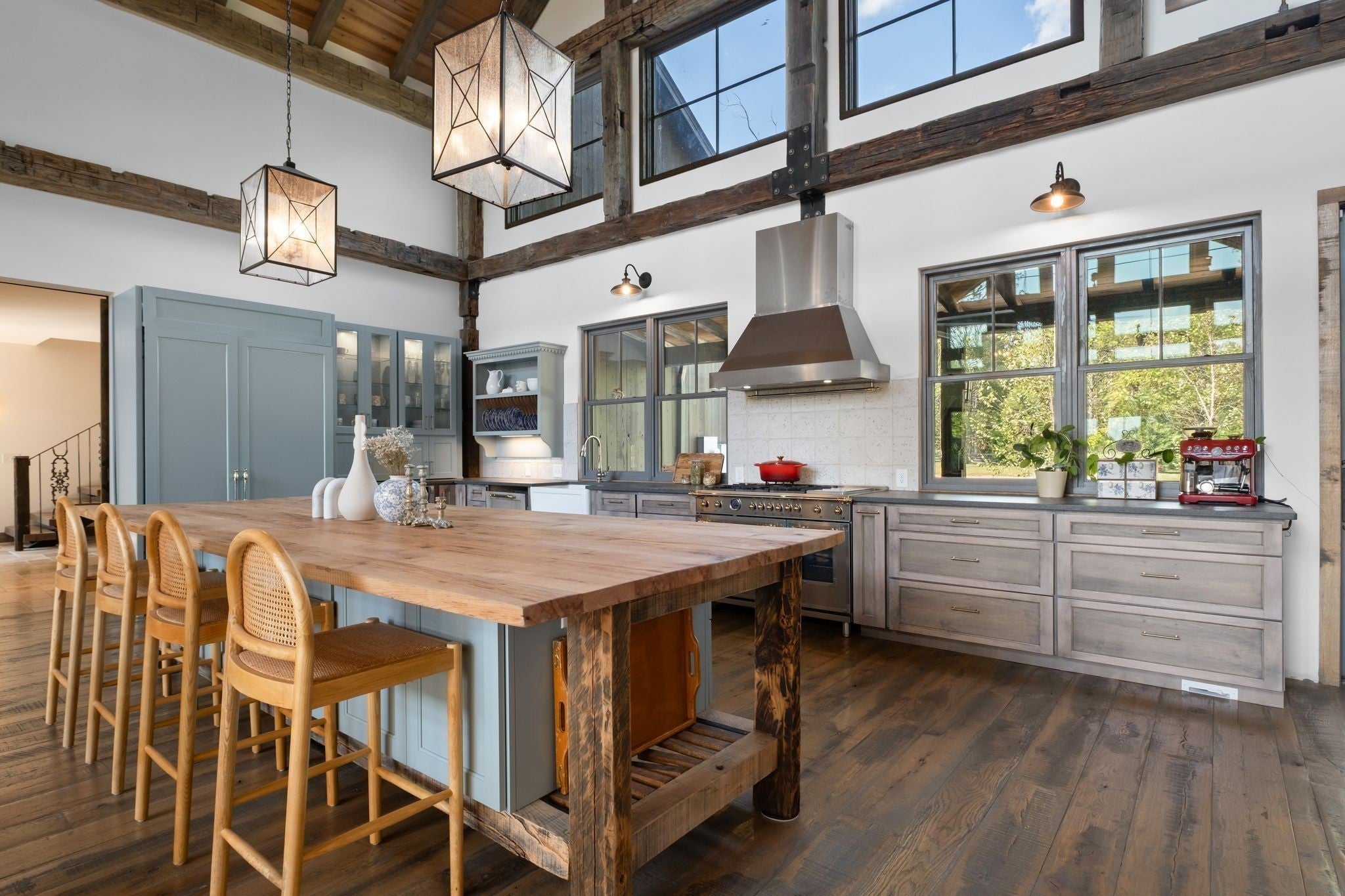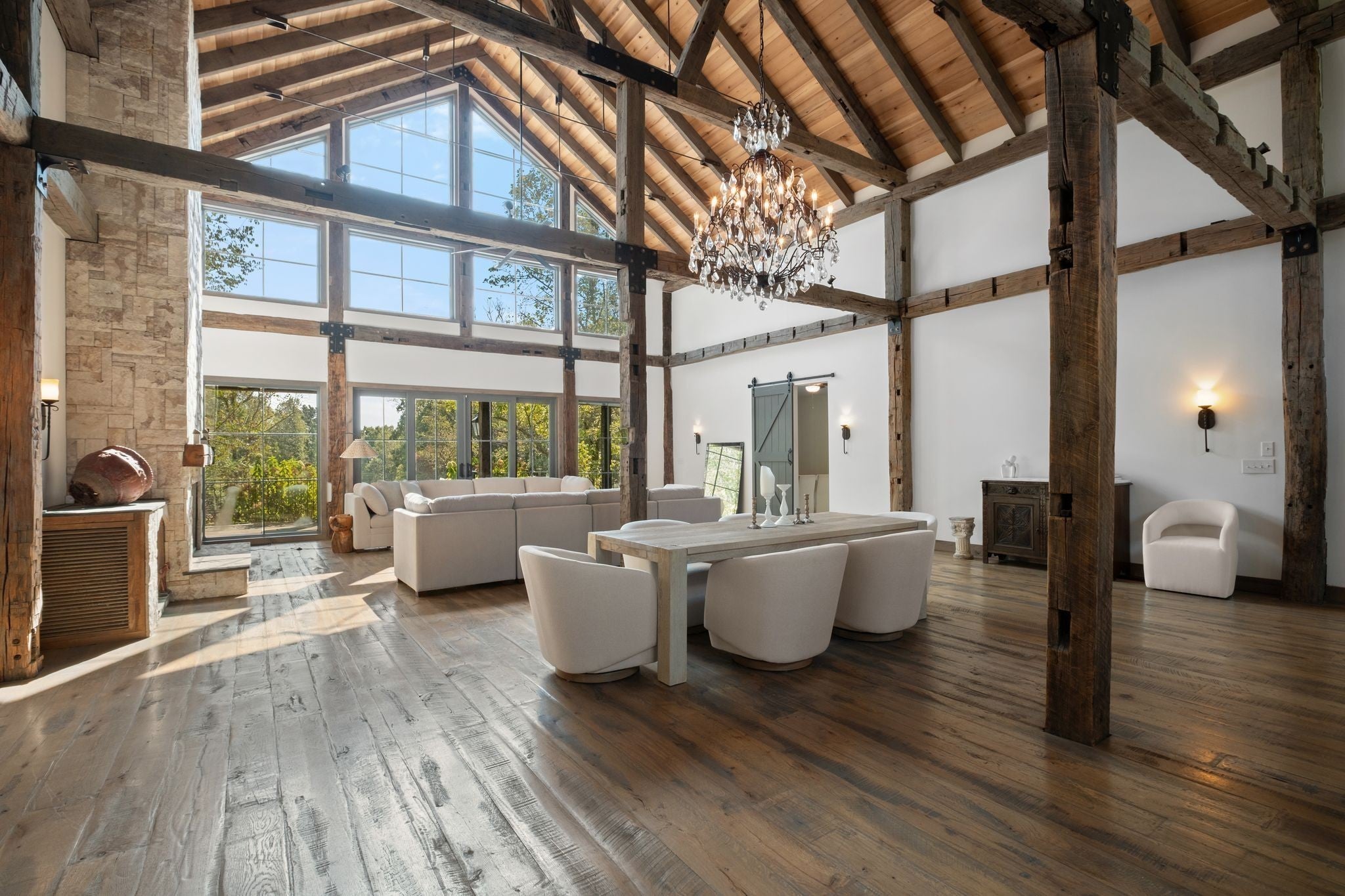 Thoughtfully priced below past appraisal. Here, on seven peaceful acres, this 5,371 square foot luxury home offers a place where comfort and elegance naturally meet the calm of nature. Inside, the great room rises with dramatic presence with 28 foot ceilings, 150 year old Montana timber beams, and sunlight spilling in from every angle. It is a space made for celebration and connection, yet equally perfect for quiet mornings beside the fire as the day slowly begins. The chef’s kitchen invites gathering, with Bertazzoni appliances, generous workspace, and an adjoining scullery that keeps hosting effortless when friends and family fill the home. Every element works together so you can enjoy being present in the moment. The main-level primary suite becomes a personal retreat framed by historic Indian teak doors. A spa style bath offers the perfect place to unwind, while a second bedroom nearby creates flexibility for guests or a dedicated office. Follow the graceful French Quarter inspired staircase to the upper level, where three additional bedrooms, including a secondary suite, provide comfort and privacy. A bright studio space offers endless possibility a creative haven, home gym, lounge, or an extra bedroom for the growing household. Outdoor living becomes part of everyday life here. Over 1,500 square feet of porches and terraces overlook gentle woods and soft evening skies. Enjoy morning coffee surrounded by nature or step into the swim spa under a blanket of stars this home encourages you to slow down and savor the setting. Every detail reflects thoughtful design and timeless style, making this residence a place that feels warm, refined, and unmistakably special. A home built for living well.
