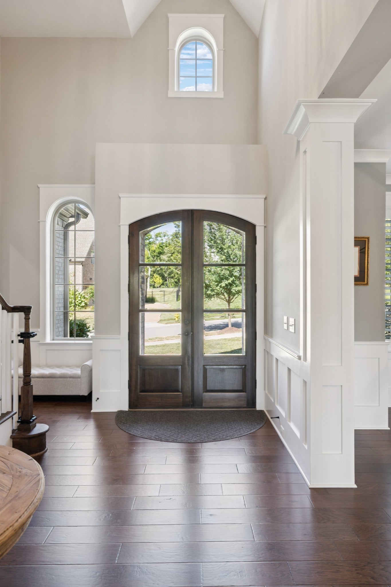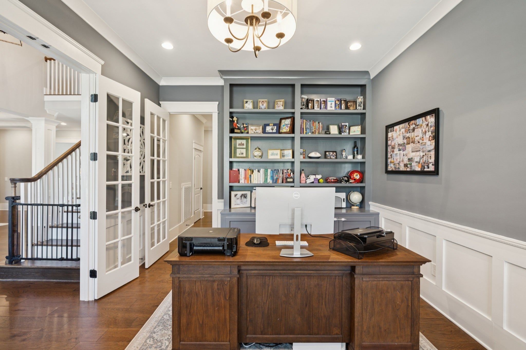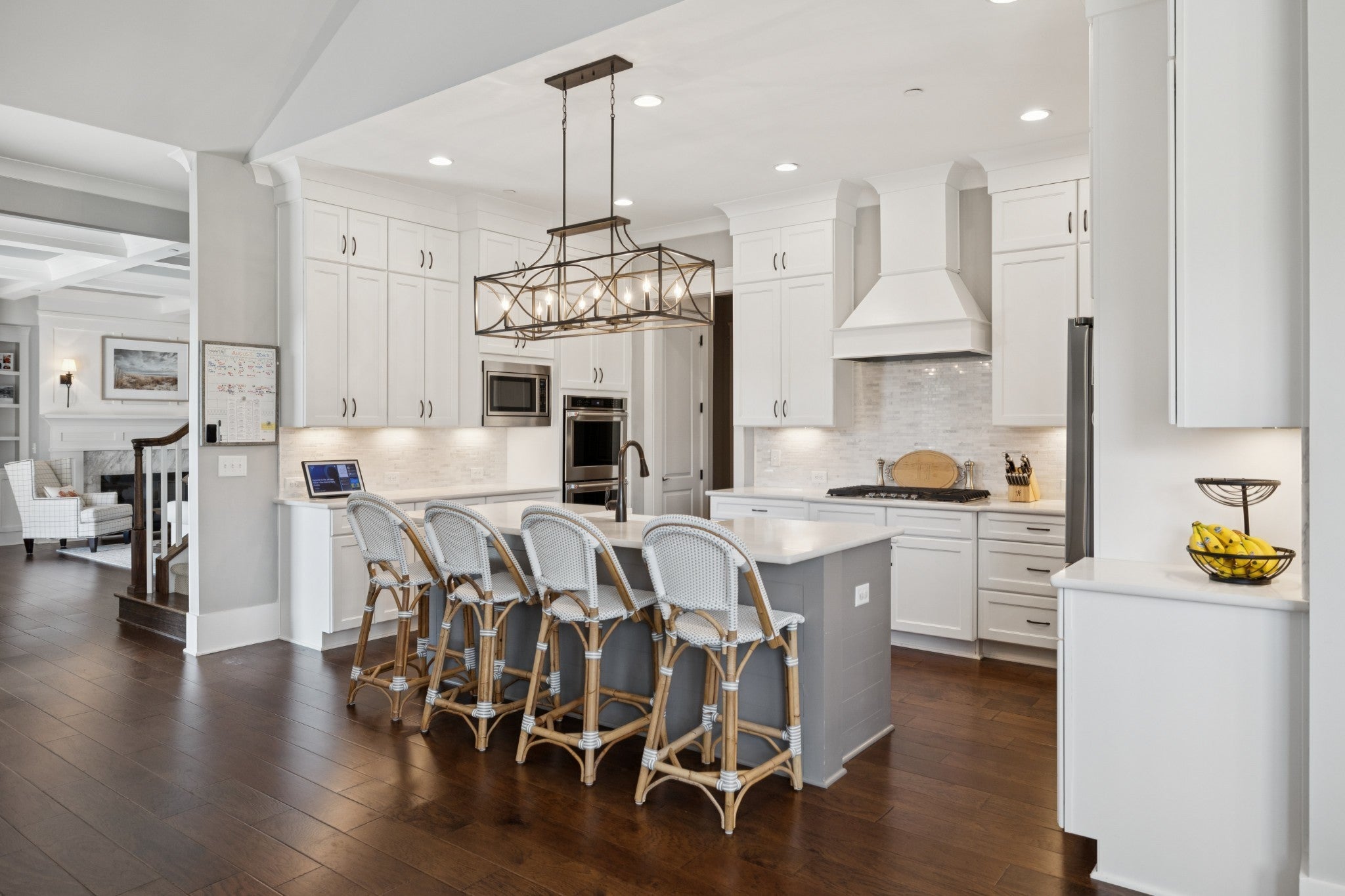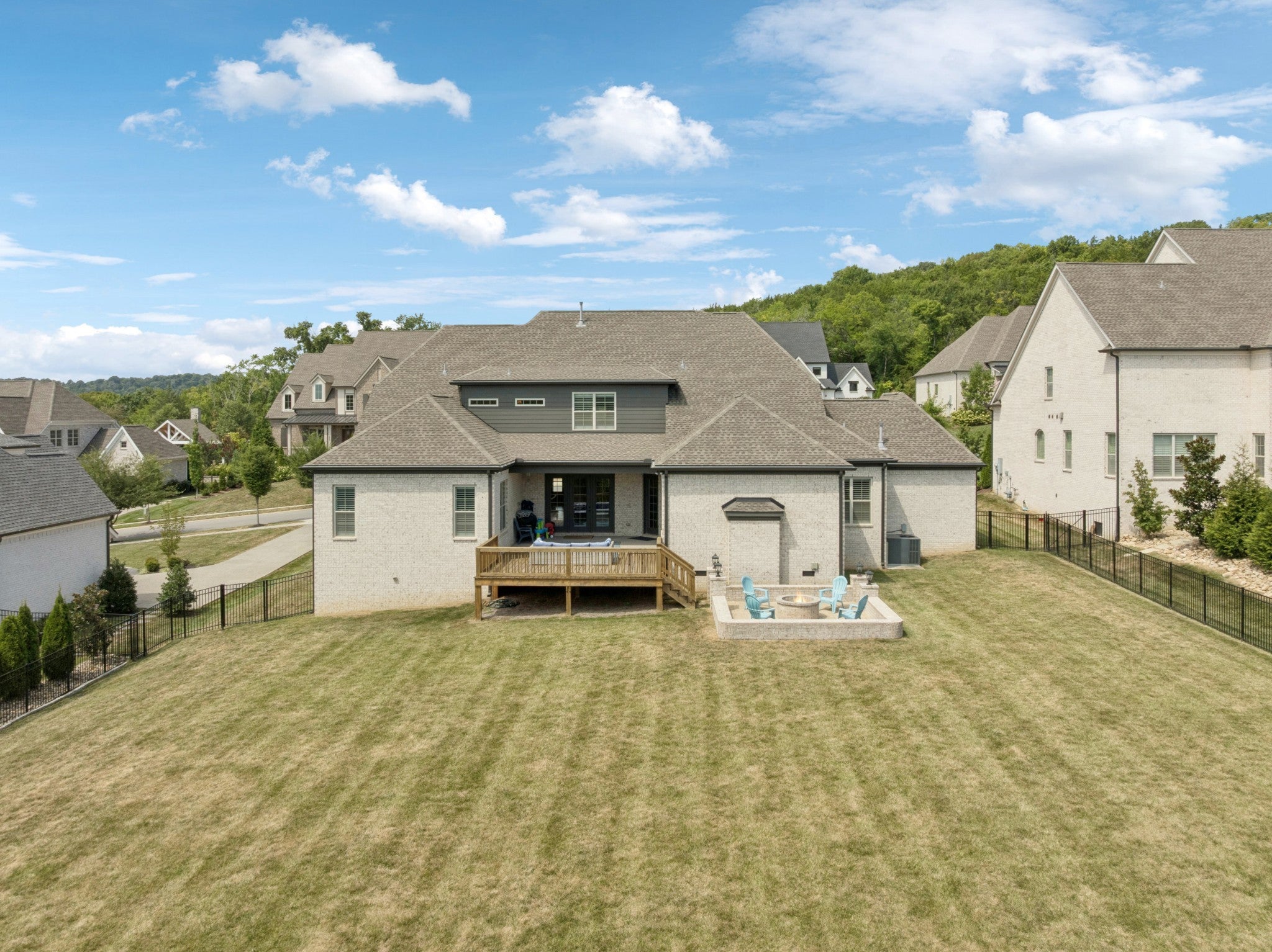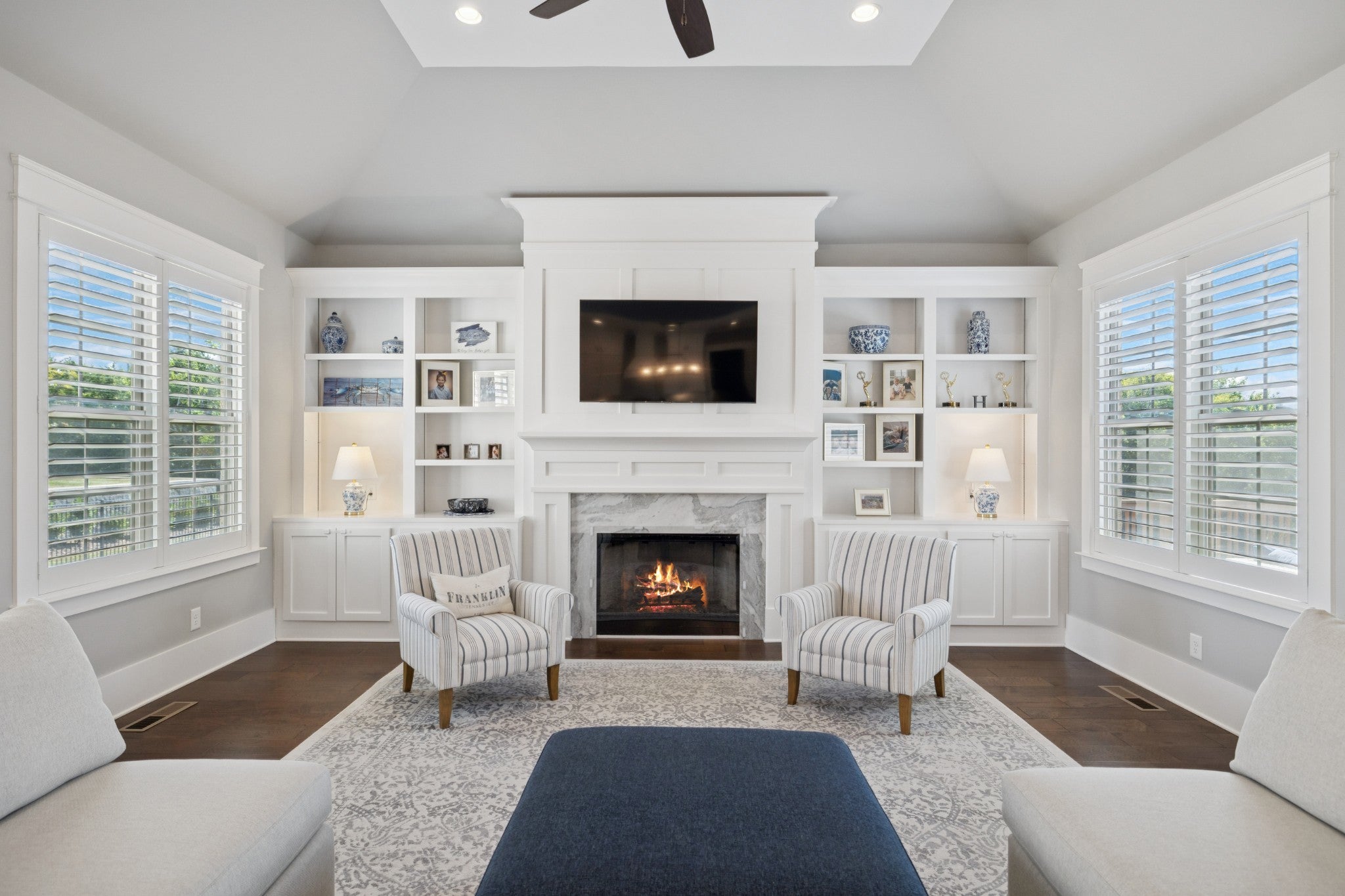 Welcome to Bishop’s Gate, a quaint and thoughtfully planned community of just 18 homesites in the heart of Williamson County, located less than two miles from historic downtown Franklin. Beyond the beautiful entrance, enjoy a true sense of community paired with easy access to top-rated restaurants, recreation, and shopping. From its stately brick exterior to its beautifully designed interiors, this home offers a seamless blend of elegance and everyday comfort. A grand entry welcomes you with soaring ceilings and refined architectural details, creating an immediate sense of warmth and sophistication. Just off the foyer, a private study with French doors and custom built-ins provides the perfect work-from-home retreat. The main living area is filled with natural light and anchored by a stunning marble fireplace, complemented by floor-to-ceiling built-ins that add both character and function. The kitchen serves as the heart of the home, featuring ceiling-height cabinetry, high-end appliances, a charming farm and under-cabinet lighting. A cozy breakfast nook and nearby dry bar with beverage cooler make entertaining both easy and inviting. Designed for convenience, the home includes a custom drop zone off the garage and a spacious laundry room with ample storage. The main-level primary suite offers a peaceful escape with a tray ceiling and a spa-inspired bath complete with a soaking tub, dual vanities, and a beautifully finished walk-in shower. Upstairs, each additional bedroom includes its own ensuite bath, while a generous bonus room provides flexible space for a media room, playroom, or fitness room. Outdoor living is just as inviting, with a partially covered deck overlooking the spacious backyard. A lower patio with a built-in fire pit creates the perfect setting for relaxing evenings or gathering with friends. Timeless in design and effortless in livability, this is a home that perfectly balances classic style, modern comfort, and an unbeatable location.