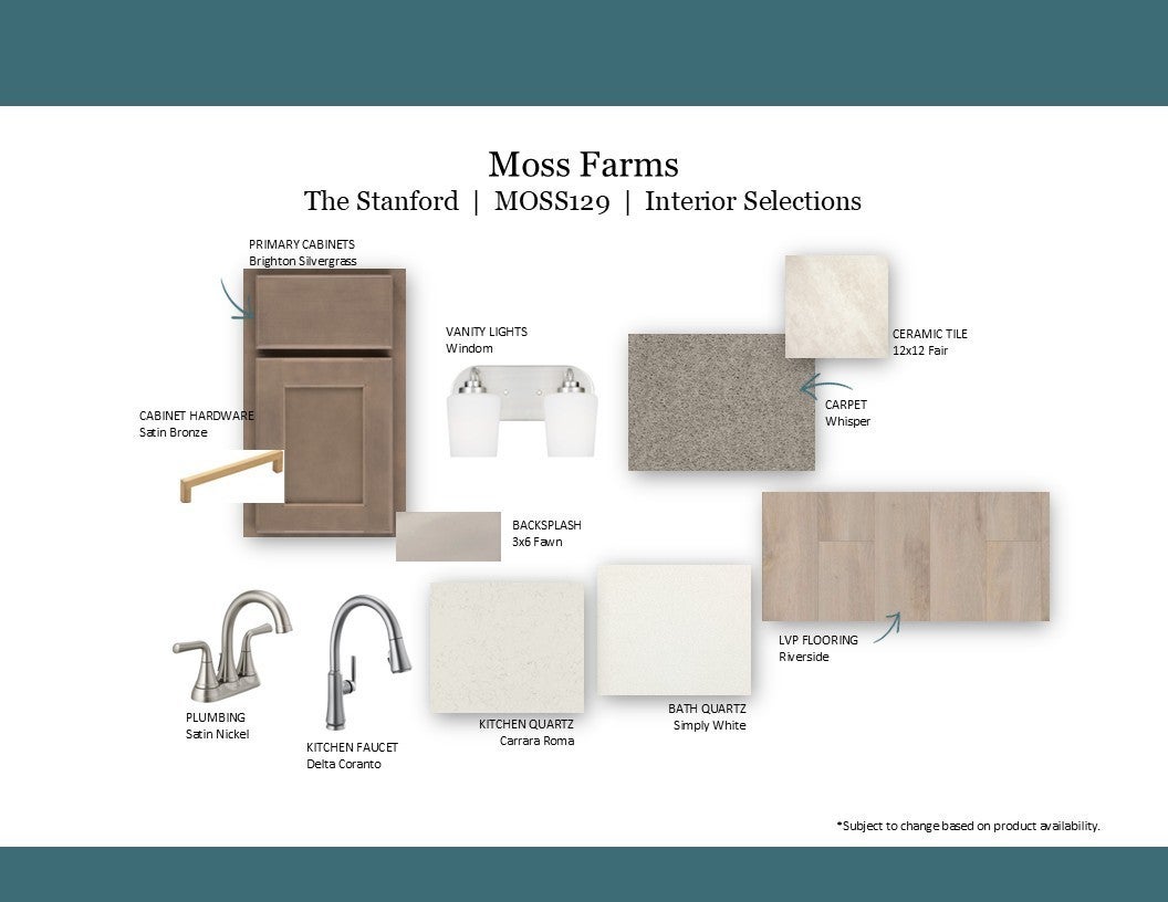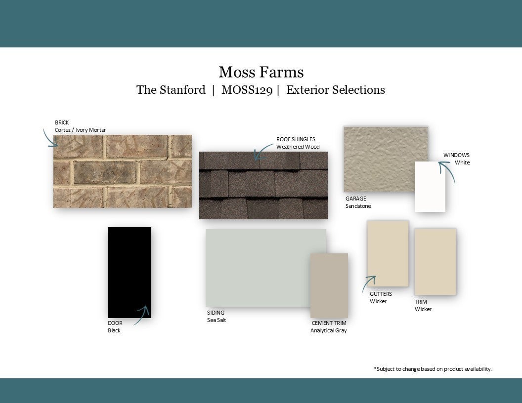 Welcome to the NEW beautiful Moss Farm community located in the quaint White House, TN. This is Goodall Home's newest neighborhood and this is the brand-new two-level Stanford floorplan with 3 bedrooms and 2.5 bathrooms, with the Owner's suite on the second floor with a 7' oversized a tile shower in the Owner's bath. Enjoy entertaining in this open concept home with lots of countertop space in the kitchen, a walk in pantry, and a large great room. This home also features a study with french glass doors on the first floor, luxury vinyl plank flooring through the main level living, quartz countertops in the kitchen and bathrooms, ceramic tile in wet areas, and so much more! For a limited time only take advantage of $15,000 in Closing Costs when using the preferred lender Silverton Mortgage and title company. Terms and conditions apply.