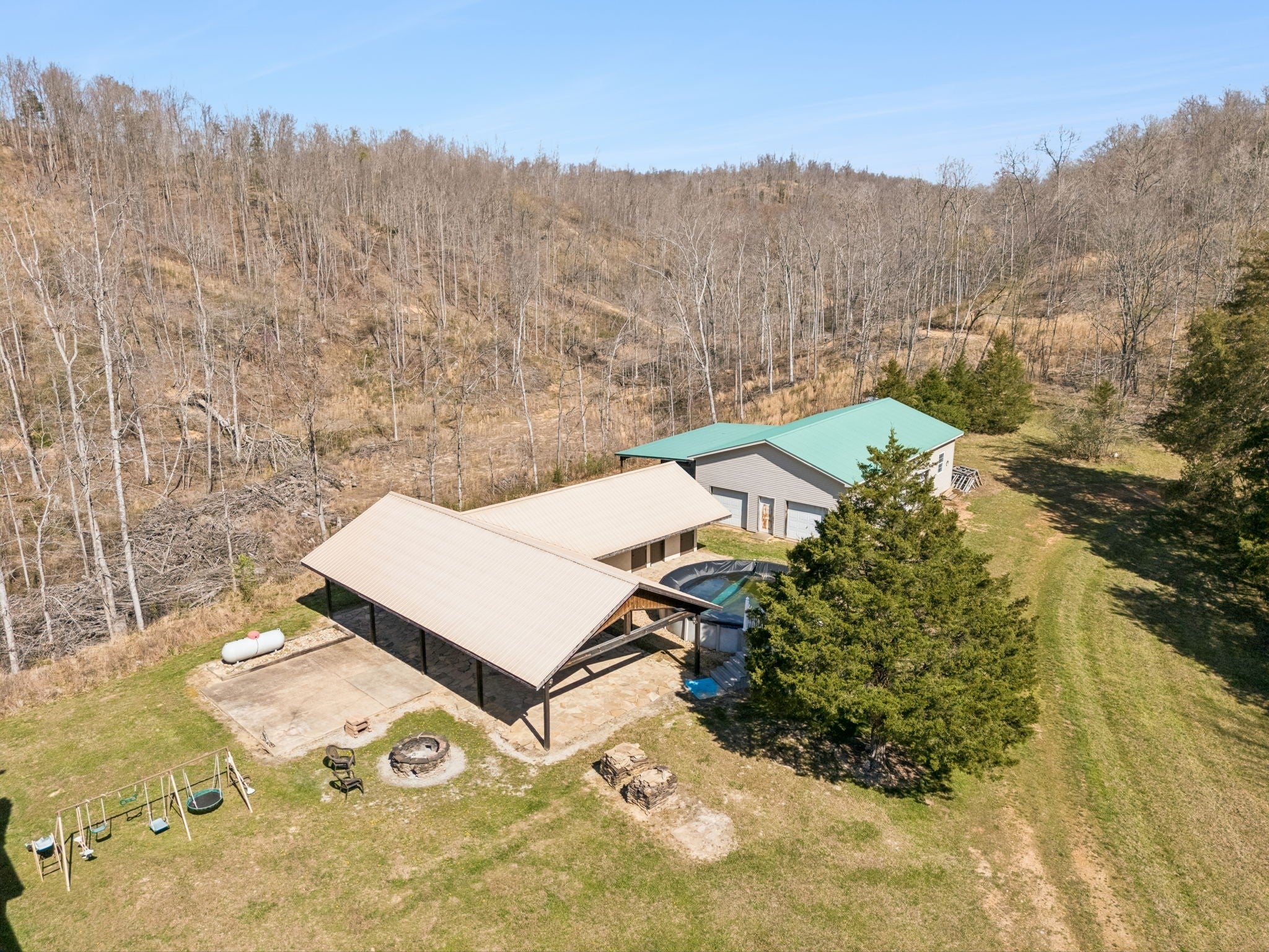 * First 3 photos are AI Concept photos to show the potential of the look of this home. Discover a rare 112-acre private retreat featuring a serene creek, breathtaking views, and abundant wildlife, offering unmatched privacy and versatility in a peaceful, highly desirable location. The main home boasts 5 spacious bedrooms, 3 full baths, and a split floor plan designed for comfort and flow, complete with a cozy fireplace for relaxing evenings, a balcony off the master bedroom, and a deck overlooking the expansive grounds. The gourmet kitchen showcases white cabinetry, recessed lighting, and stainless steel appliances, while a dedicated canning room and attached 1-car garage add practical functionality. Expanding the possibilities, a 1,200 sq. ft. guest building features a full kitchen with two stoves, bedroom, two baths, and a convenient shower room connected to the pool area, perfect for entertaining or private accommodations. Outdoor living is elevated with a large pavilion equipped with built-in speakers, ideal for gatherings, social events, or peaceful relaxation. A detached shop provides ample space for hobbies, storage, or projects, and the three-year-old pool adds another layer of enjoyment. This property offers exceptional hunting land, potential additional build sites for a dream home, and endless opportunities for entertainment and outdoor activities. Don’t miss the chance to own a one-of-a-kind estate that combines luxury, function, and natural beauty - schedule your private showing!