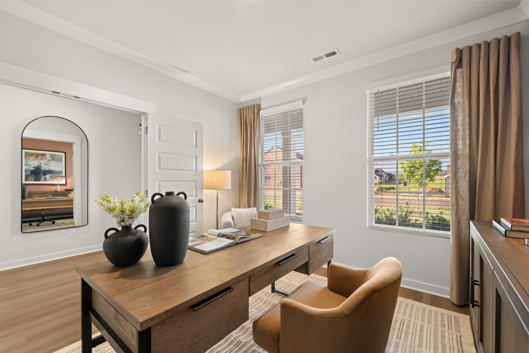 The first floor of this two-story home shares an open layout between the kitchen, nook and family room for easy entertaining and access to the patio for outdoor lounging. A more formal dining room is at the front of the home for dinner parties and a study to work from home. Two bedrooms are on the first floor, including a luxe owner's suite and a secondary bedroom, ideal for overnight guests. Upstairs are three secondary bedrooms, a versatile game room and a media room for added living space. *Images from a furnished model of this home. Actual configuration and features may vary.