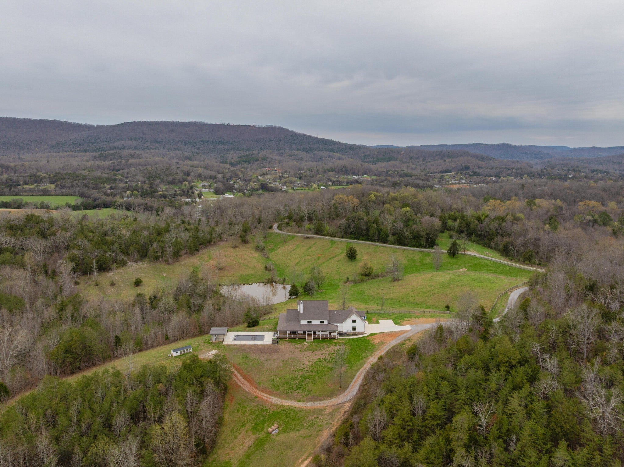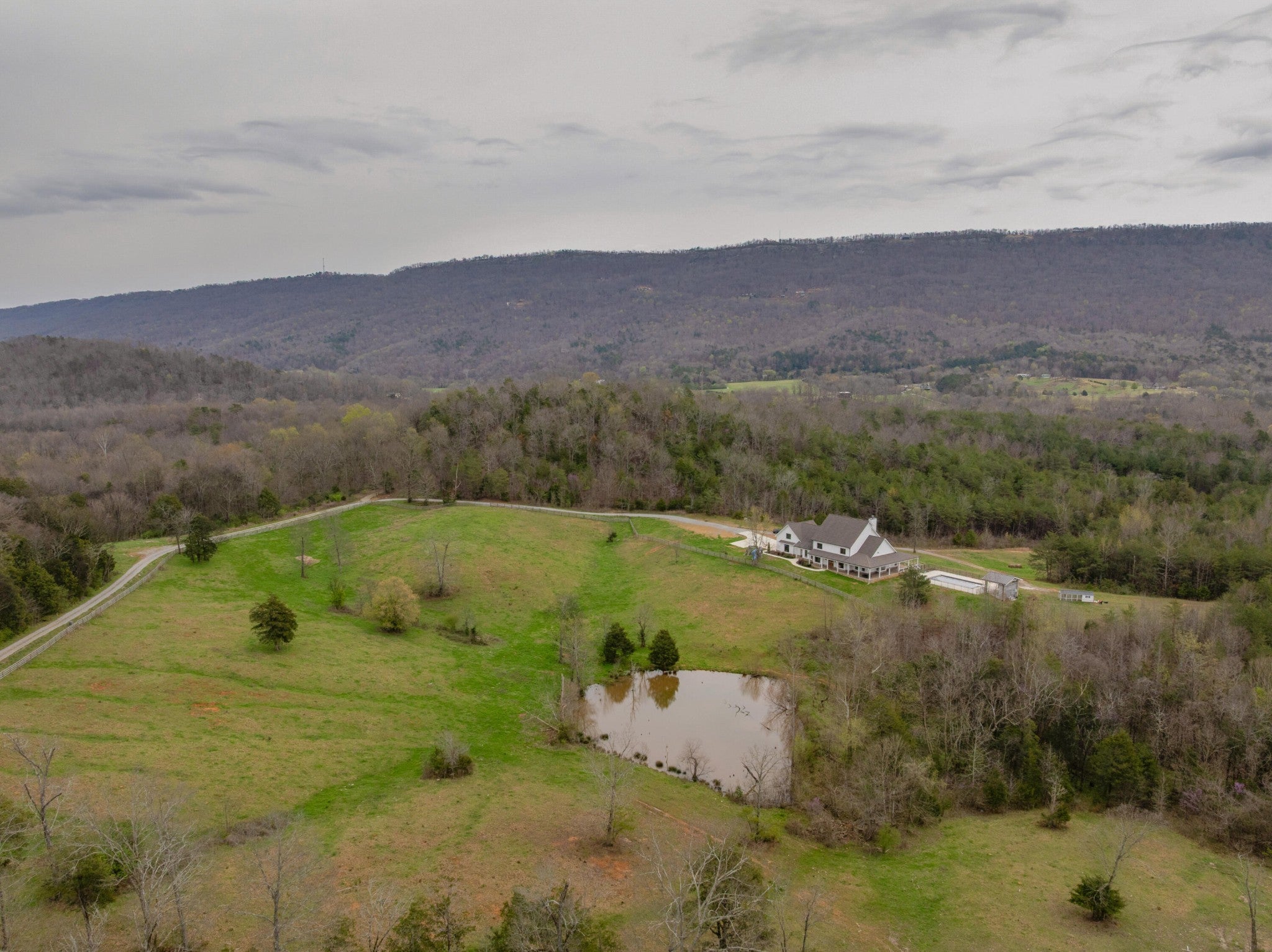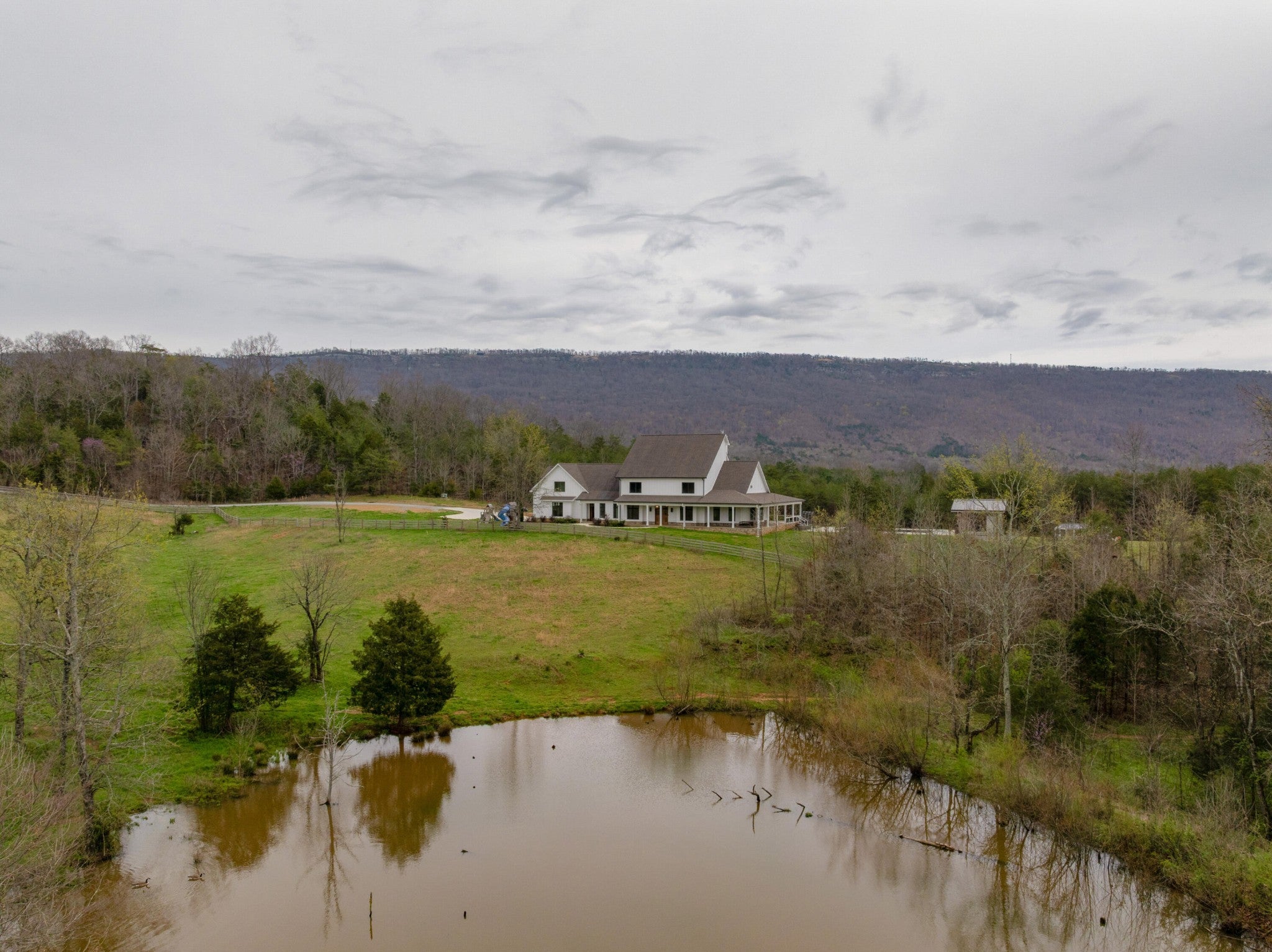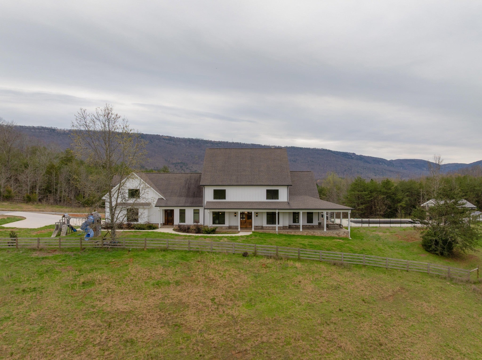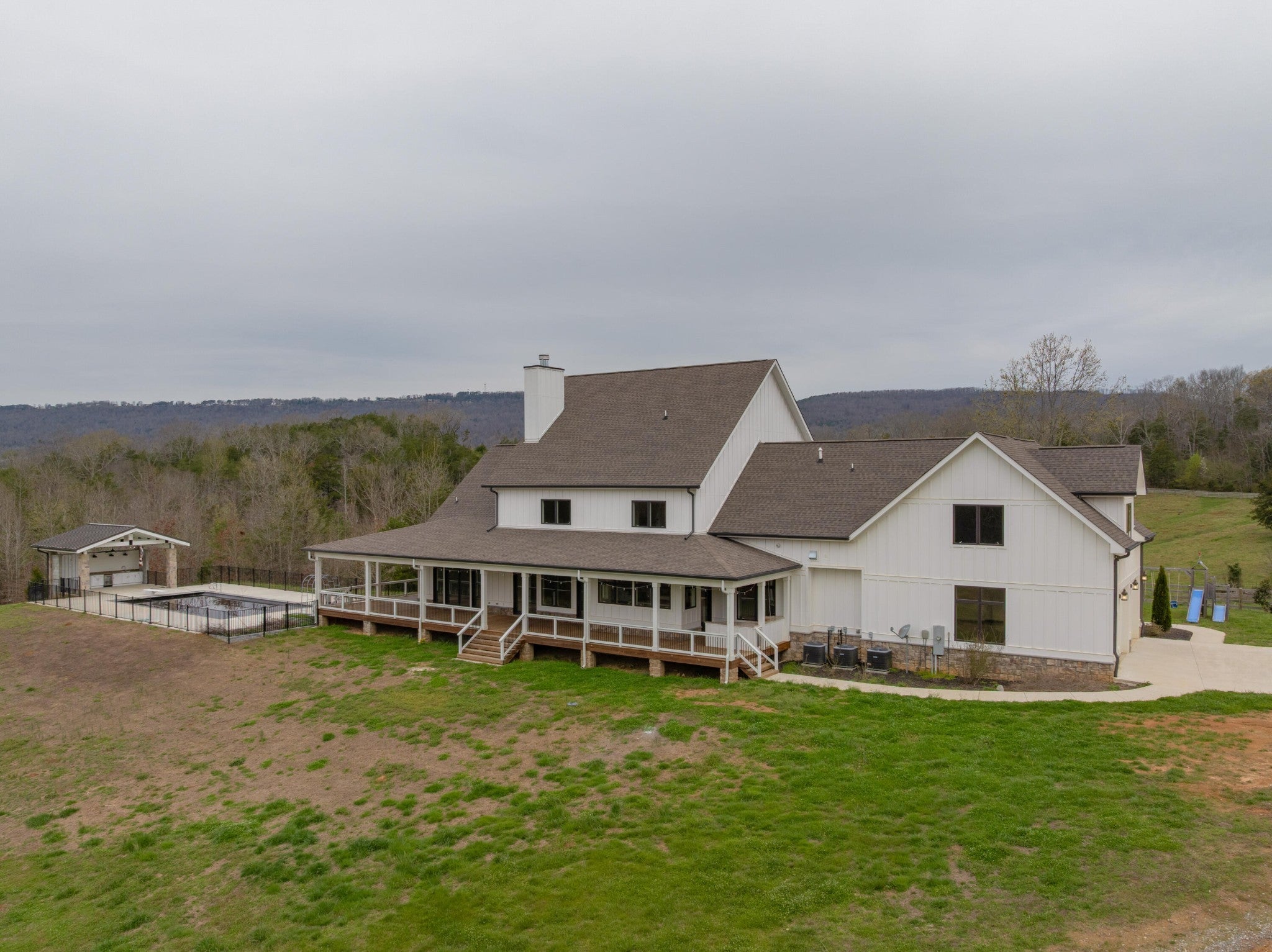 Gentleman's Farm in Wildwood, GA approximately 25 minutes from downtown Chattanooga. This gorgeous property features a custom-built modern farmhouse with a gunite pool overlooking a pond and privately positioned on 178 +/- mostly wooded acres with creeks, trails and wildlife right out your front door. This 4 or 5 bedroom, 5.5 bath home has a versatile floor plan and was well designed not only for gathering and entertaining but also to take advantage of this gorgeous setting. The home exudes exterior appeal with its Hardie and brick, and wrap-around covered porches. Inside, you will be equally delighted to find that it has just been freshly painted and boasts engineered hardwoods and tile throughout, crown moldings, spacious rooms, an open floor plan, formal and informal living spaces, 2 bedroom suites on the main, including the primary, an oversized 2-bay garage, and a separate bonus or bedroom over the garage with a private bath and 2 large closets. Your tour begins with the inviting foyer that has French doors to the office or living room on the right and opens to the dining room on the left. The heart of the home is the gourmet kitchen that has a built-in breakfast area and is open to the great room with a stacked stone fireplace and French doors to the rear covered porch. The kitchen has a center island, granite countertops, tile backsplash, custom cabinetry, under-cabinet lighting, high-end stainless appliances and access to the butler's pantry with a sink, ice maker and a walk-in pantry. The hallway to the garage has a convenient powder room, a guest bedroom with a private bath, a laundry room and a separate mudroom with built-in bench and cubbies, tons of counterspace and cabinetry and a stainless utility sink. The primary suite is on the opposite side of the house and boasts French doors to the rear covered porch, a large walk-in closet with a 2nd set of washer and dryer hook-ups and a luxurious primary bath with separate vanities, a free- standing tub, a se