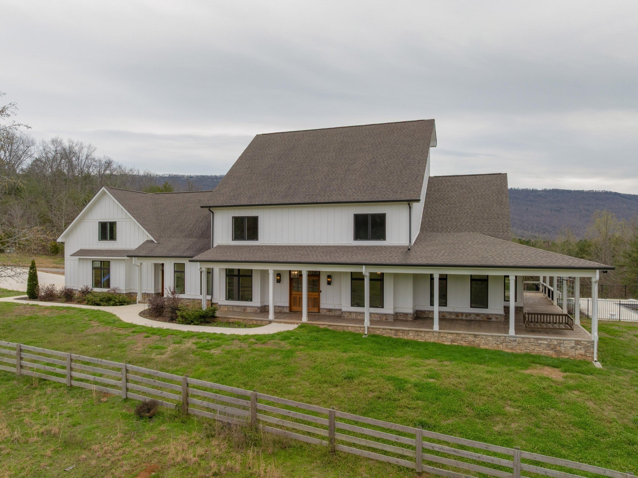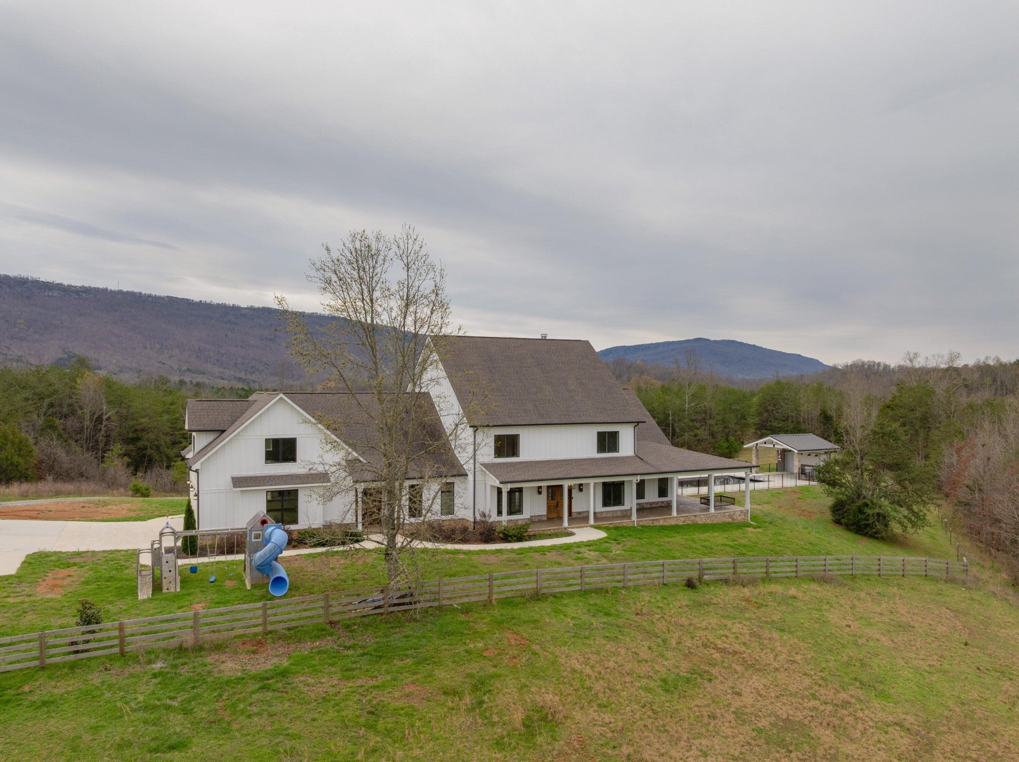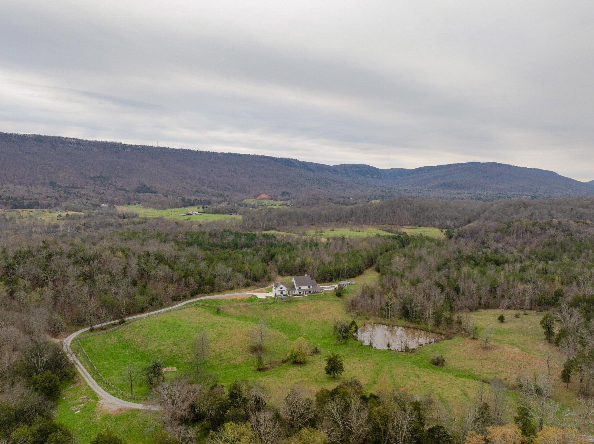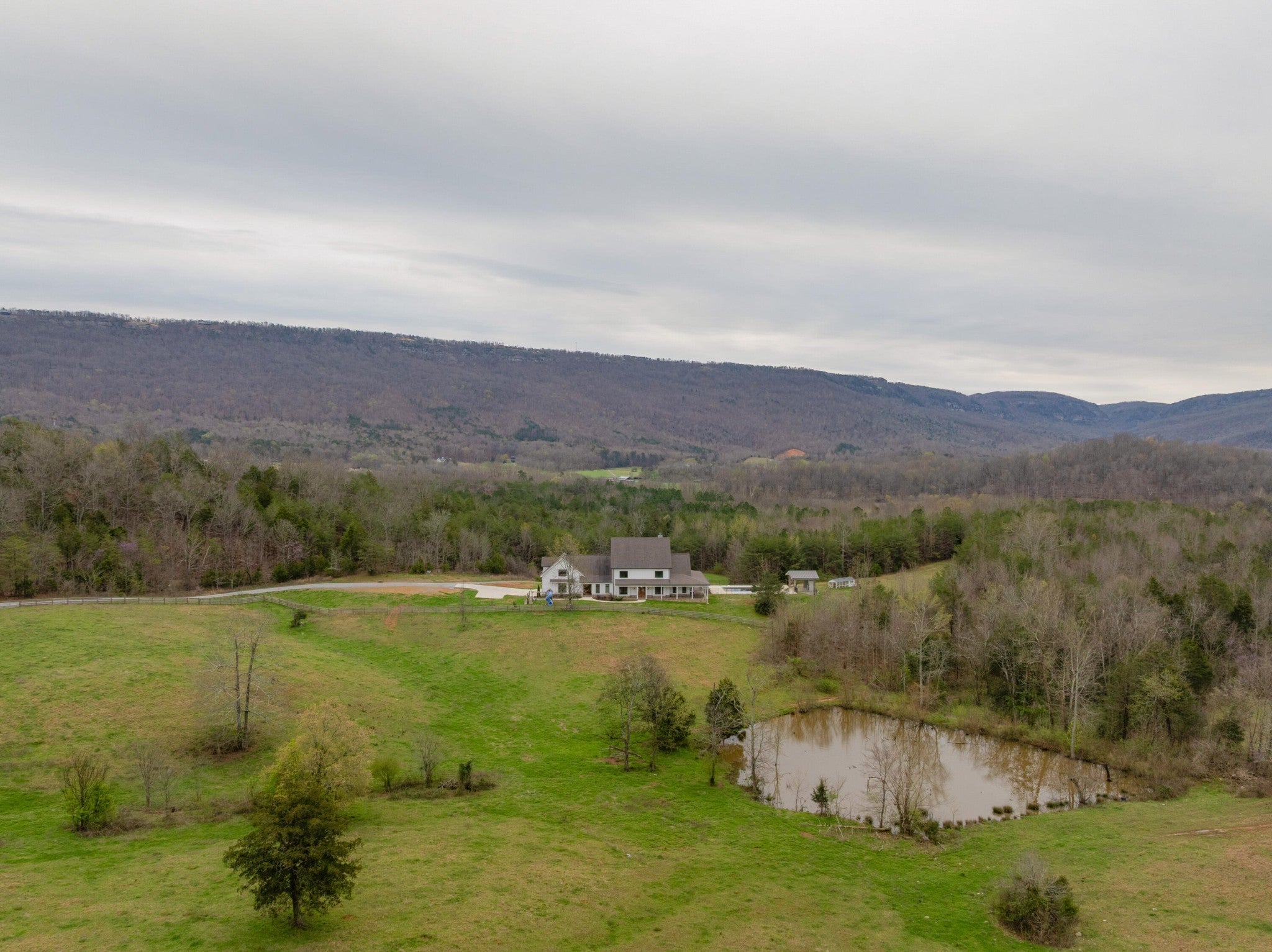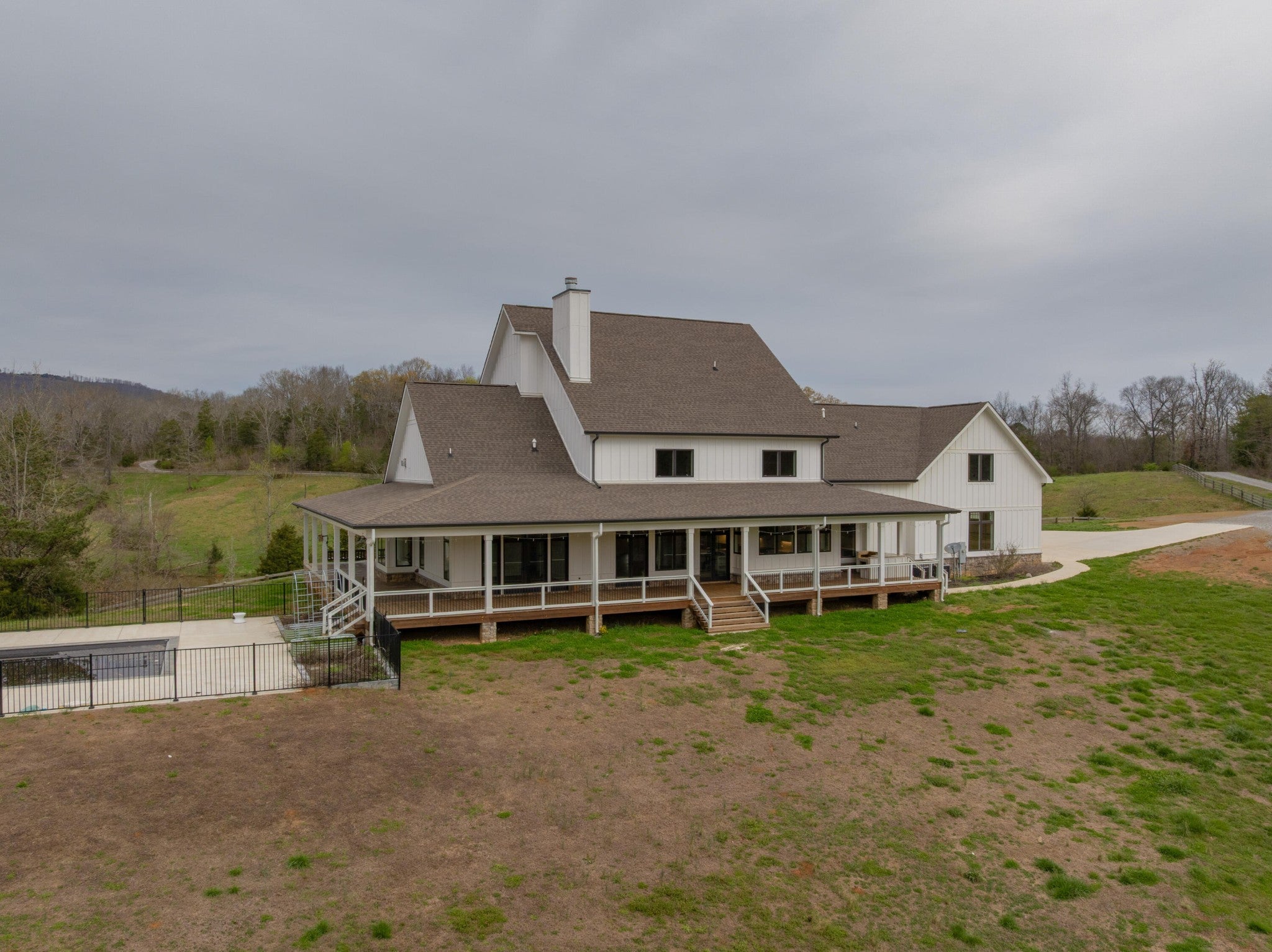 Gentleman's Farm in Wildwood, GA approximately 25 minutes from downtown Chattanooga. This gorgeous property features a custom-built modern farmhouse with a gunite pool overlooking a pond and privately positioned on 178 +/- mostly wooded acres with creeks, trails and wildlife right out your front door. This 4 or 5 bedroom, 5.5 bath home has a versatile floor plan and was well designed not only for gathering and entertaining but also to take advantage of this gorgeous setting. The home exudes exterior appeal with its Hardie and brick, and wrap-around covered porches. Inside, you will be equally delighted to find that it has just been freshly painted and boasts engineered hardwoods and tile throughout, crown moldings, spacious rooms, an open floor plan, formal and informal living spaces, 2 bedroom suites on the main, including the primary, an oversized 2-bay garage, and a separate bonus or bedroom over the garage with a private bath and 2 large closets. Your tour begins with the inviting foyer that has French doors to the office or living room on the right and opens to the dining room on the left. The heart of the home is the gourmet kitchen that has a built-in breakfast area and is open to the great room with a stacked stone fireplace and French doors to the rear covered porch. The kitchen has a center island, granite countertops, tile backsplash, custom cabinetry, under-cabinet lighting, high-end stainless appliances and access to the butler's pantry with a sink, ice maker and a walk-in pantry. The hallway to the garage has a convenient powder room, a guest bedroom with a private bath, a laundry room and a separate mudroom with built-in bench and cubbies, tons of counterspace and cabinetry and a stainless utility sink. The primary suite is on the opposite side of the house and boasts French doors to the rear covered porch, a large walk-in closet with a 2nd set of washer and dryer hook-ups and a luxurious primary bath with separate vanities, a free- standing tub, a se