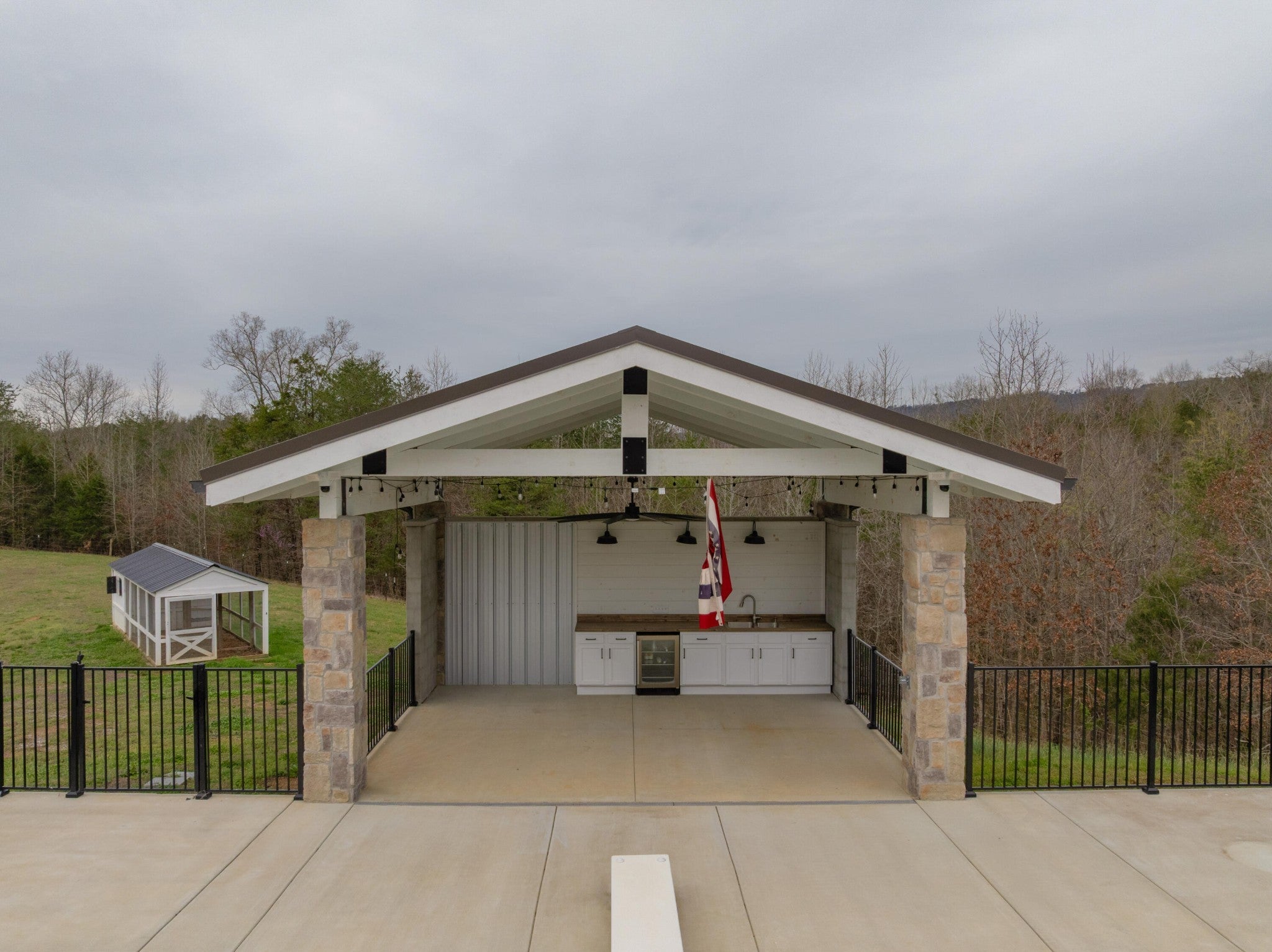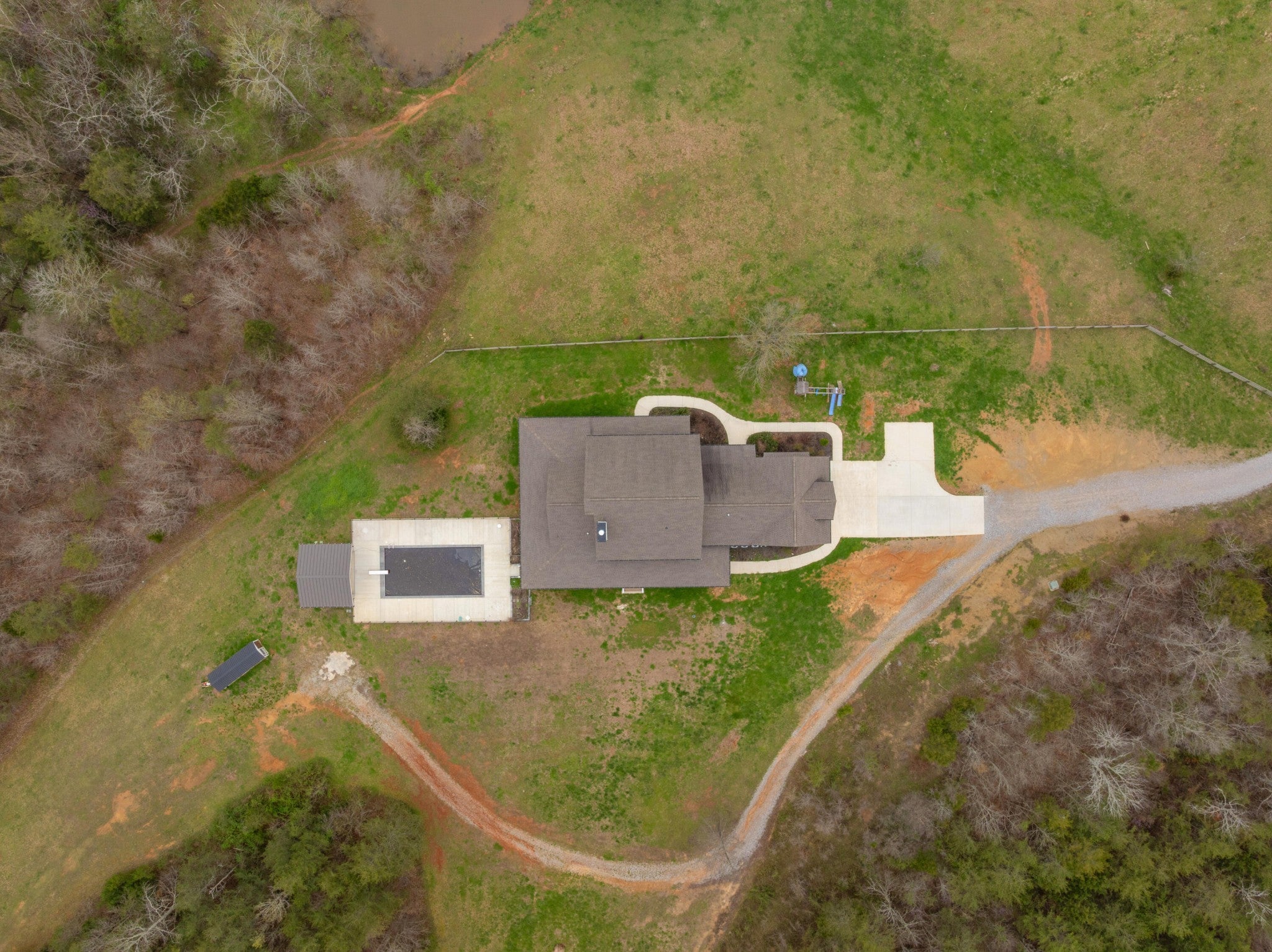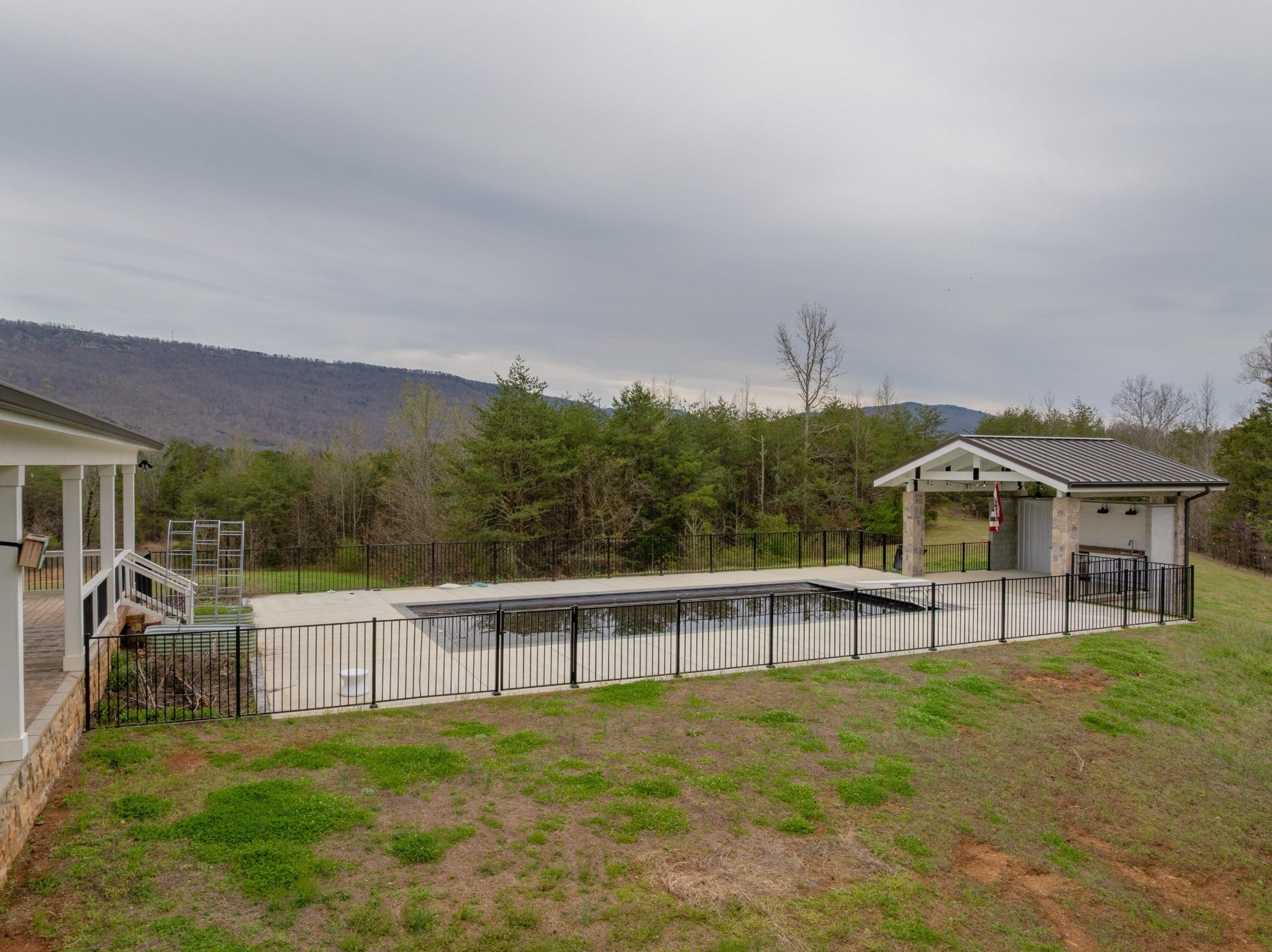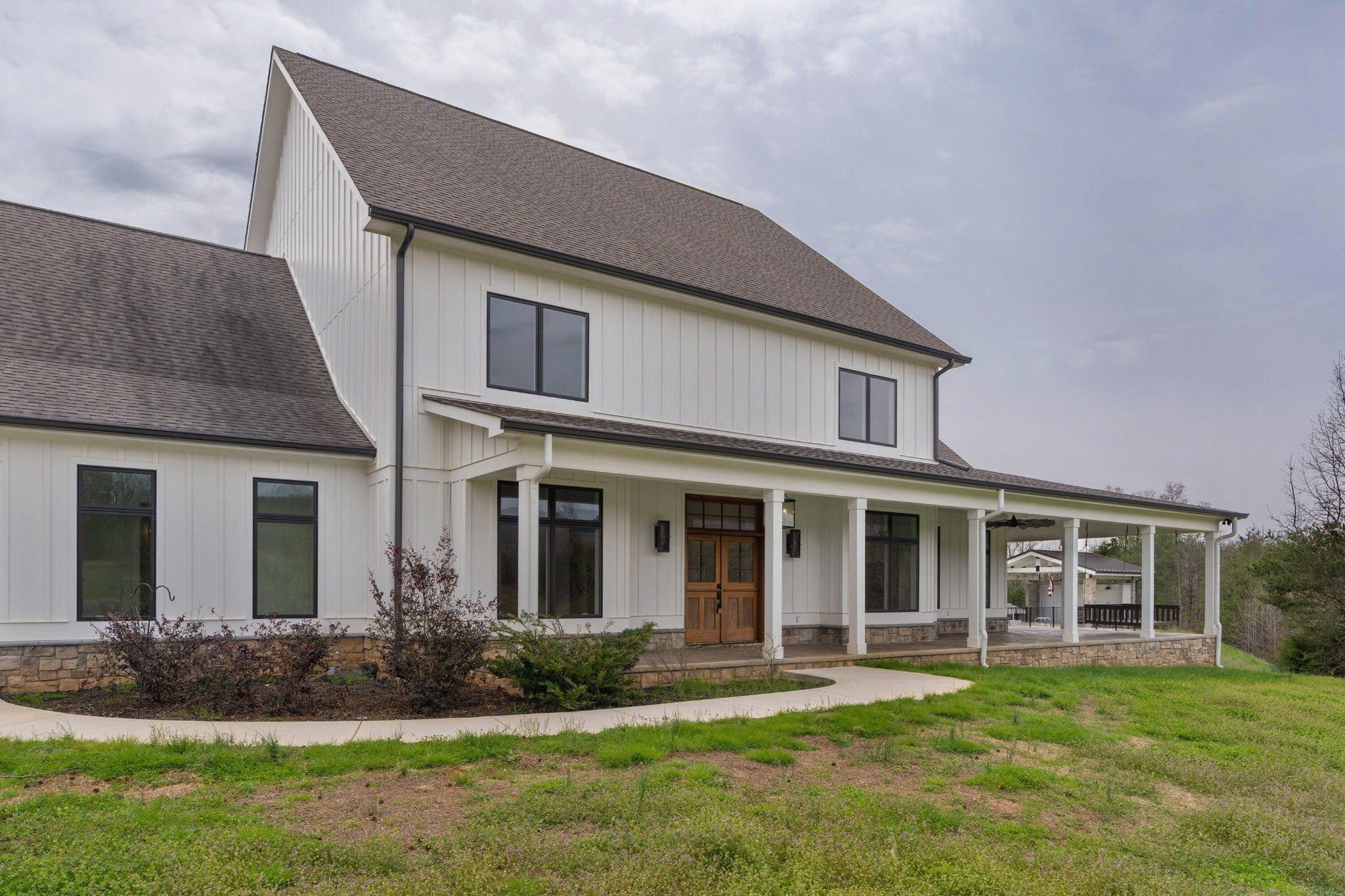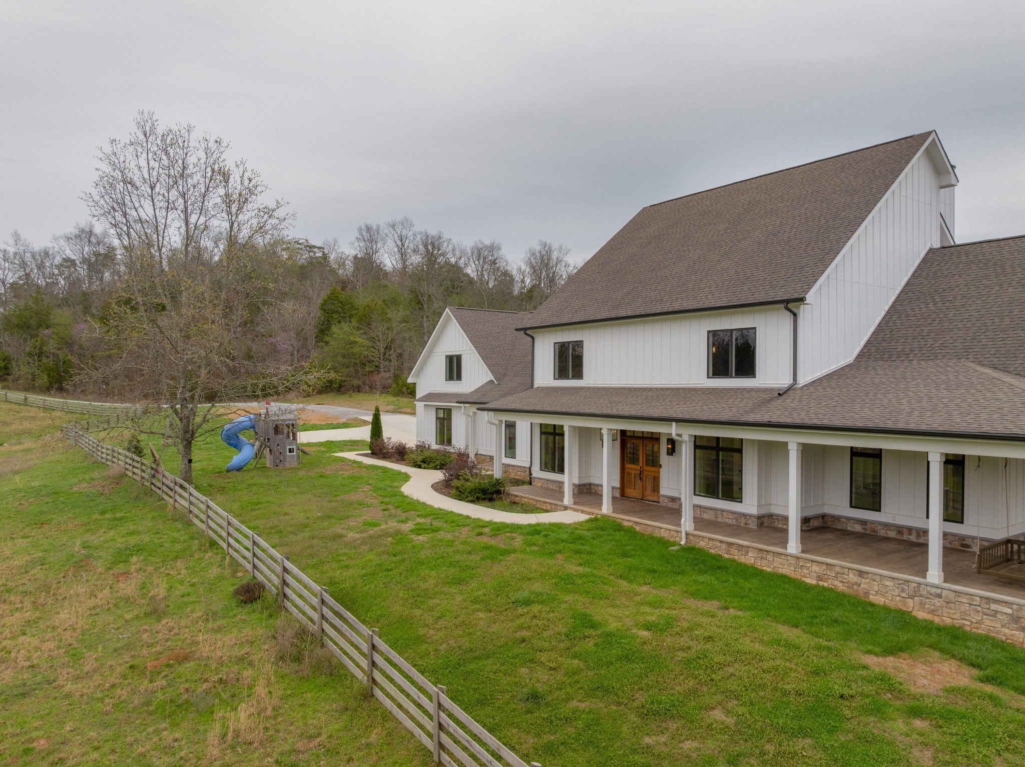 Gentleman's Farm in Wildwood, GA approximately 25 minutes from downtown Chattanooga. This gorgeous property features a custom-built modern farmhouse with a gunite pool overlooking a pond and privately positioned on 178 +/- mostly wooded acres with creeks, trails and wildlife right out your front door. This 4 or 5 bedroom, 5.5 bath home has a versatile floor plan and was well designed not only for gathering and entertaining but also to take advantage of this gorgeous setting. The home exudes exterior appeal with its Hardie and brick, and wrap-around covered porches. Inside, you will be equally delighted to find that it has just been freshly painted and boasts engineered hardwoods and tile throughout, crown moldings, spacious rooms, an open floor plan, formal and informal living spaces, 2 bedroom suites on the main, including the primary, an oversized 2-bay garage, and a separate bonus or bedroom over the garage with a private bath and 2 large closets. Your tour begins with the inviting foyer that has French doors to the office or living room on the right and opens to the dining room on the left. The heart of the home is the gourmet kitchen that has a built-in breakfast area and is open to the great room with a stacked stone fireplace and French doors to the rear covered porch. The kitchen has a center island, granite countertops, tile backsplash, custom cabinetry, under-cabinet lighting, high-end stainless appliances and access to the butler's pantry with a sink, ice maker and a walk-in pantry. The hallway to the garage has a convenient powder room, a guest bedroom with a private bath, a laundry room and a separate mudroom with built-in bench and cubbies, tons of counterspace and cabinetry and a stainless utility sink. The primary suite is on the opposite side of the house and boasts French doors to the rear covered porch, a large walk-in closet with a 2nd set of washer and dryer hook-ups and a luxurious primary bath with separate vanities, a free- standing tub, a se
