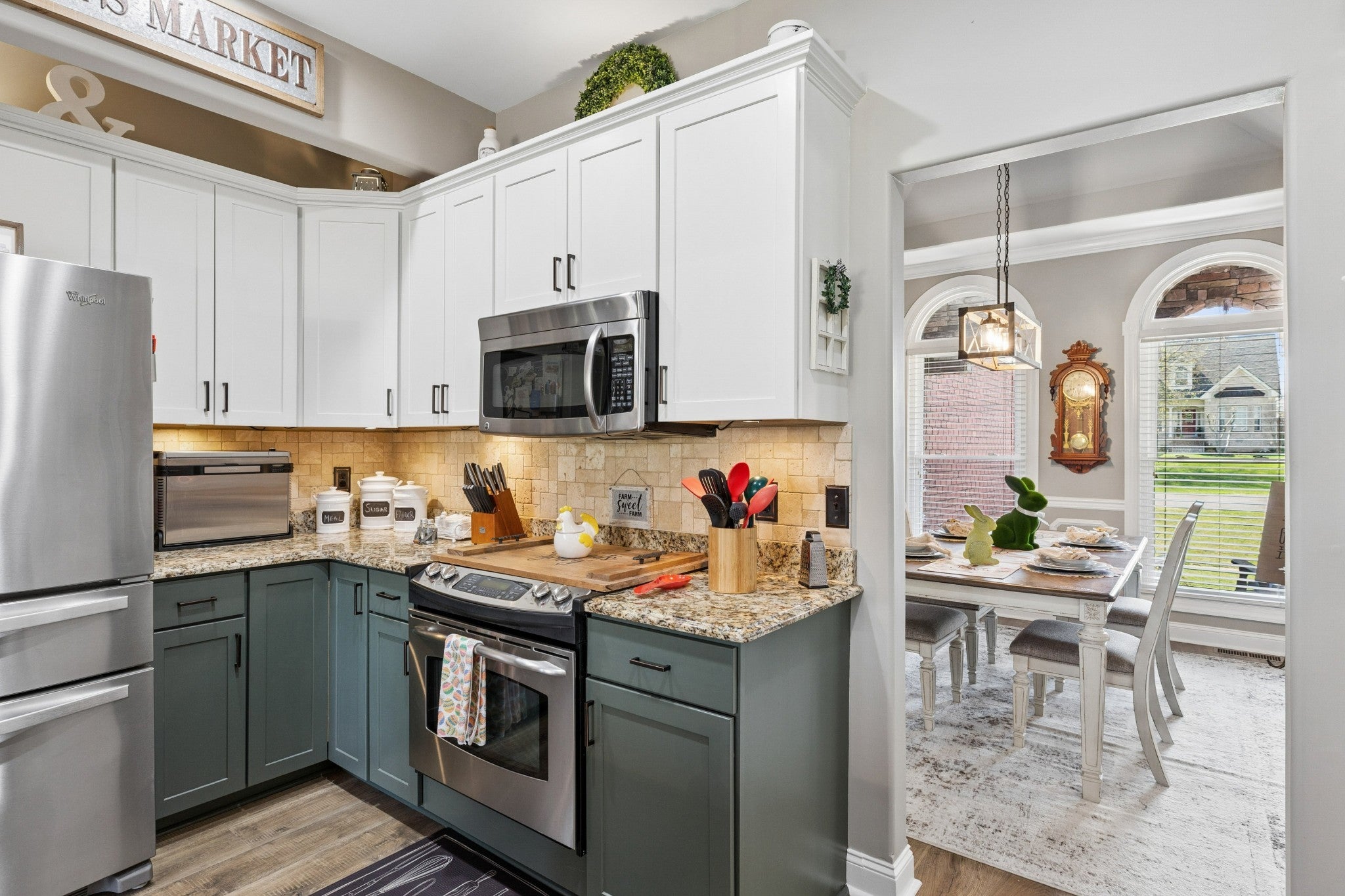 - Built-In Electric Oven, Built-In Electric Range, Dishwasher, Disposal, Microwave, Refrigerator, Stainless Steel Appliance(s)