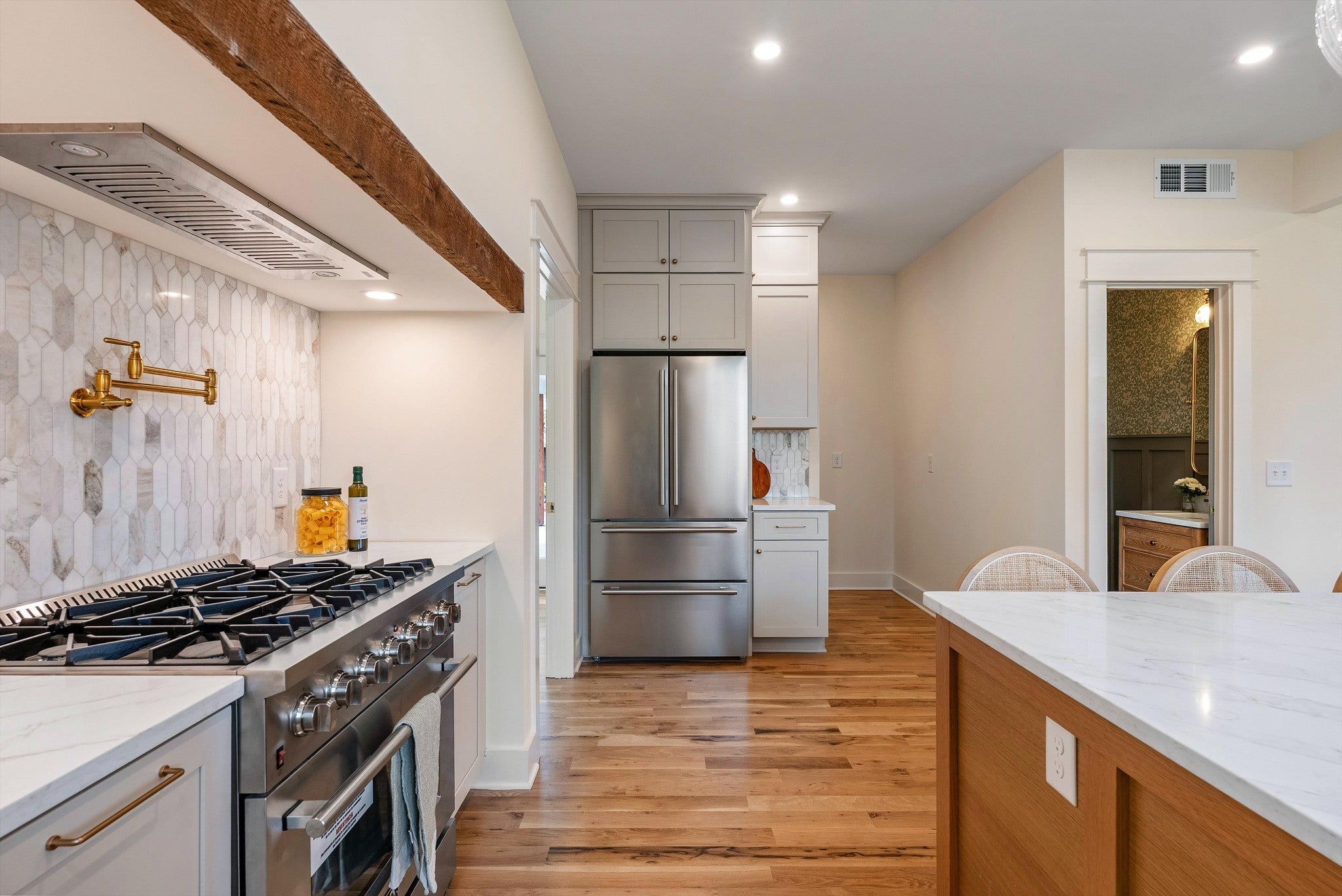 - Gas Range, Dishwasher, Disposal, Microwave, Refrigerator, Stainless Steel Appliance(s)
