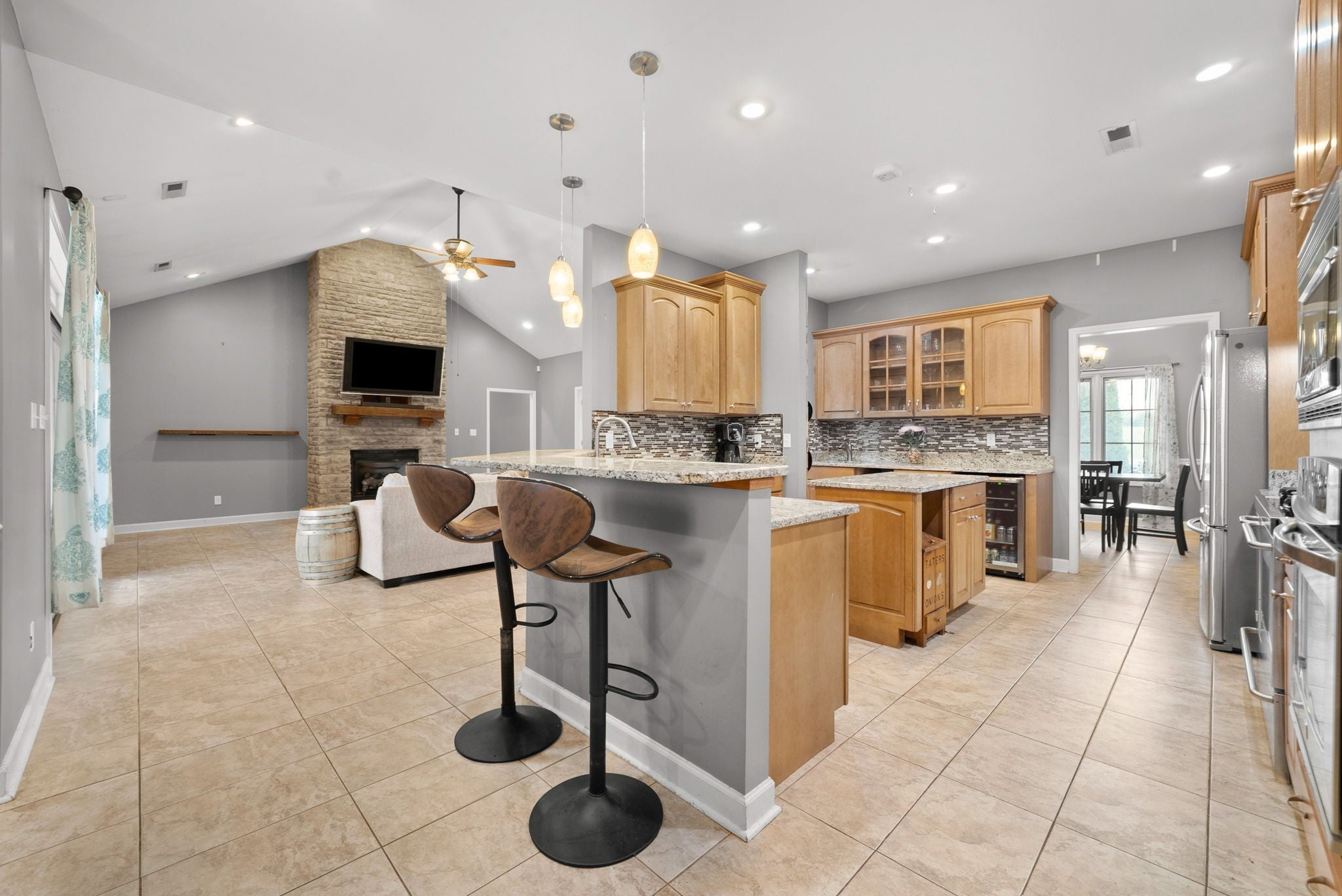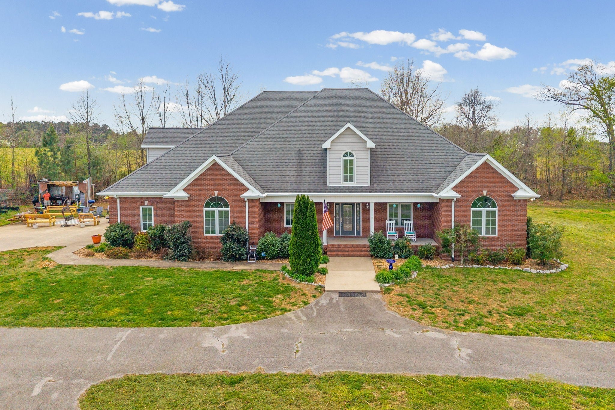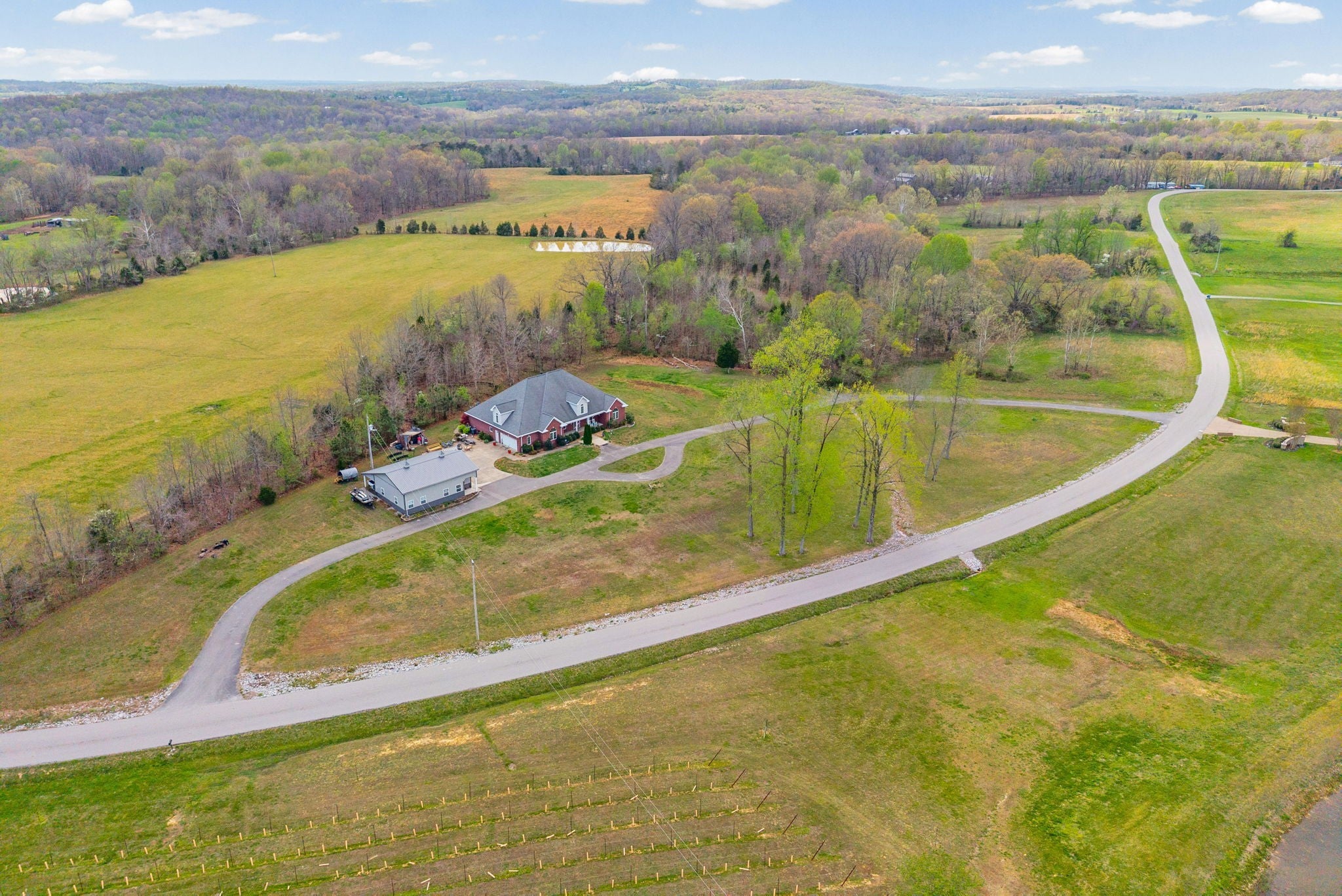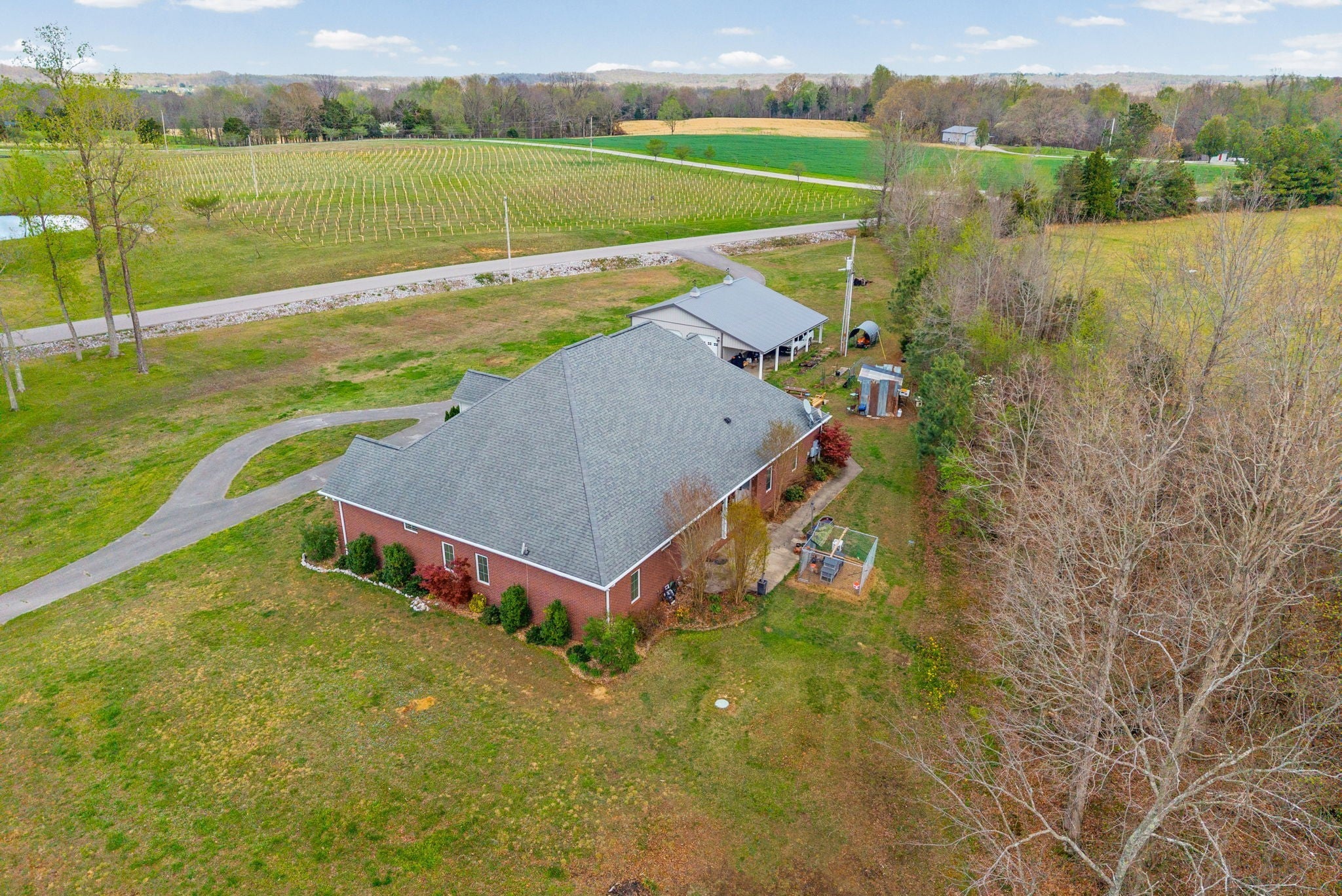Stunning executive brick home set on nearly 3 private acres, offering space, efficiency, and thoughtful design throughout. This 5 bedroom, 5 full bathroom home features a functional layout with room to live, work, and entertain. The main level showcases heated ceramic tile floors powered by an energy-efficient electric tankless water heater, creating both comfort and long-term efficiency. The open concept living area is anchored by a beautiful stone fireplace, flowing seamlessly into a fully equipped kitchen with granite countertops, gas range with hood, built-in oven, ice maker, wine cooler, and ample cabinetry. Formal and casual dining spaces provide flexibility for everyday living and hosting. The primary suite offers a spacious retreat with a spa-like feel. Additional bedrooms are well-sized, and a bonus room provides added flexibility for a home office, media space, or guest accommodations. Hardwood flooring carries throughout the second level. Outside, enjoy privacy along with a 30x40 shop. The property also includes a 1,000-gallon owned propane tank. Fireplace and stove are connected to propane. Scenic views are enhanced by a Vineyard located just across the street. This property offers a rare blend of space, functionality, and efficiency in a peaceful setting.