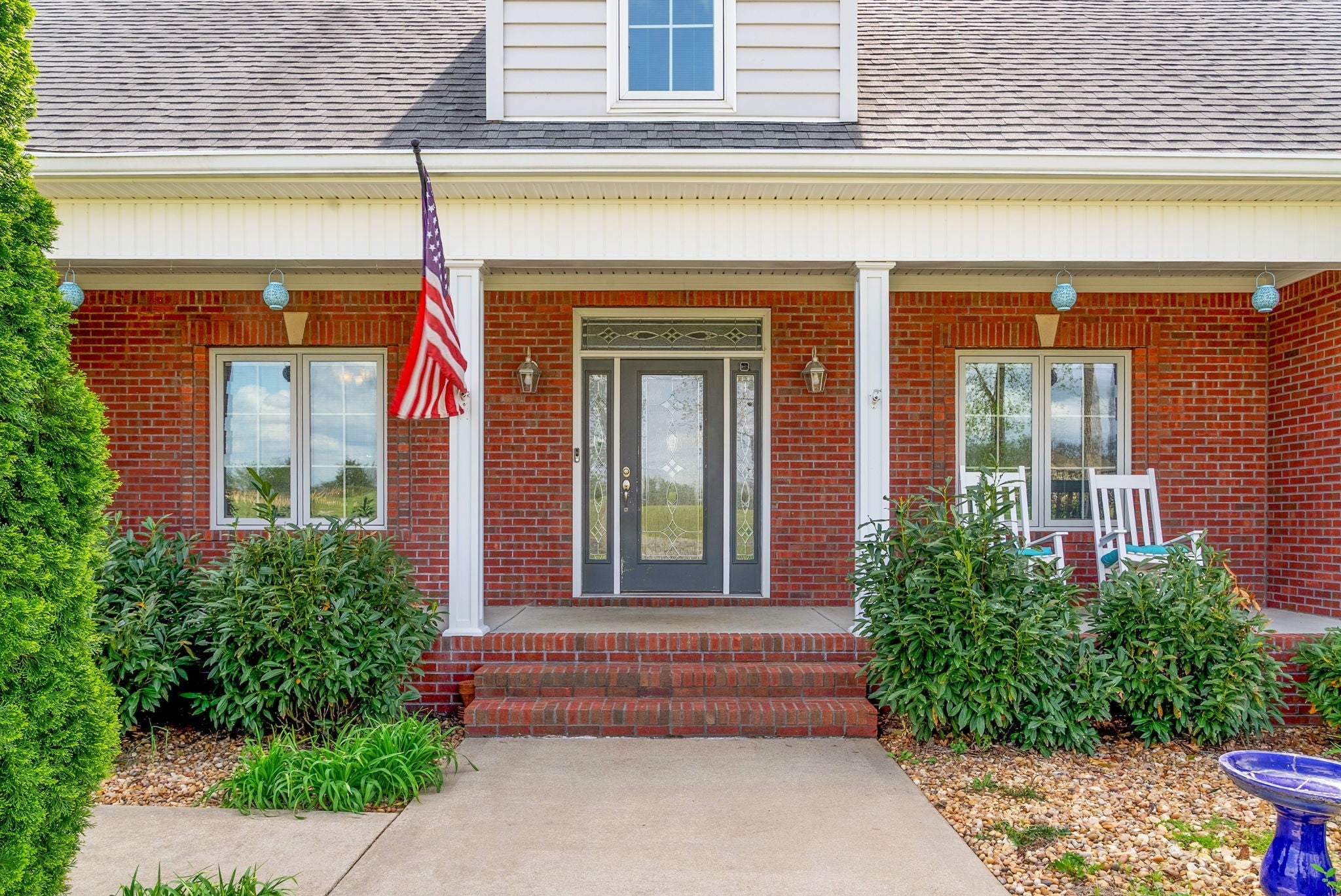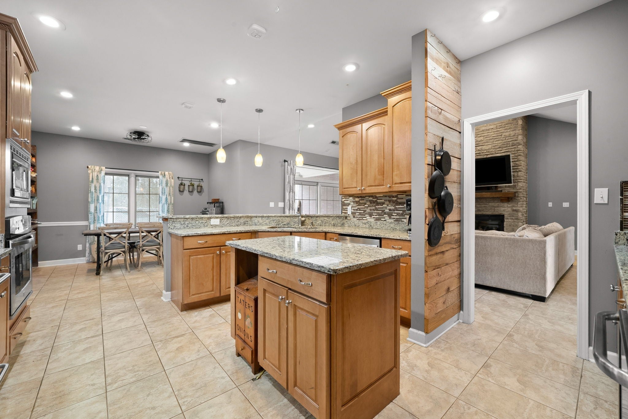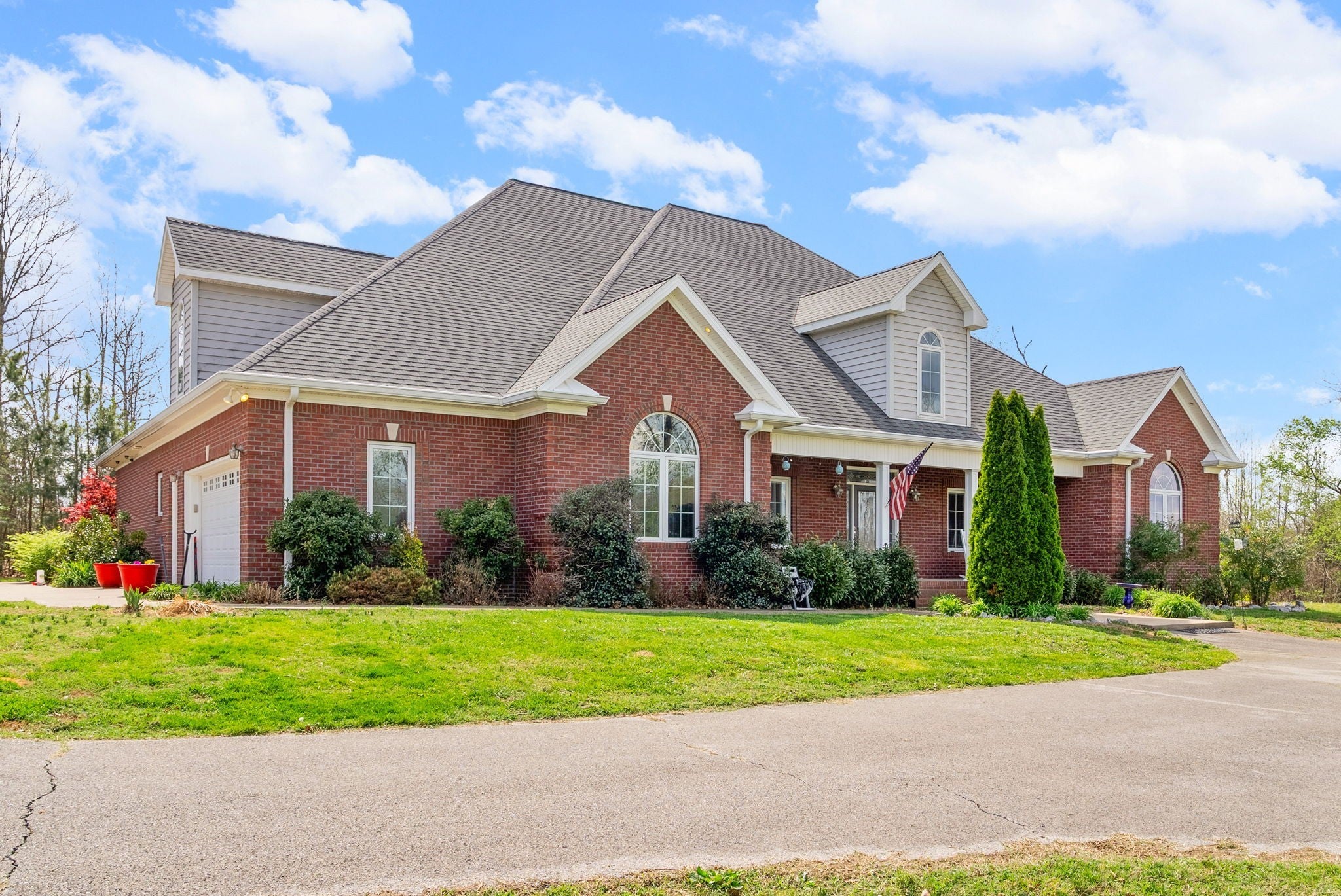 Stunning executive brick home set on nearly 3 private acres, offering space, efficiency, and thoughtful design throughout. This 5 bedroom, 5 full bathroom home features a functional layout with room to live, work, and entertain. The main level showcases heated ceramic tile floors powered by an energy-efficient electric tankless water heater, creating both comfort and long-term efficiency. The open concept living area is anchored by a beautiful stone fireplace, flowing seamlessly into a fully equipped kitchen with granite countertops, gas range with hood, built-in oven, ice maker, wine cooler, and ample cabinetry. Formal and casual dining spaces provide flexibility for everyday living and hosting. The primary suite offers a spacious retreat with a spa-like feel. Additional bedrooms are well-sized, and a bonus room provides added flexibility for a home office, media space, or guest accommodations. Hardwood flooring carries throughout the second level. Outside, enjoy privacy along with a 30x40 shop. The property also includes a 1,000-gallon owned propane tank. Fireplace and stove are connected to propane. Scenic views are enhanced by a Vineyard located just across the street. This property offers a rare blend of space, functionality, and efficiency in a peaceful setting.