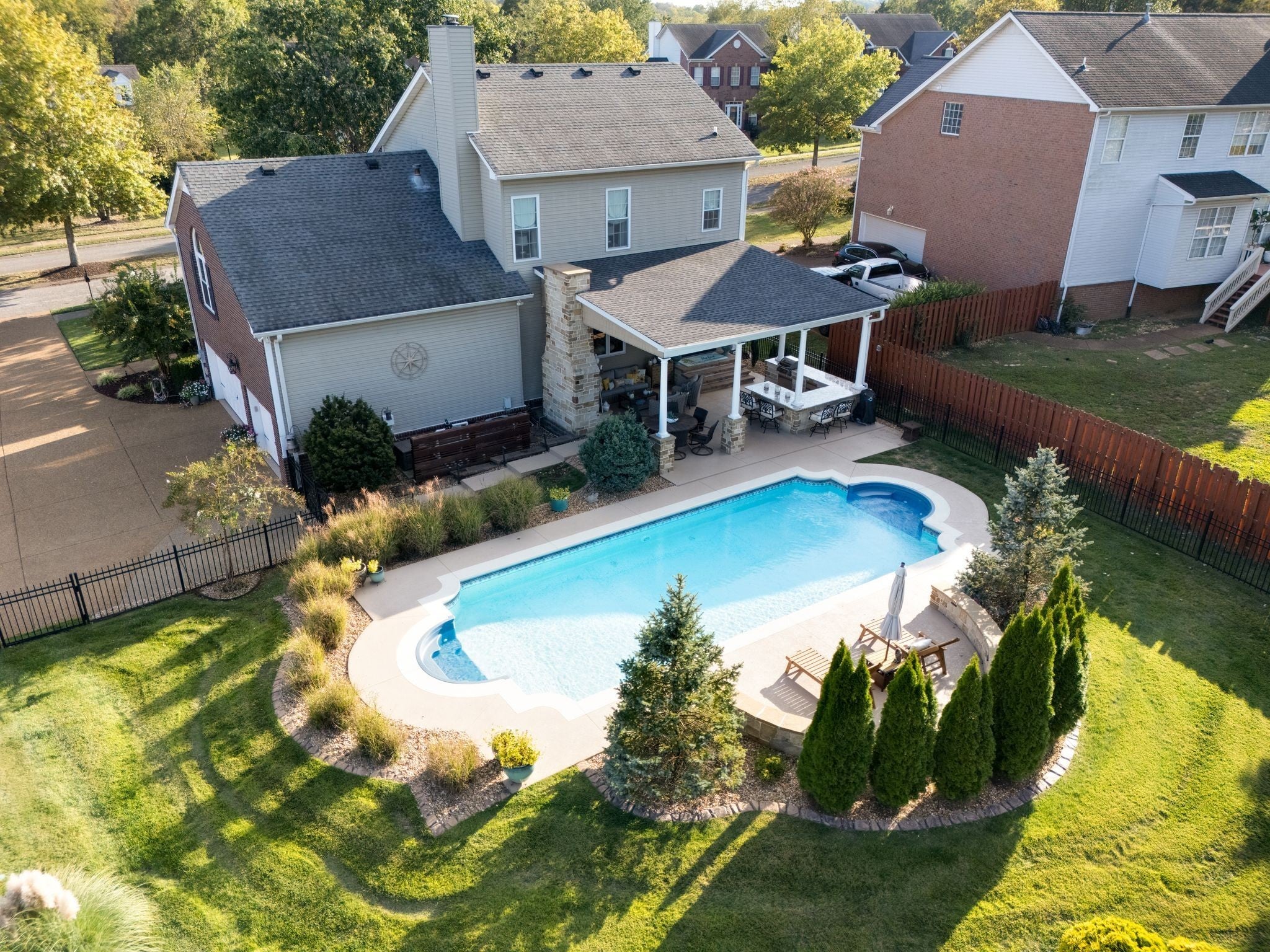 This is the one you’ve been waiting for — an entertainer’s dream! This stunning 3‑bedroom, 2.5‑bath home sits on a spacious lot in the highly desirable Saundersville Station community and truly checks every box. The main level features a home office/flex room that could serve as a potential fourth bedroom, along with a separate dining room perfect for gatherings. Step into the newly updated kitchen showcasing soft‑close white shaker cabinets and drawers, newer stainless‑steel appliances including a gas stove, a beautiful modern sink, and motion‑censored under‑cabinet lighting that highlights the gorgeous marble backsplash, marble countertops, and large kitchen island. The living room off the kitchen offers a cozy gas fireplace and breathtaking views of the backyard. The open floor plan creates an effortless flow, ideal for both entertaining and everyday living. Just a few steps away, you’ll find a huge bonus room filled with natural light and a fantastic walk‑in attic offering abundant storage. The primary suite is a true retreat with high ceilings, custom window treatments, a free‑standing tub, a tile shower, and a walk‑in closet. Step outside to your private backyard oasis. Enjoy a covered patio, an impressive outdoor stone kitchen with granite countertops, and a striking stone gas fireplace — perfect for relaxing or hosting guests' year‑round. The large in‑ground saltwater swimming pool provides both luxury and privacy. The landscaping has been thoughtfully updated with an irrigation system, a concrete stone border, privacy trees and shrubs. The three‑car garage is another standout feature, offering epoxy‑coated floors and plenty of space for vehicles, storage, and all your toys. All of this is just minutes from the interstate, only 30 minutes to Nashville, and convenient to shopping and restaurants. This home truly has it all. Don’t wait — this beauty won’t last long! Professional interior Pictures coming soon! Virtual tour in media section