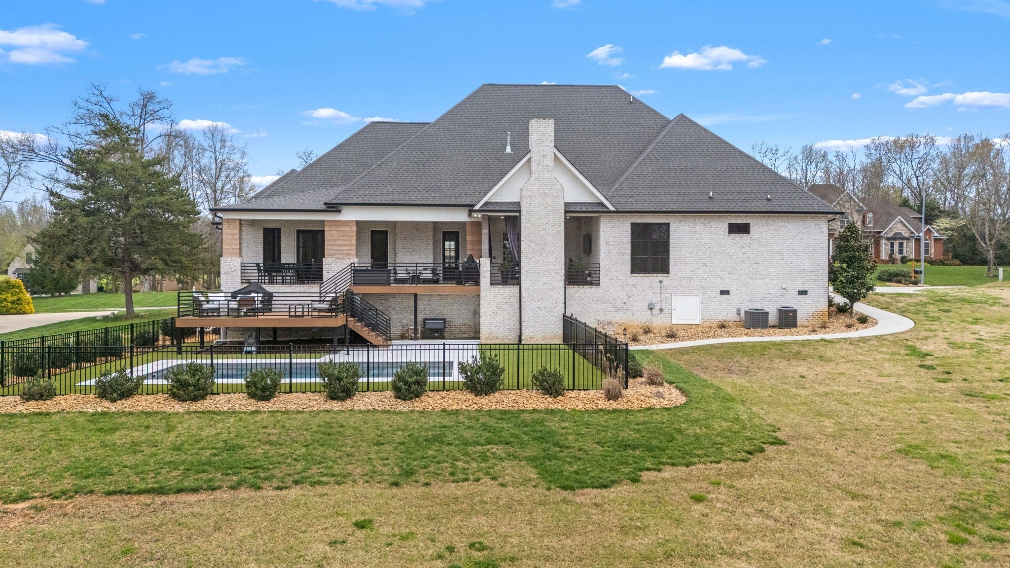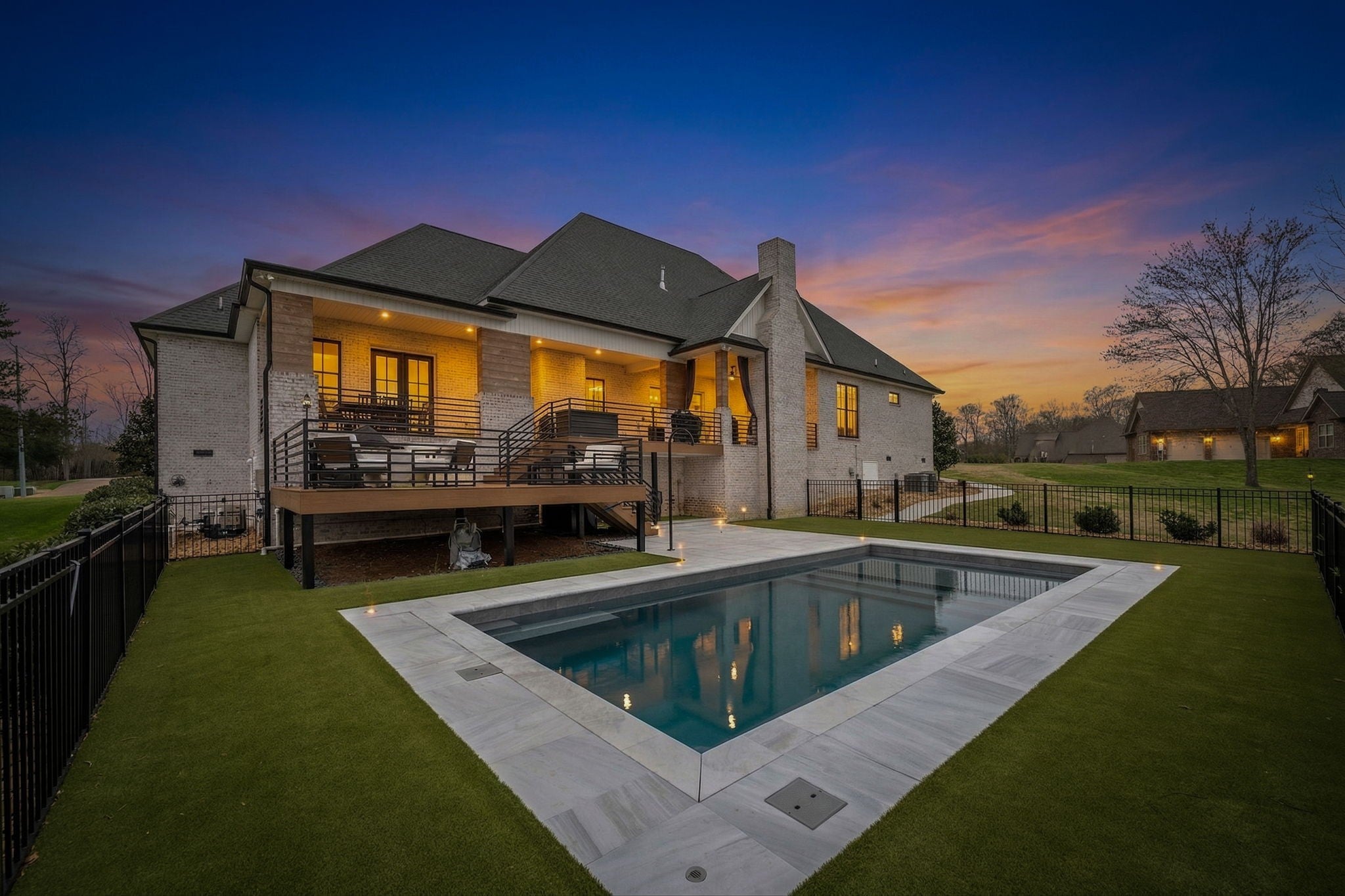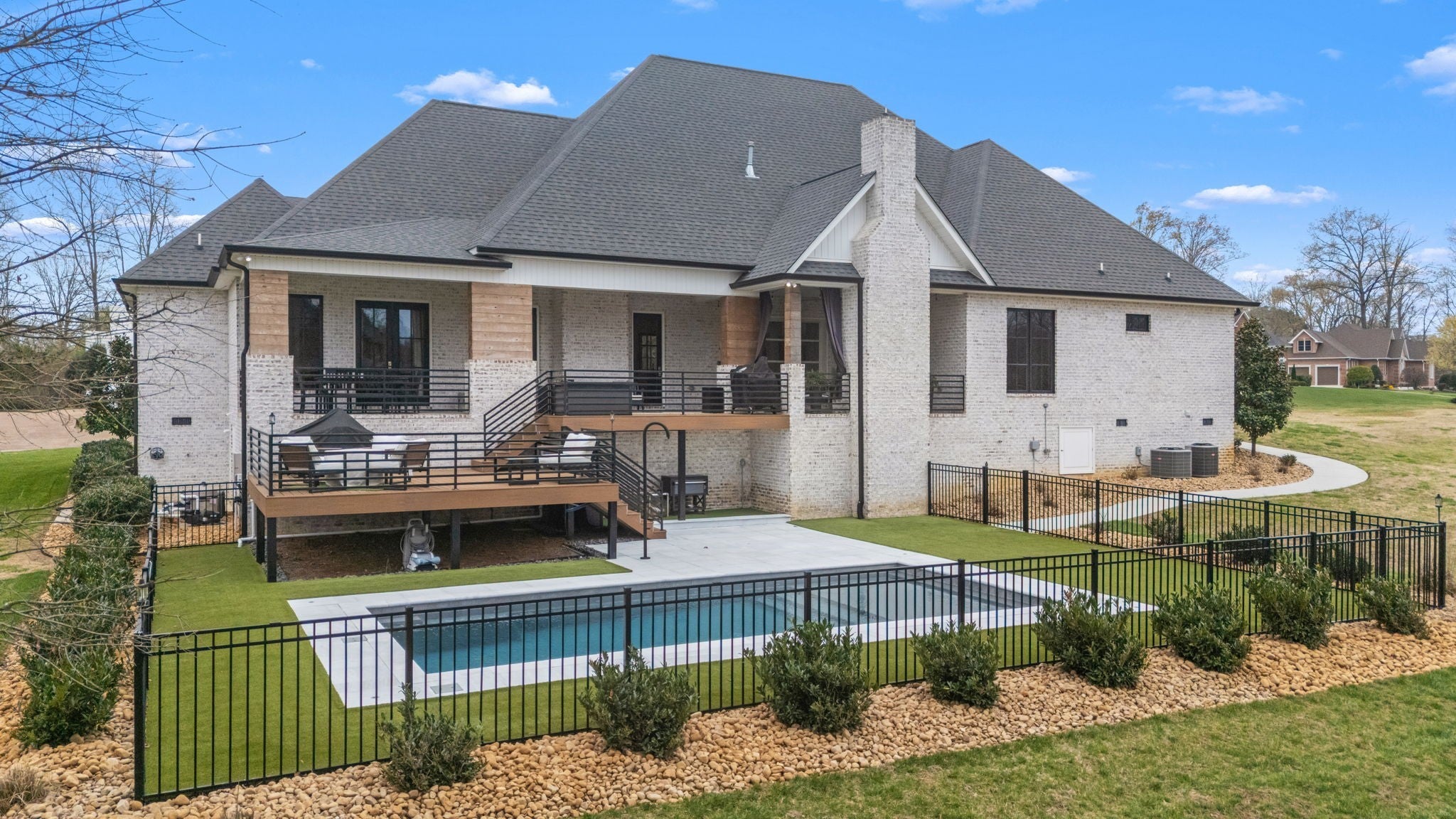 Stunning custom home situated on a corner lot in desirable Macon Manor, offering 3,875 sq ft, 4 bedrooms, 4 baths, and a 3-car garage. All bedrooms are conveniently located on the main level, with an upstairs bonus room featuring a full bath and bar—ideal for guests or entertaining. This home showcases exceptional craftsmanship throughout, including ¾” hardwood flooring, custom tile, detailed trim work, built-ins, and tinted windows. The spacious island kitchen is a chef’s dream with quartz, leather granite, and butcher block countertops, double ovens, under-cabinet lighting, Sub-Zero refrigerator, and walk-in pantry. The primary suite features a spa-like bath with soaking tub, oversized tiled shower, and double vanities. Additional highlights include a safe room, custom closets, and abundant walk out storage. Step outside to enjoy the covered front and back porches, plus a trex deck with storage below. The heated saltwater fiberglass pool (30x14) with tanning ledge creates a private backyard retreat including an outside shower, complete with aluminum fencing, irrigation system, and additional concrete pad in the crawlspace for equipment. Tanning ledge is 16 inches deep. After the steps it is 4 foot then slopes to just under 6 foot. Located just minutes from Lakewood Golf & Country Club, this property offers luxury living with convenience. Transferable pool warranty included.