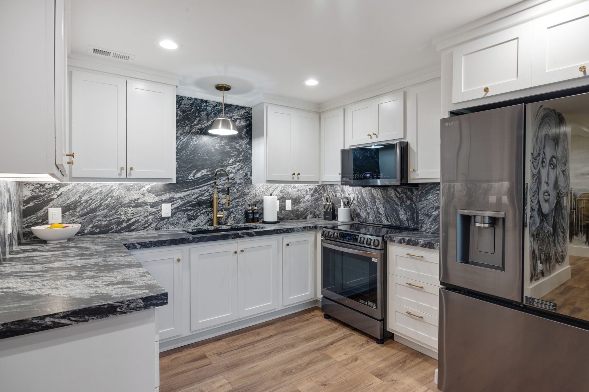 - Gas Oven, Gas Range, Dishwasher, Disposal, Microwave, Refrigerator, Stainless Steel Appliance(s)