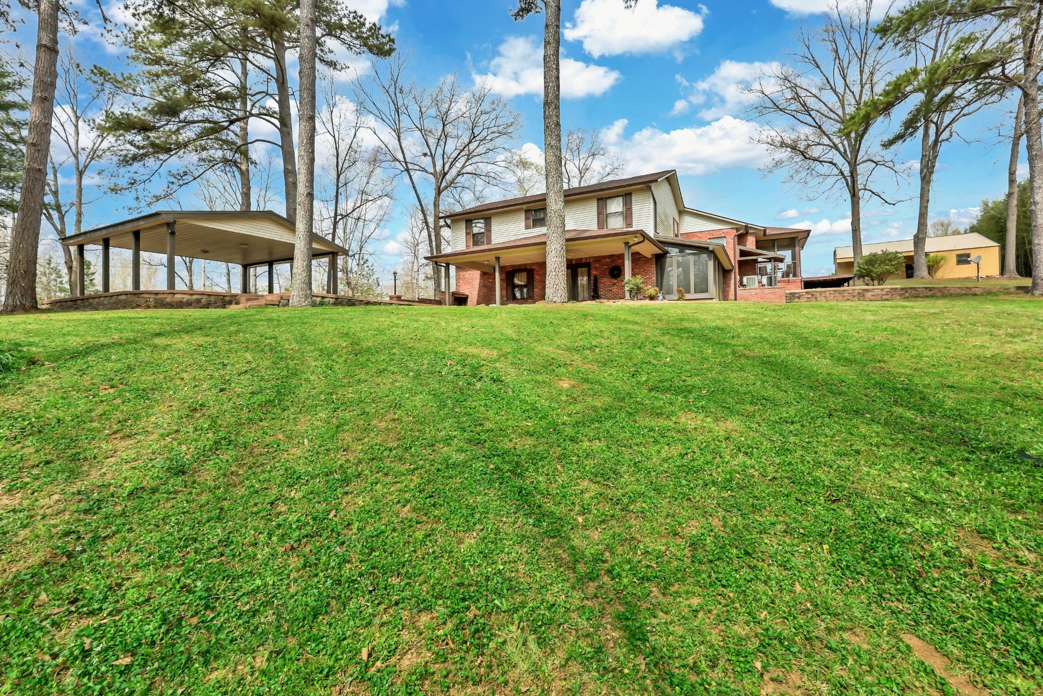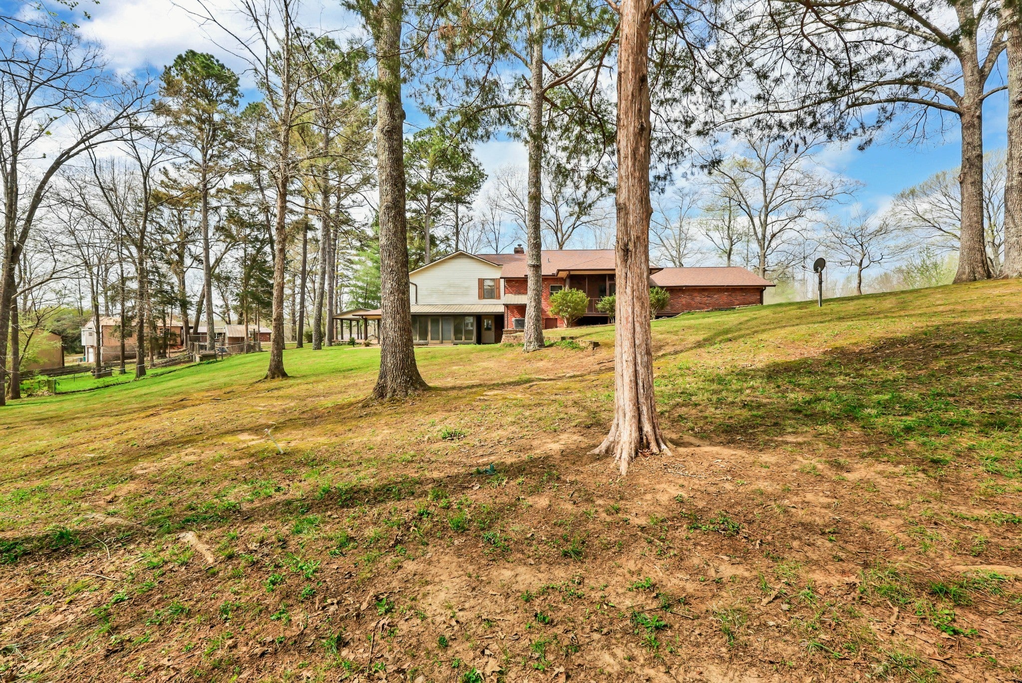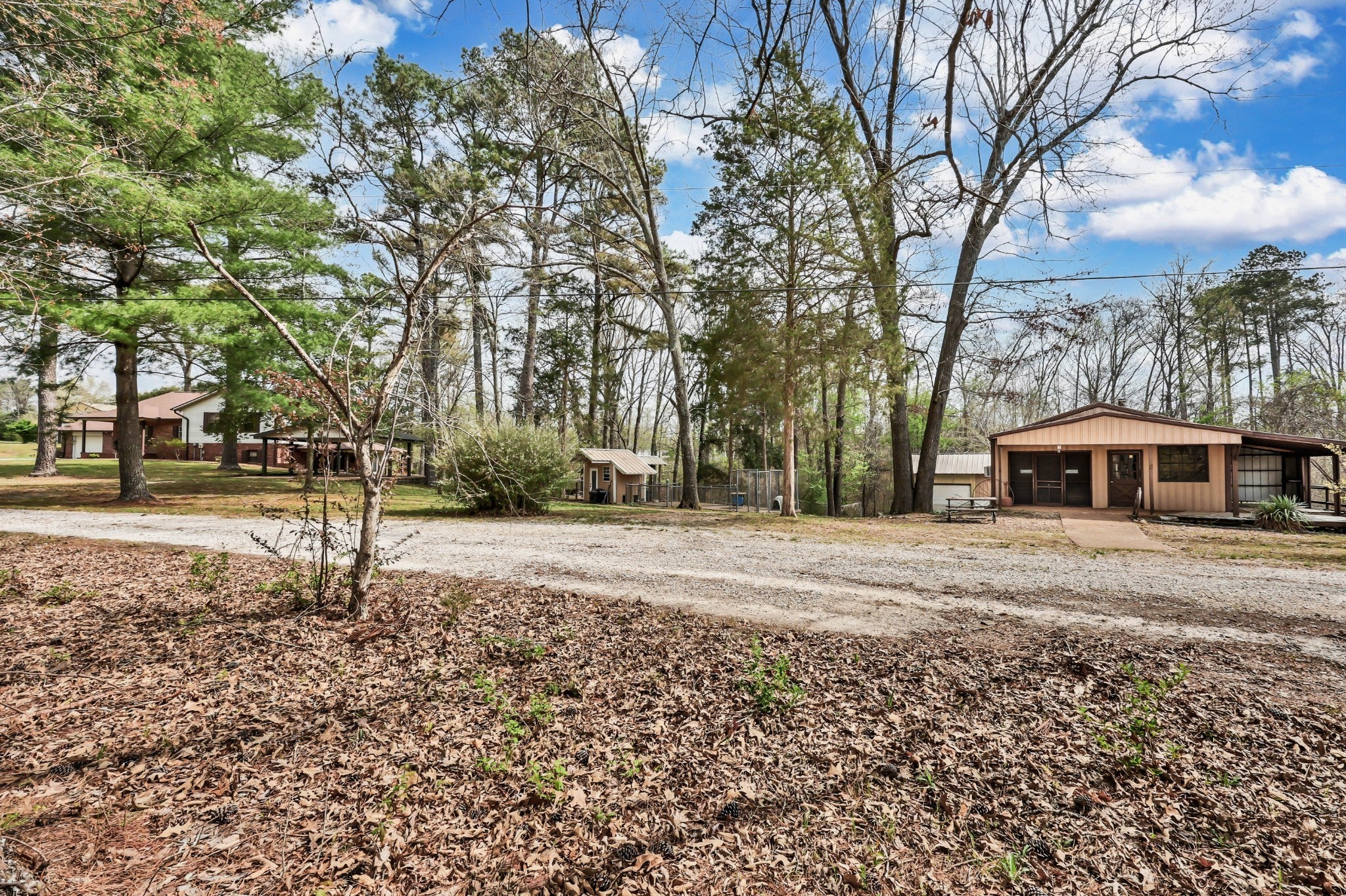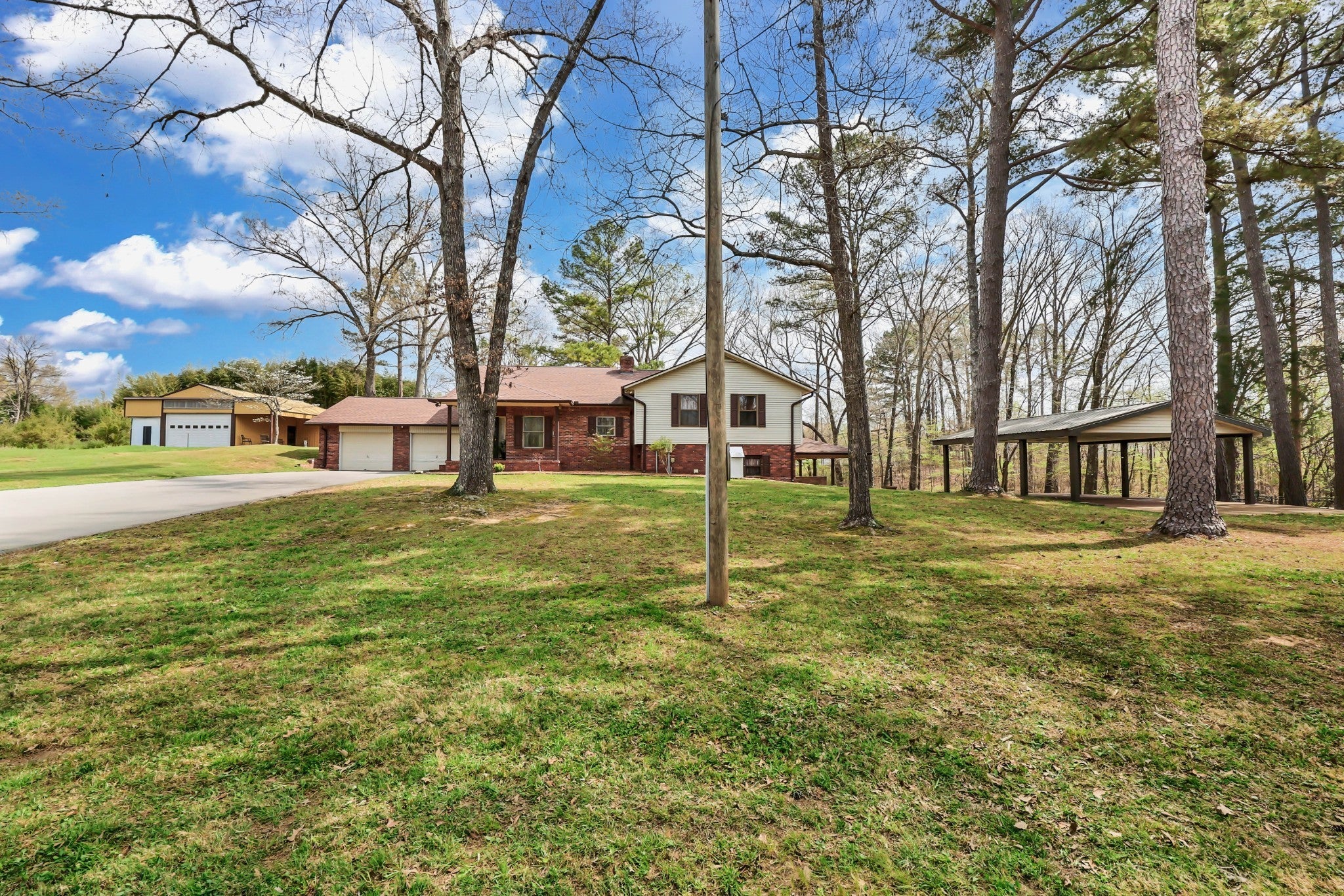 Enjoy peace and privacy on 20.8 secluded acres just minutes from Kentucky Lake. This well cared for home offers 4 bedrooms 3 full baths and a partially finished basement, providing plenty of space for family and guests. Custom designed main level kitchen complete with granite countertops, stylish tile backsplash, eating bar, pantry space, and an abundance of cabinets with pull-out features for maximum functionality. Inviting living room showcases a gorgeous stone gas fireplace as the centerpiece. Ideal for multi-generational living, the basement boasts a full kitchen, dinette area off the den and a full bath. Property includes a 40x30 metal building with propane heat and finished office space, along with a 30x24 outbuilding featuring a full kitchen, oven, stove top, a/c unit, half bath w/electric water heater, wood stove and roll up door. Perfect for pets, featuring expansive dog runs, a fenced area for dog house. Mostly Locust is a private drive, easement to 160 Mostly Locust Dr will convey.