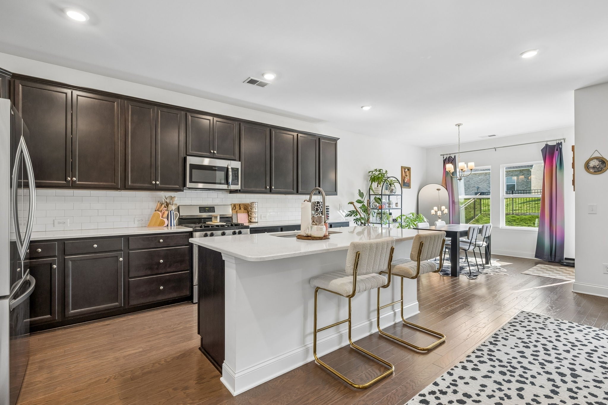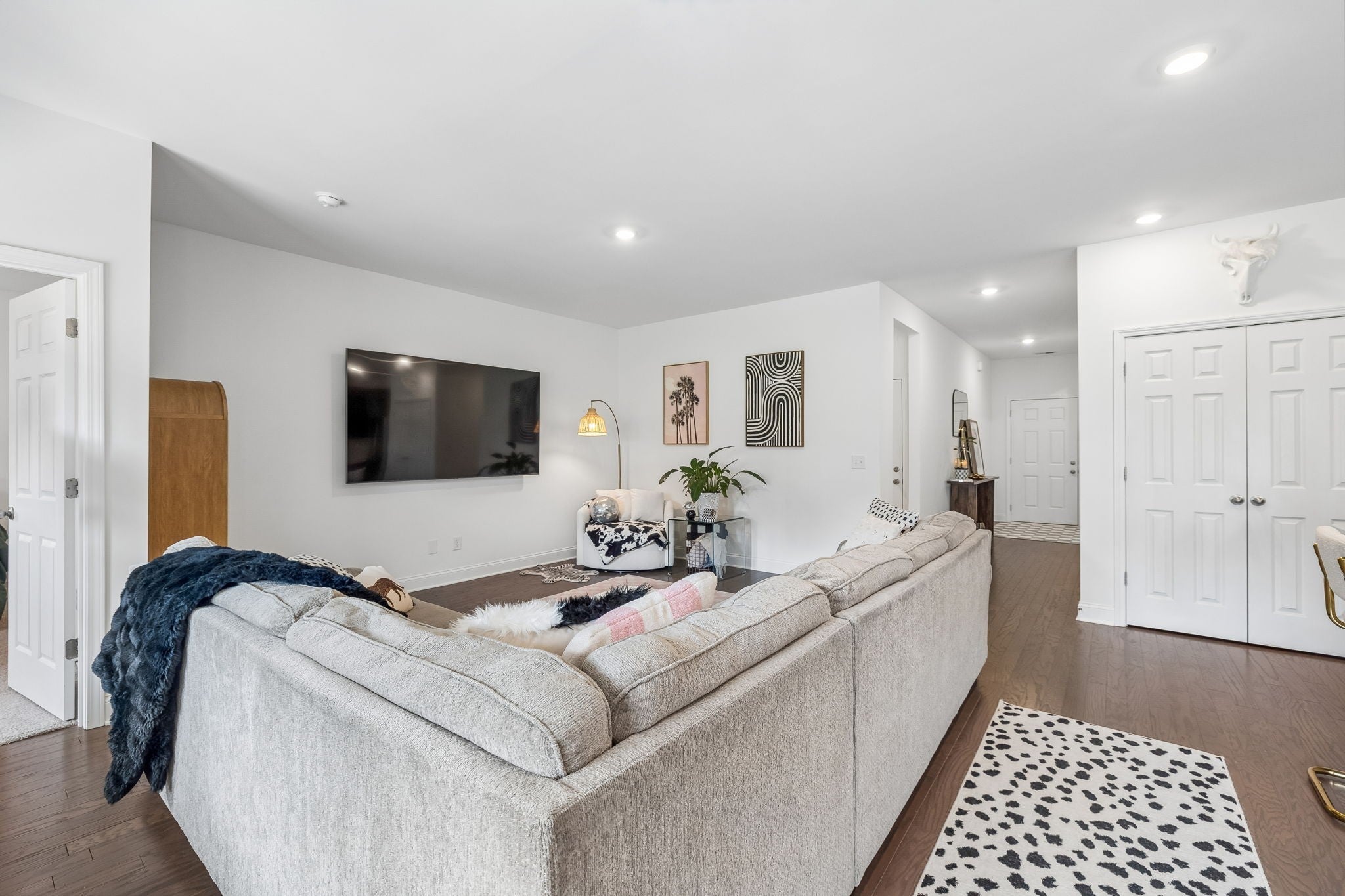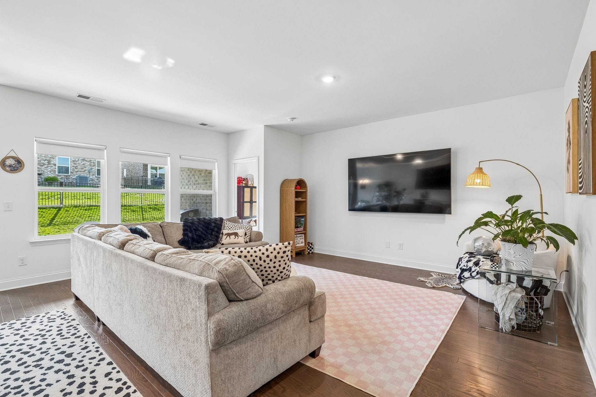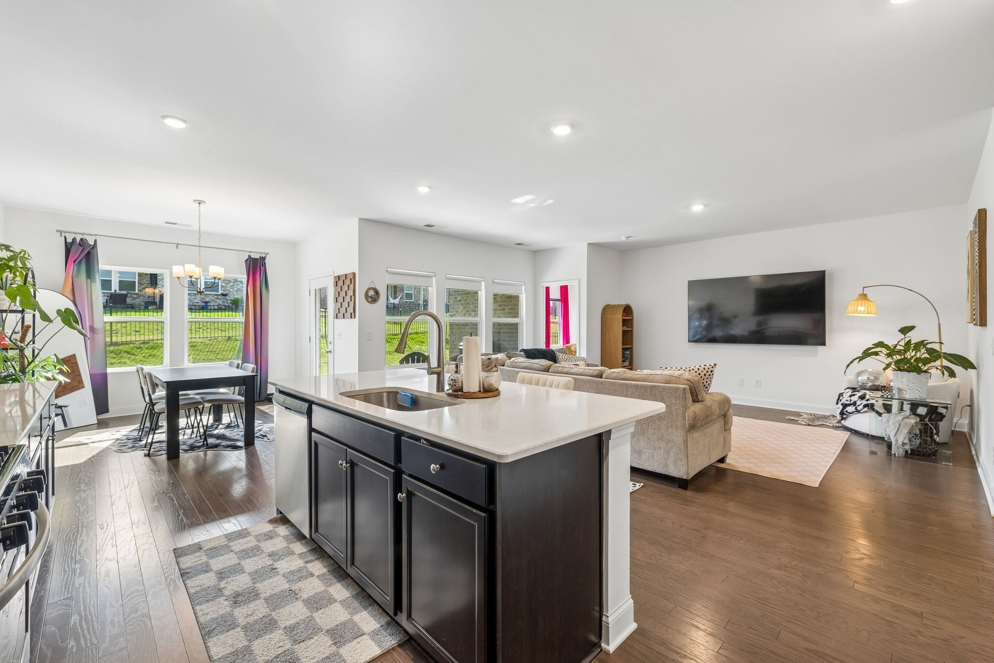 This one-level, open-concept home features tons of natural light and hardwood floors throughout the living areas. The heart of the home features a premium kitchen equipped with quartz countertops, extra-large hardwood cabinets, a gas range, and a pantry with dedicated outlets for a coffee station. The property includes several upgrades, such as a primary closet that connects directly to a walk-through laundry room and a garage equipped with a 220V outlet. Outdoor living is enhanced by a covered patio with a roll-down screen, and for added value, an 85" television stays with the home.