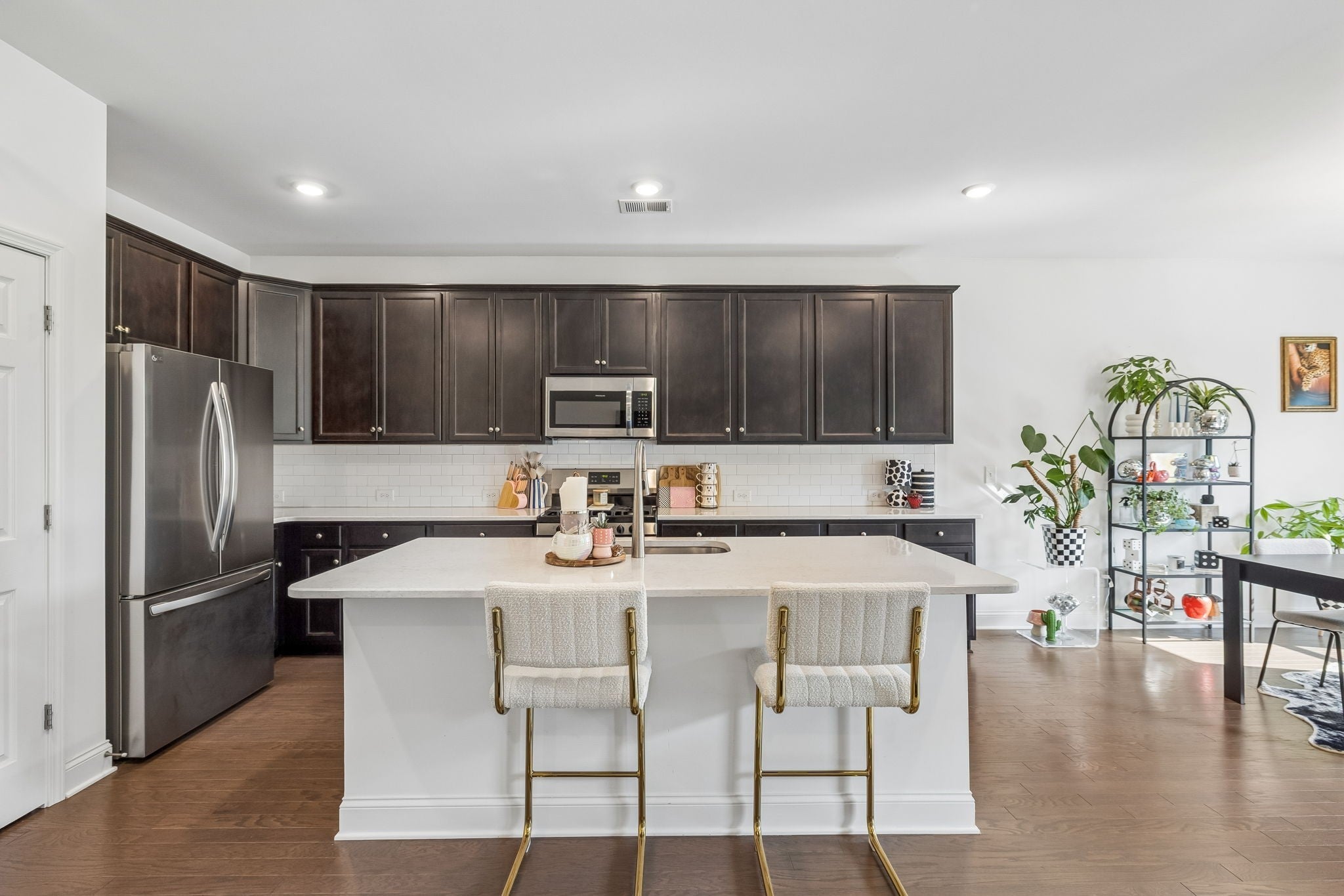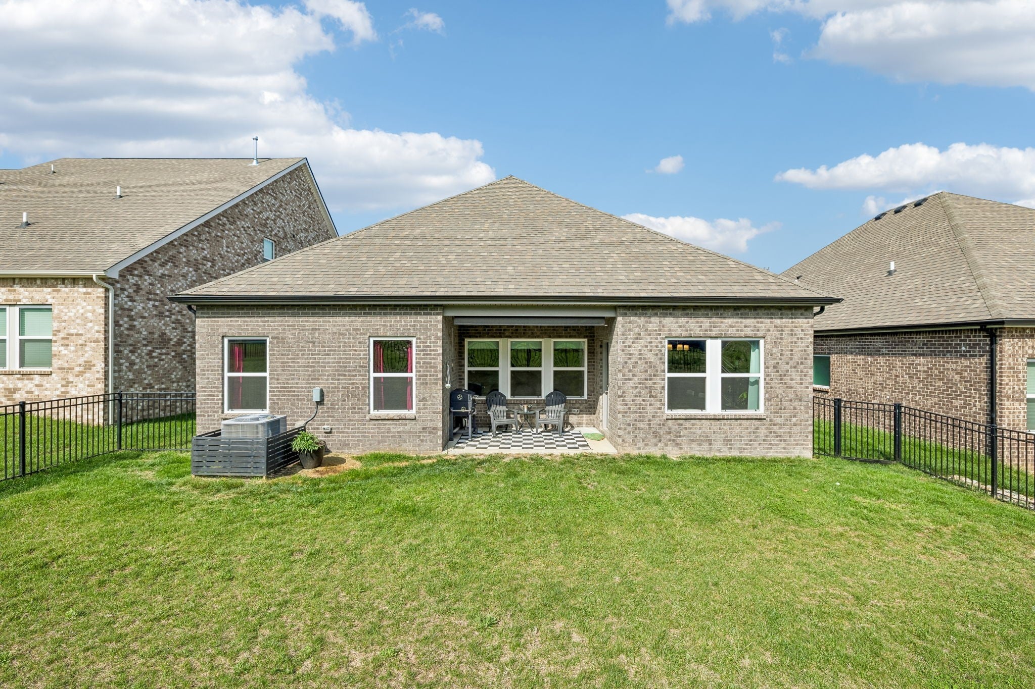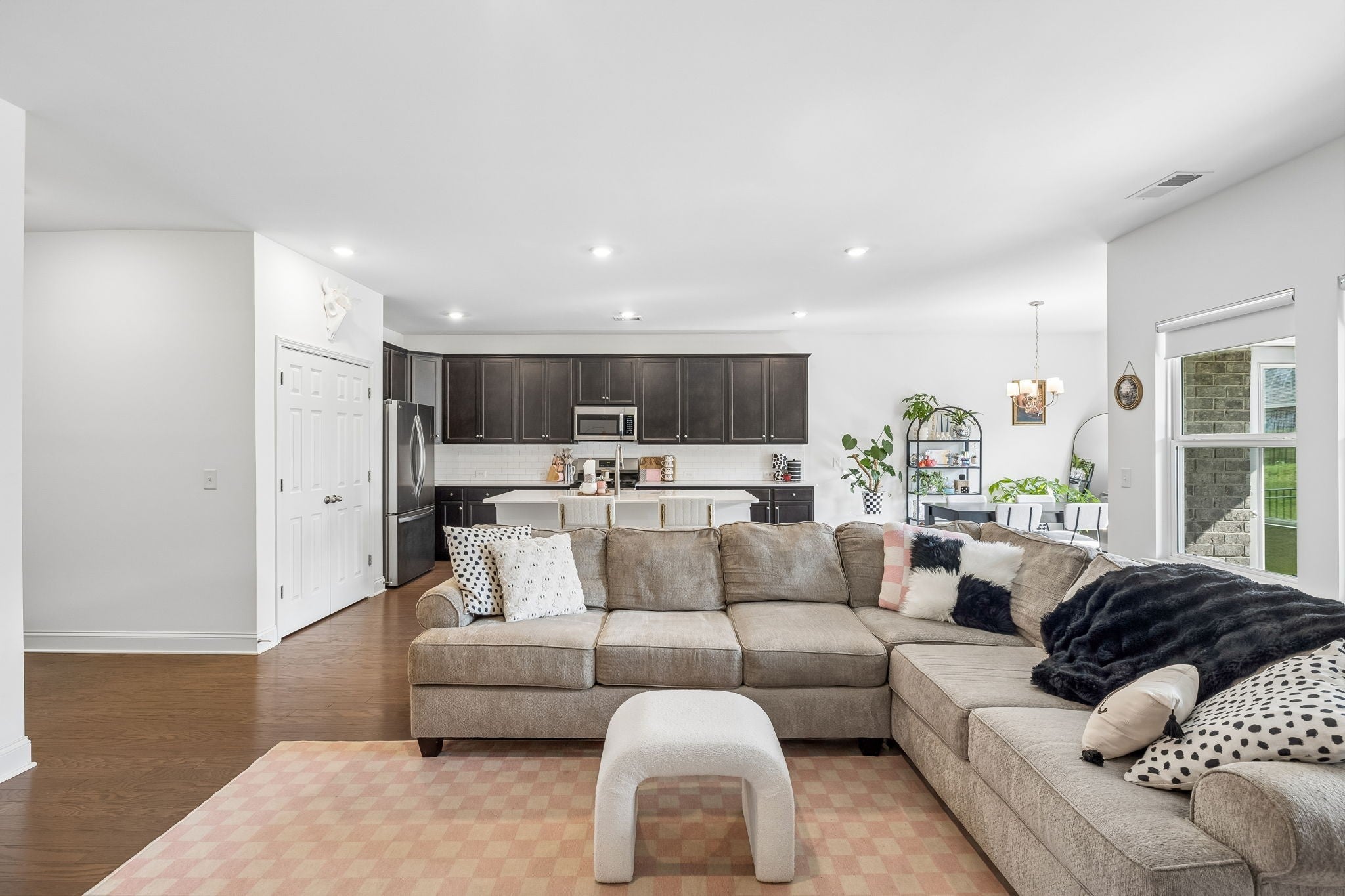 This one-level, open-concept home features tons of natural light and hardwood floors throughout the living areas. The heart of the home features a premium kitchen equipped with quartz countertops, extra-large hardwood cabinets, a gas range, and a pantry with dedicated outlets for a coffee station. The property includes several upgrades, such as a primary closet that connects directly to a walk-through laundry room and a garage equipped with a 220V outlet. Outdoor living is enhanced by a covered patio with a roll-down screen, and for added value, an 85" television stays with the home.