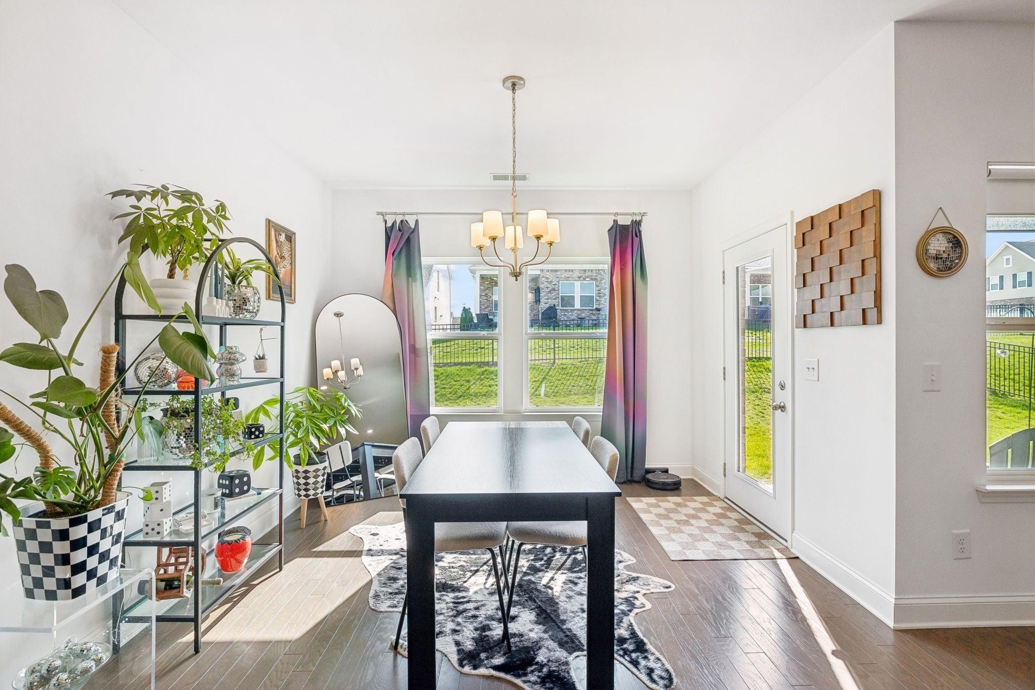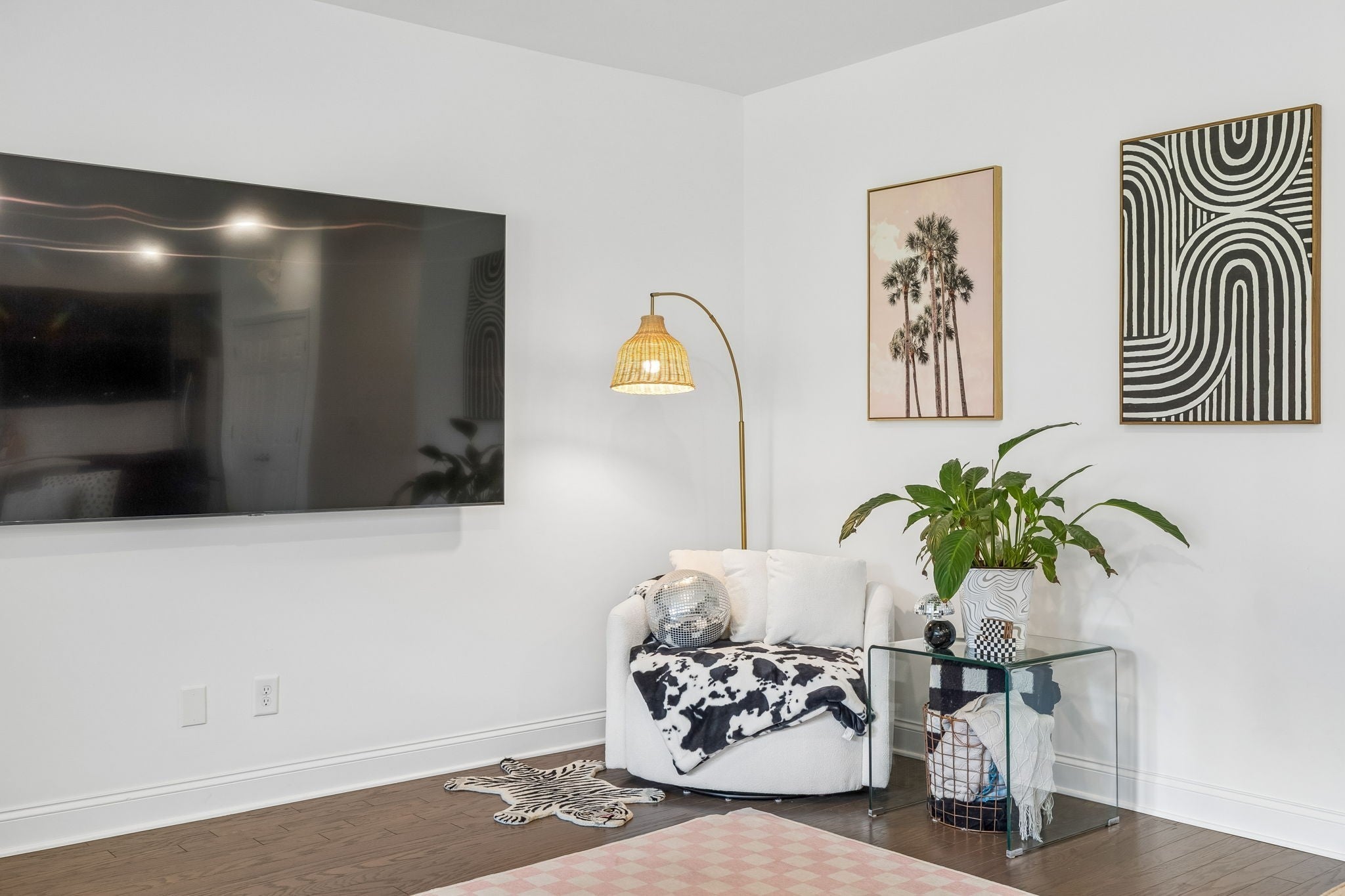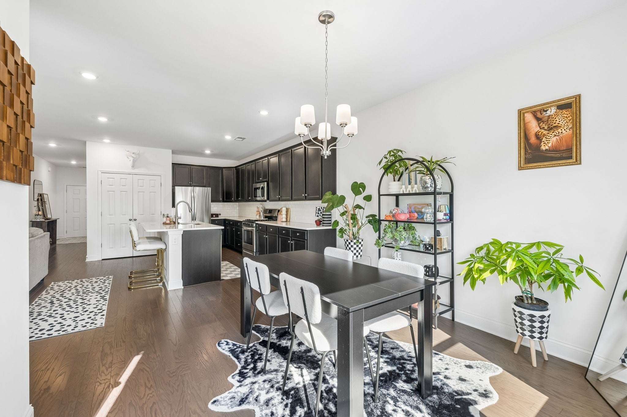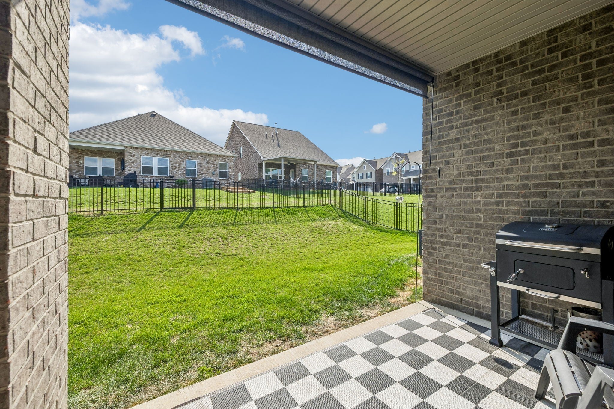 This one-level, open-concept home features tons of natural light and hardwood floors throughout the living areas. The heart of the home features a premium kitchen equipped with quartz countertops, extra-large hardwood cabinets, a gas range, and a pantry with dedicated outlets for a coffee station. The property includes several upgrades, such as a primary closet that connects directly to a walk-through laundry room and a garage equipped with a 220V outlet. Outdoor living is enhanced by a covered patio with a roll-down screen, and for added value, an 85" television stays with the home.