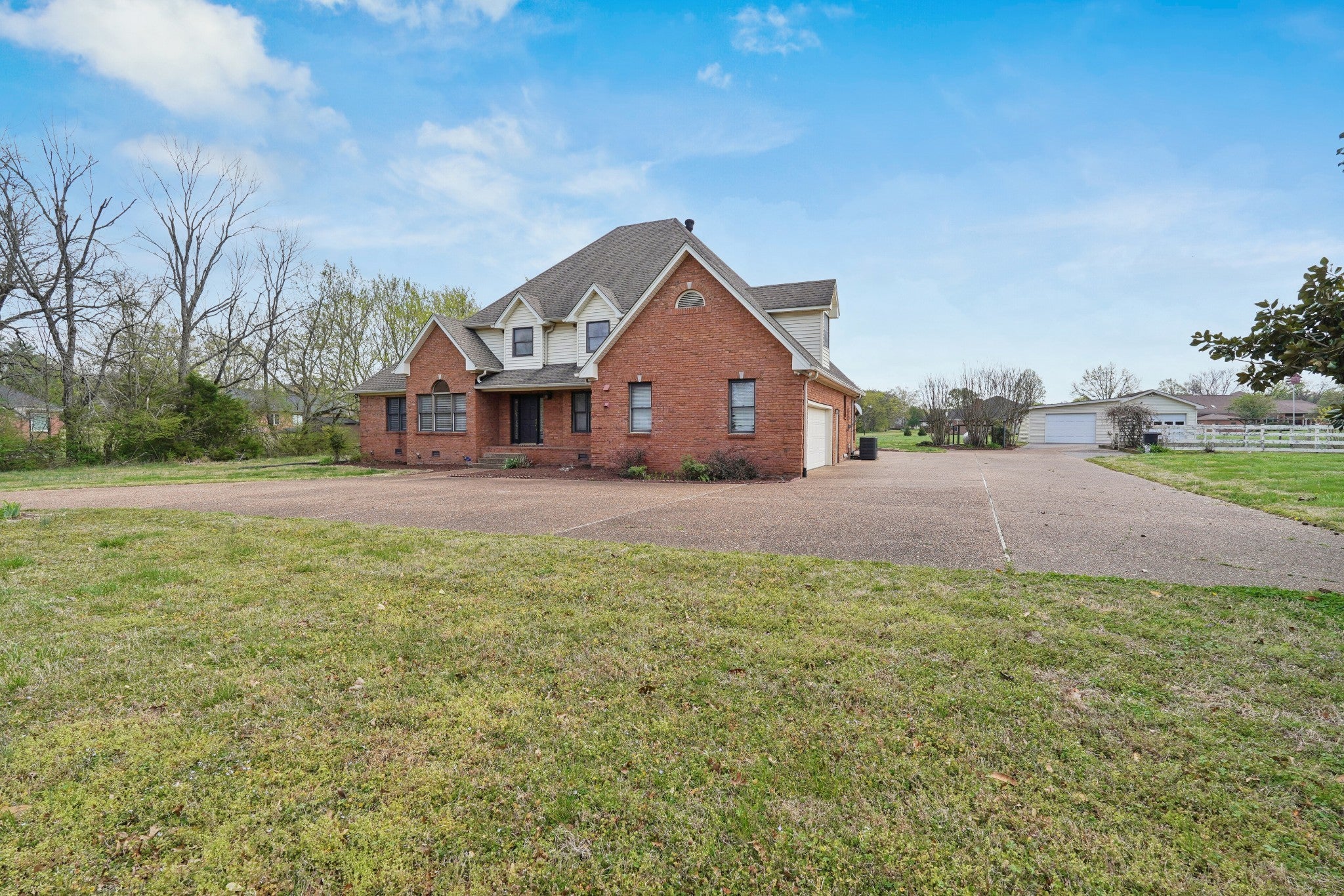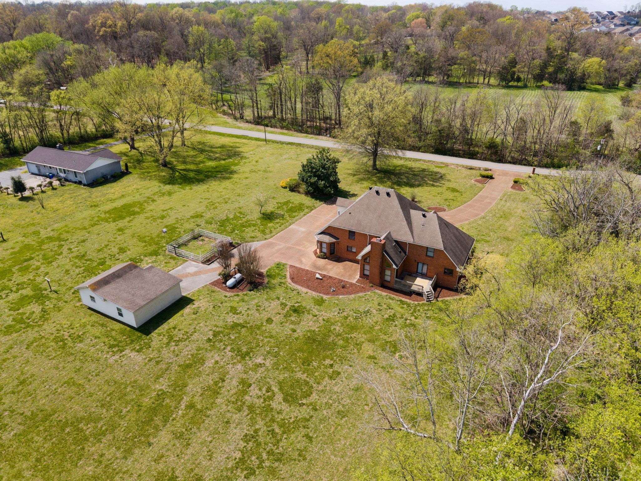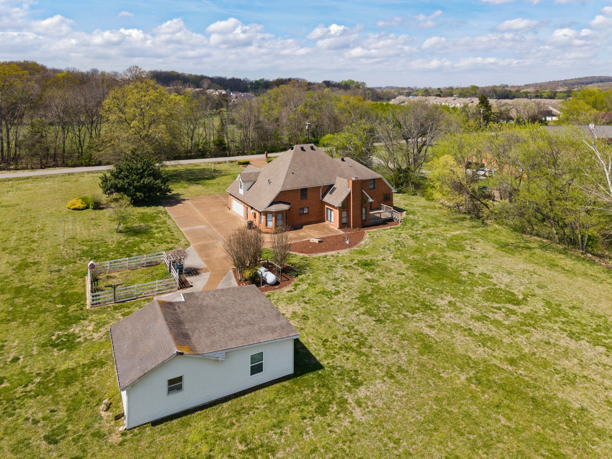 4 BR 3FB, 2 1/2 baths on large 2.98 acre tract that was bought as two tracts together but could be split. Hardwood floors. Deck and patio, 2 car att. garage and detached garage that is wired and had A/C & heat prior. Farm estate feeling but close to town. Large kitchen. Rec. room and offices, large primary bath with tub and shower, has recently been connected to city sewer, has propane tank