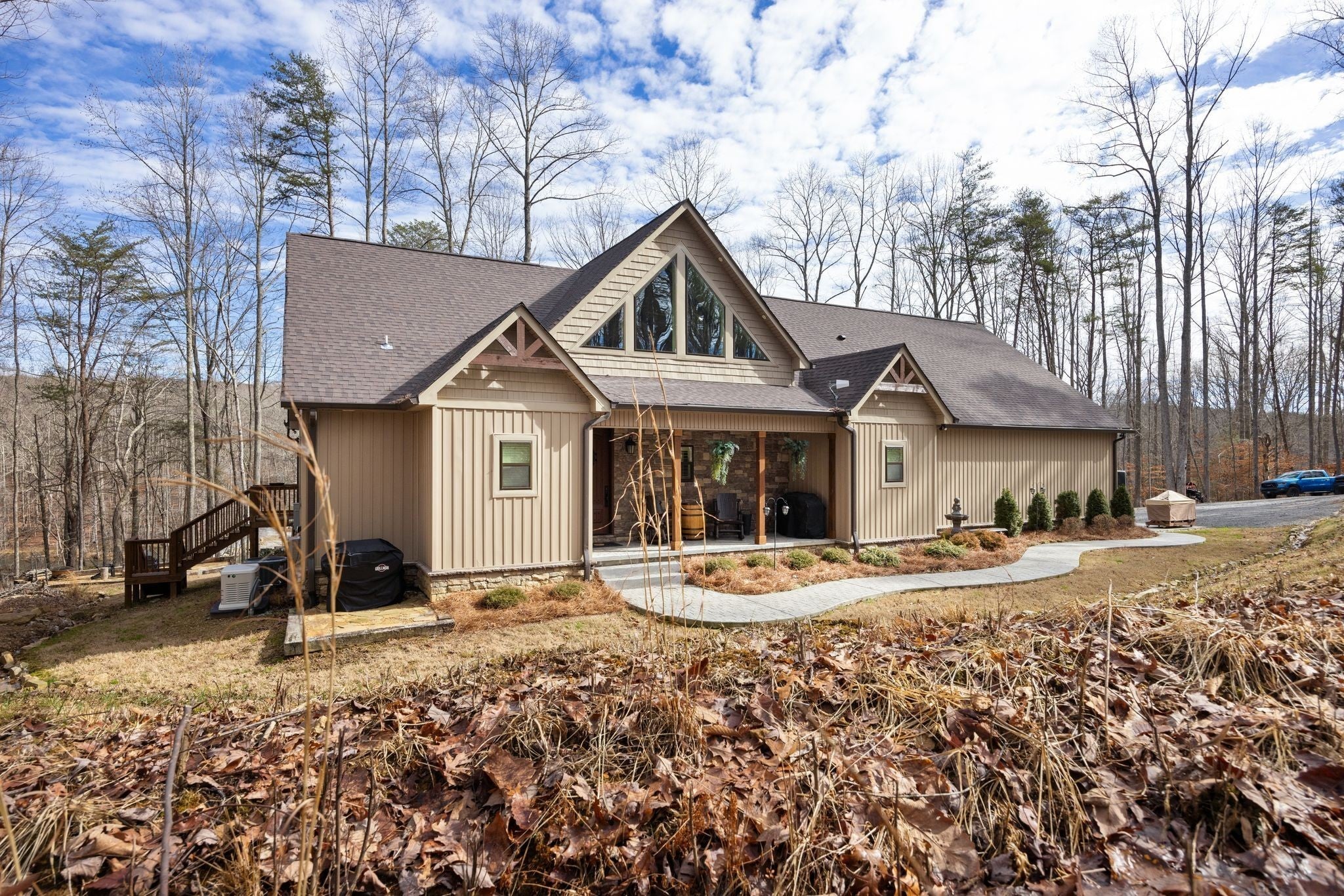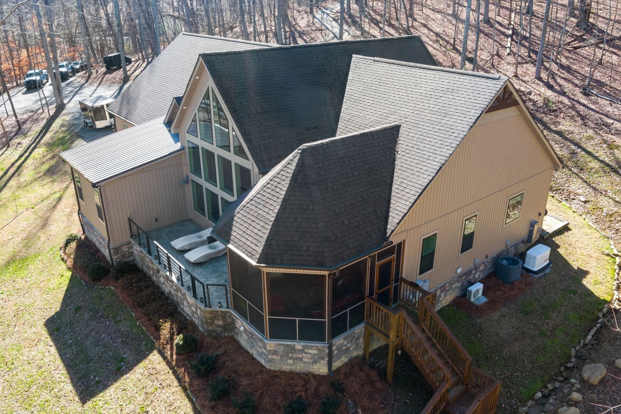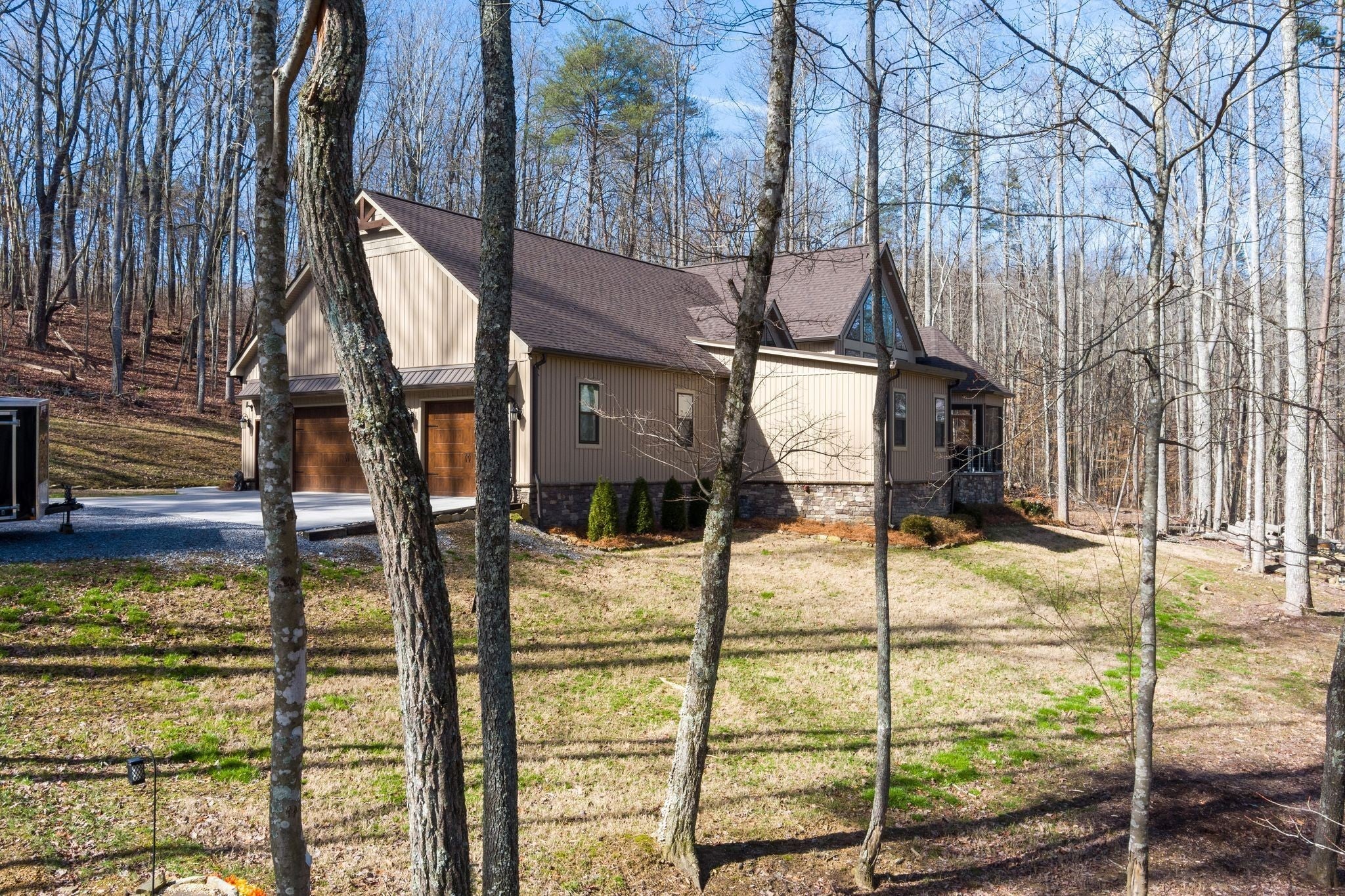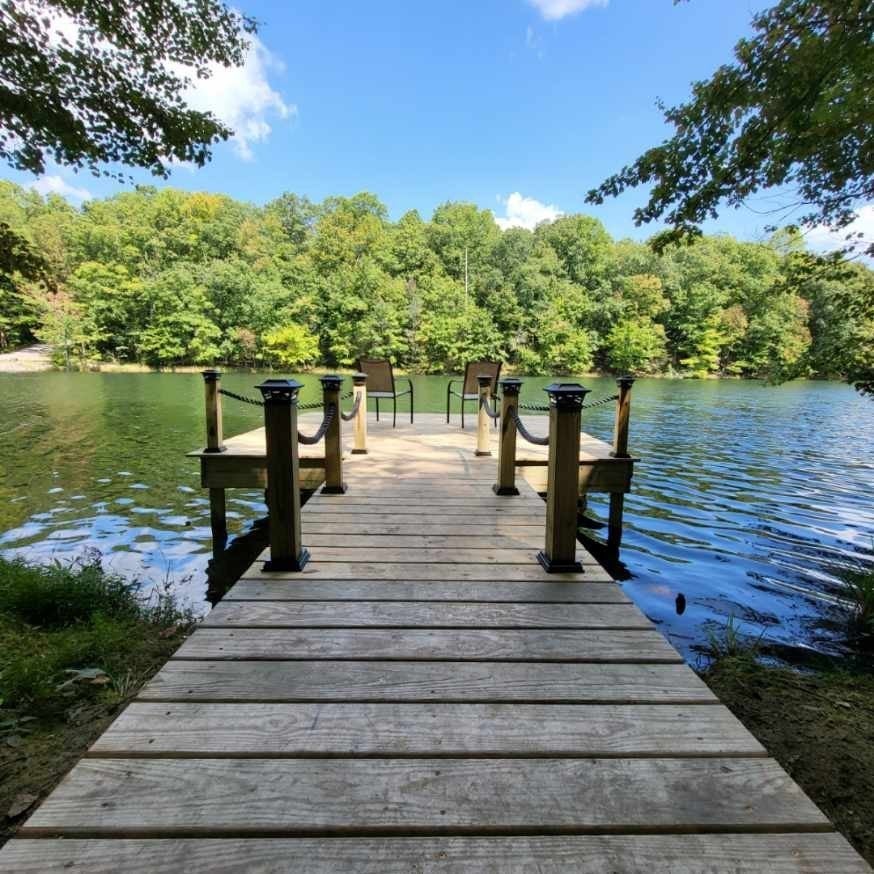 In the quiet, gated community of Mountains Farms, you will arrive at a gorgeous all custom home on 10.81 wooded acres overlooking the community’s private lake. As you approach the drive, you will be greeted by the brand new 1200 sq ft heated, cooled, fully insulated detached garage designed to match the home perfectly. Landscaping is mature and beautiful rock accents compliment the stamped concrete sidewalk and porches. Outside you can enjoy the warmth of the slate stone firepit, take a soak in the hot tub, or cast a line from your private, lighted dock at the water’s edge. A slate stone cooking area is located outside for grilling and around the corner from the full house Generac generator. Inside, the breathtaking great room welcomes with a floor to ceiling stone gas fireplace, beamed ceilings, and a wall of windows to view the lake. The impressive kitchen and massive island invite you to gather. Both primary and guest suites are large with vaulted ceilings, full baths and custom closets. The third bedroom is re-designed as a theatre room with surround sound & lighting and raised seating for an authentic movie night experience. The witches hat screened porch has a second gas stone fireplace for another relaxing space to spend an evening at home. A home office, spacious laundry room and attached garage with custom cabinetry matching the interior complete the home. The third attached garage bay has been converted to a home gym with full insulation, heat/air, and padded flooring. This space is incredibly flexible as a gym, game room, hobby spot, etc. As you tour the home, notice the solid wood doors, Emtek hardware, iron return vents, metal plate covers, crawl space encapsulation and a storm shelter/safe room with hidden access from the theater room. Additional storage with a single garage is located on the upper section of the property. Here you will find secluded serenity in a thoughtfully designed home with special attention given to quality and detail.